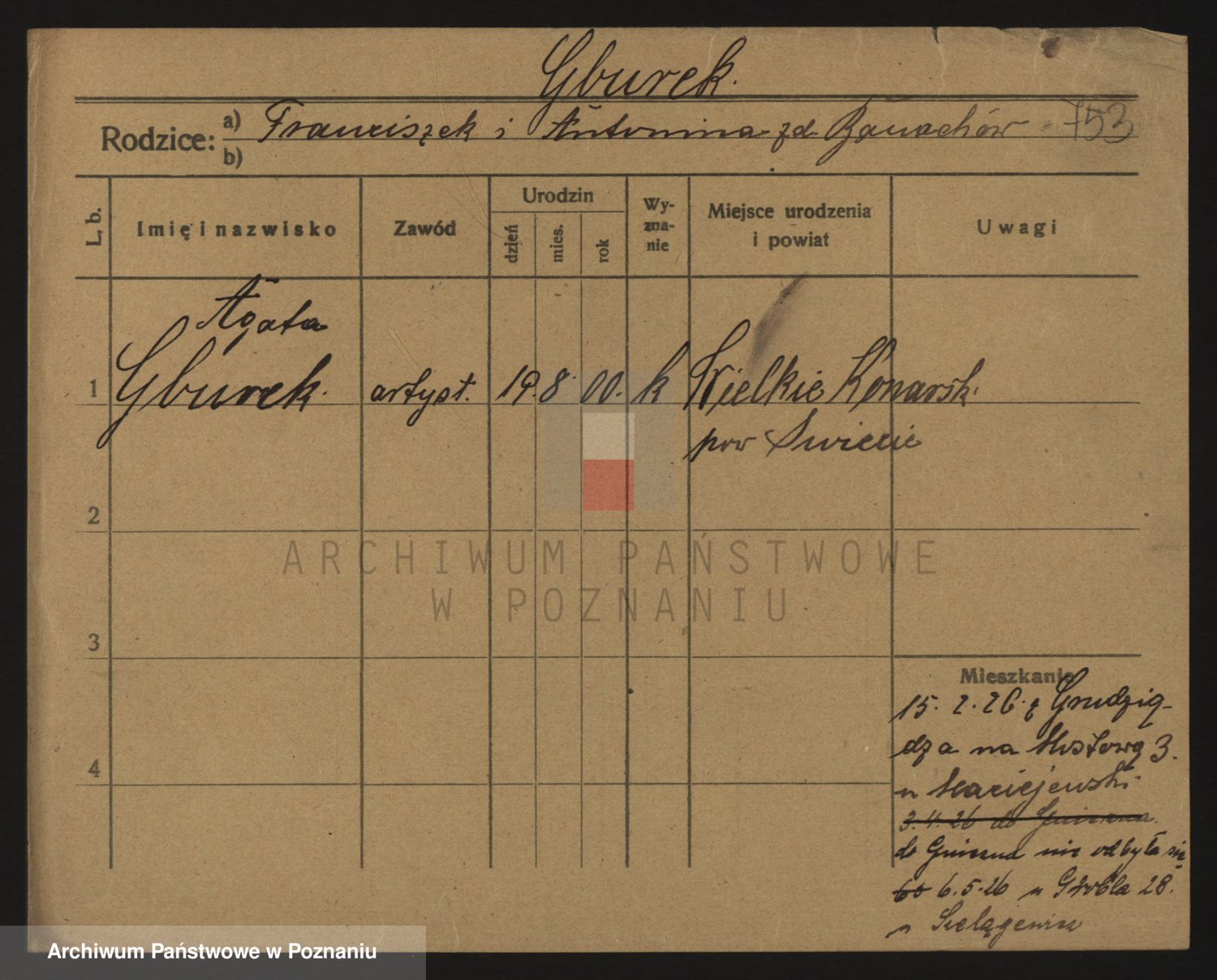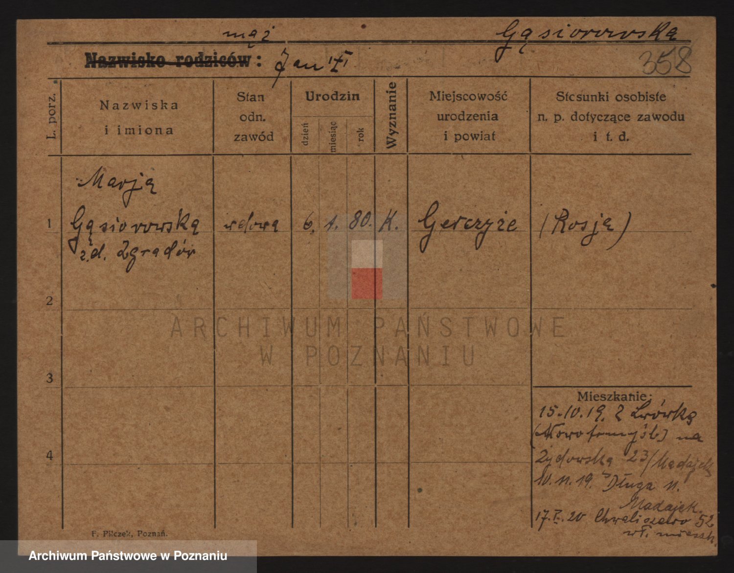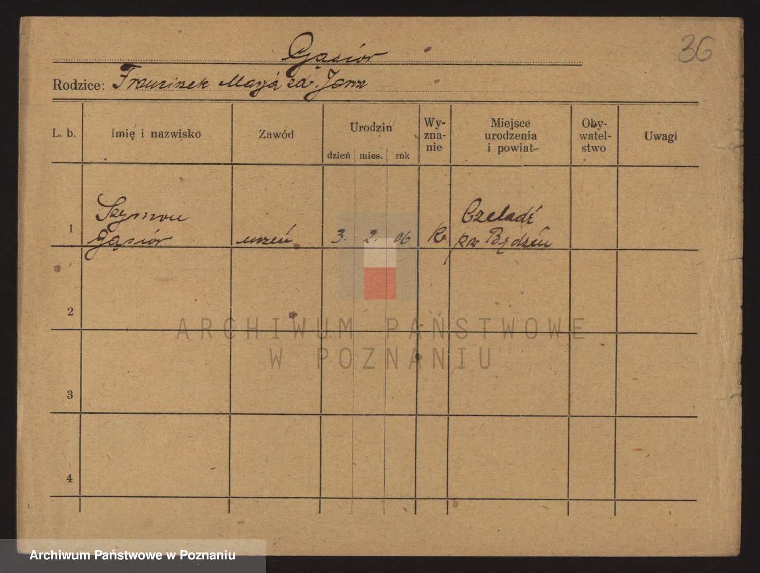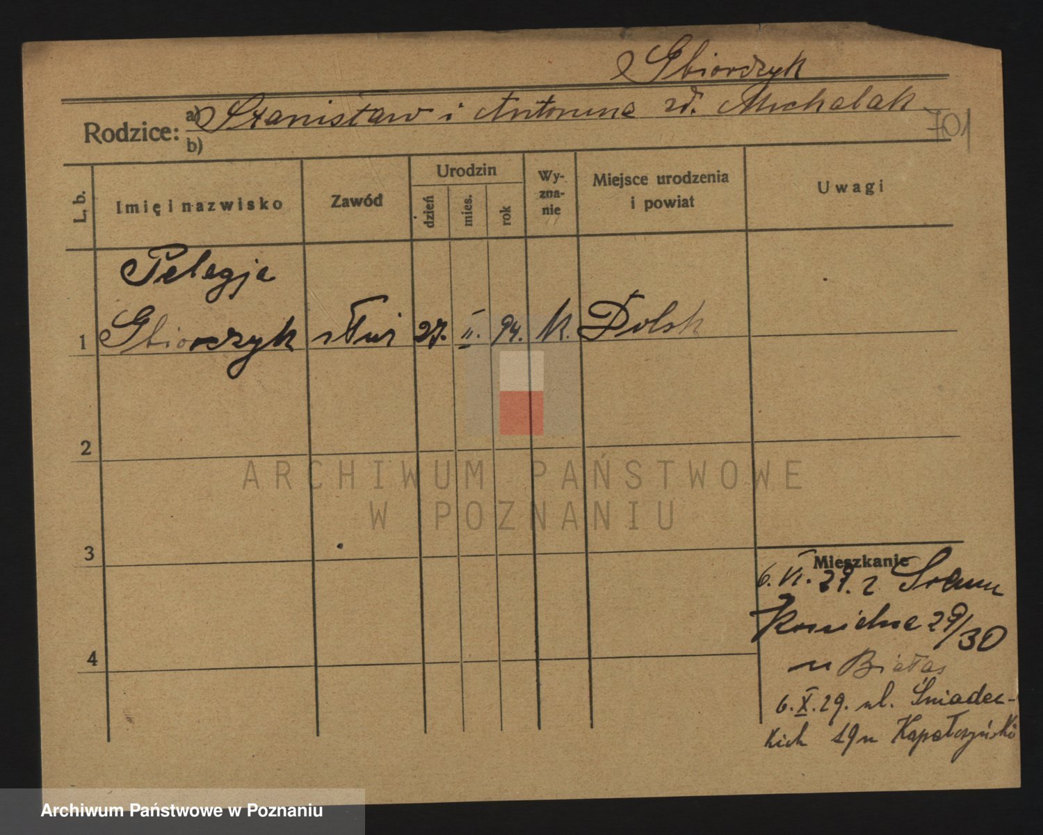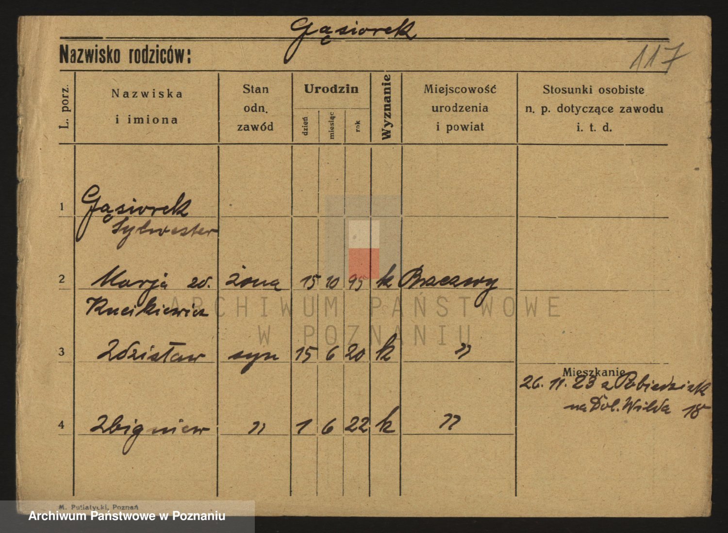 Podgląd karty osobowej dostępny jest po kliknięciu na nazwisko lub ikonkę karty. Można dokonywać powiększenia (ikony na górze) lub przechodzić między kolejnymi skanami (strzałki po bokach).