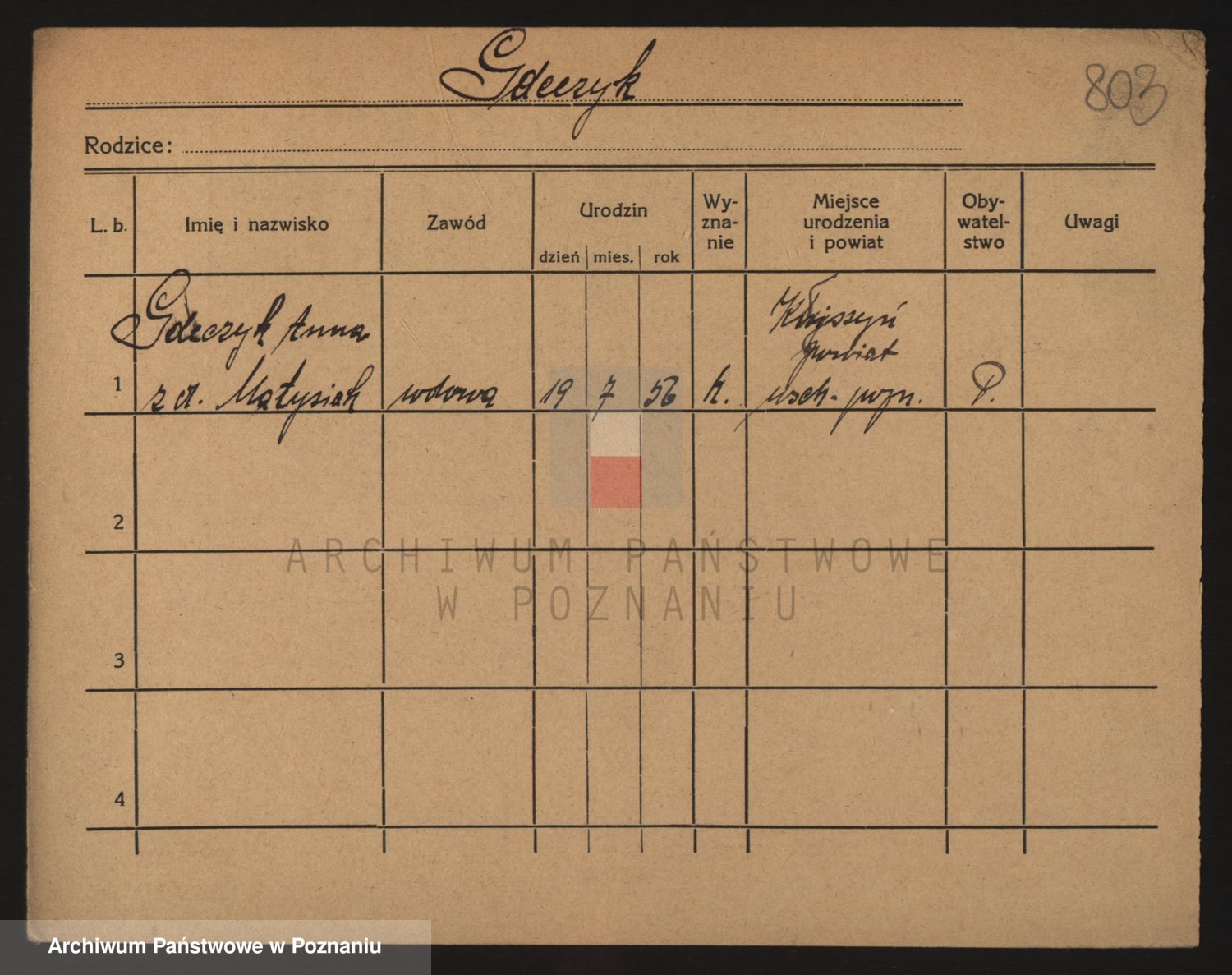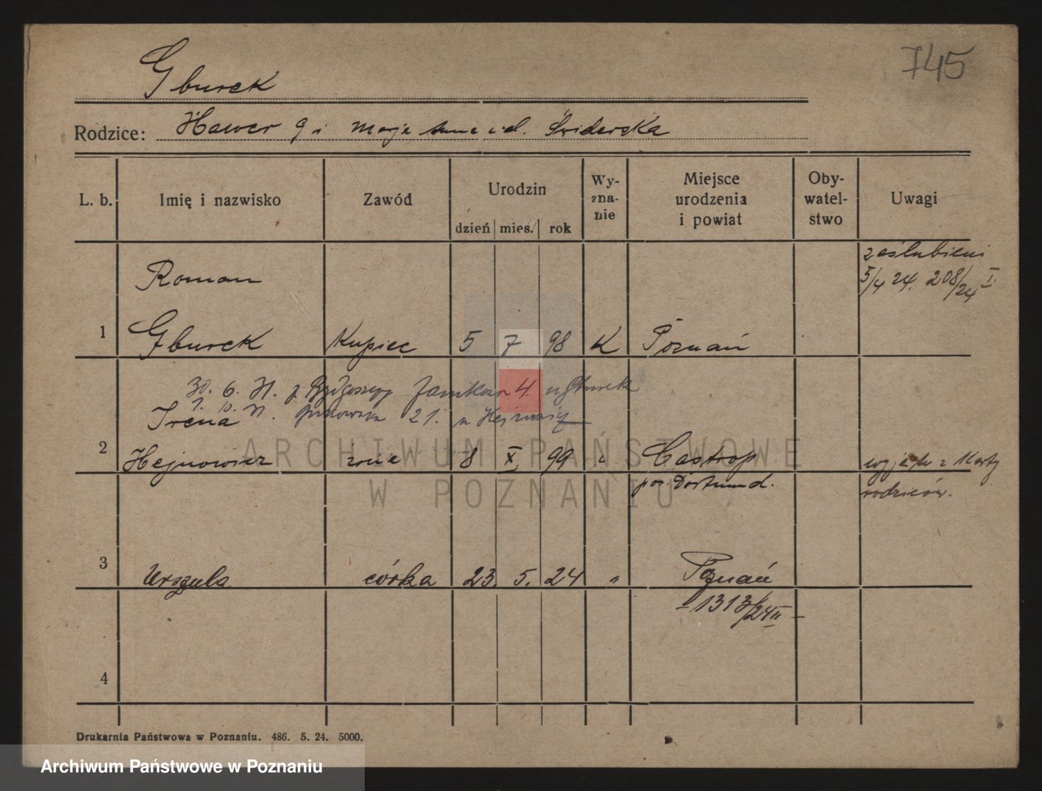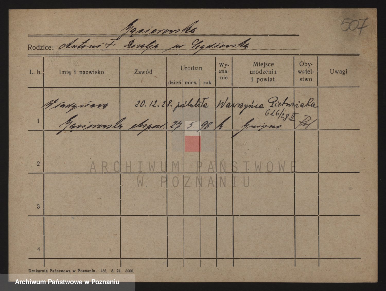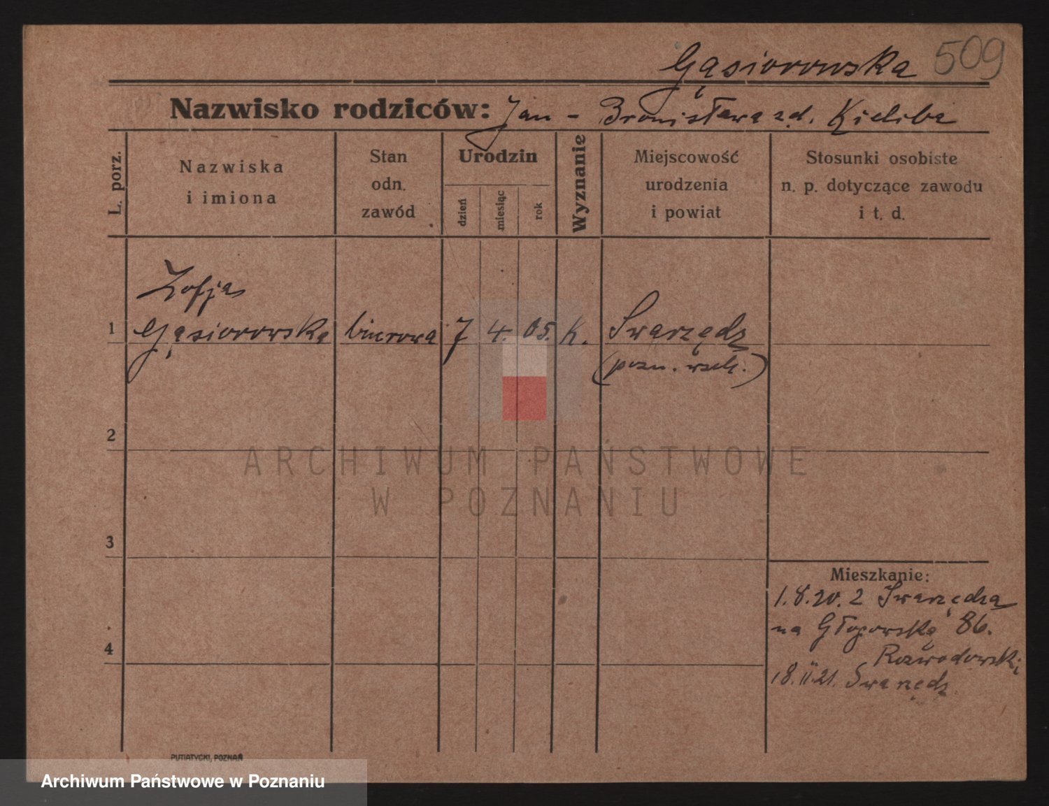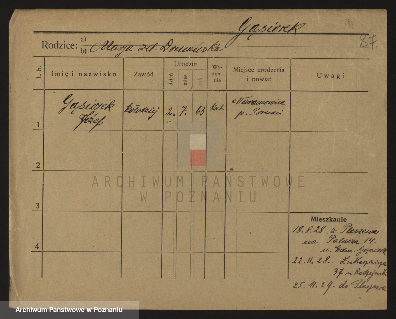 Podgląd karty osobowej dostępny jest po kliknięciu na nazwisko lub ikonkę karty. Można dokonywać powiększenia (ikony na górze) lub przechodzić między kolejnymi skanami (strzałki po bokach).