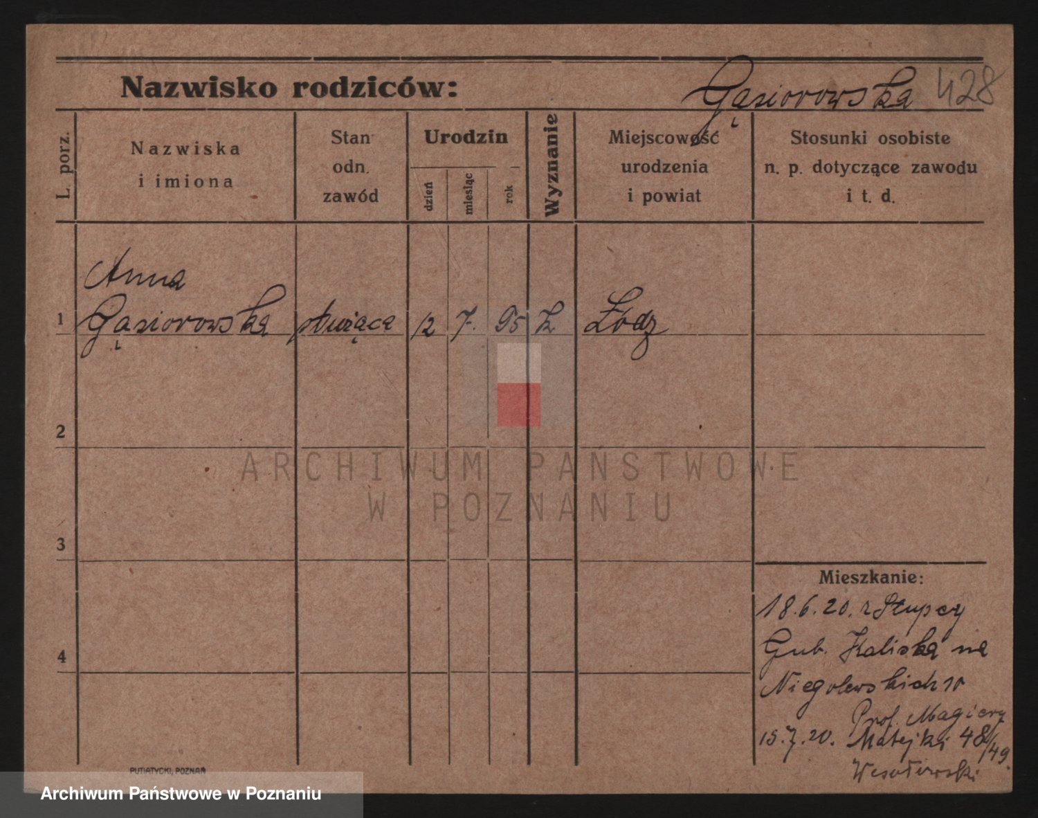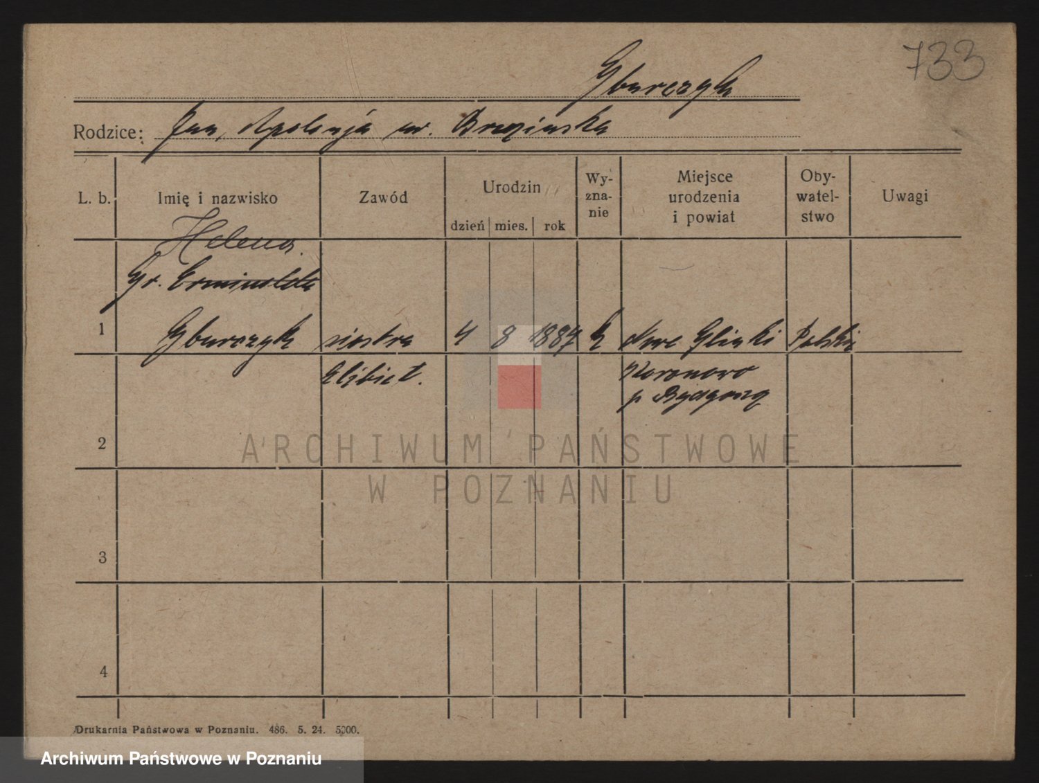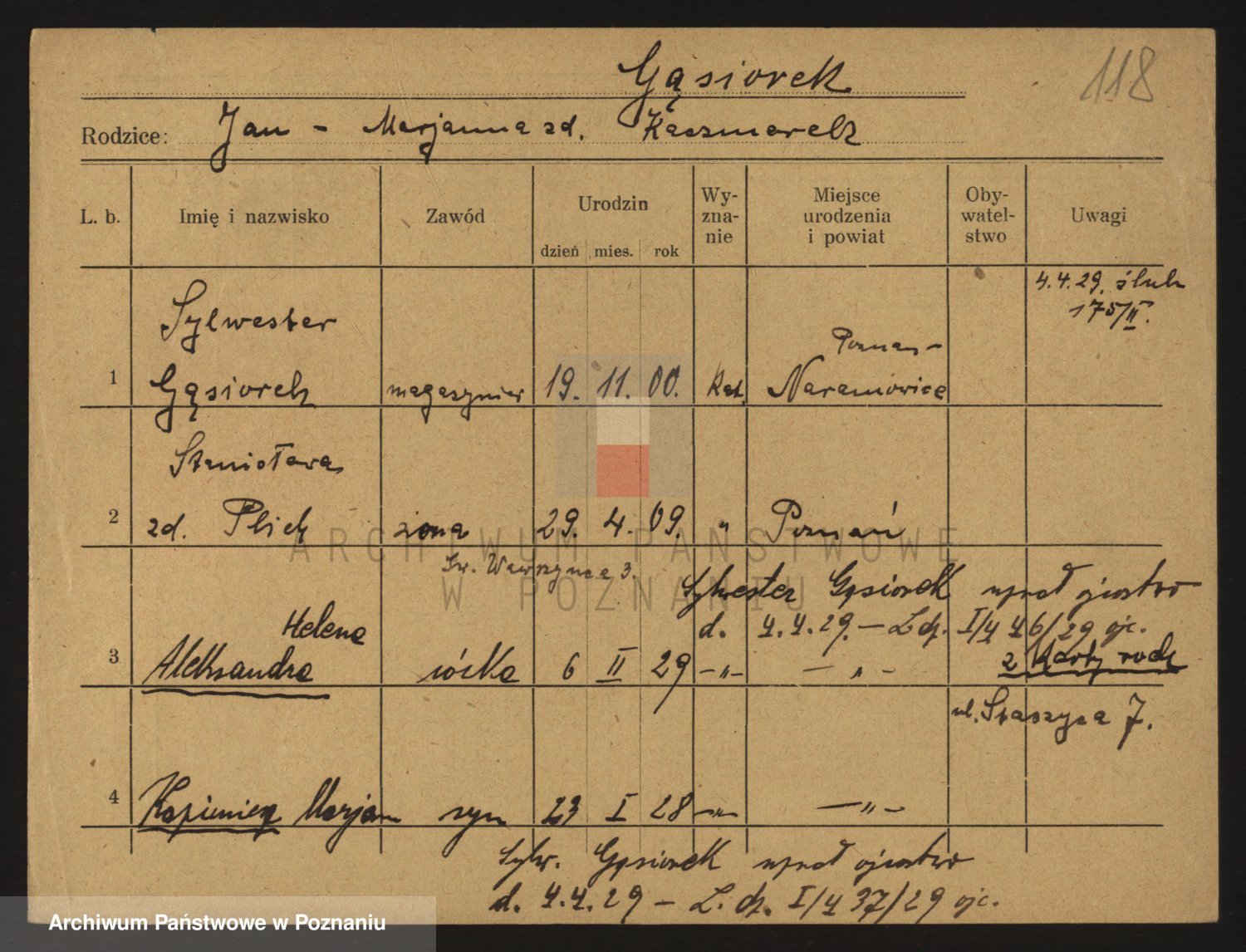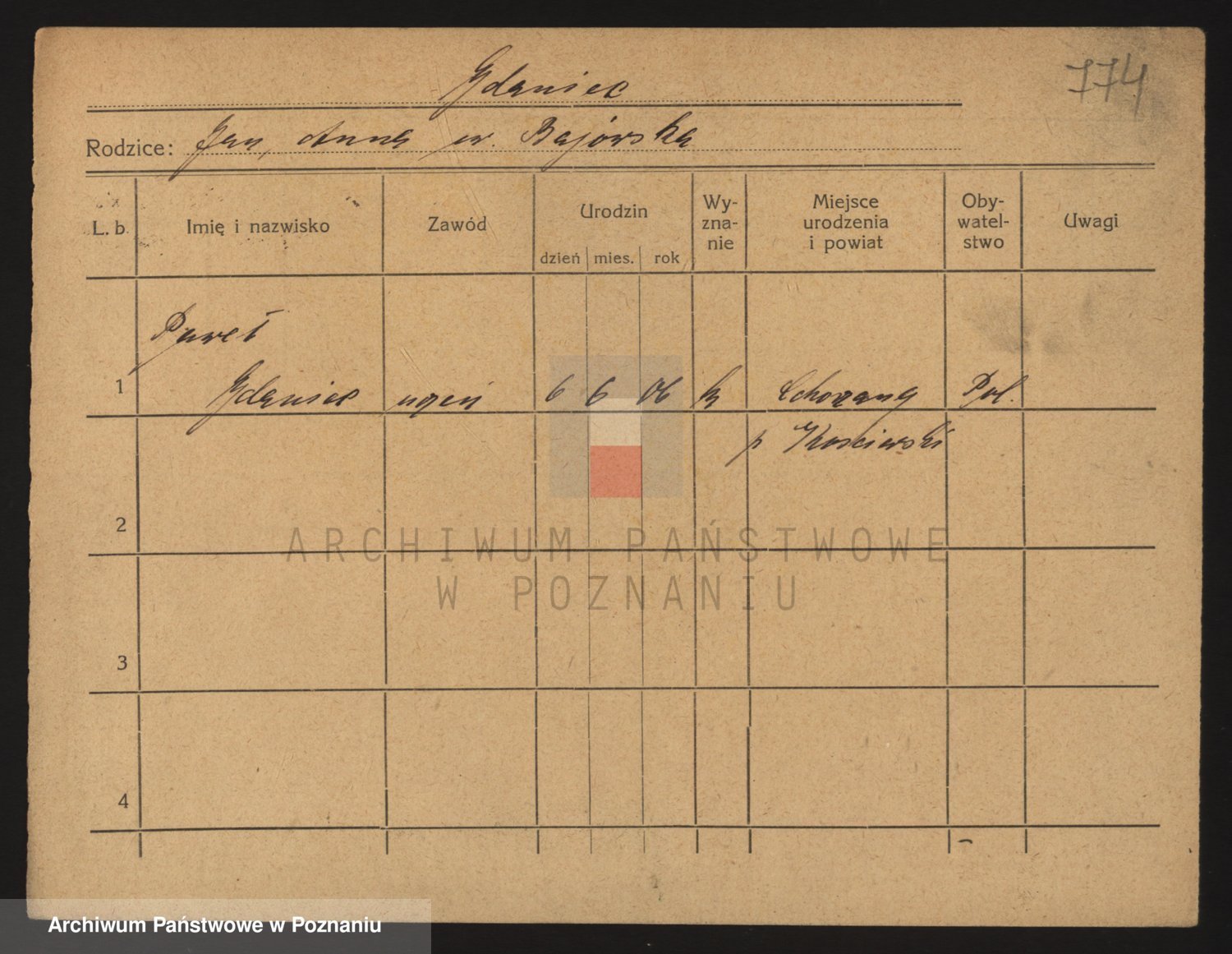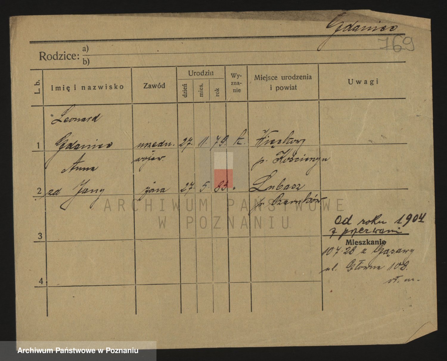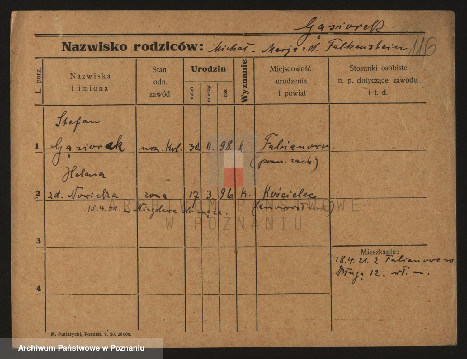 Podgląd karty osobowej dostępny jest po kliknięciu na nazwisko lub ikonkę karty. Można dokonywać powiększenia (ikony na górze) lub przechodzić między kolejnymi skanami (strzałki po bokach).