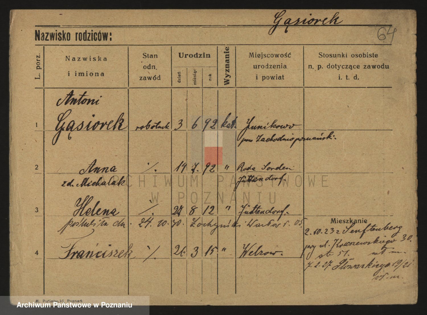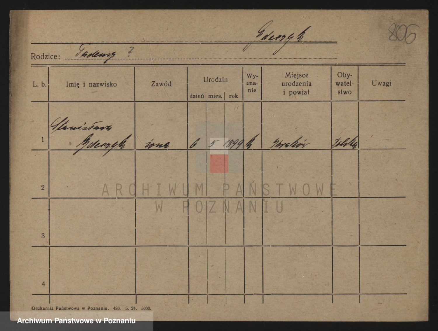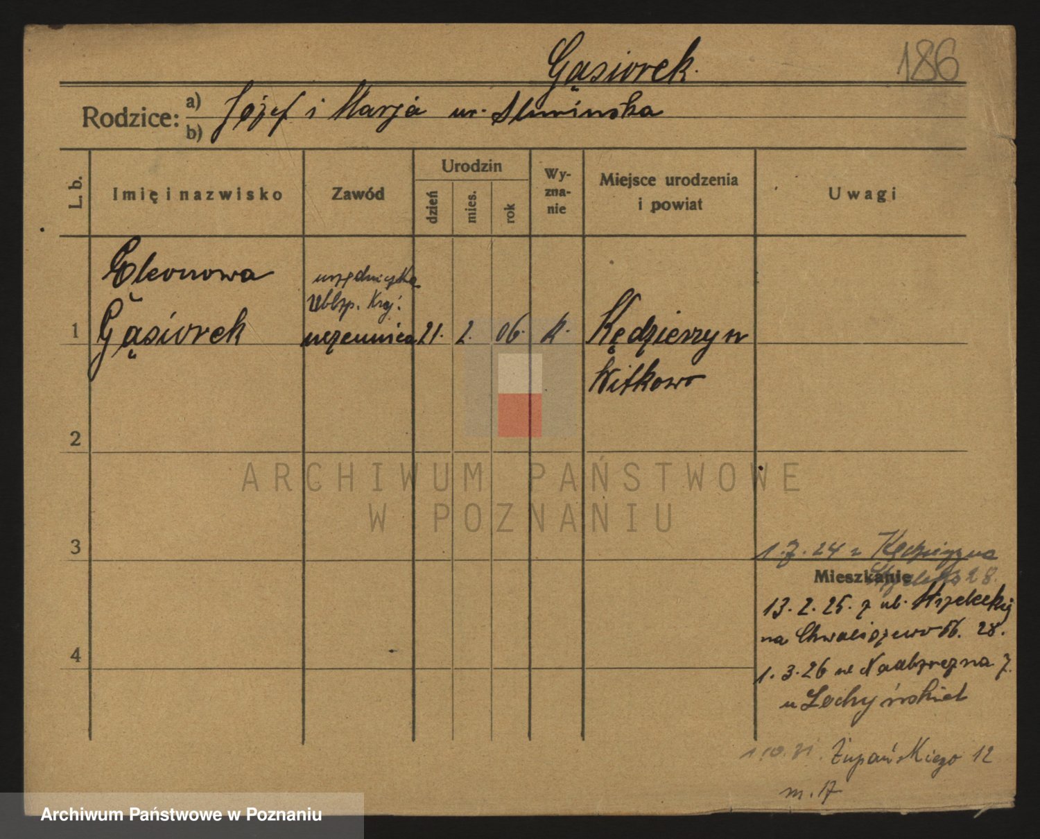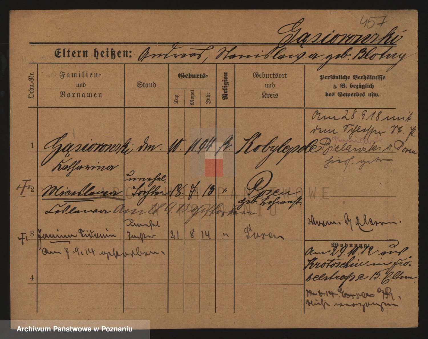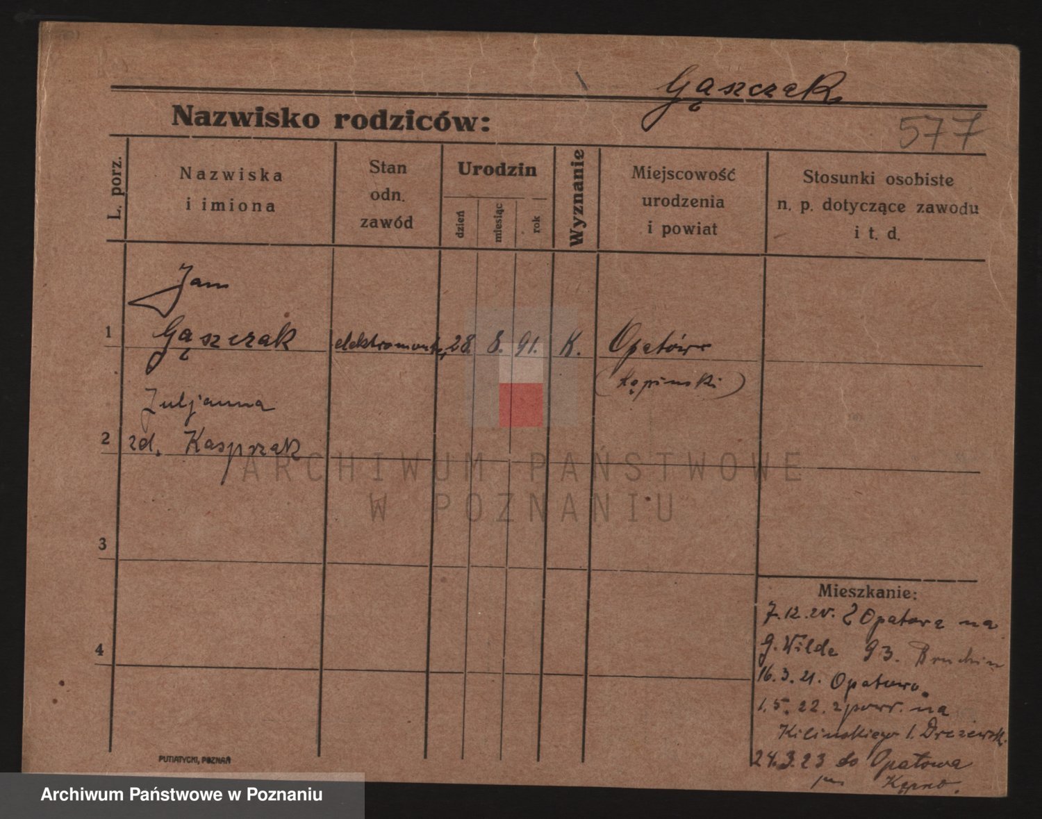 Podgląd karty osobowej dostępny jest po kliknięciu na nazwisko lub ikonkę karty. Można dokonywać powiększenia (ikony na górze) lub przechodzić między kolejnymi skanami (strzałki po bokach).