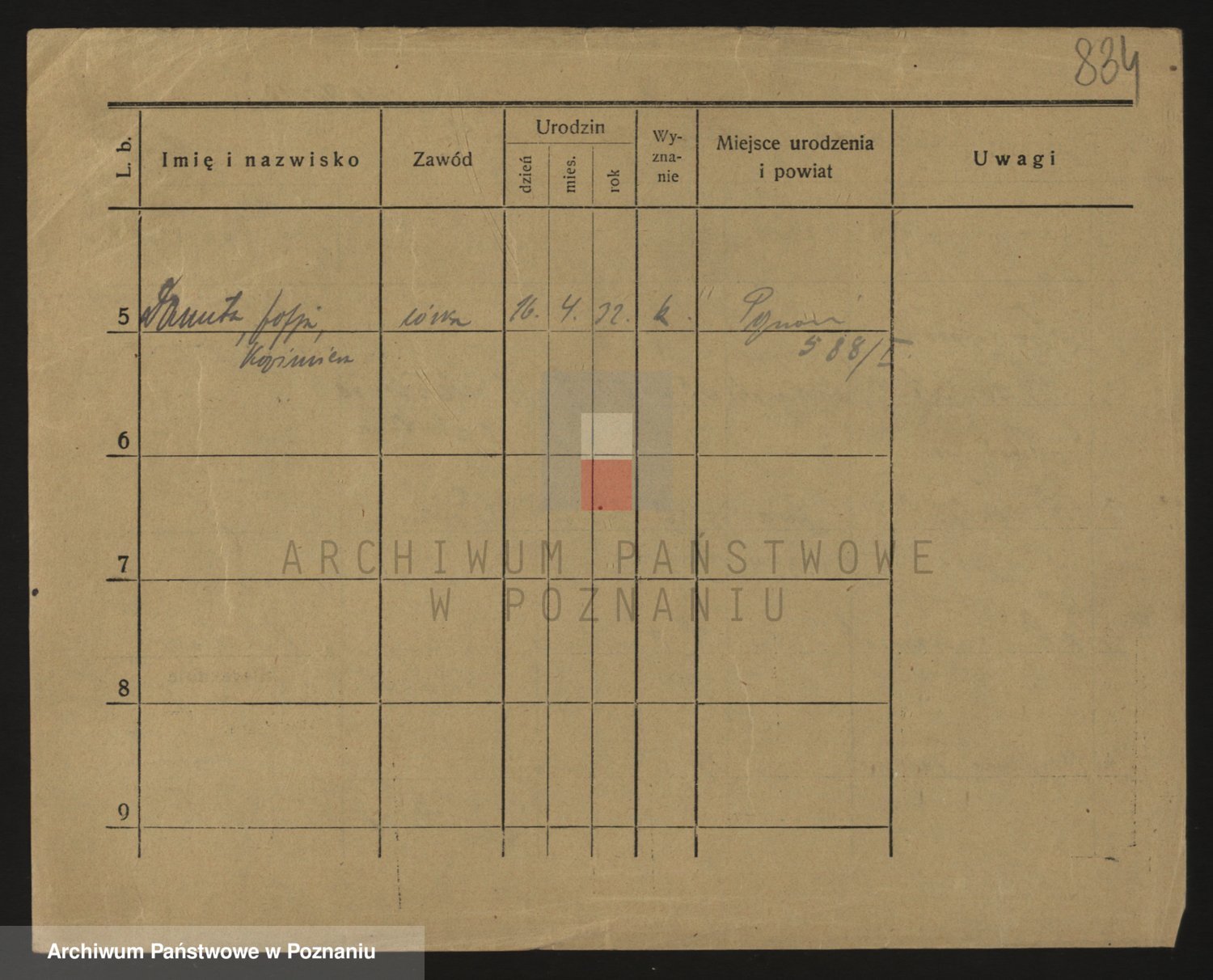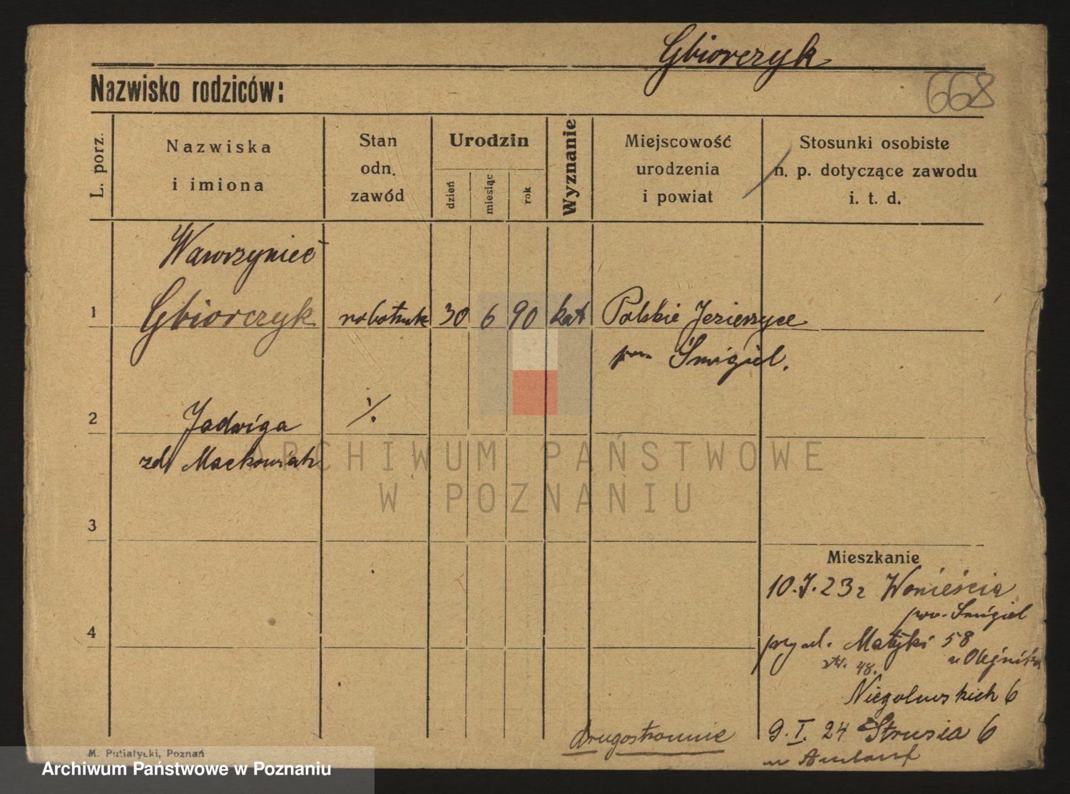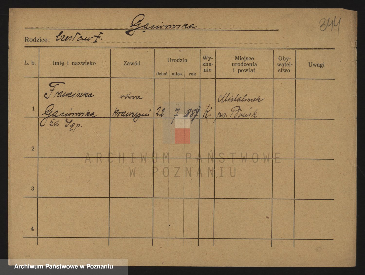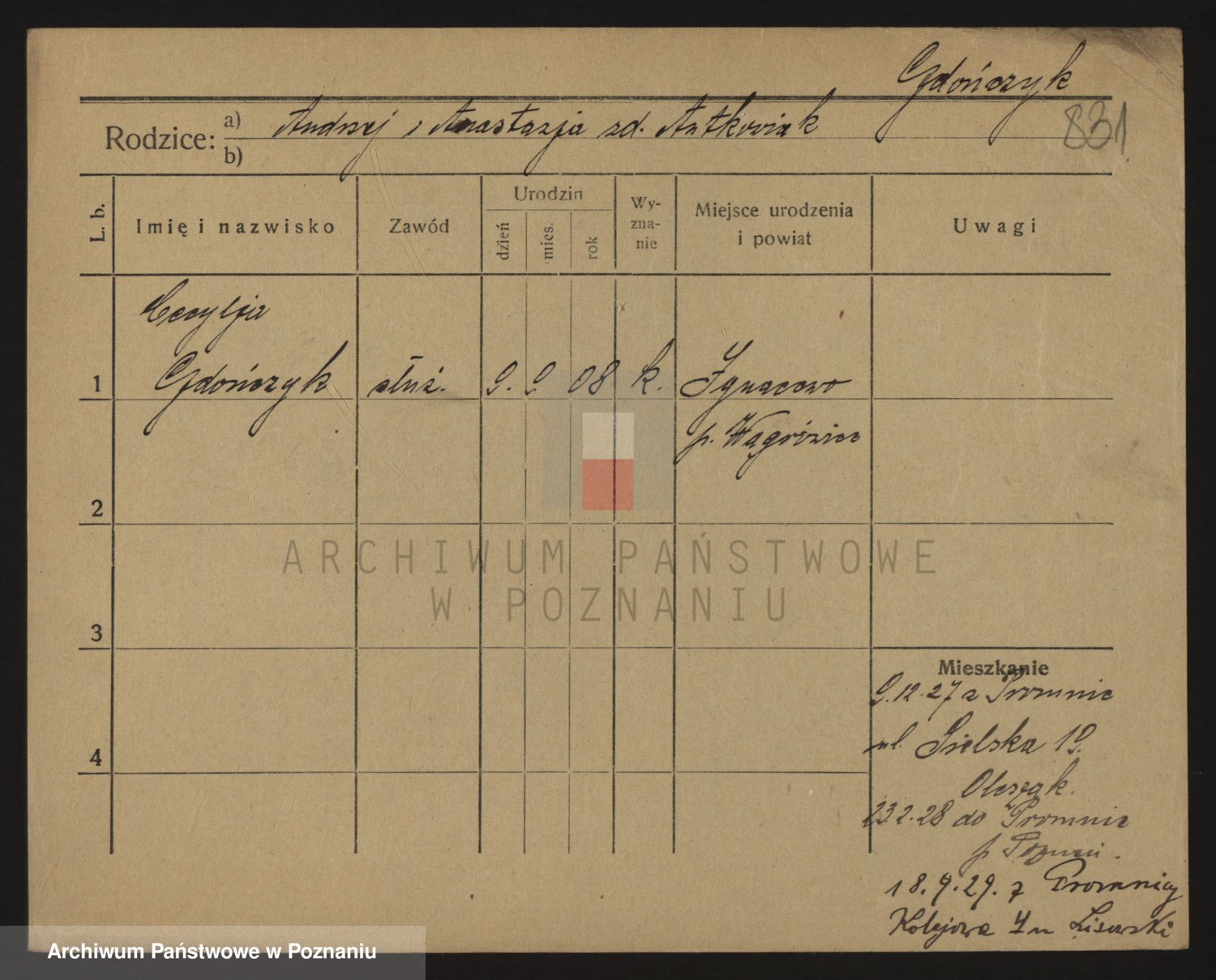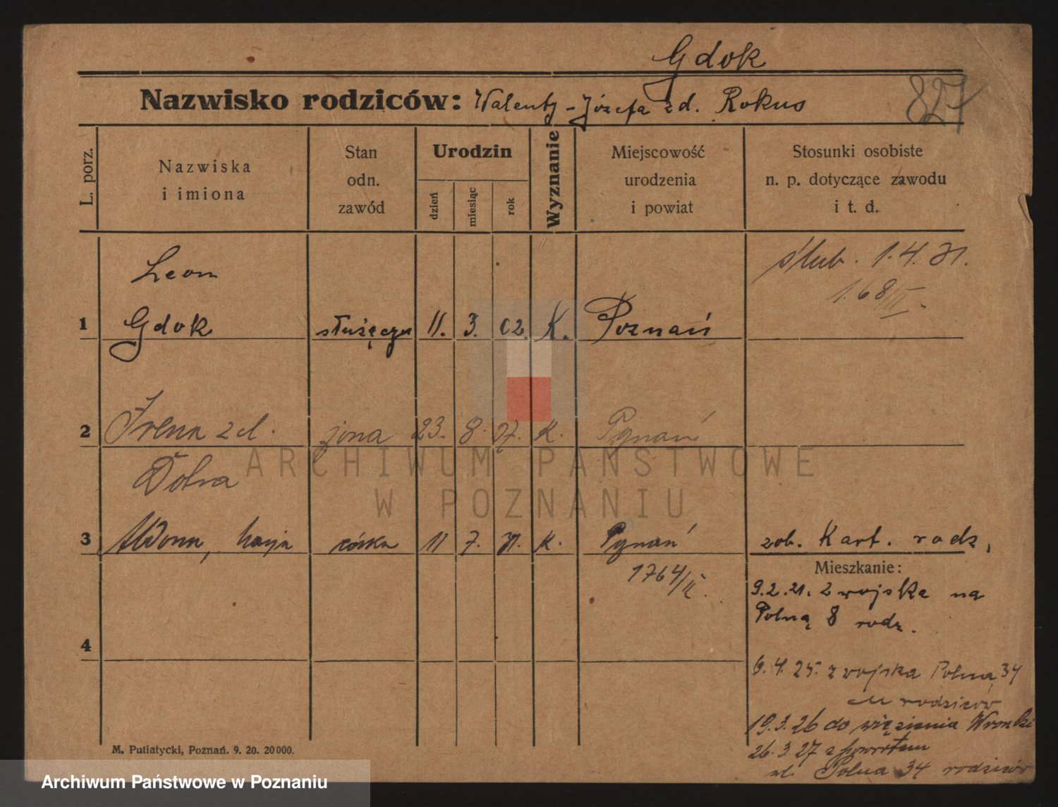 Podgląd karty osobowej dostępny jest po kliknięciu na nazwisko lub ikonkę karty. Można dokonywać powiększenia (ikony na górze) lub przechodzić między kolejnymi skanami (strzałki po bokach).