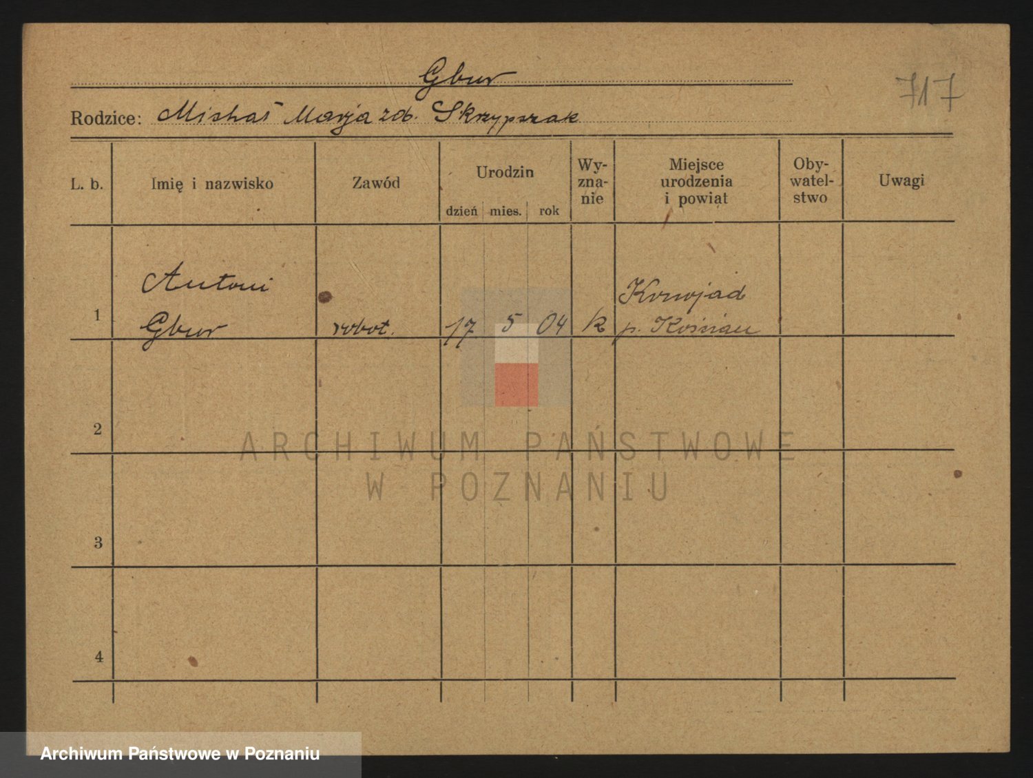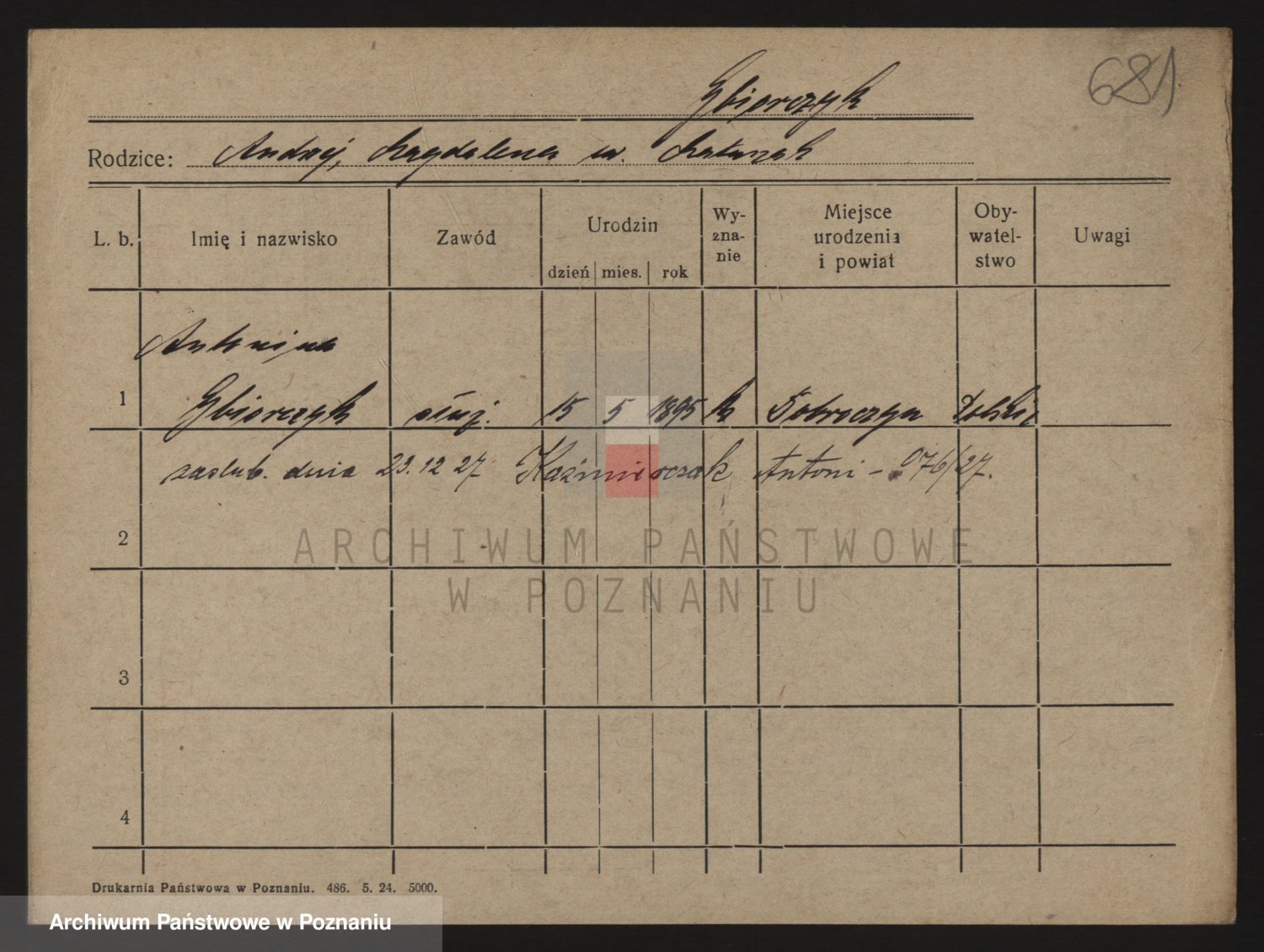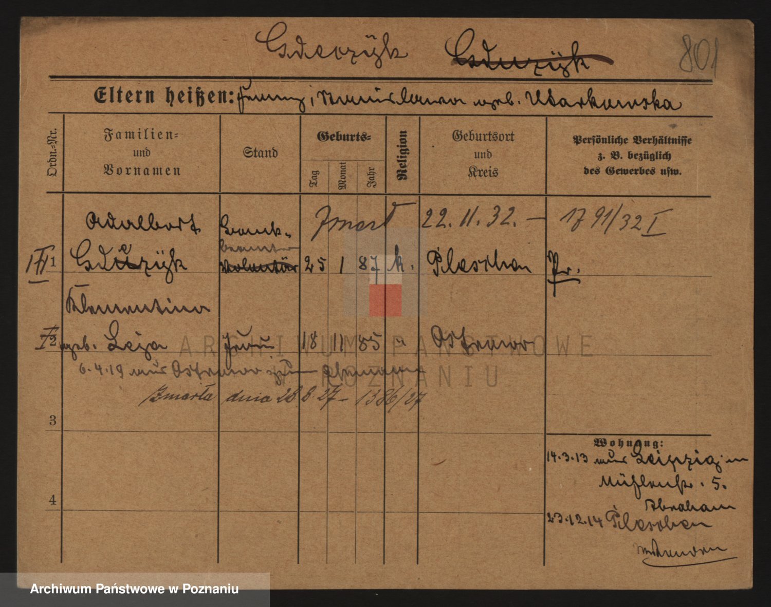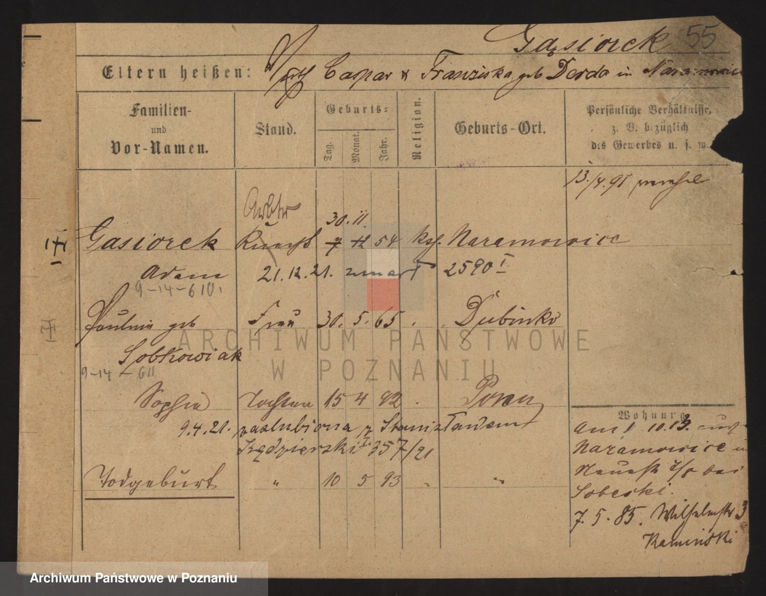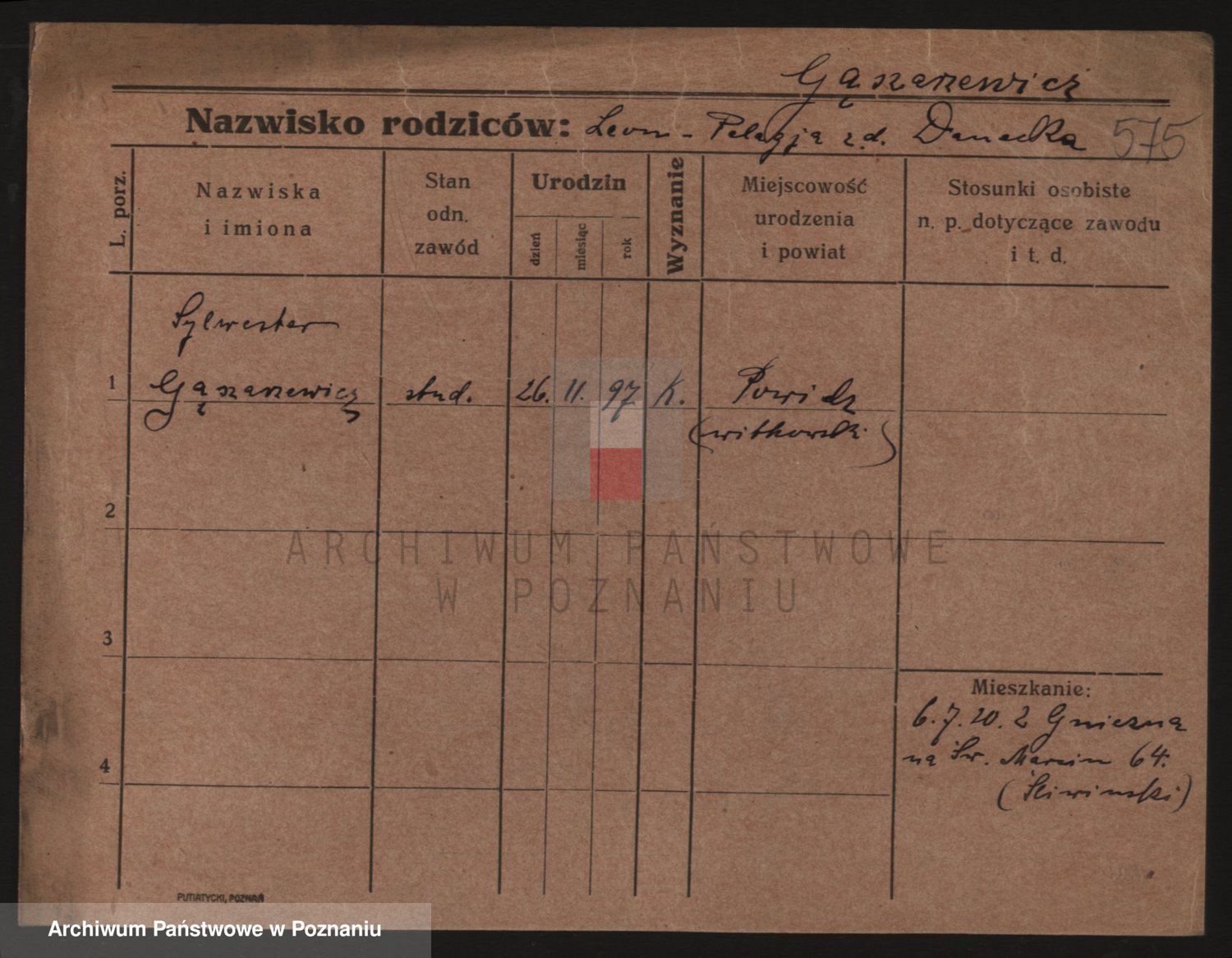 Podgląd karty osobowej dostępny jest po kliknięciu na nazwisko lub ikonkę karty. Można dokonywać powiększenia (ikony na górze) lub przechodzić między kolejnymi skanami (strzałki po bokach).