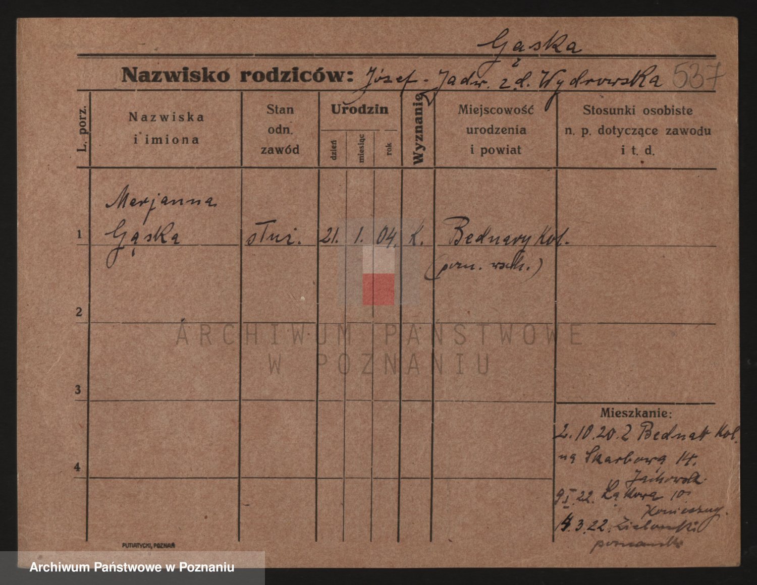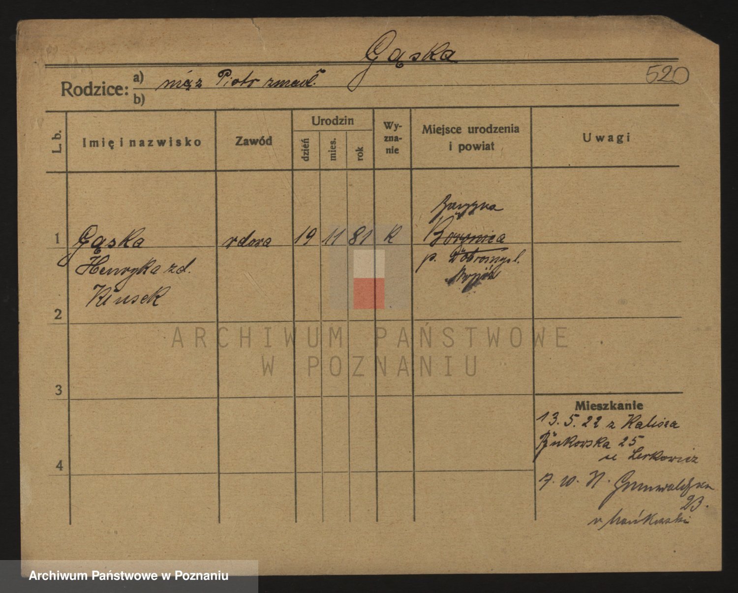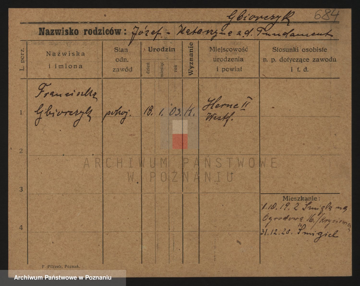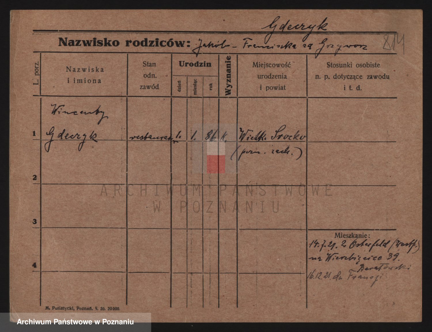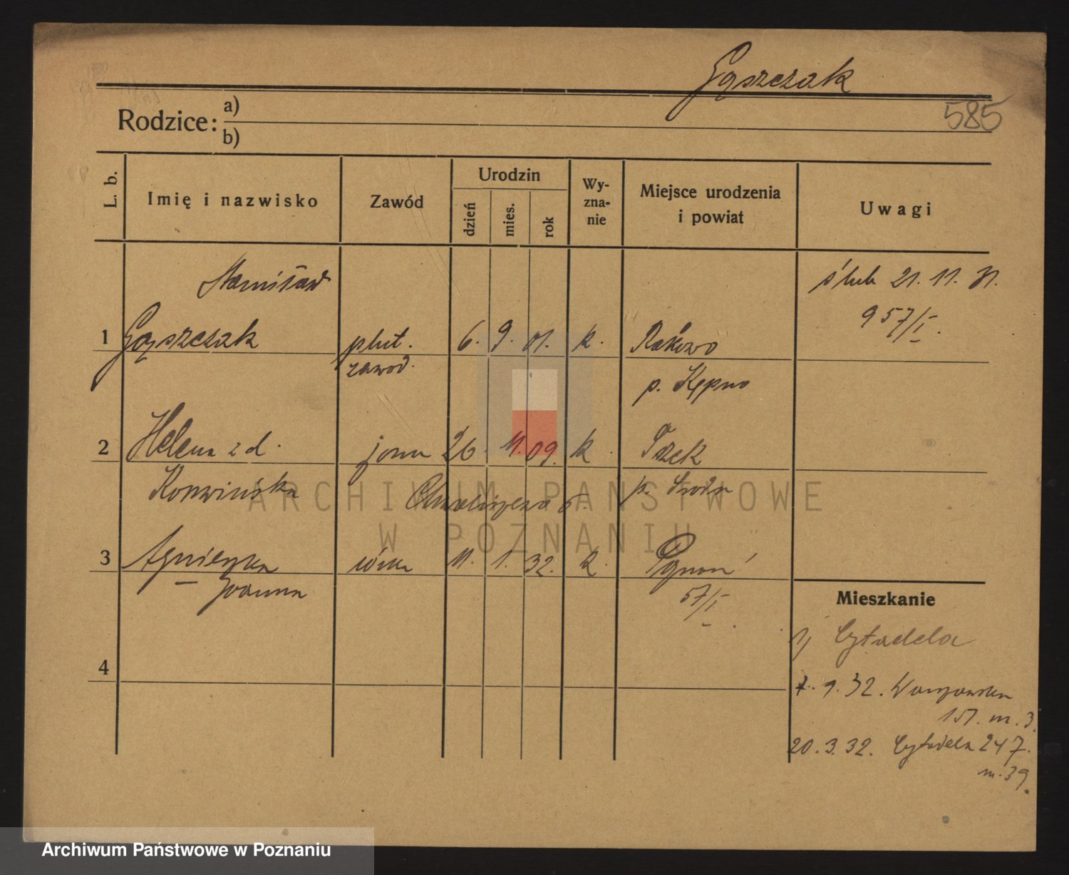 Podgląd karty osobowej dostępny jest po kliknięciu na nazwisko lub ikonkę karty. Można dokonywać powiększenia (ikony na górze) lub przechodzić między kolejnymi skanami (strzałki po bokach).