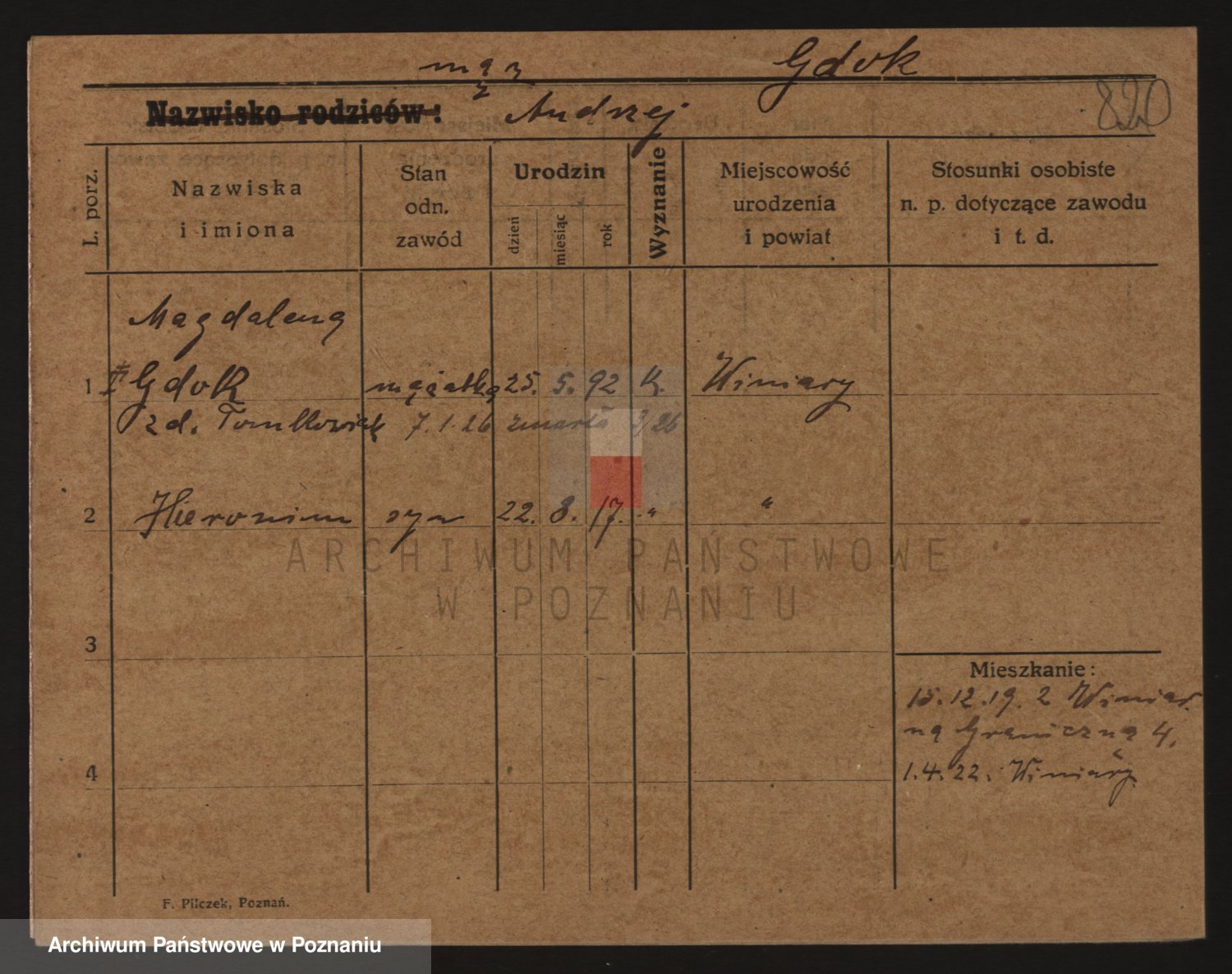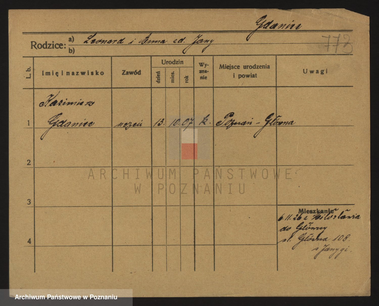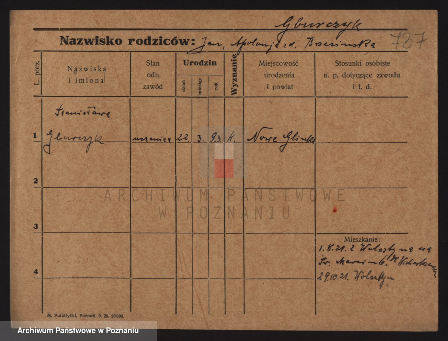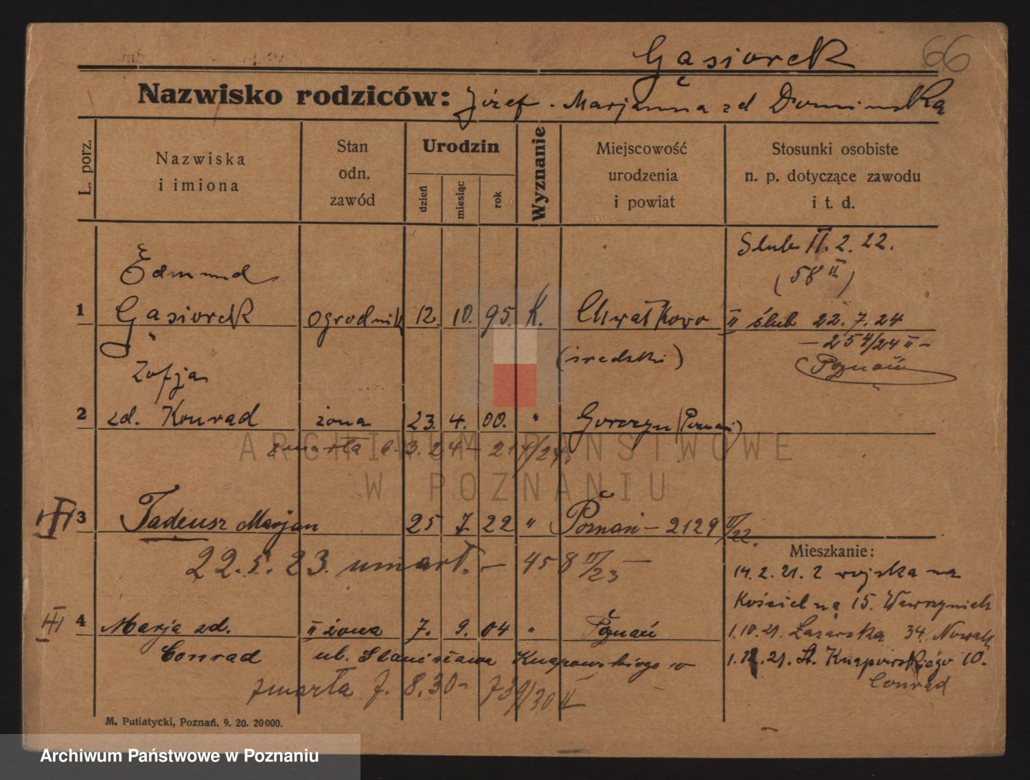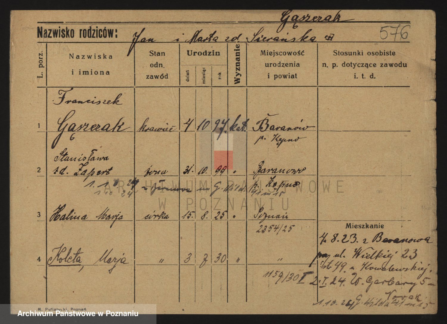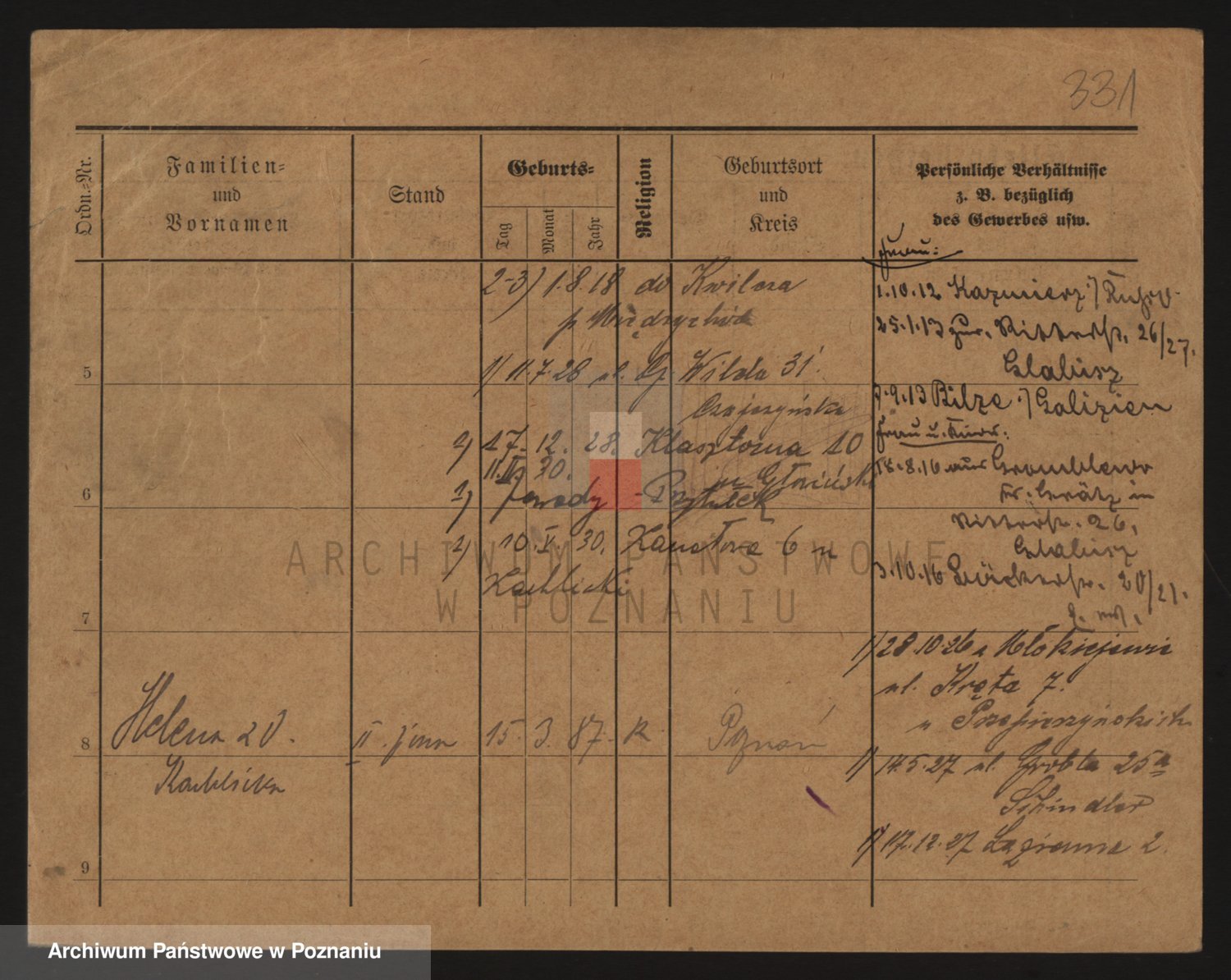 Podgląd karty osobowej dostępny jest po kliknięciu na nazwisko lub ikonkę karty. Można dokonywać powiększenia (ikony na górze) lub przechodzić między kolejnymi skanami (strzałki po bokach).