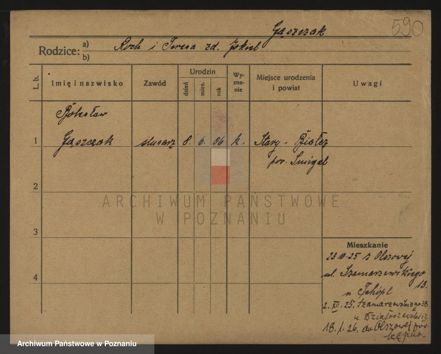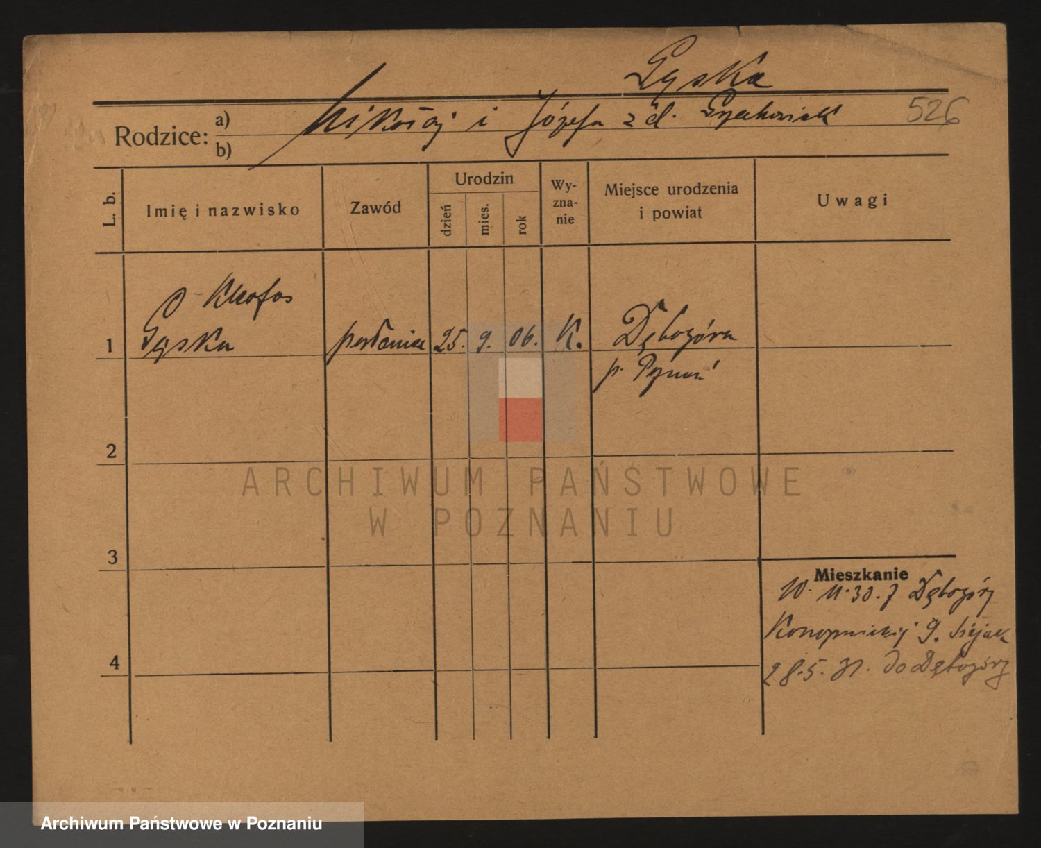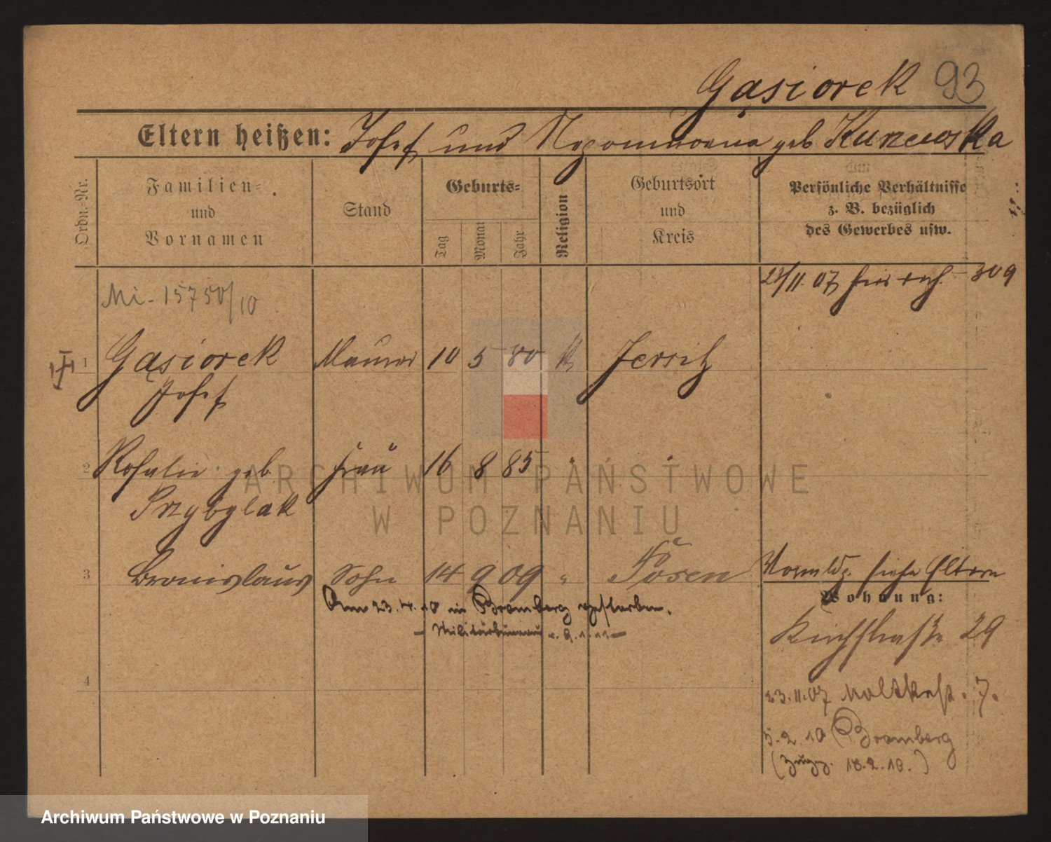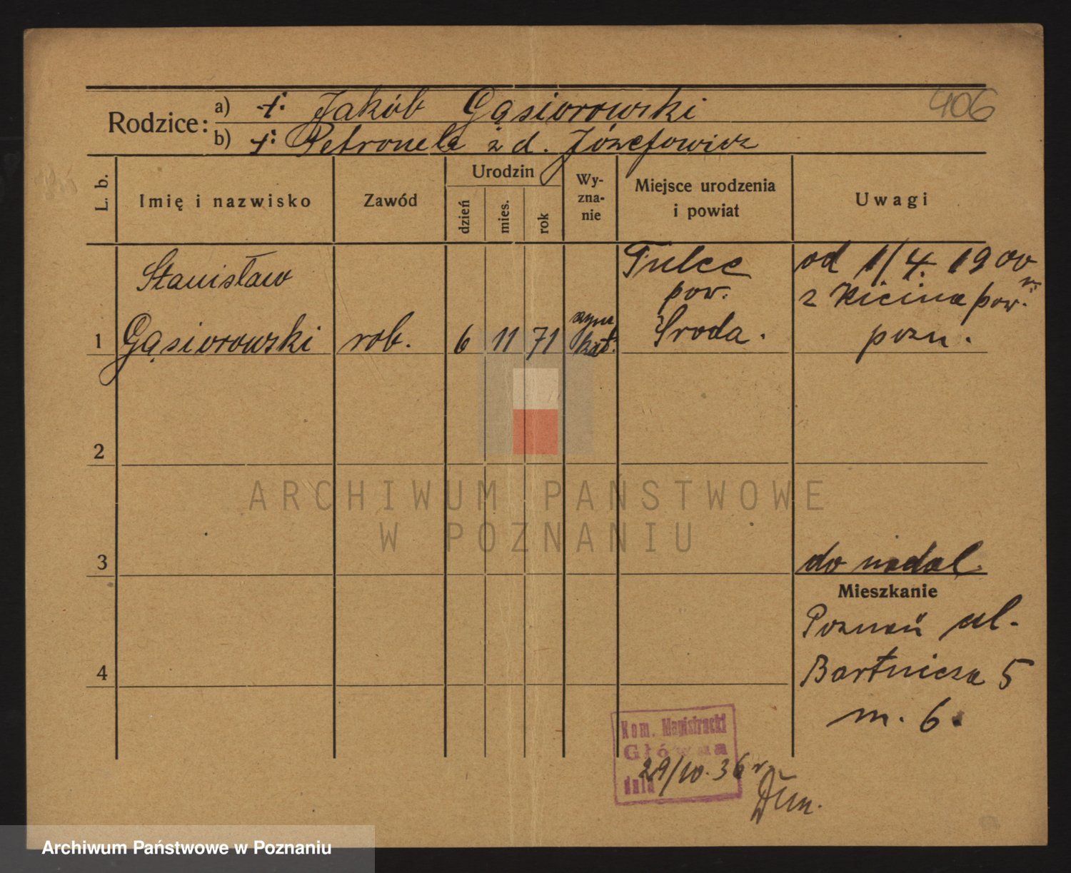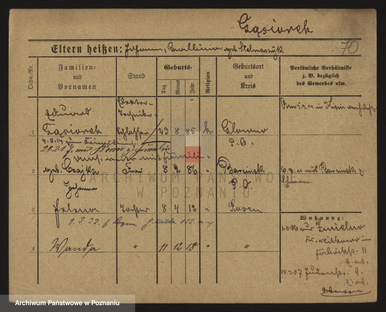 Podgląd karty osobowej dostępny jest po kliknięciu na nazwisko lub ikonkę karty. Można dokonywać powiększenia (ikony na górze) lub przechodzić między kolejnymi skanami (strzałki po bokach).