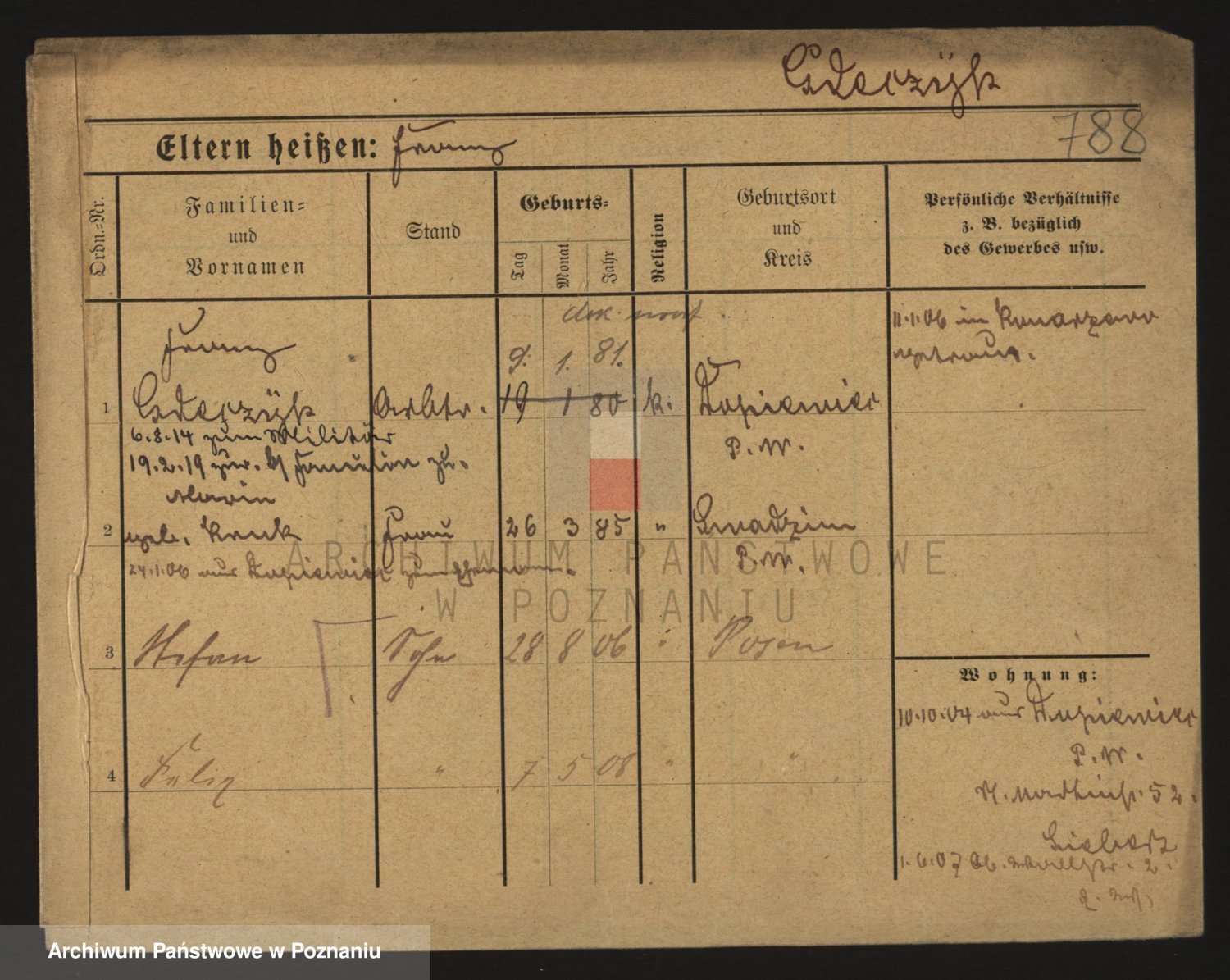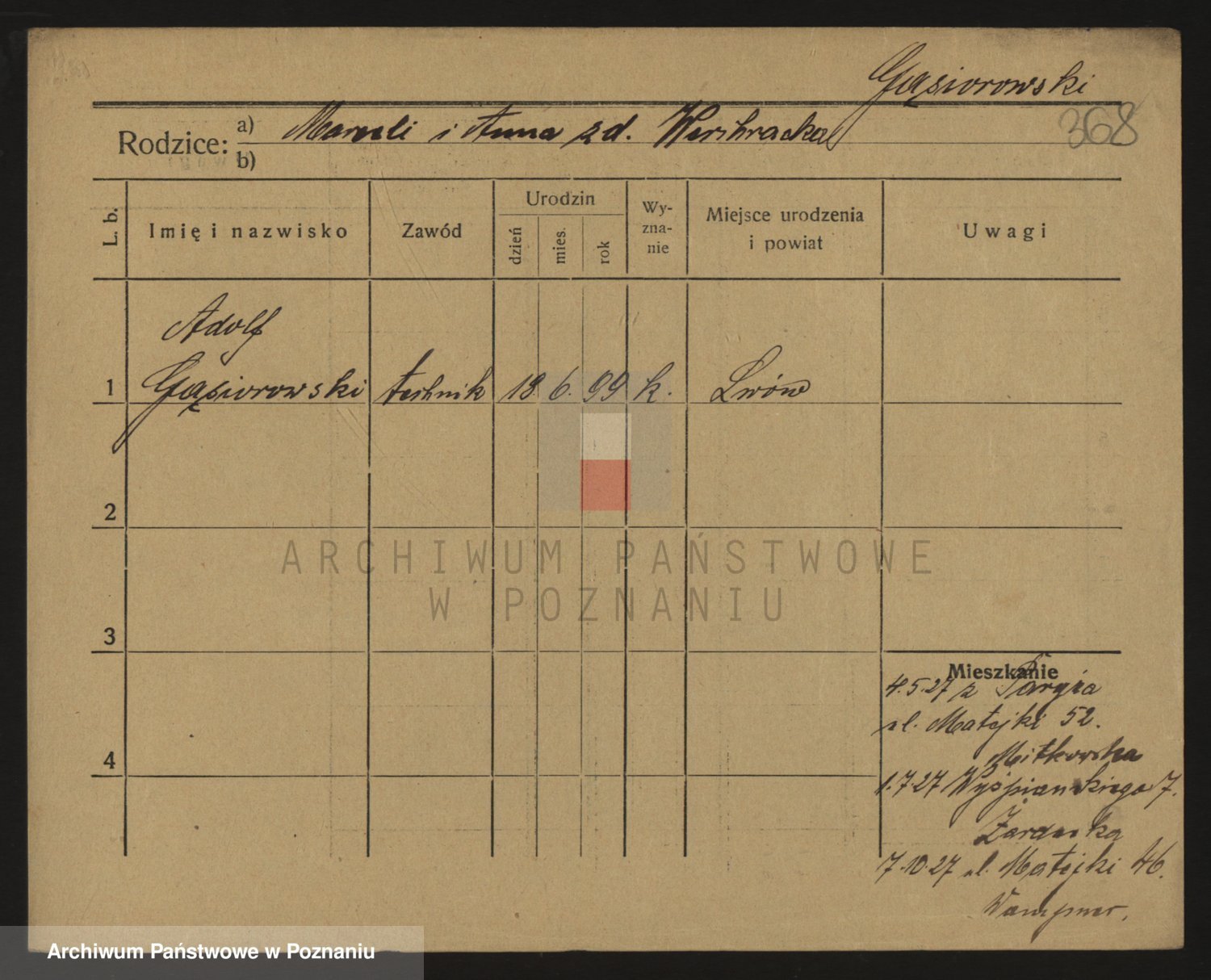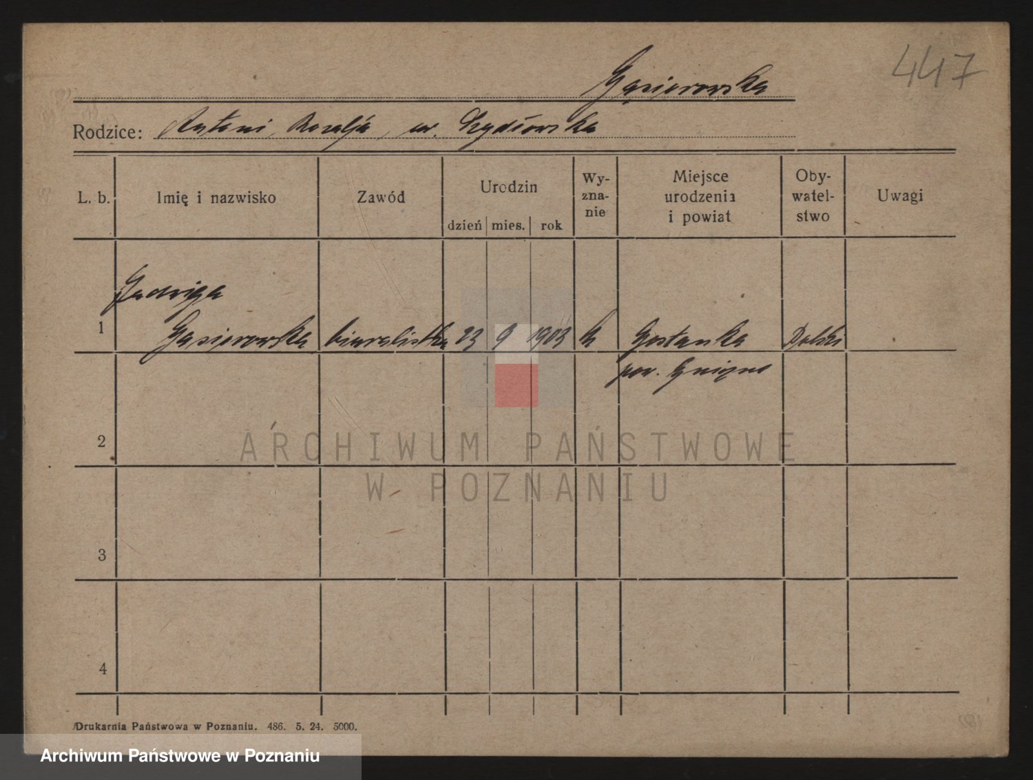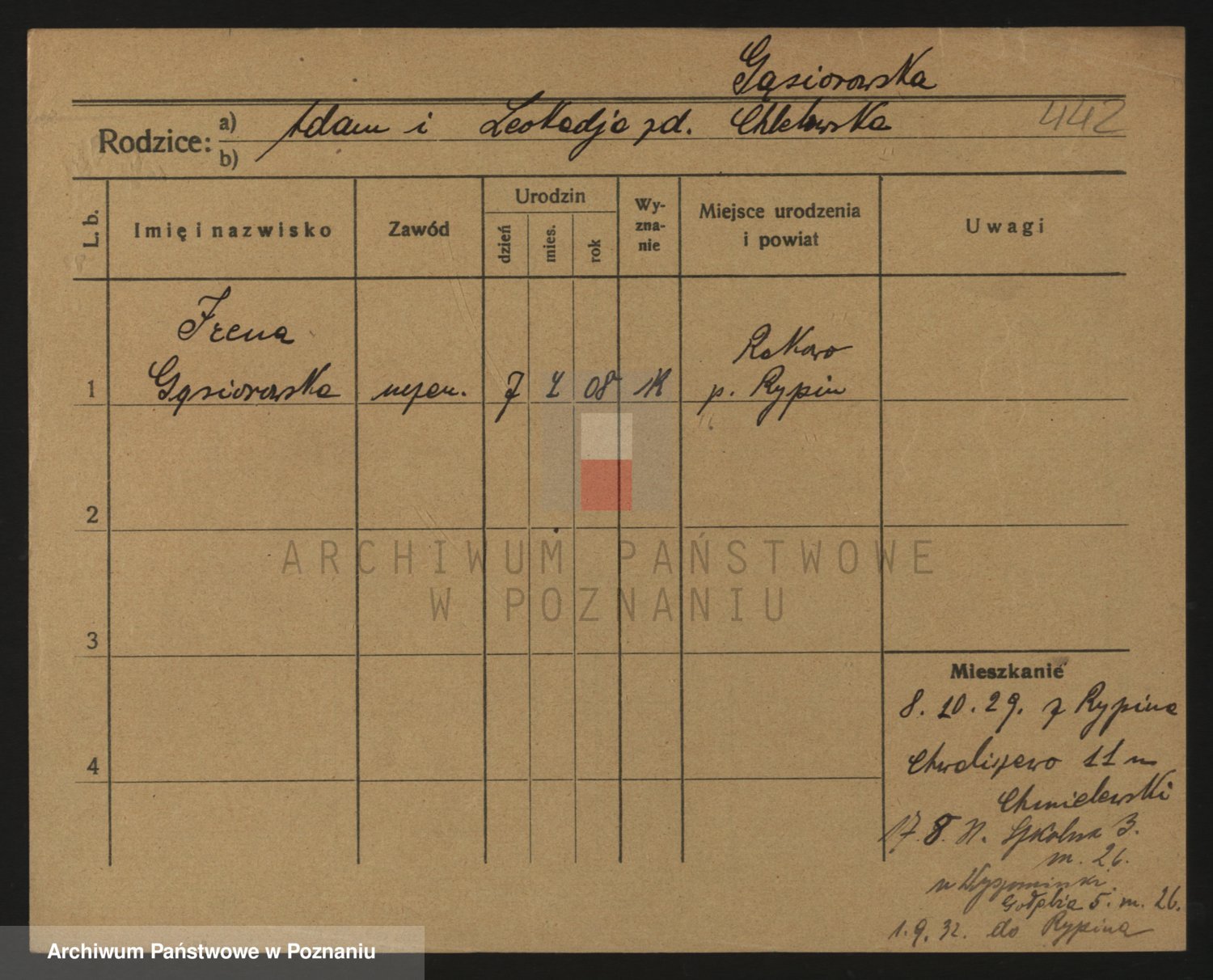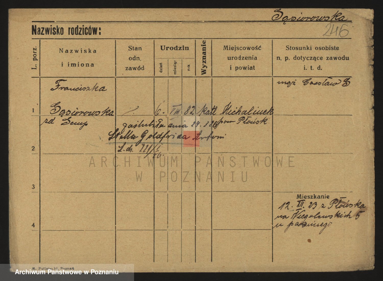 Podgląd karty osobowej dostępny jest po kliknięciu na nazwisko lub ikonkę karty. Można dokonywać powiększenia (ikony na górze) lub przechodzić między kolejnymi skanami (strzałki po bokach).