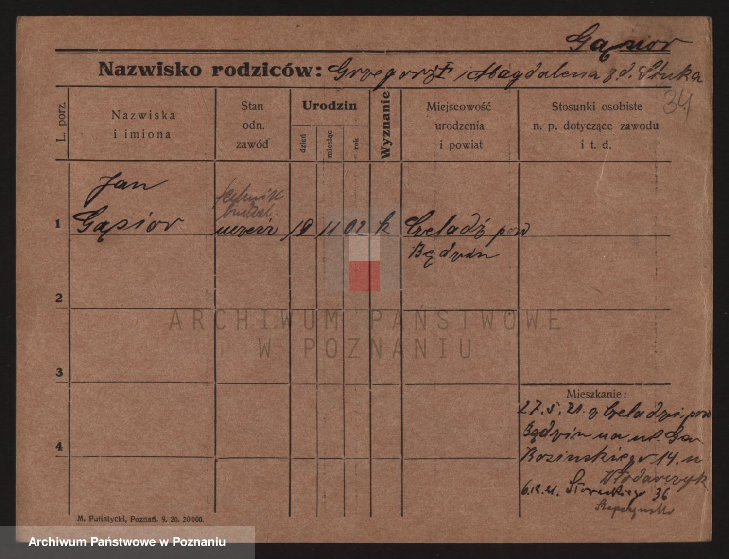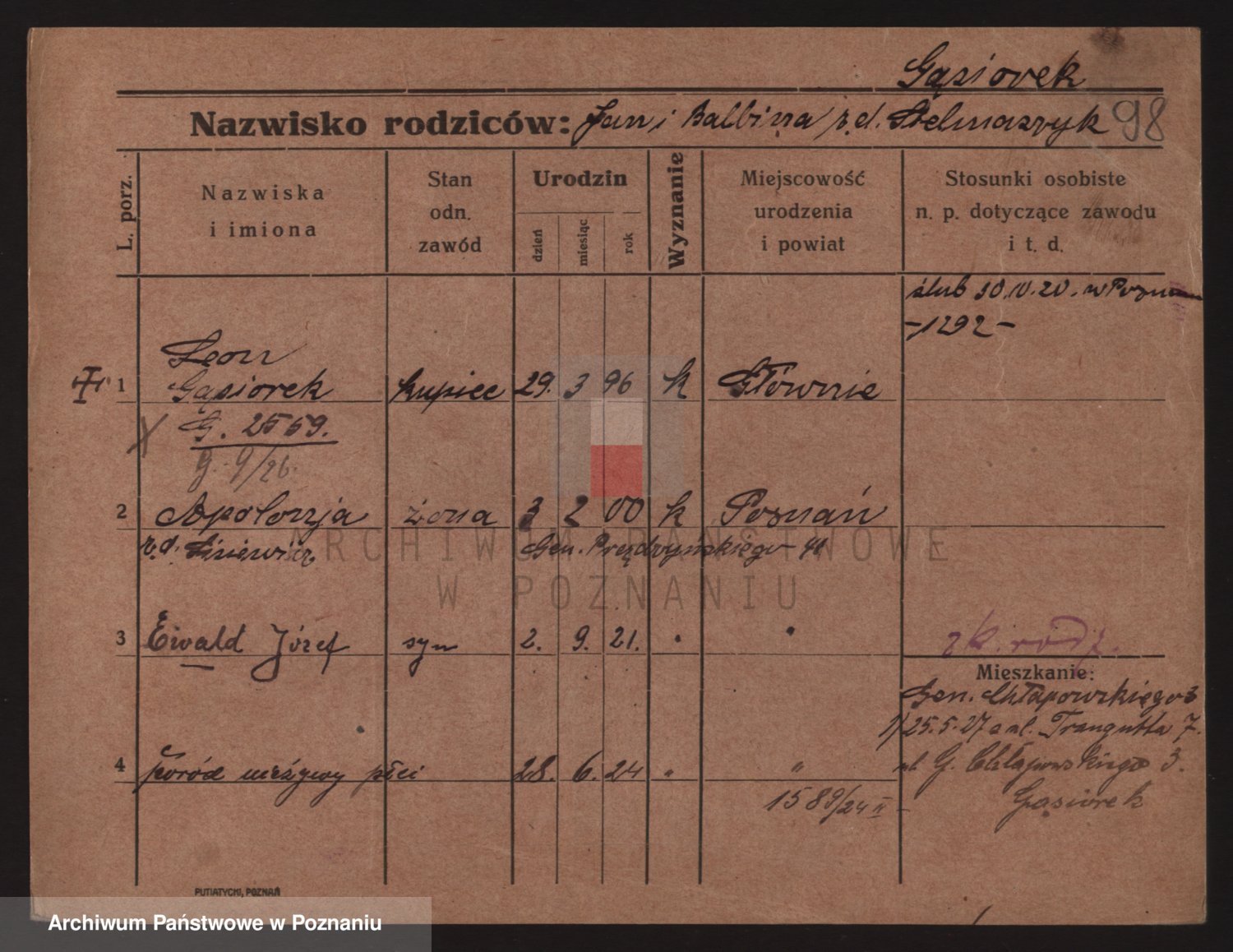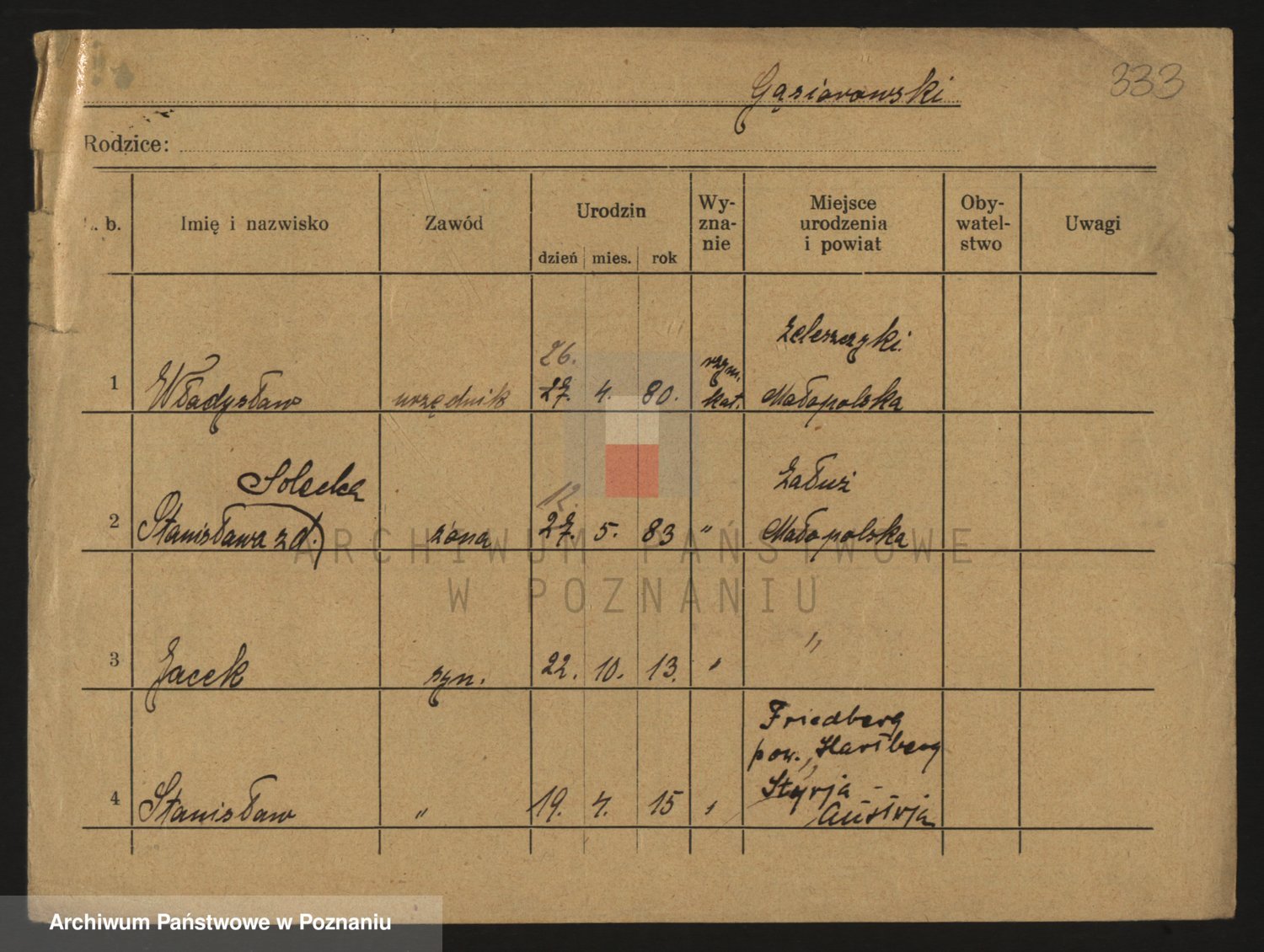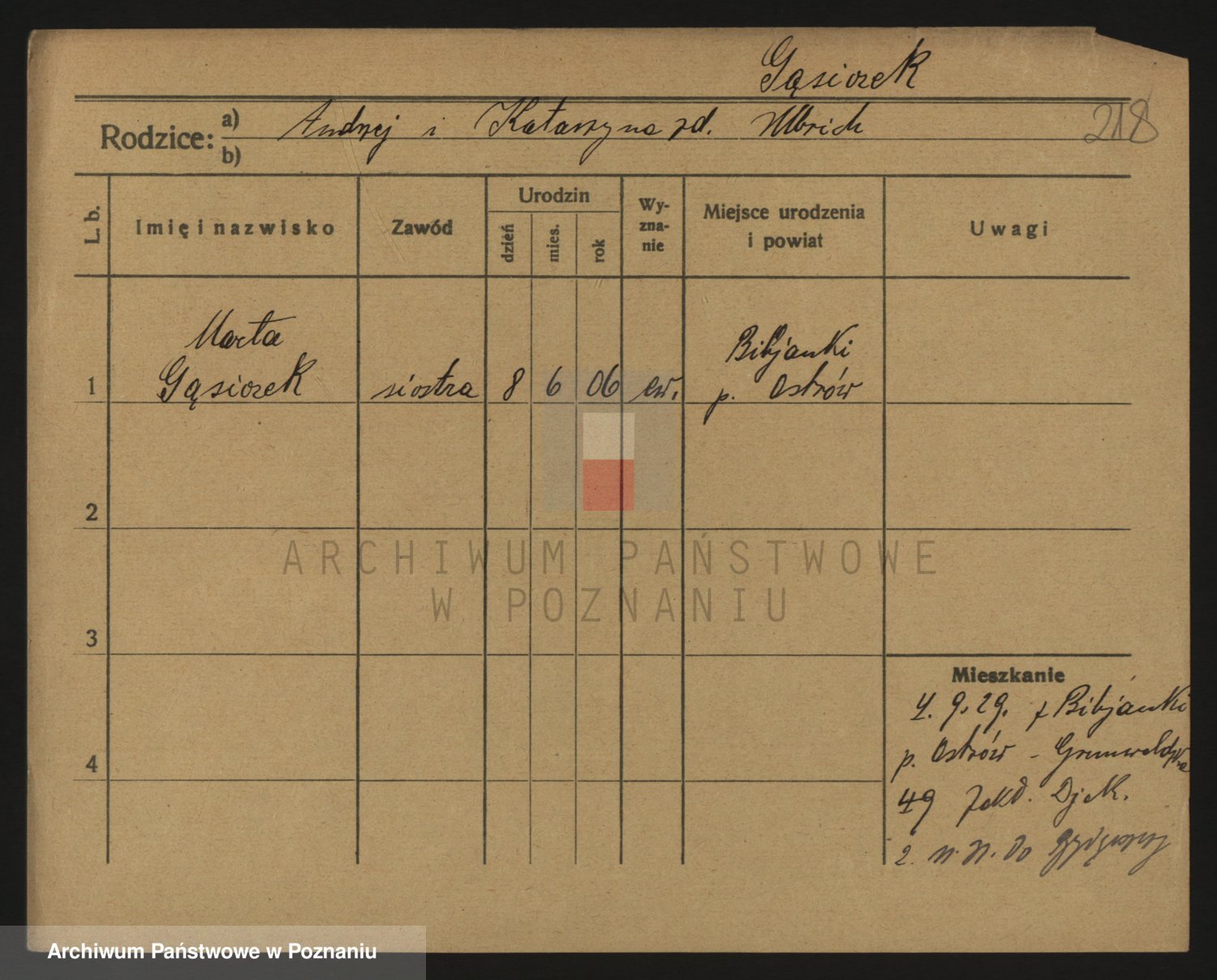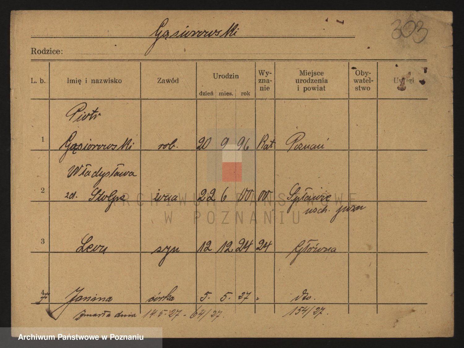 Podgląd karty osobowej dostępny jest po kliknięciu na nazwisko lub ikonkę karty. Można dokonywać powiększenia (ikony na górze) lub przechodzić między kolejnymi skanami (strzałki po bokach).