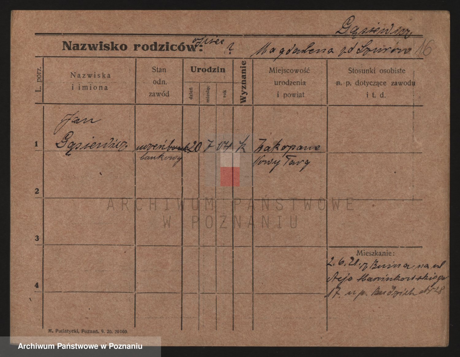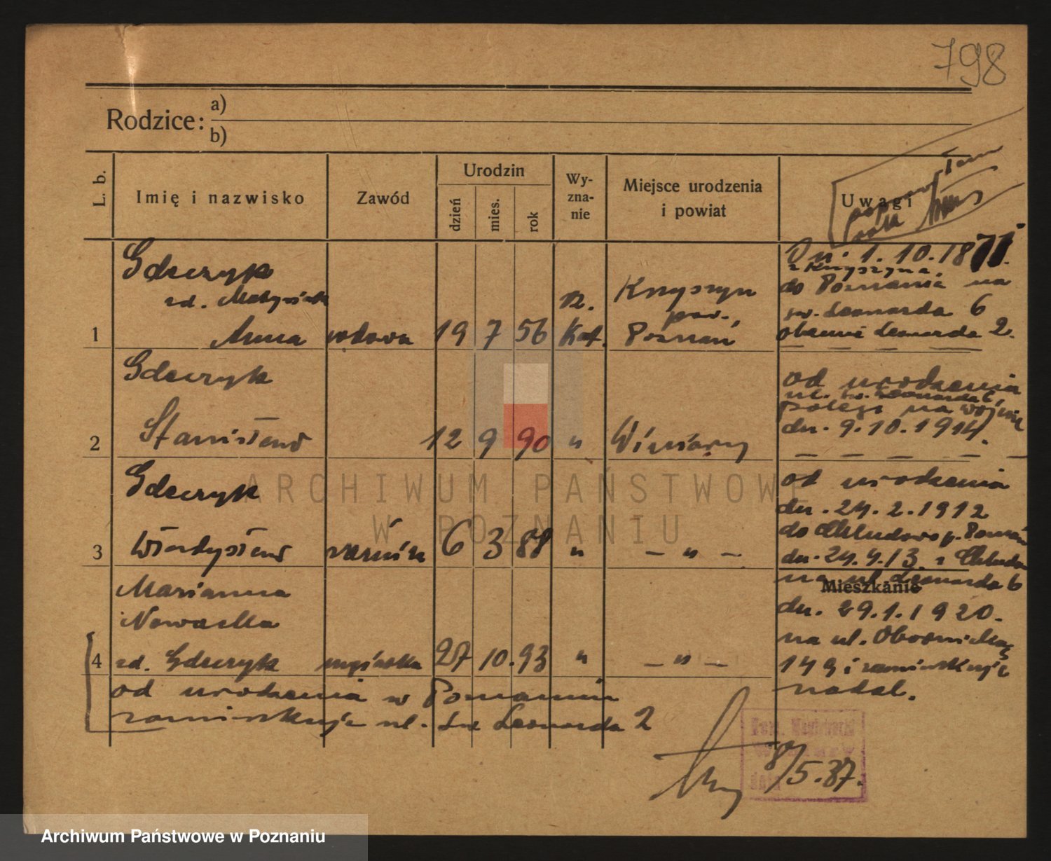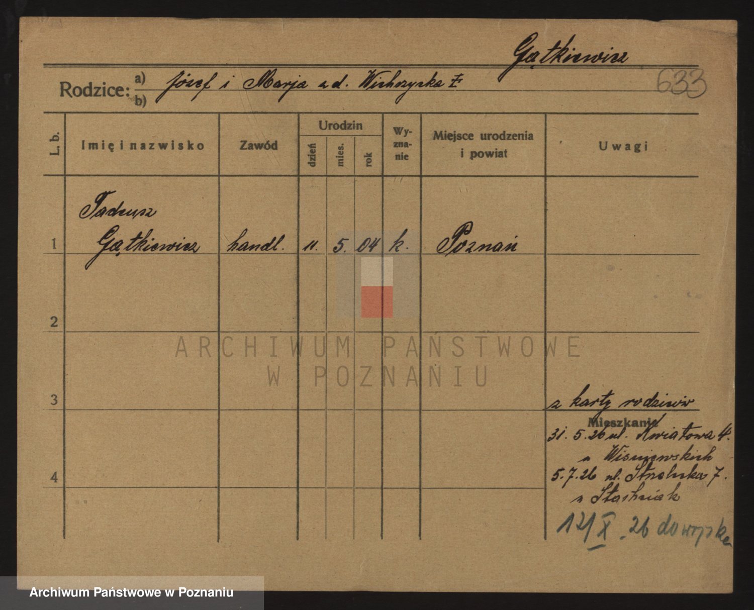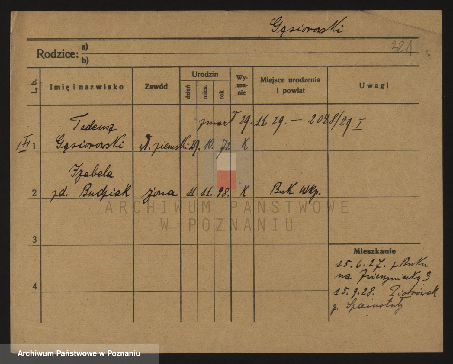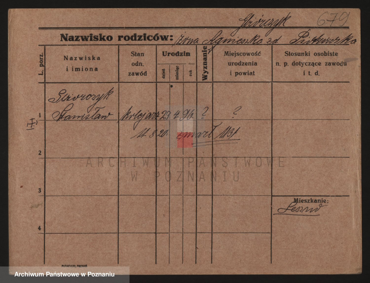 Podgląd karty osobowej dostępny jest po kliknięciu na nazwisko lub ikonkę karty. Można dokonywać powiększenia (ikony na górze) lub przechodzić między kolejnymi skanami (strzałki po bokach).