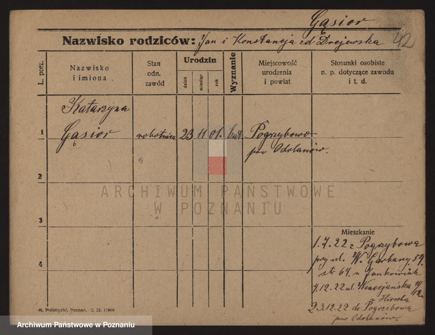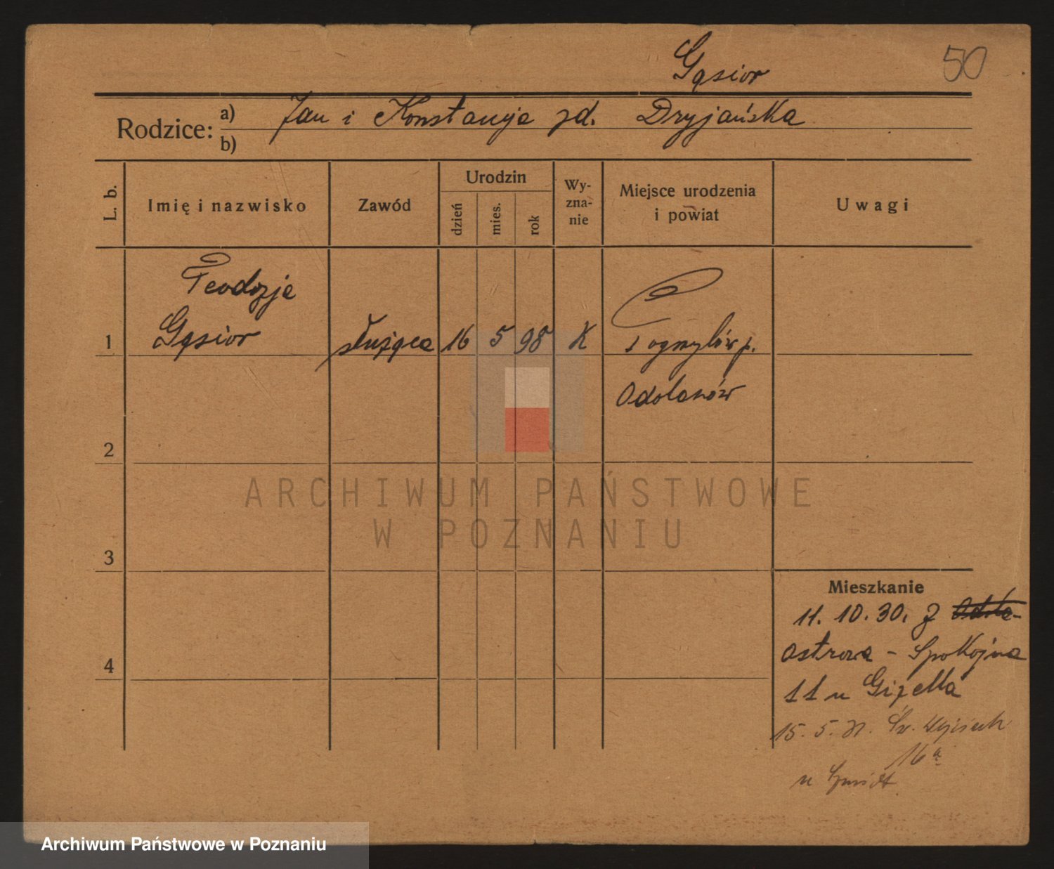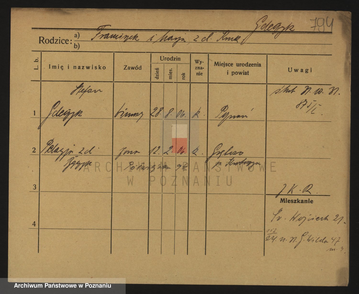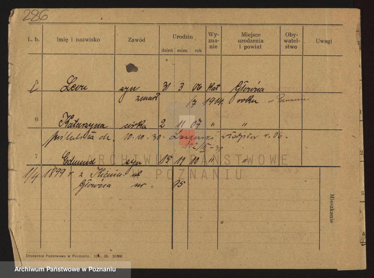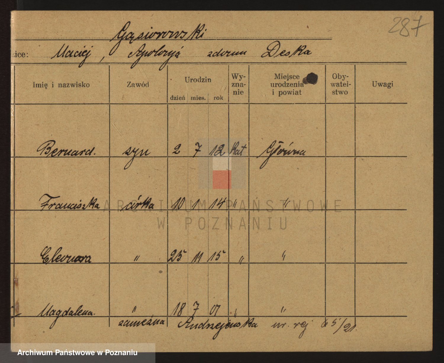Podgląd karty osobowej dostępny jest po kliknięciu na nazwisko lub ikonkę karty. Można dokonywać powiększenia (ikony na górze) lub przechodzić między kolejnymi skanami (strzałki po bokach).