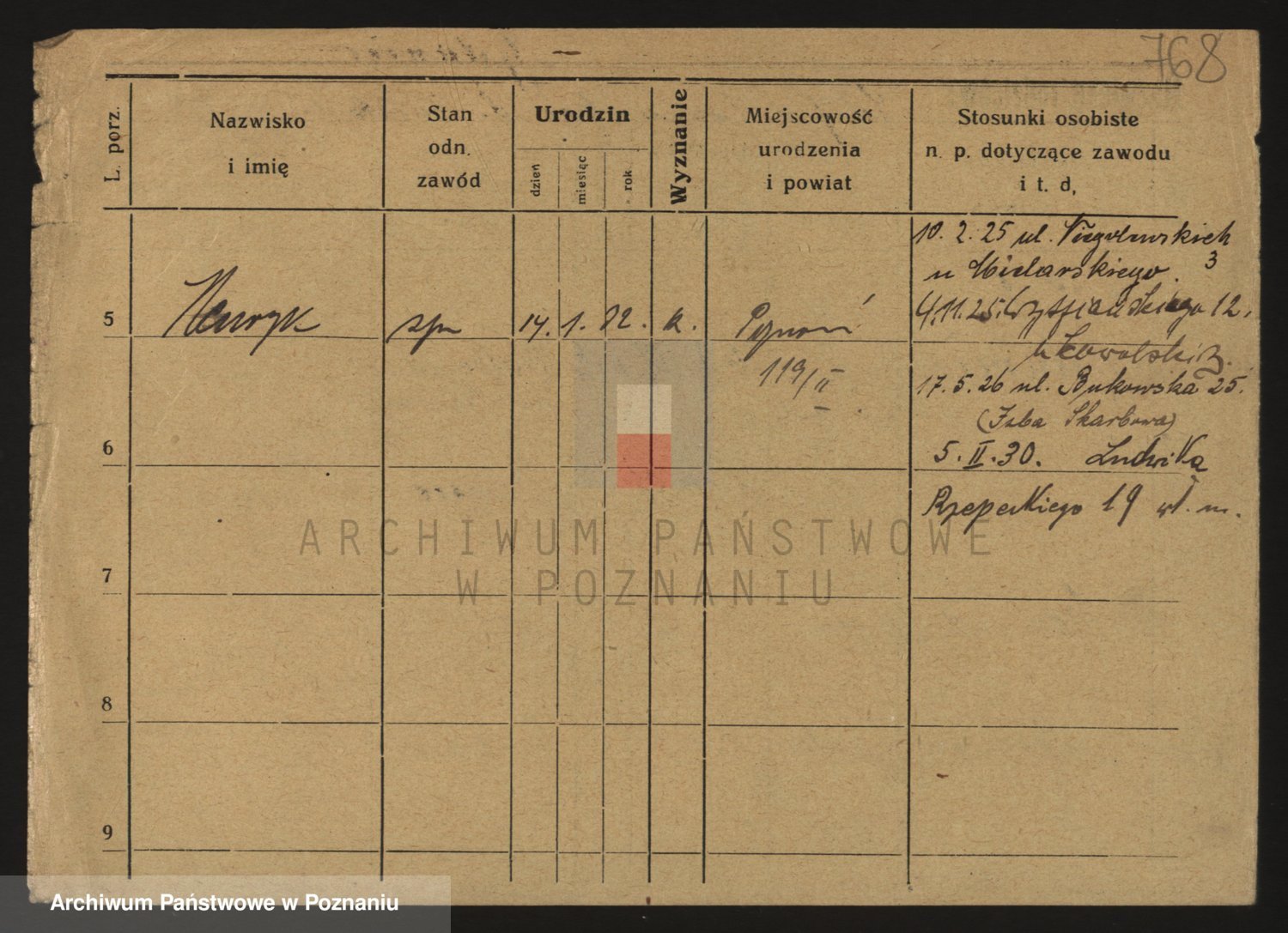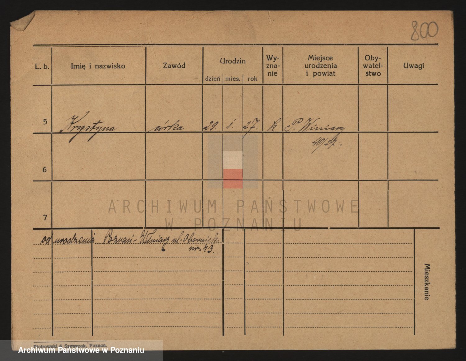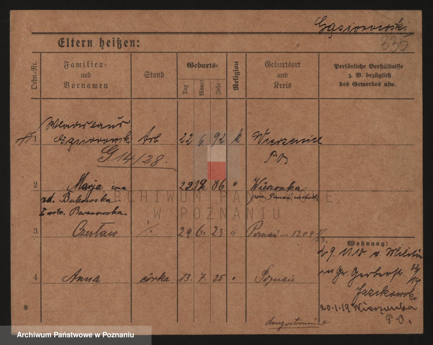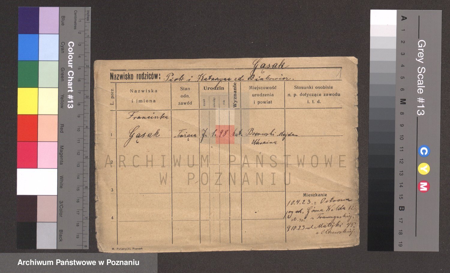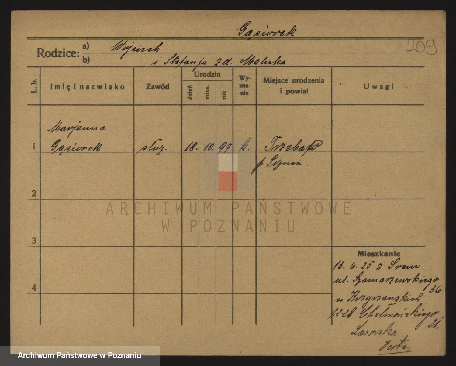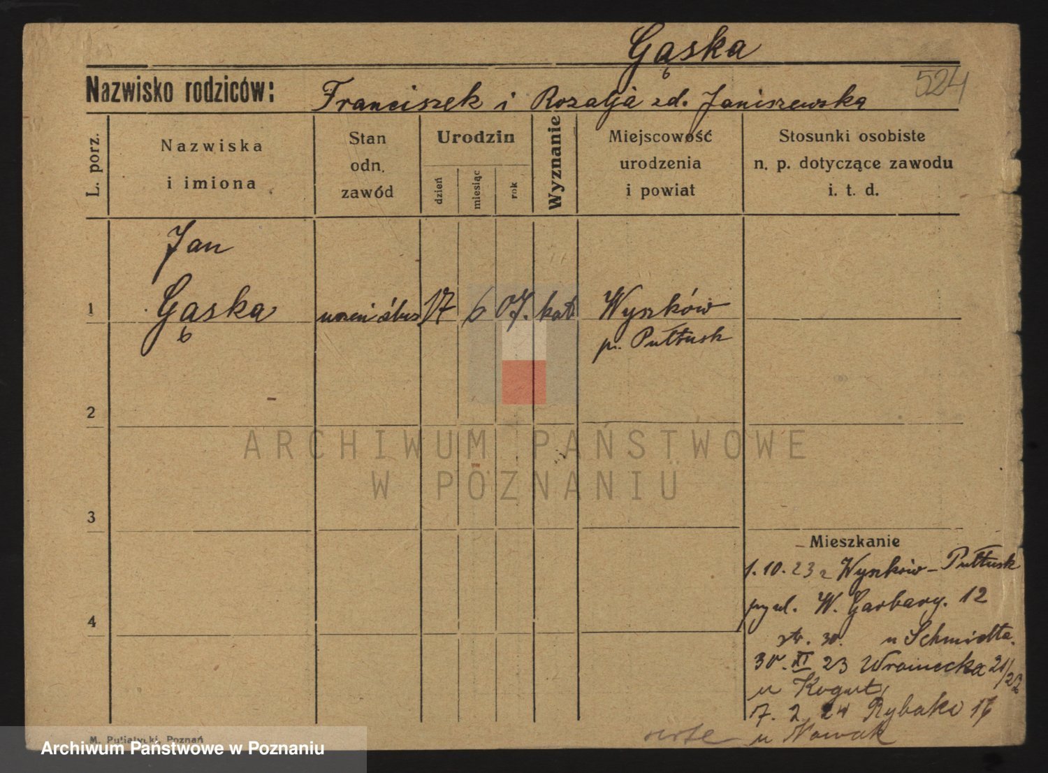 Podgląd karty osobowej dostępny jest po kliknięciu na nazwisko lub ikonkę karty. Można dokonywać powiększenia (ikony na górze) lub przechodzić między kolejnymi skanami (strzałki po bokach).