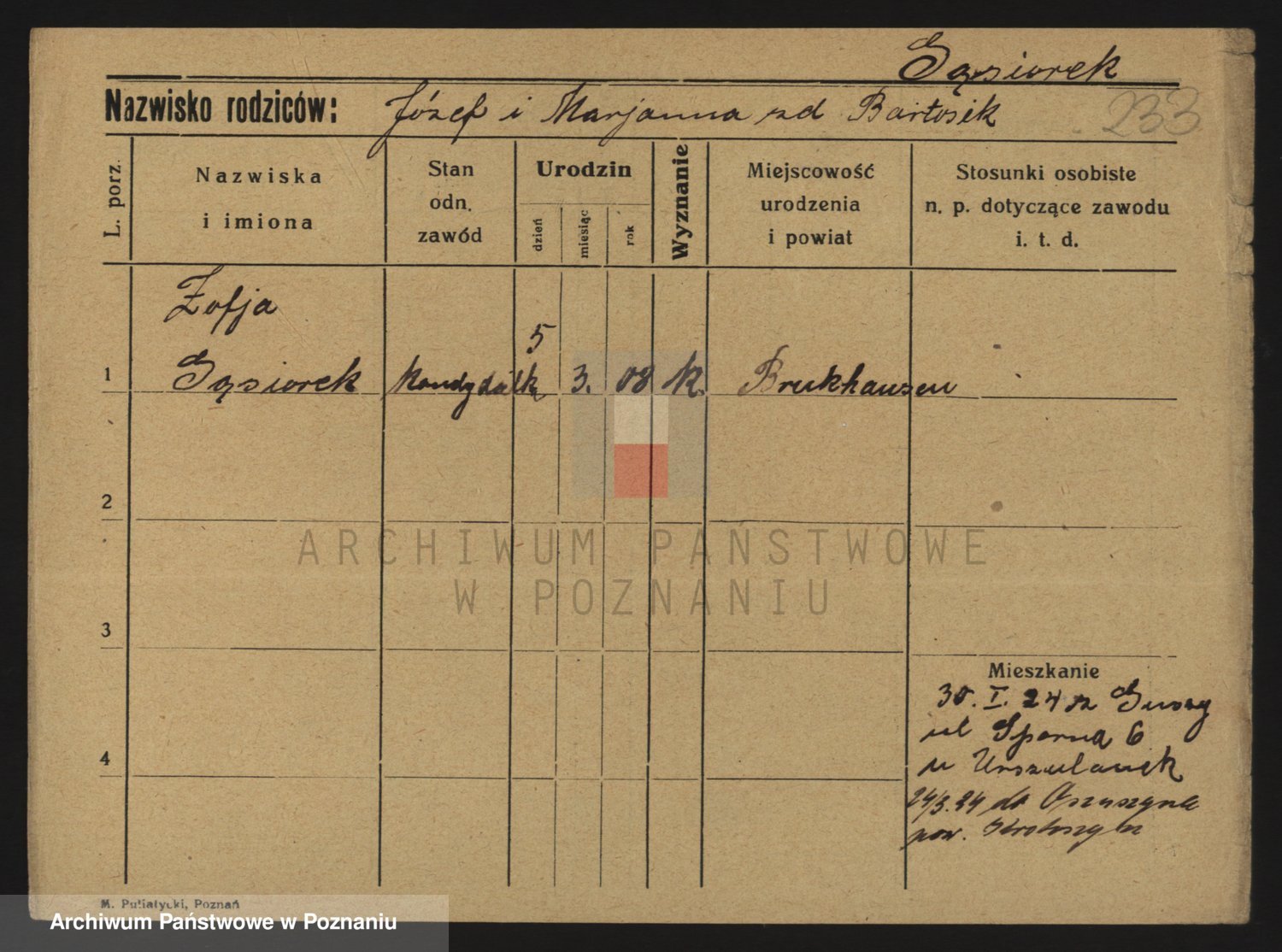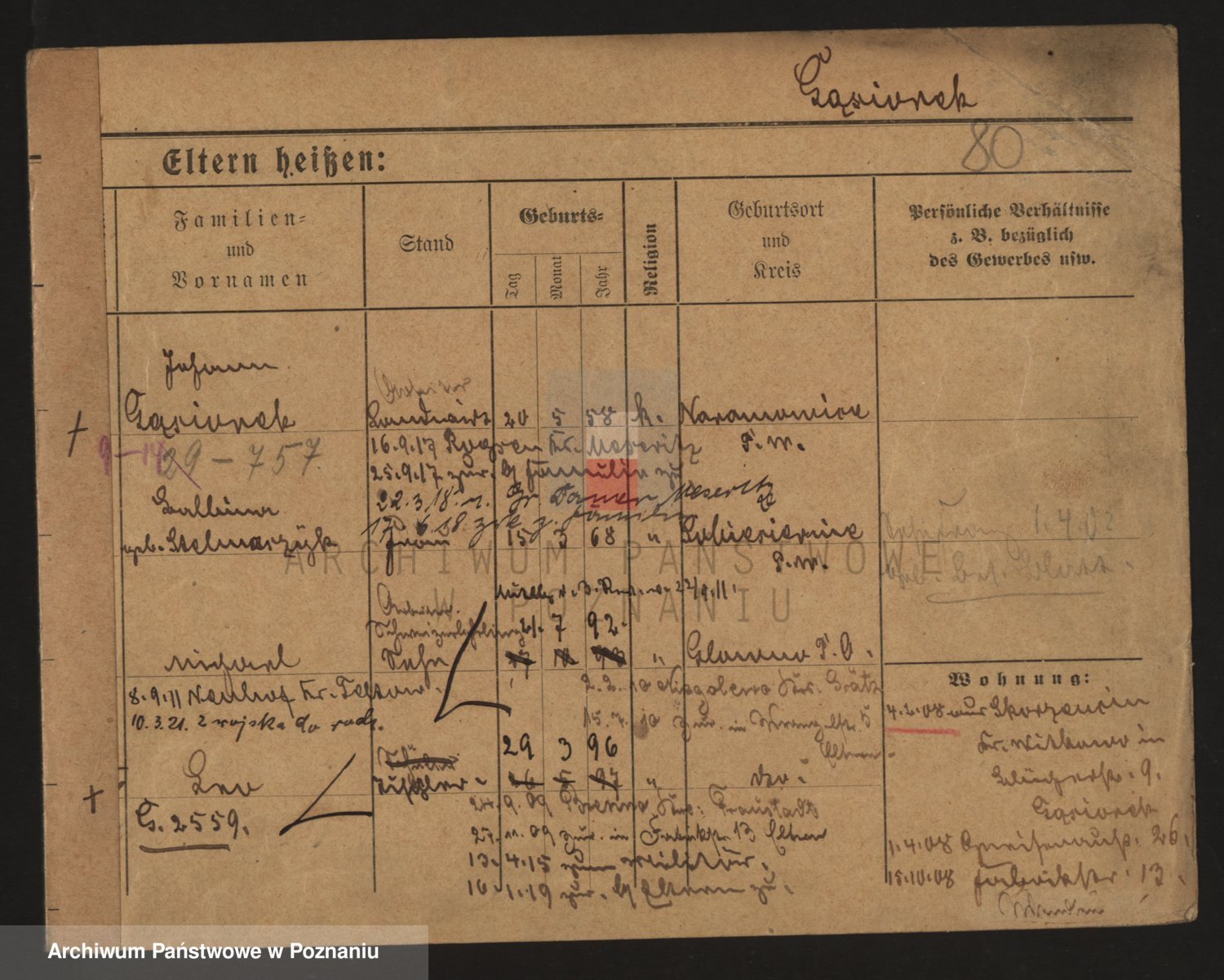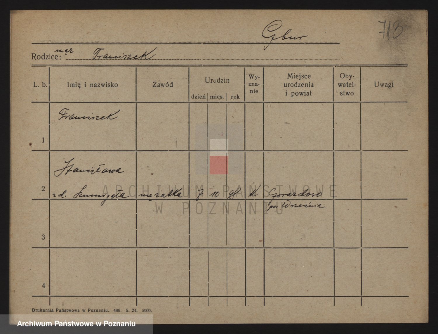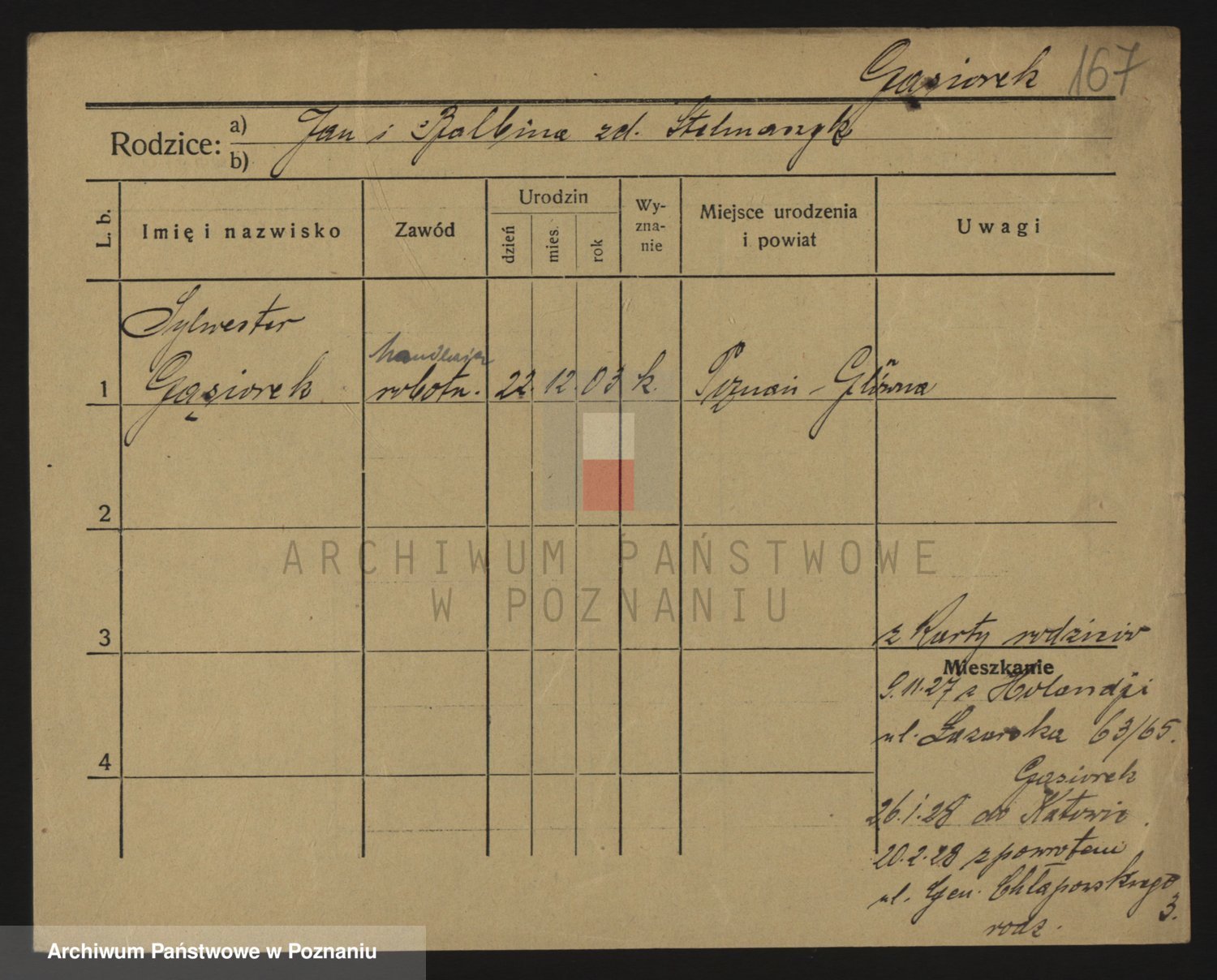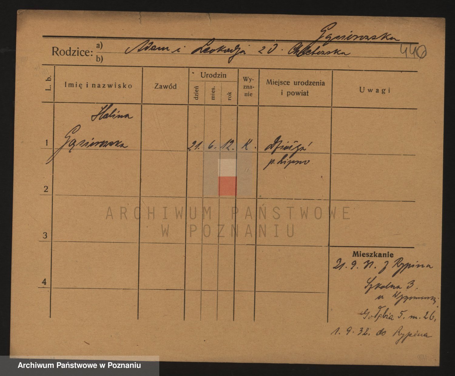 Podgląd karty osobowej dostępny jest po kliknięciu na nazwisko lub ikonkę karty. Można dokonywać powiększenia (ikony na górze) lub przechodzić między kolejnymi skanami (strzałki po bokach).