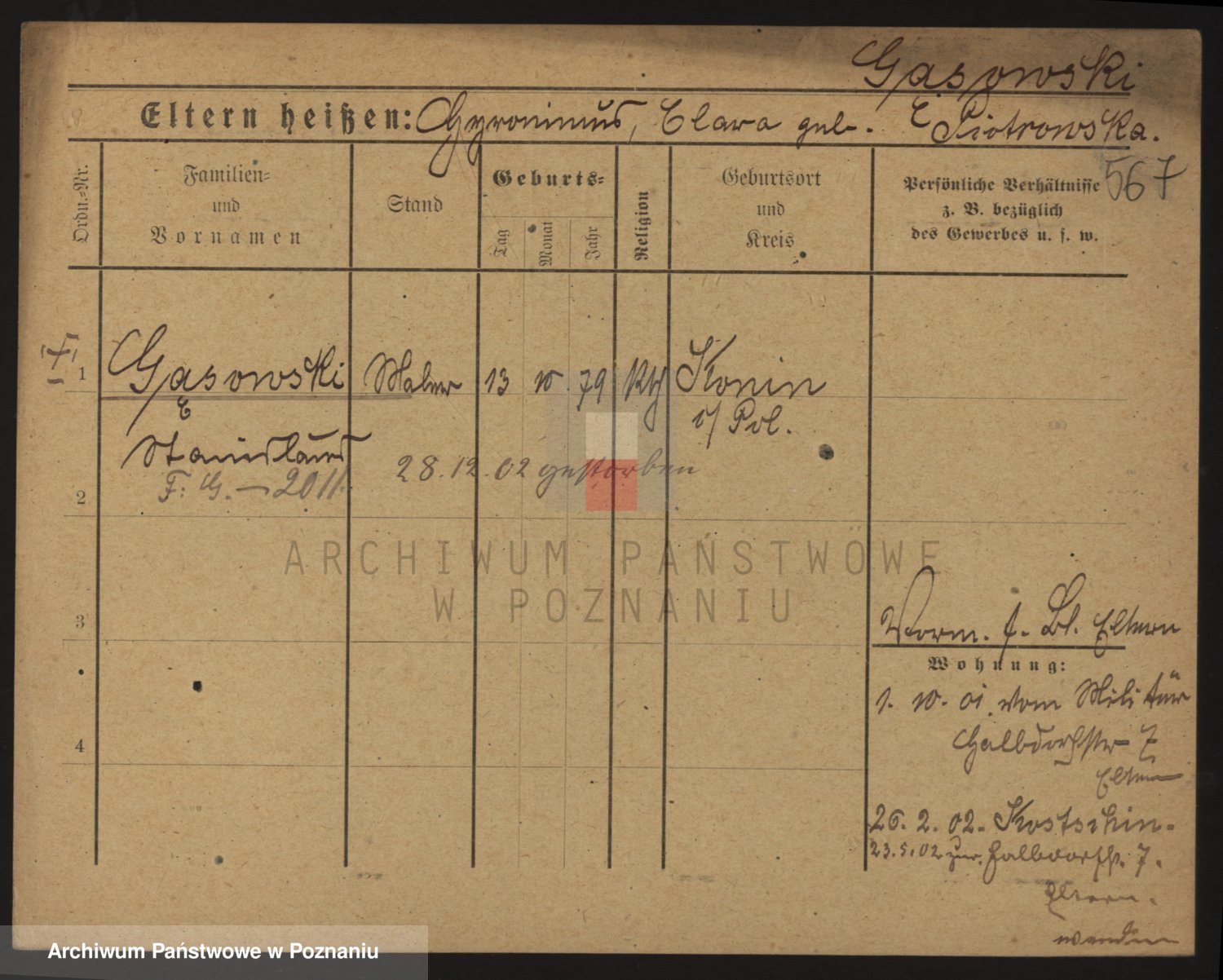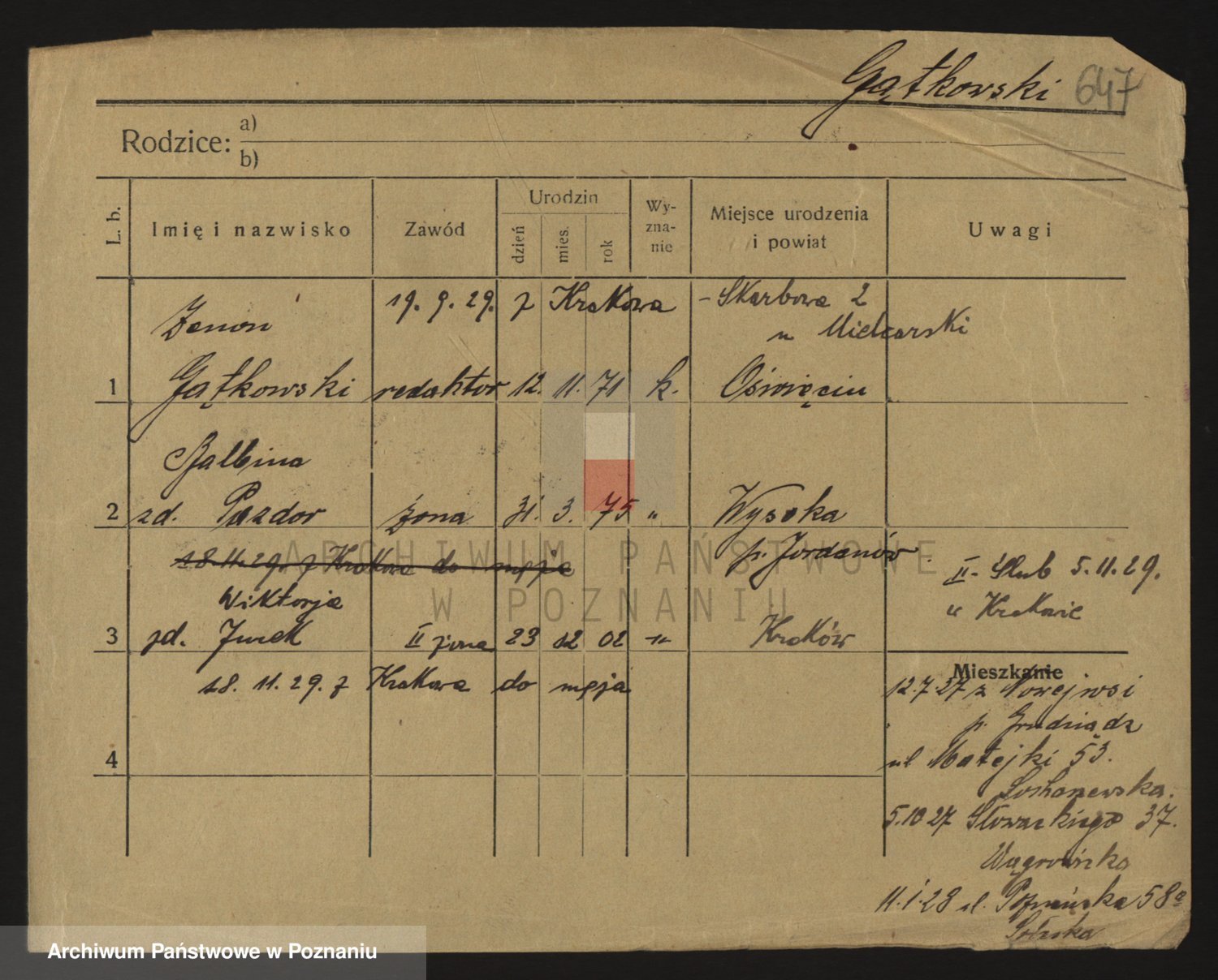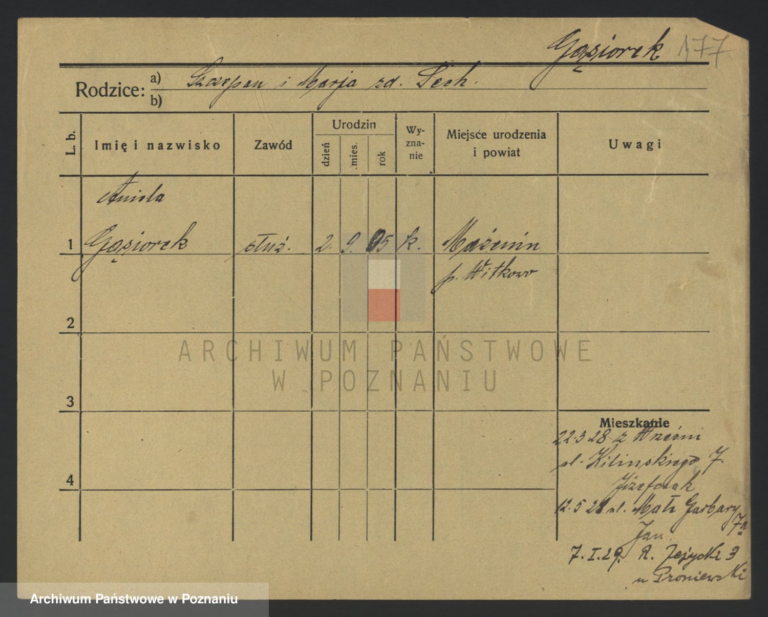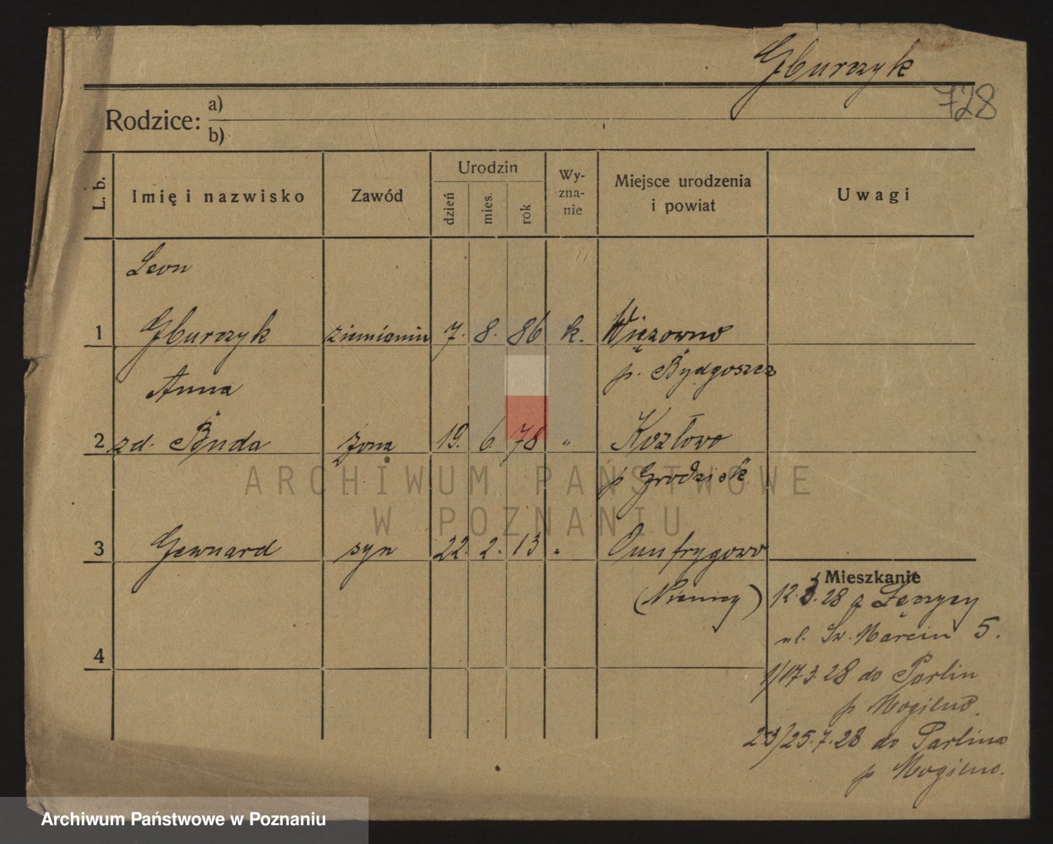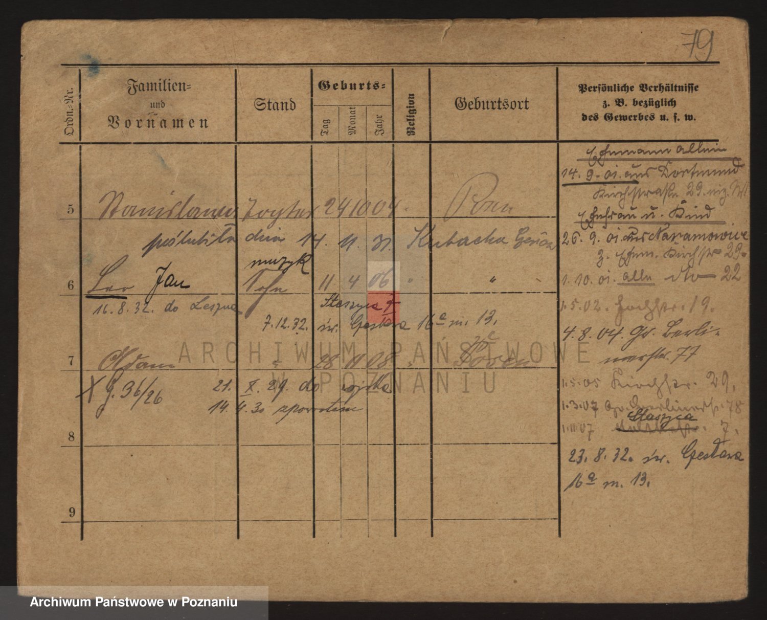 Podgląd karty osobowej dostępny jest po kliknięciu na nazwisko lub ikonkę karty. Można dokonywać powiększenia (ikony na górze) lub przechodzić między kolejnymi skanami (strzałki po bokach).