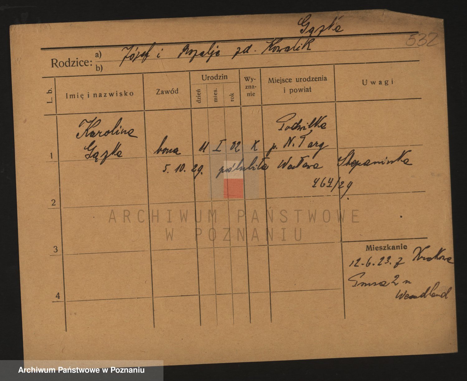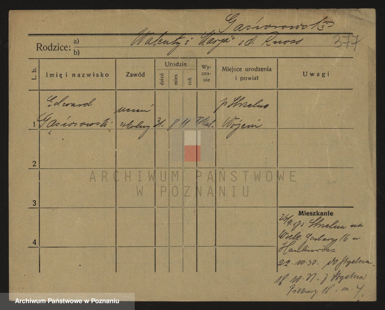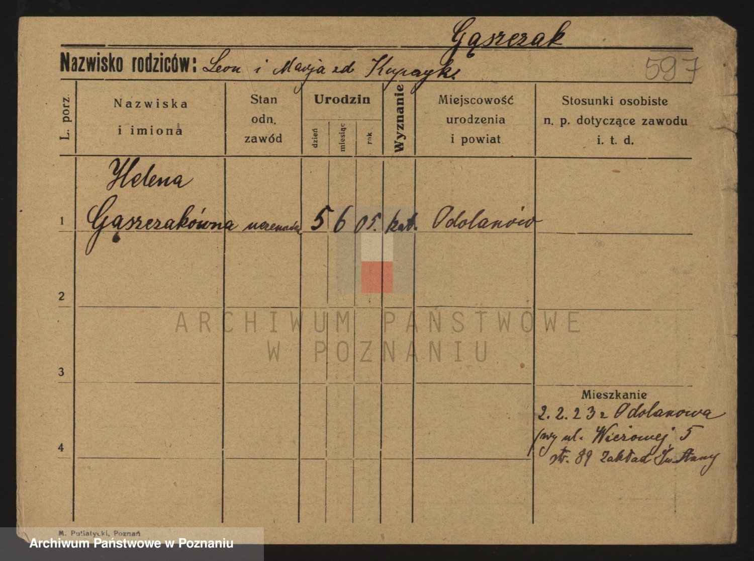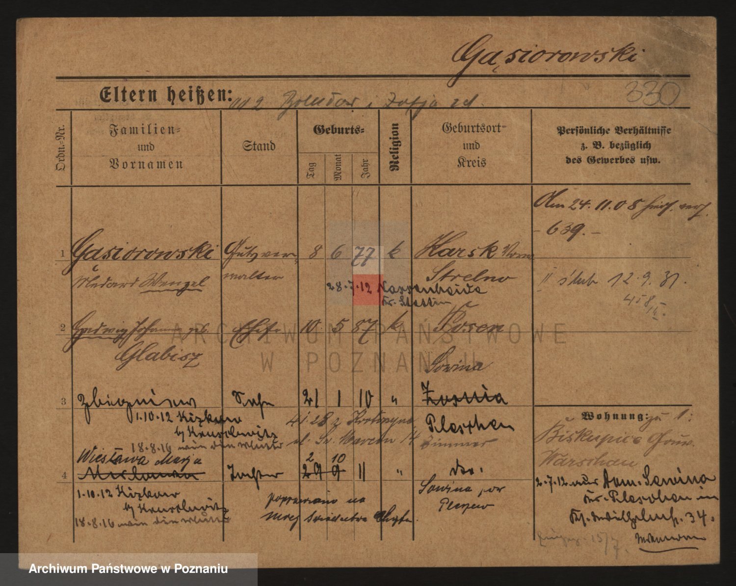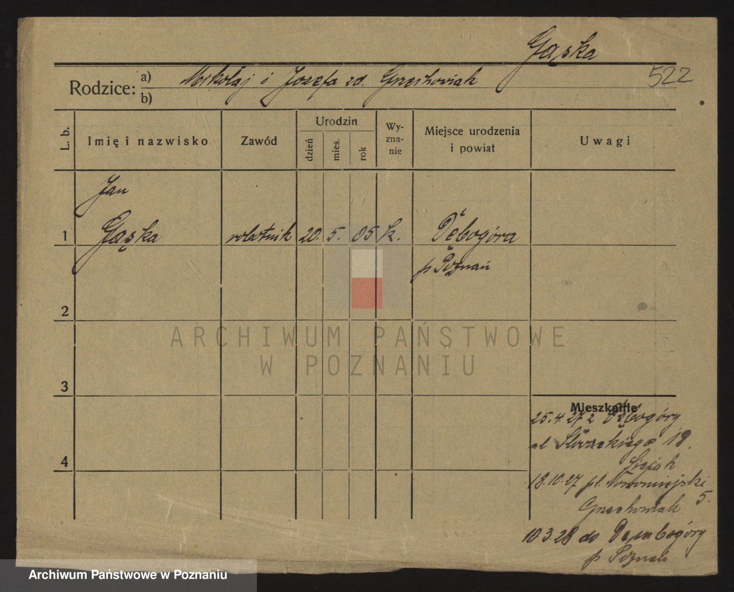 Podgląd karty osobowej dostępny jest po kliknięciu na nazwisko lub ikonkę karty. Można dokonywać powiększenia (ikony na górze) lub przechodzić między kolejnymi skanami (strzałki po bokach).