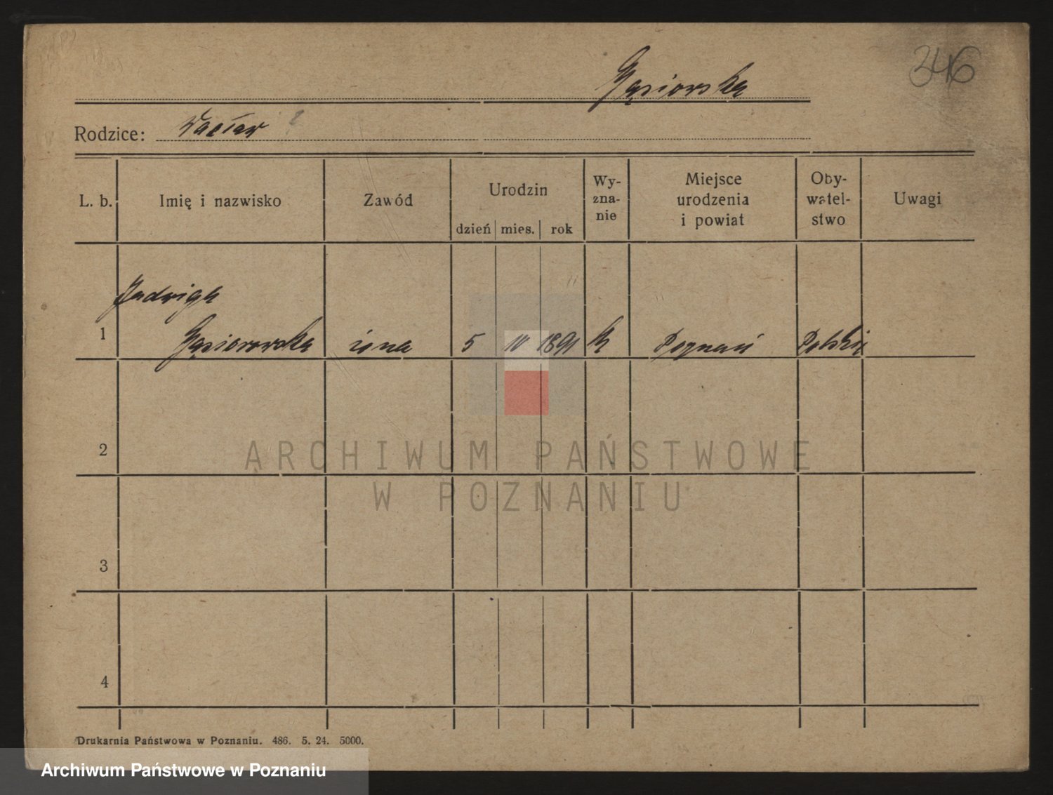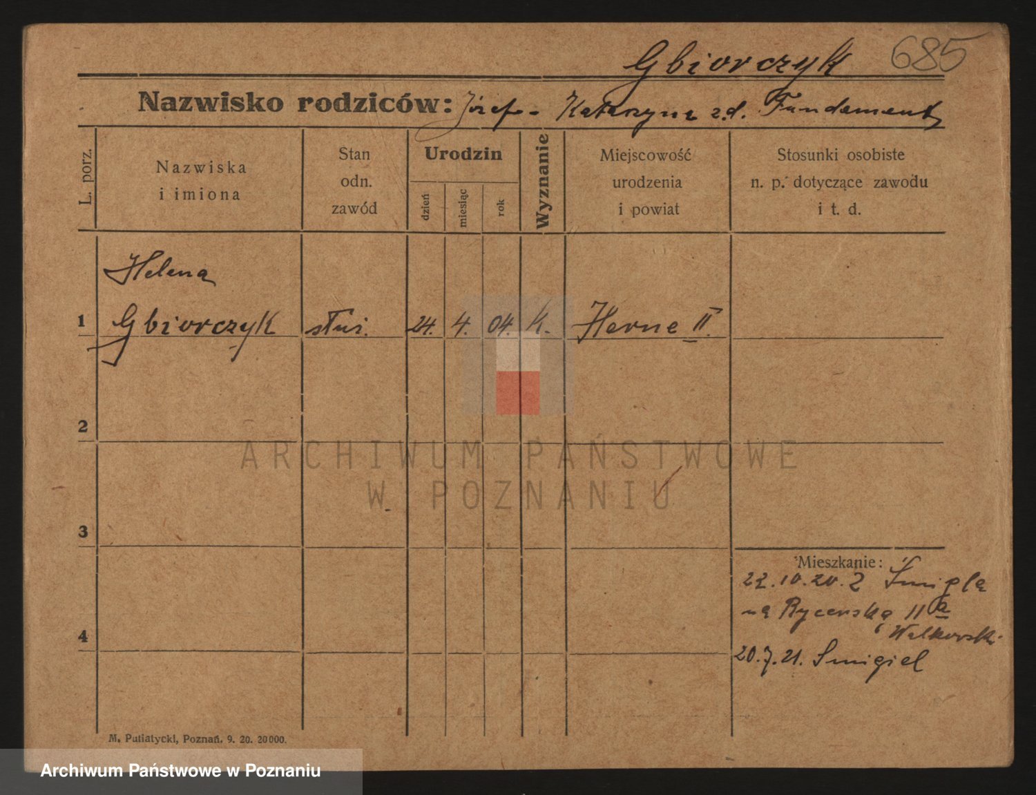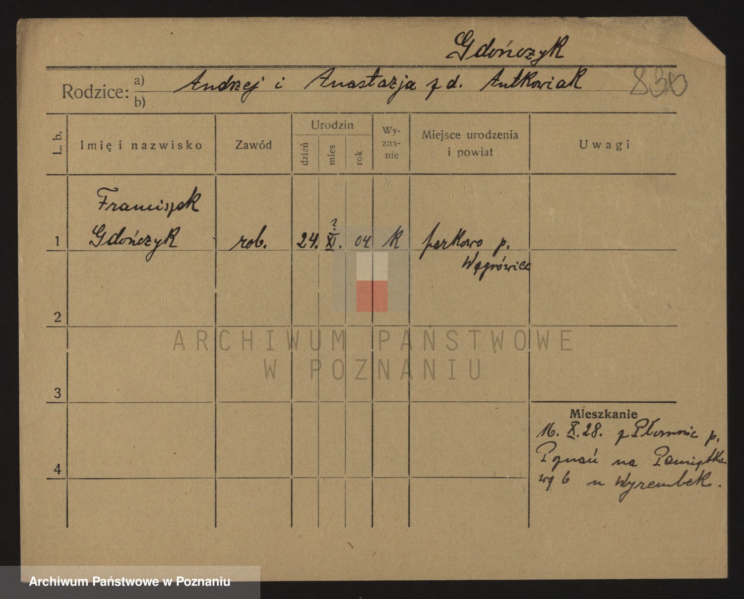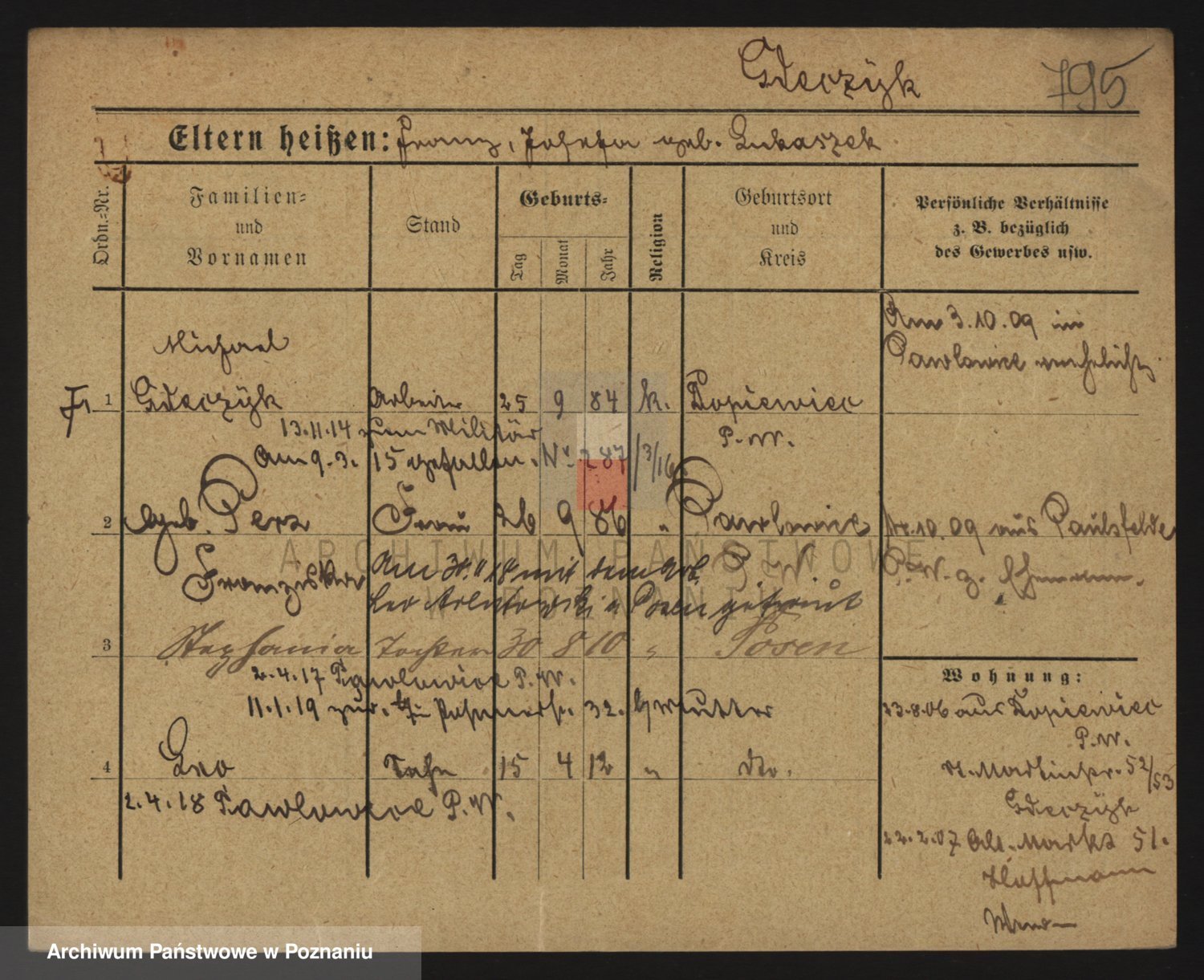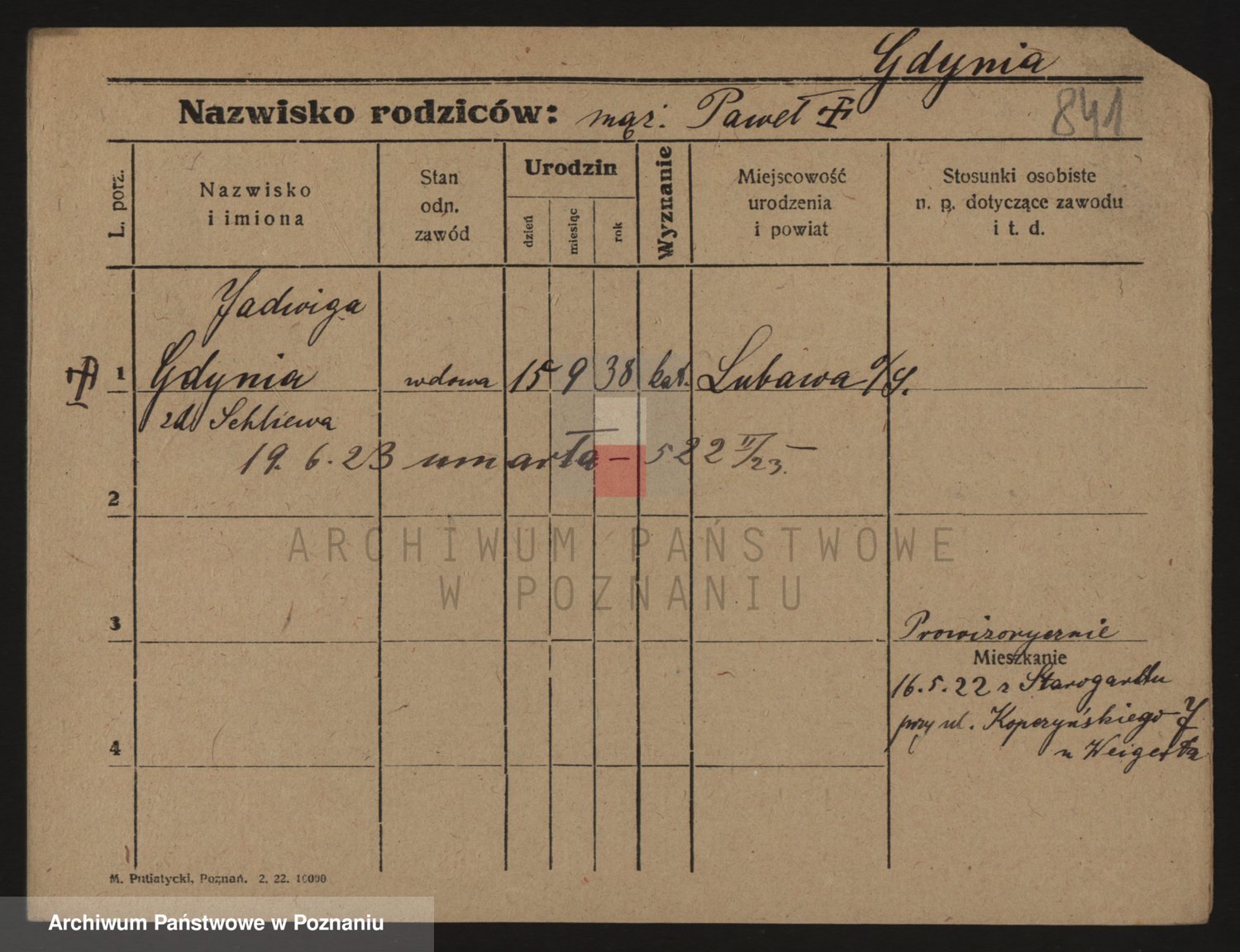 Podgląd karty osobowej dostępny jest po kliknięciu na nazwisko lub ikonkę karty. Można dokonywać powiększenia (ikony na górze) lub przechodzić między kolejnymi skanami (strzałki po bokach).