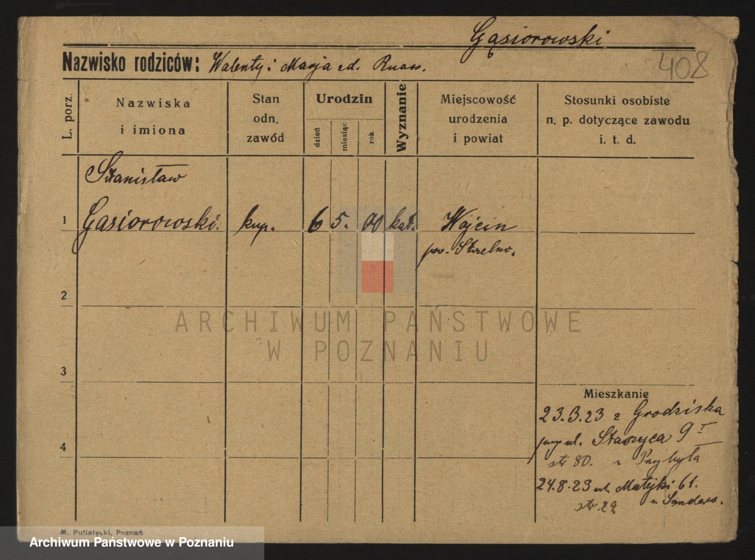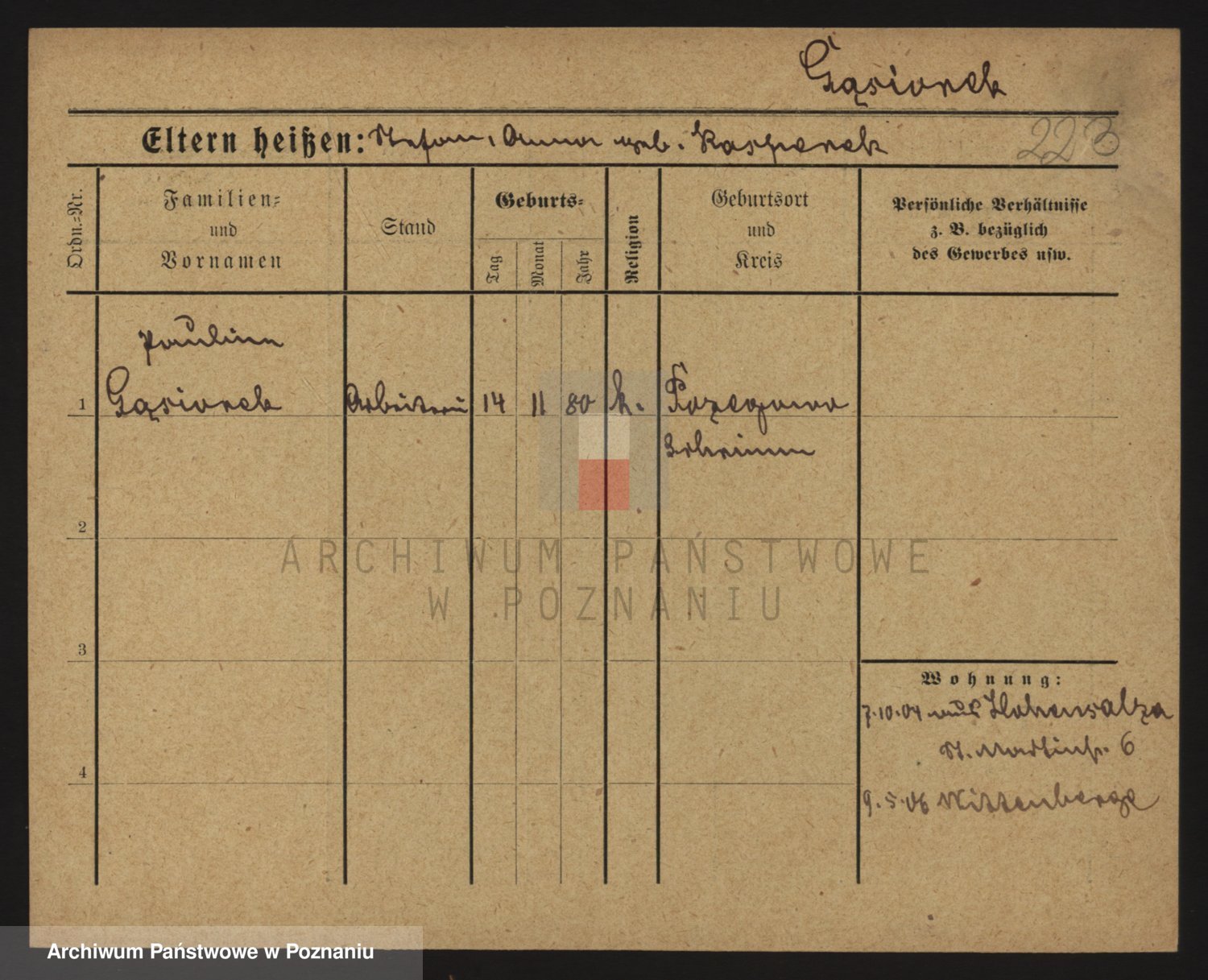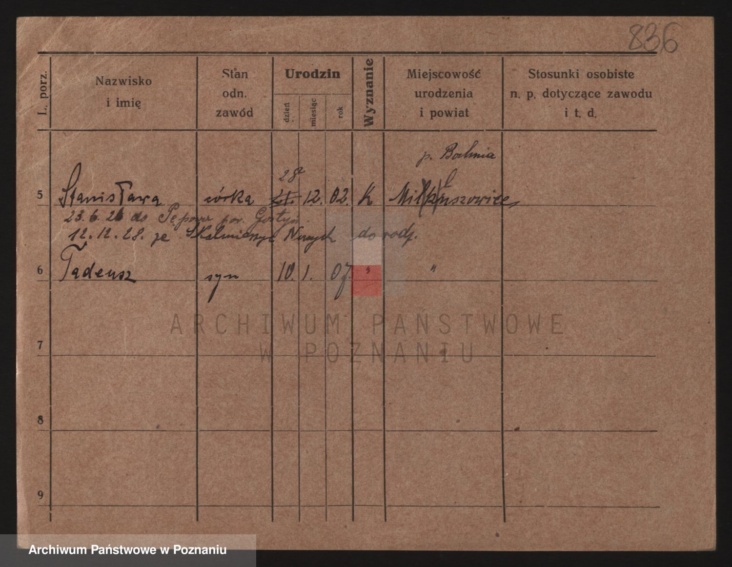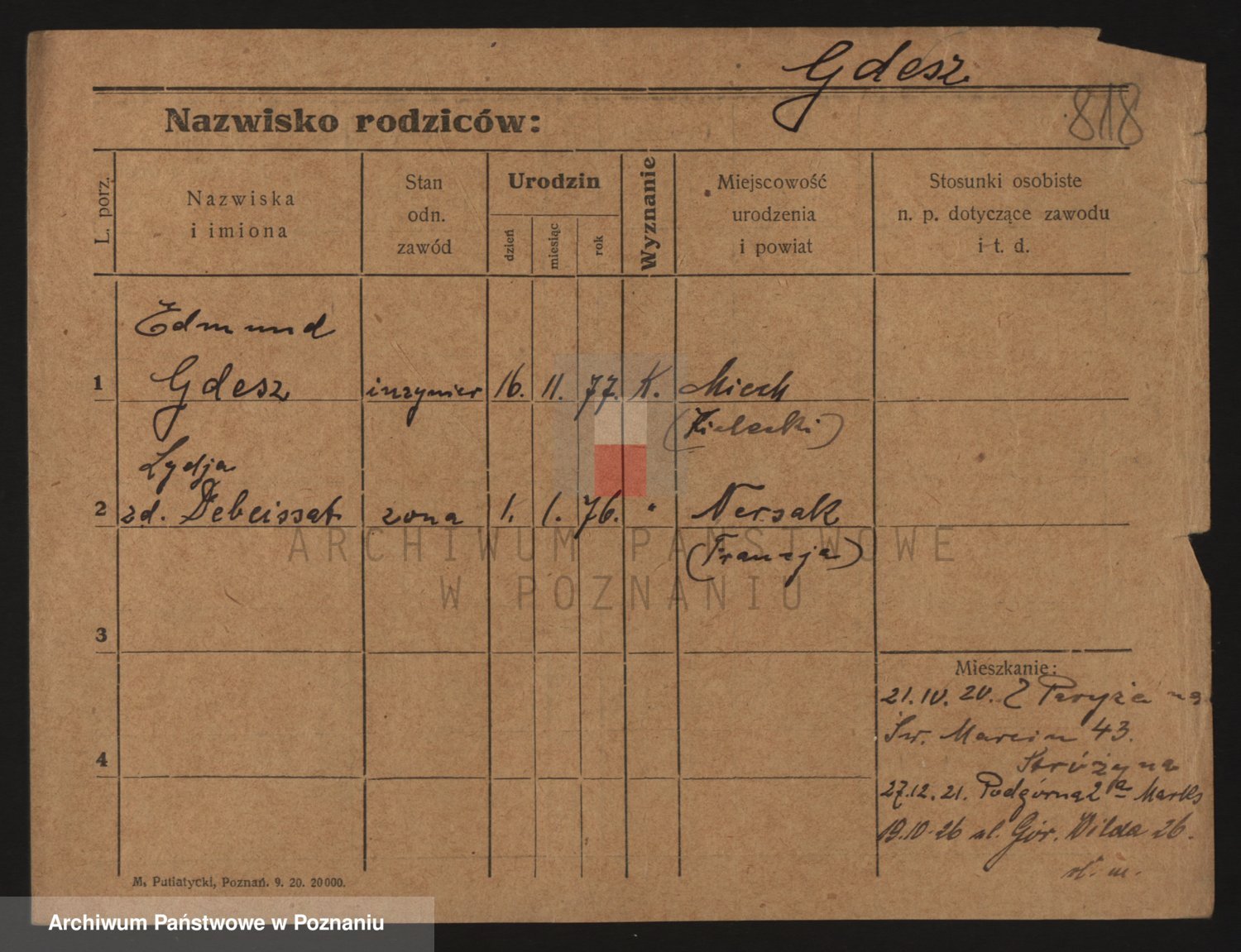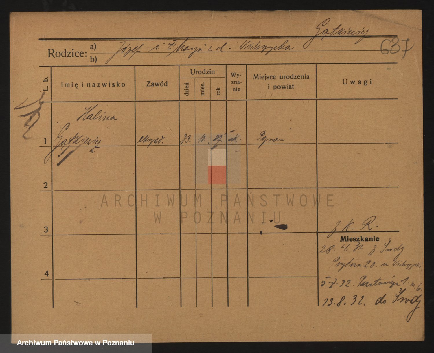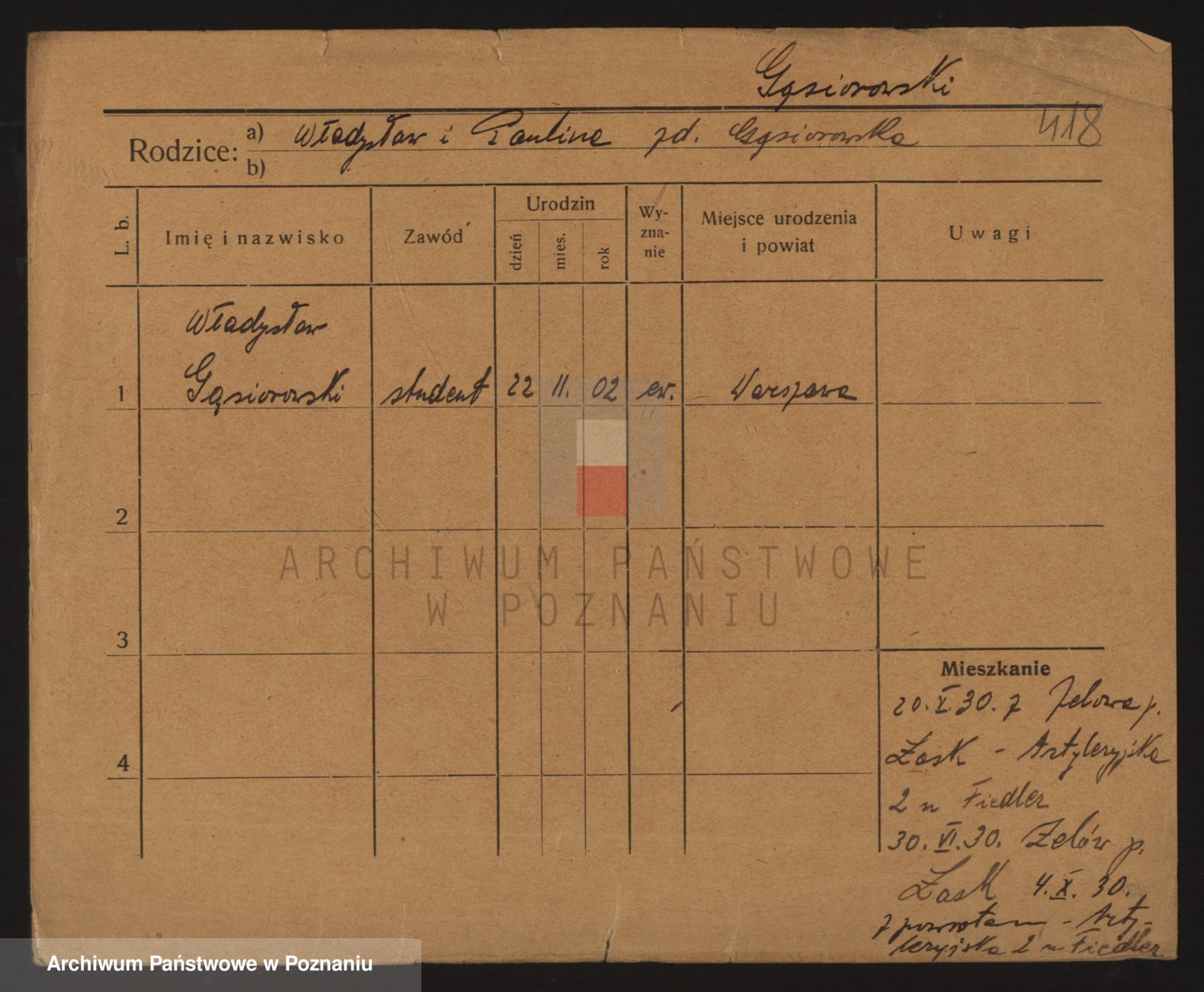 Podgląd karty osobowej dostępny jest po kliknięciu na nazwisko lub ikonkę karty. Można dokonywać powiększenia (ikony na górze) lub przechodzić między kolejnymi skanami (strzałki po bokach).