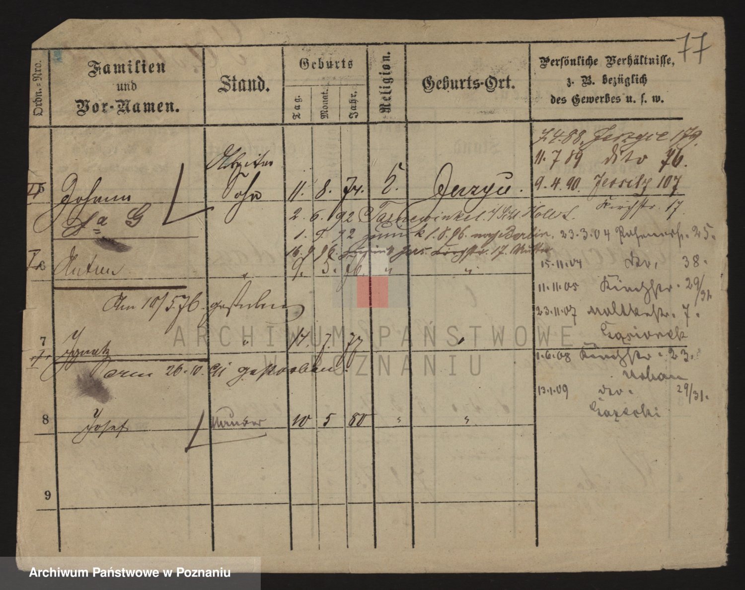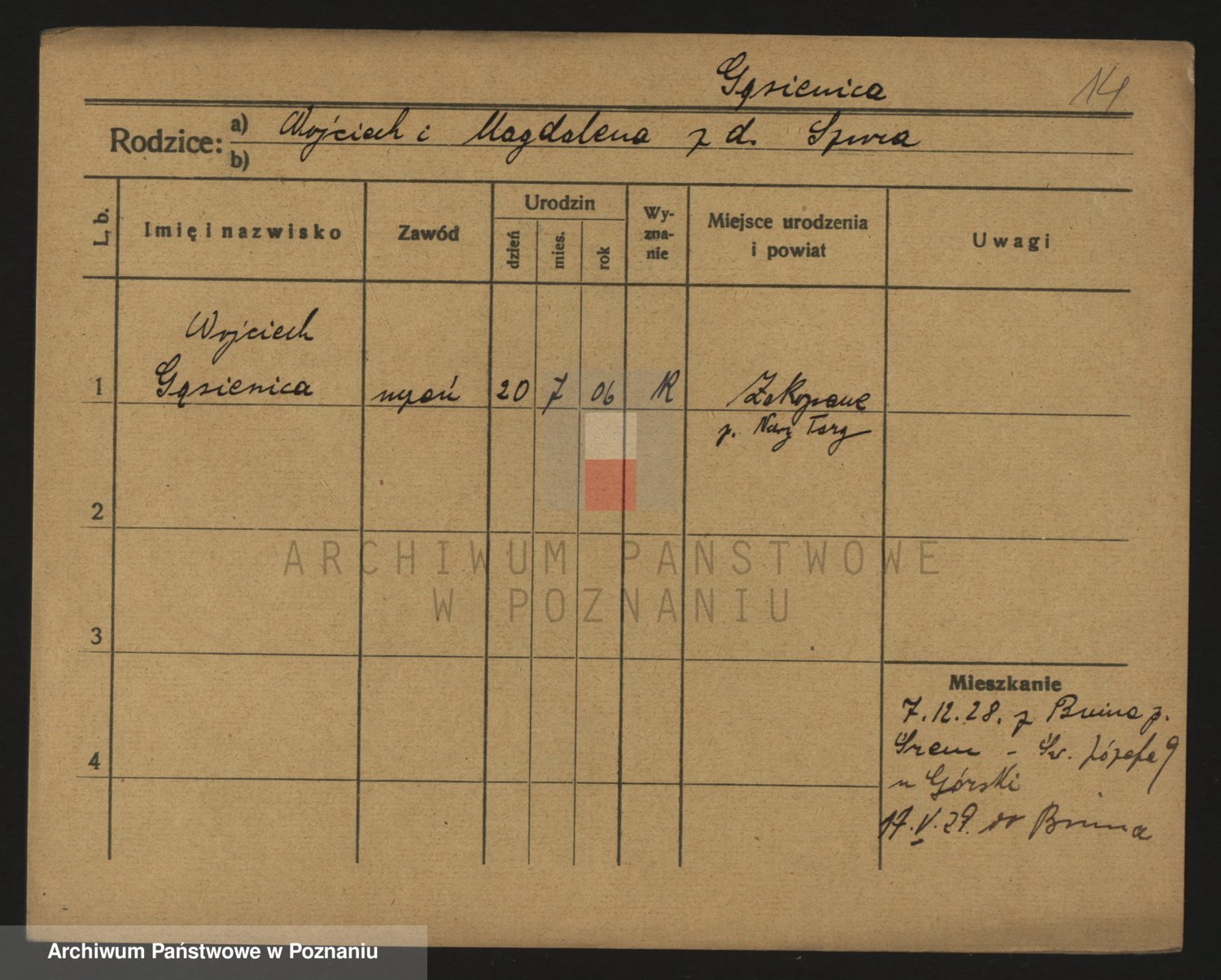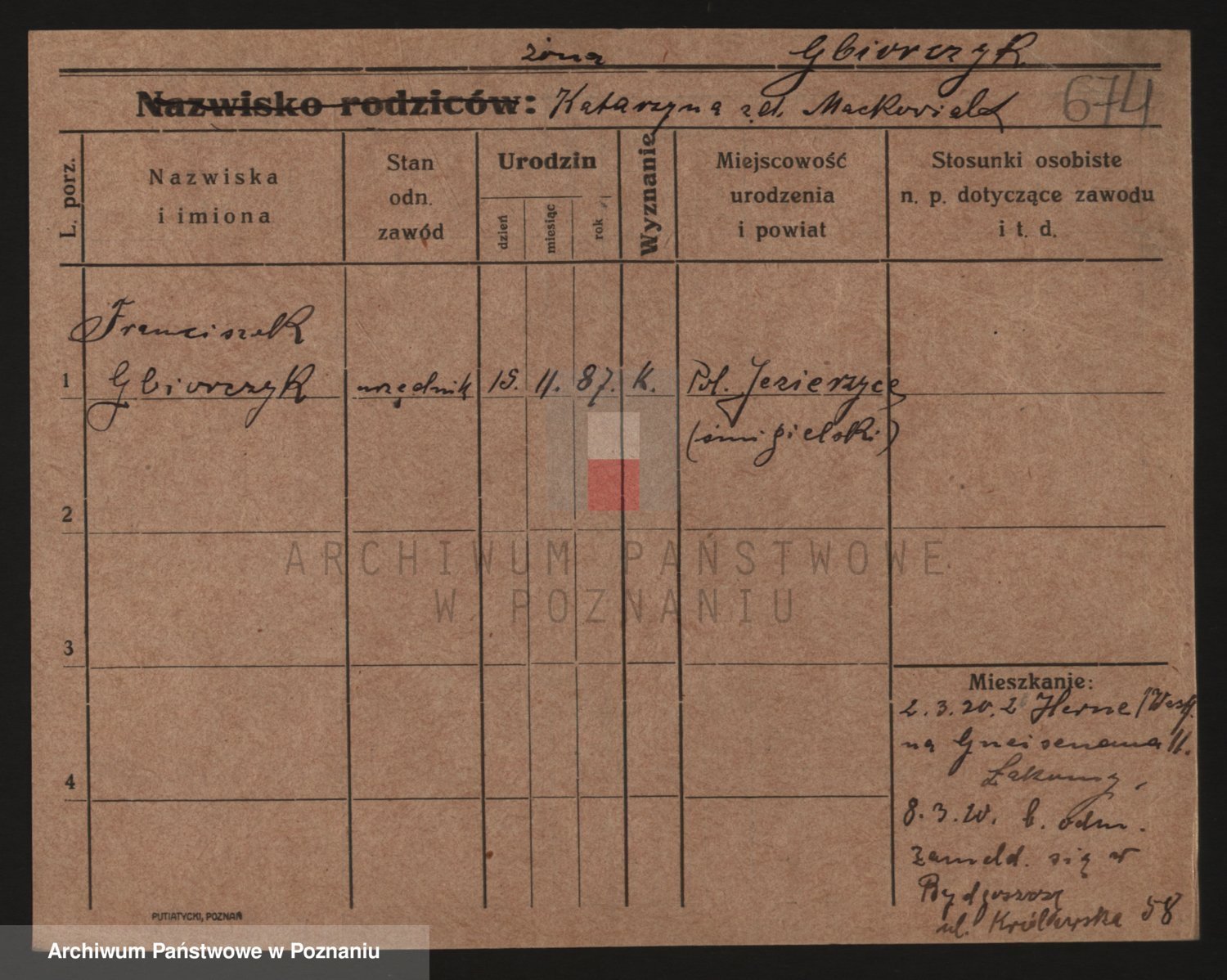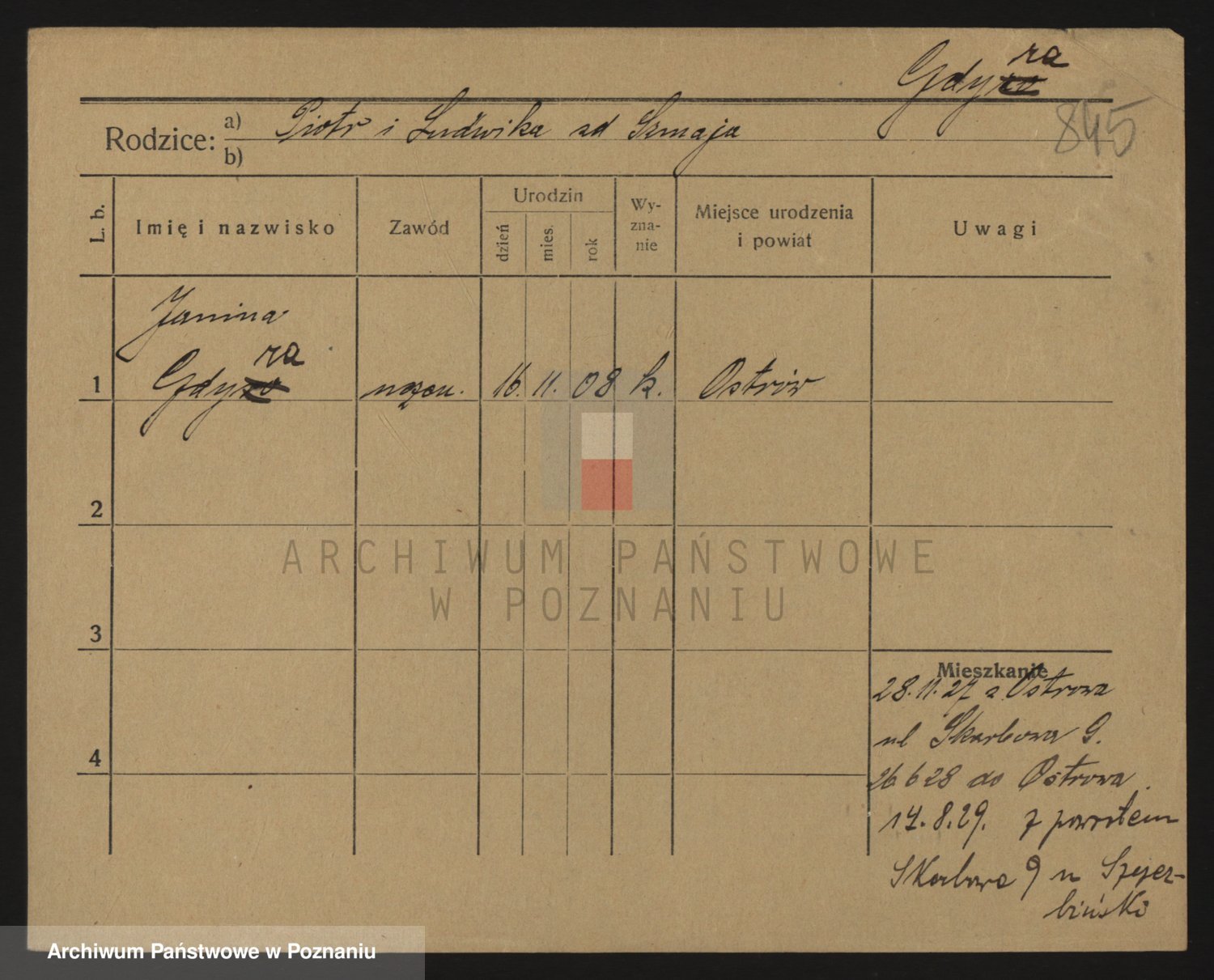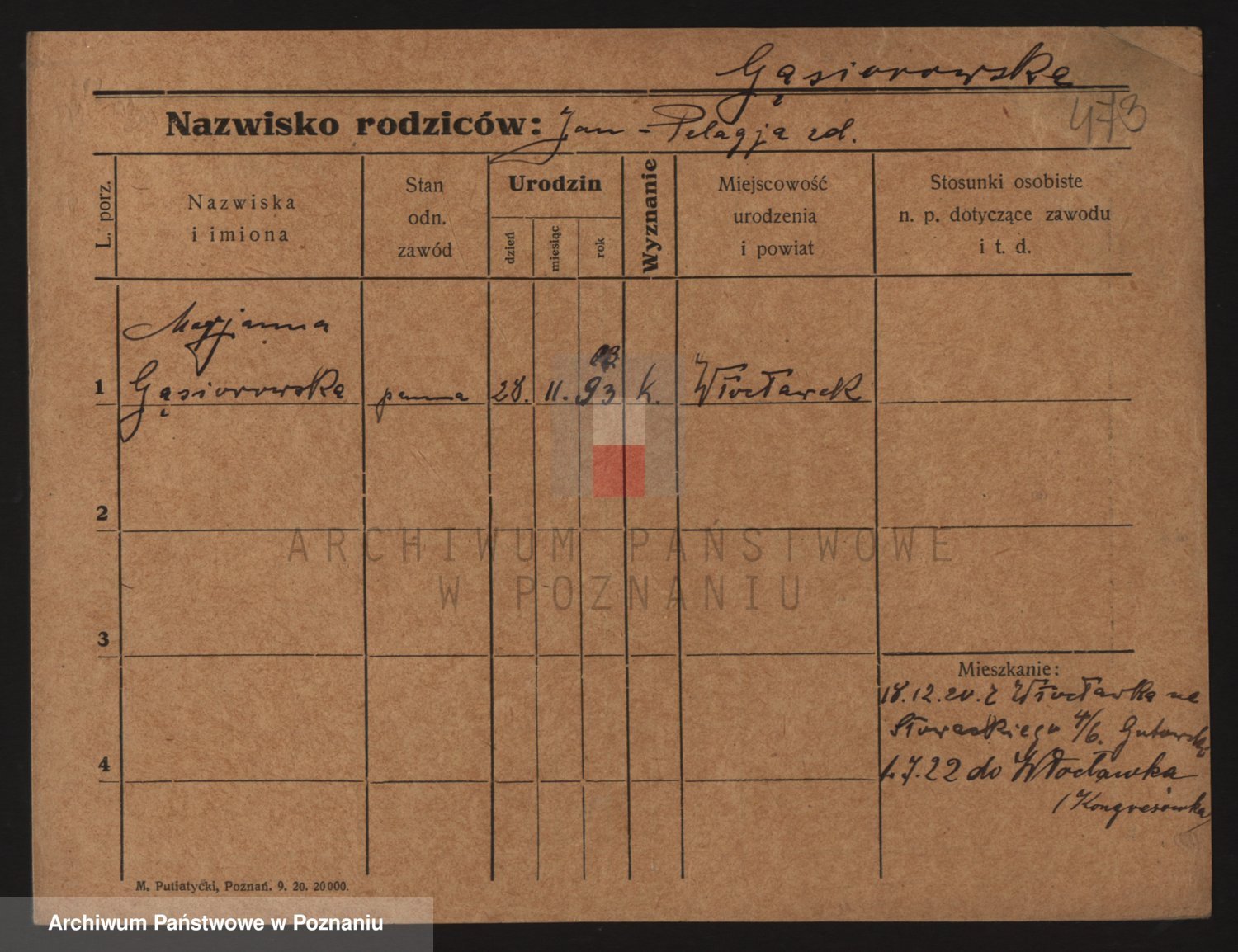 Podgląd karty osobowej dostępny jest po kliknięciu na nazwisko lub ikonkę karty. Można dokonywać powiększenia (ikony na górze) lub przechodzić między kolejnymi skanami (strzałki po bokach).