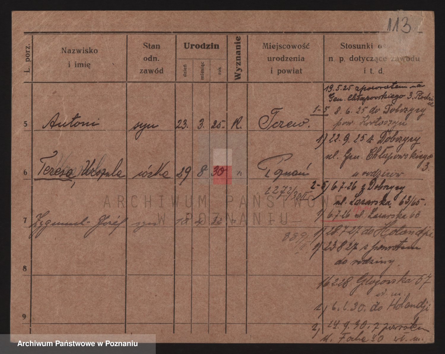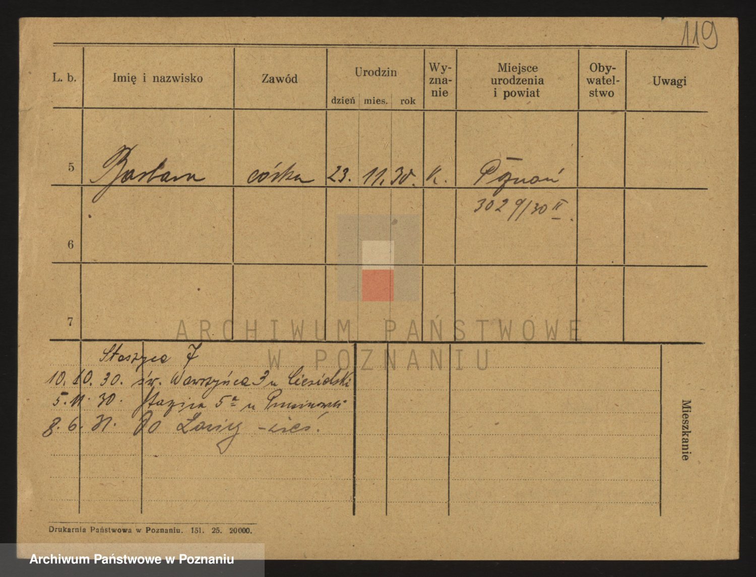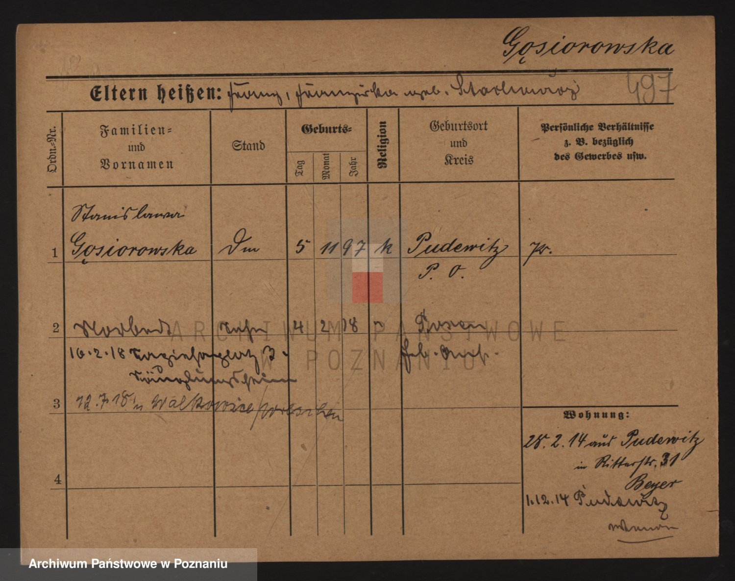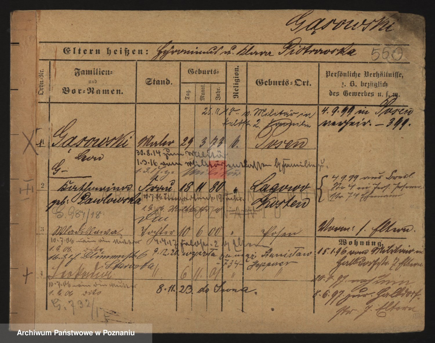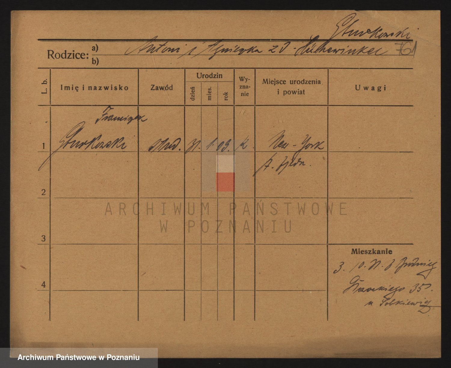 Podgląd karty osobowej dostępny jest po kliknięciu na nazwisko lub ikonkę karty. Można dokonywać powiększenia (ikony na górze) lub przechodzić między kolejnymi skanami (strzałki po bokach).