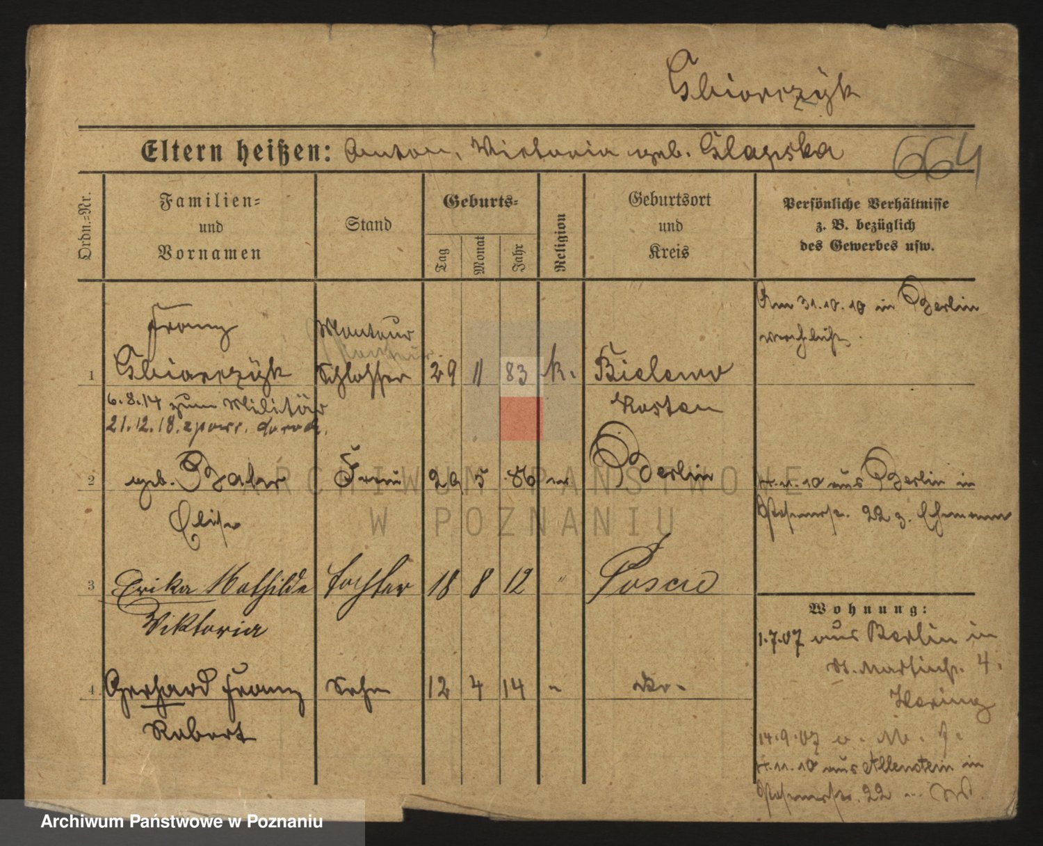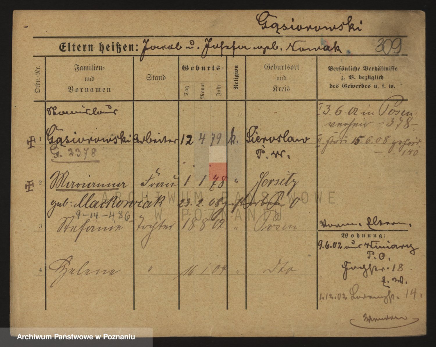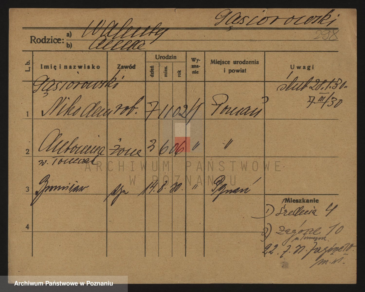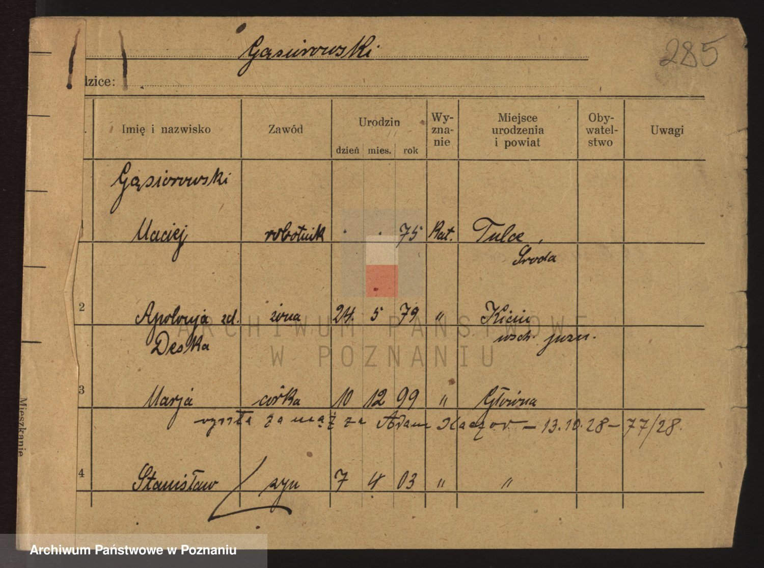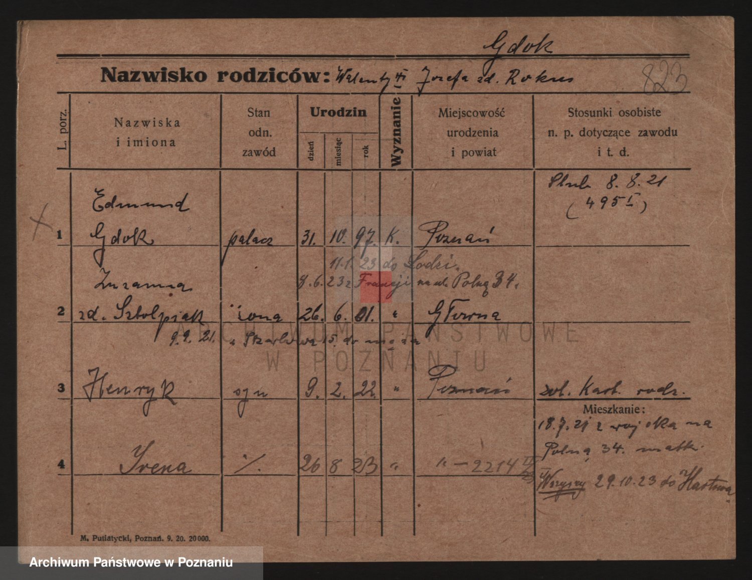 Podgląd karty osobowej dostępny jest po kliknięciu na nazwisko lub ikonkę karty. Można dokonywać powiększenia (ikony na górze) lub przechodzić między kolejnymi skanami (strzałki po bokach).