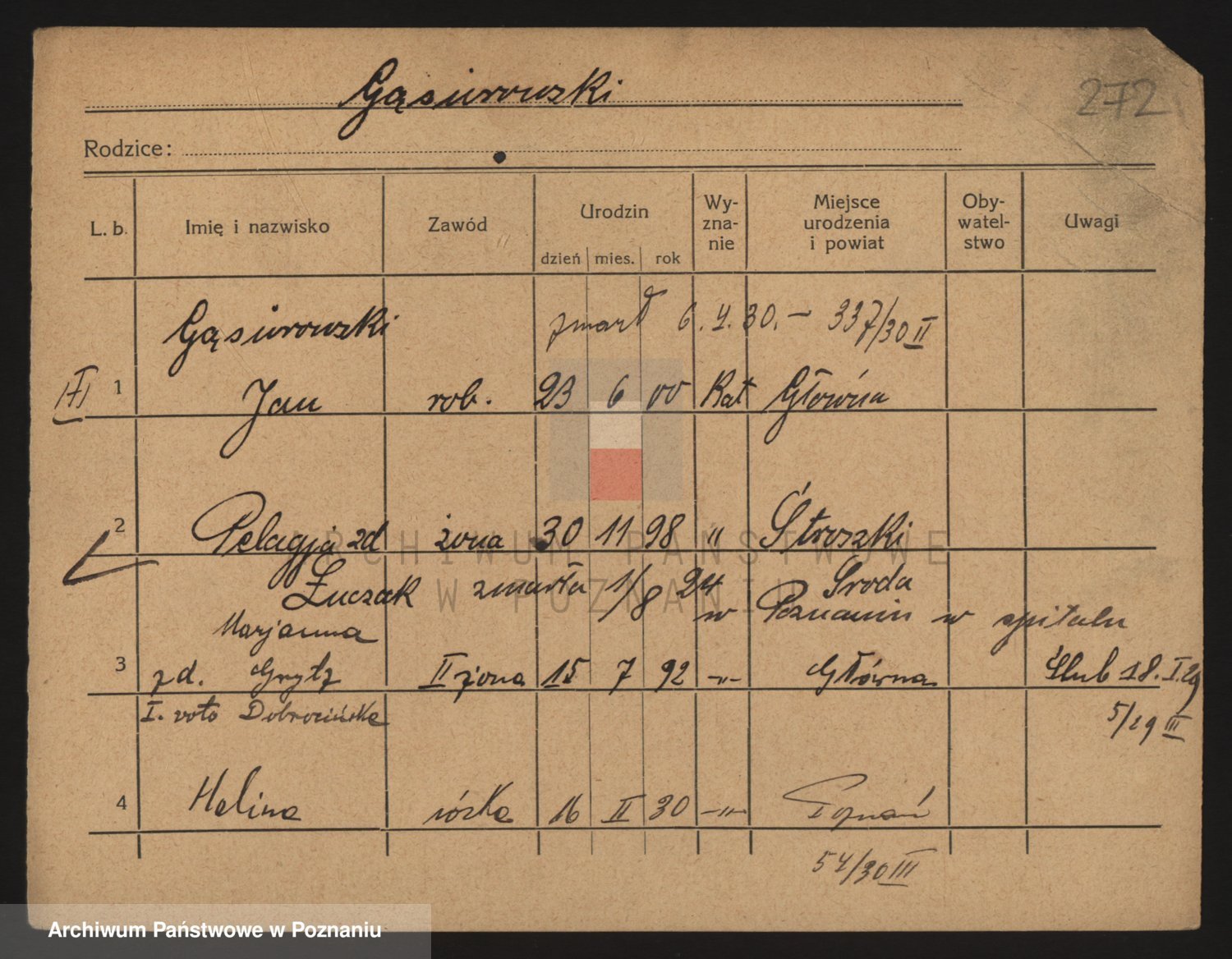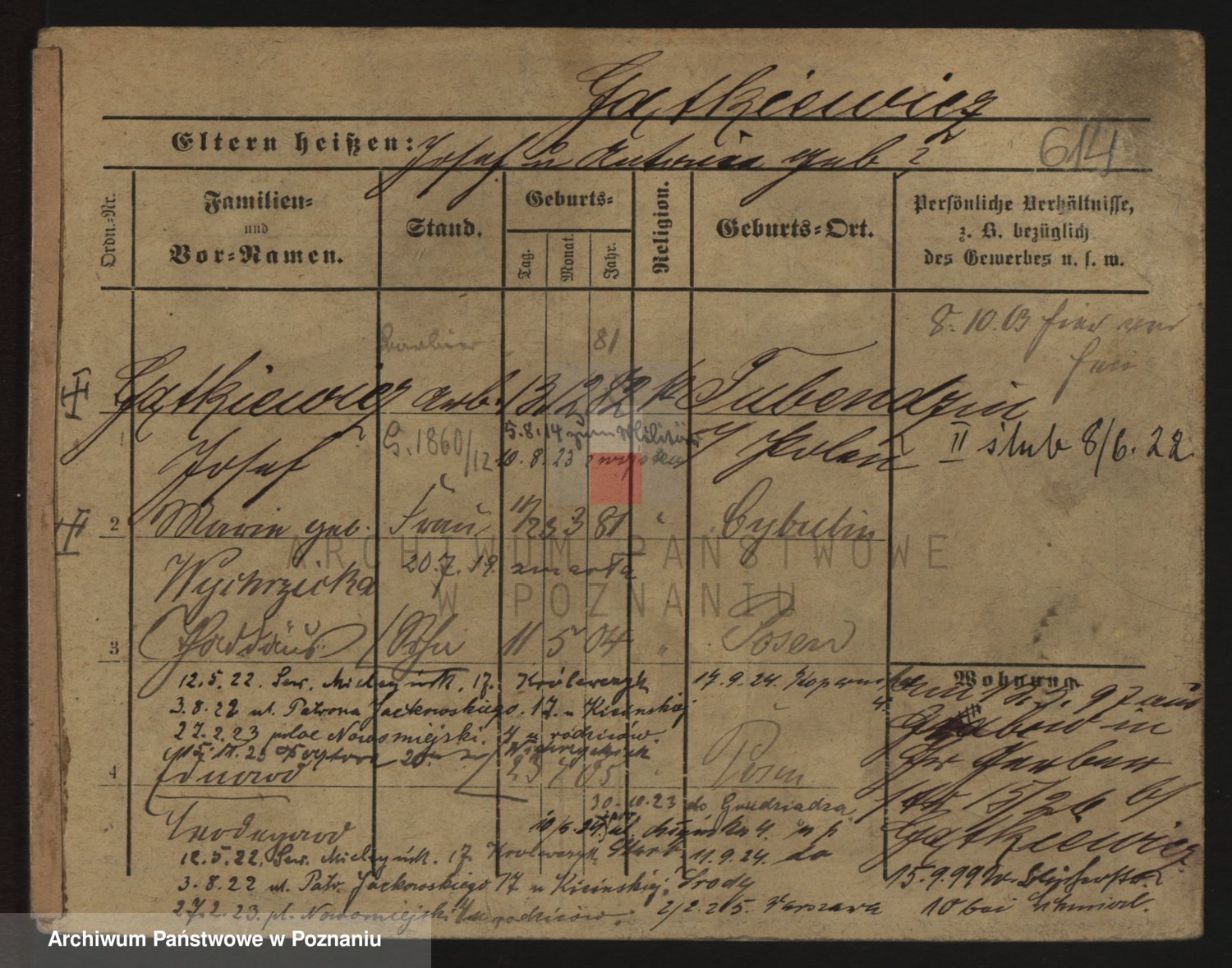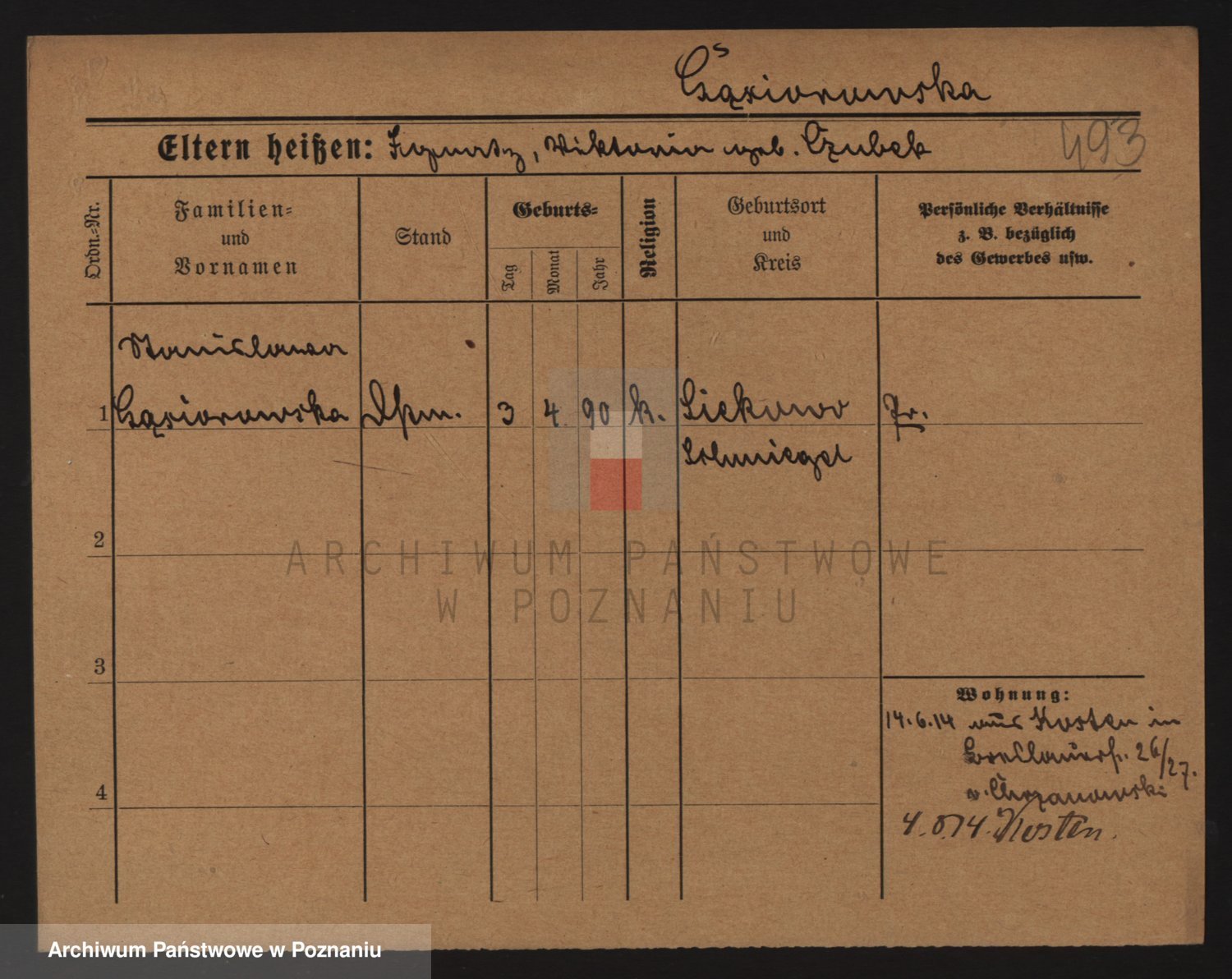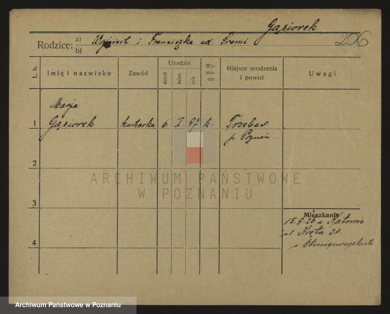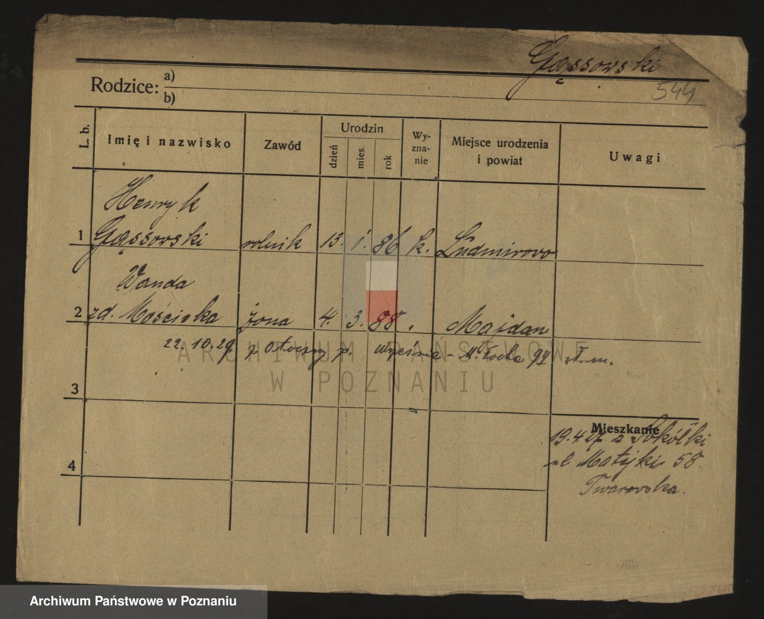 Podgląd karty osobowej dostępny jest po kliknięciu na nazwisko lub ikonkę karty. Można dokonywać powiększenia (ikony na górze) lub przechodzić między kolejnymi skanami (strzałki po bokach).