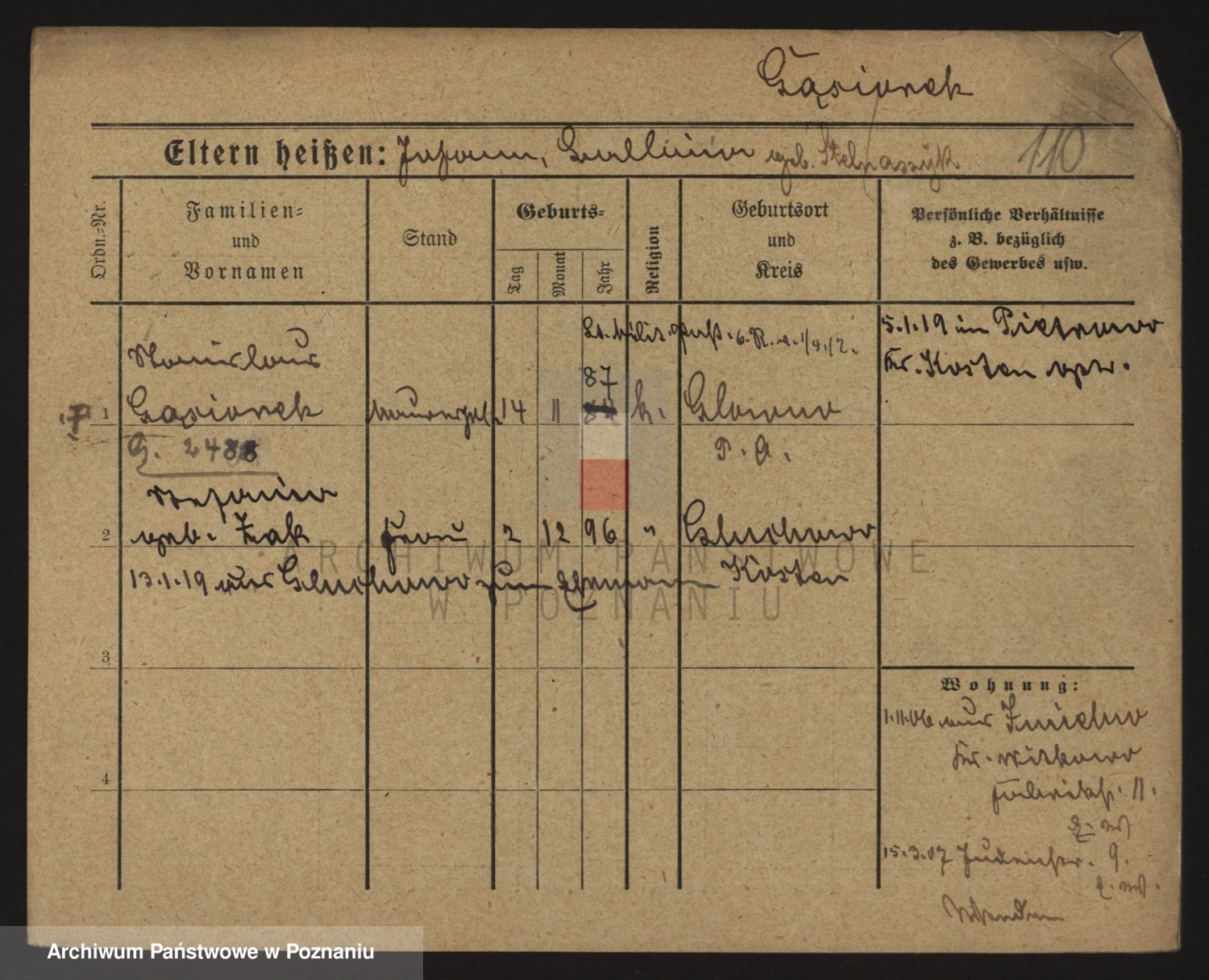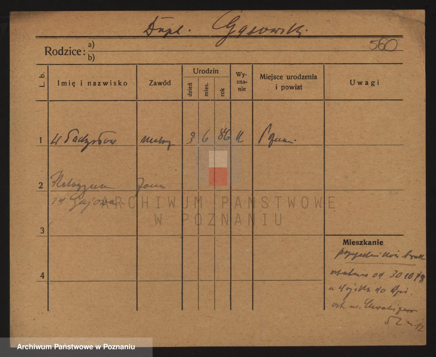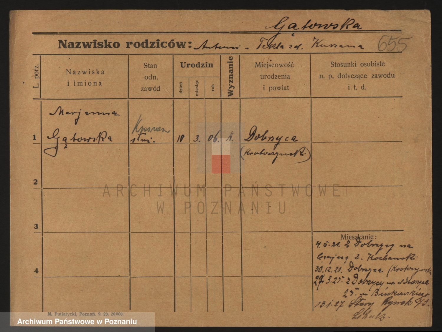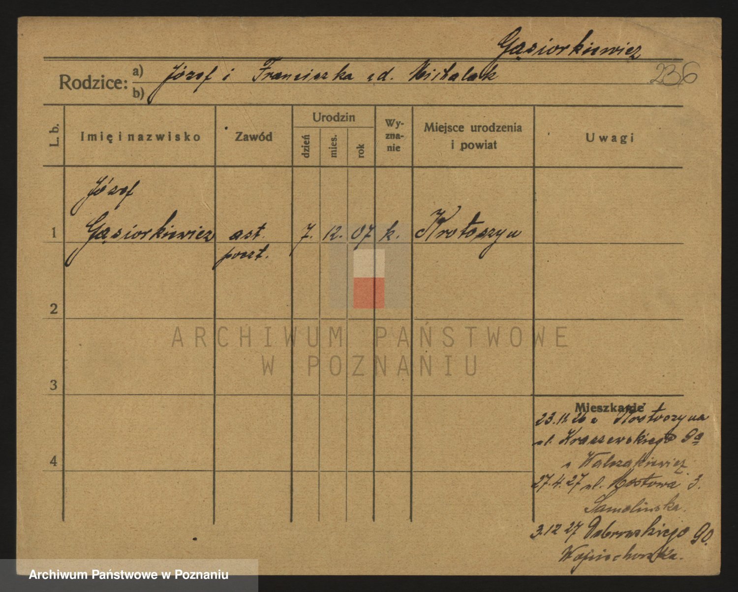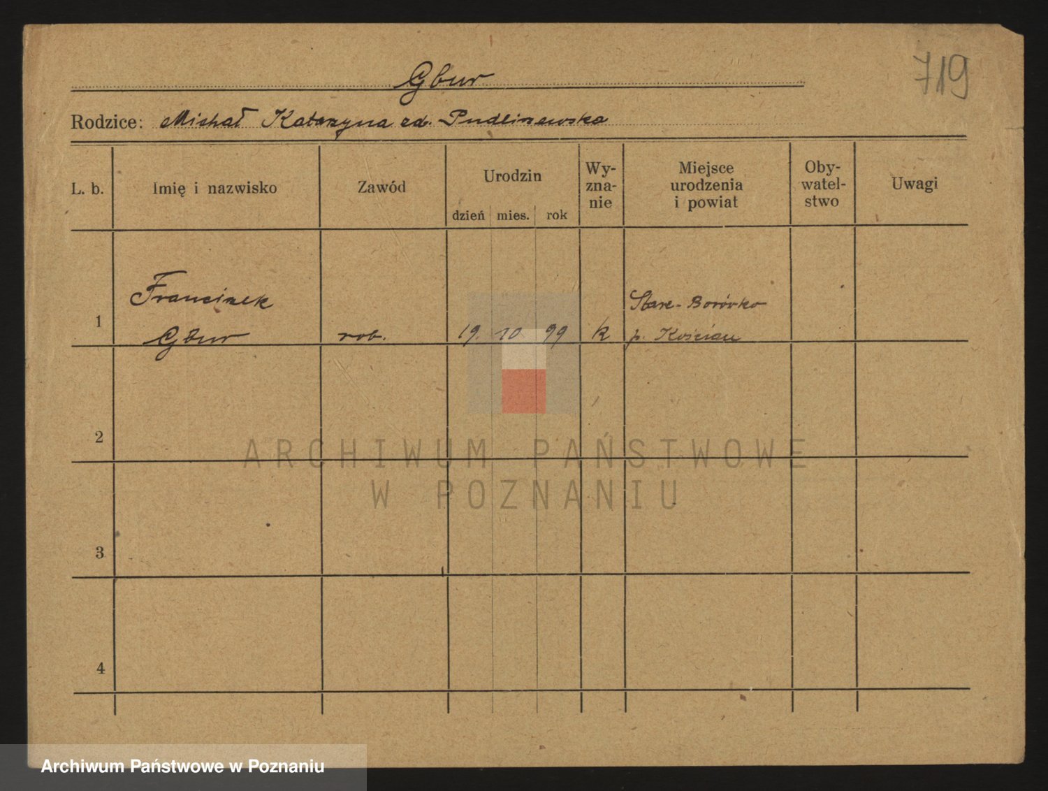 Podgląd karty osobowej dostępny jest po kliknięciu na nazwisko lub ikonkę karty. Można dokonywać powiększenia (ikony na górze) lub przechodzić między kolejnymi skanami (strzałki po bokach).