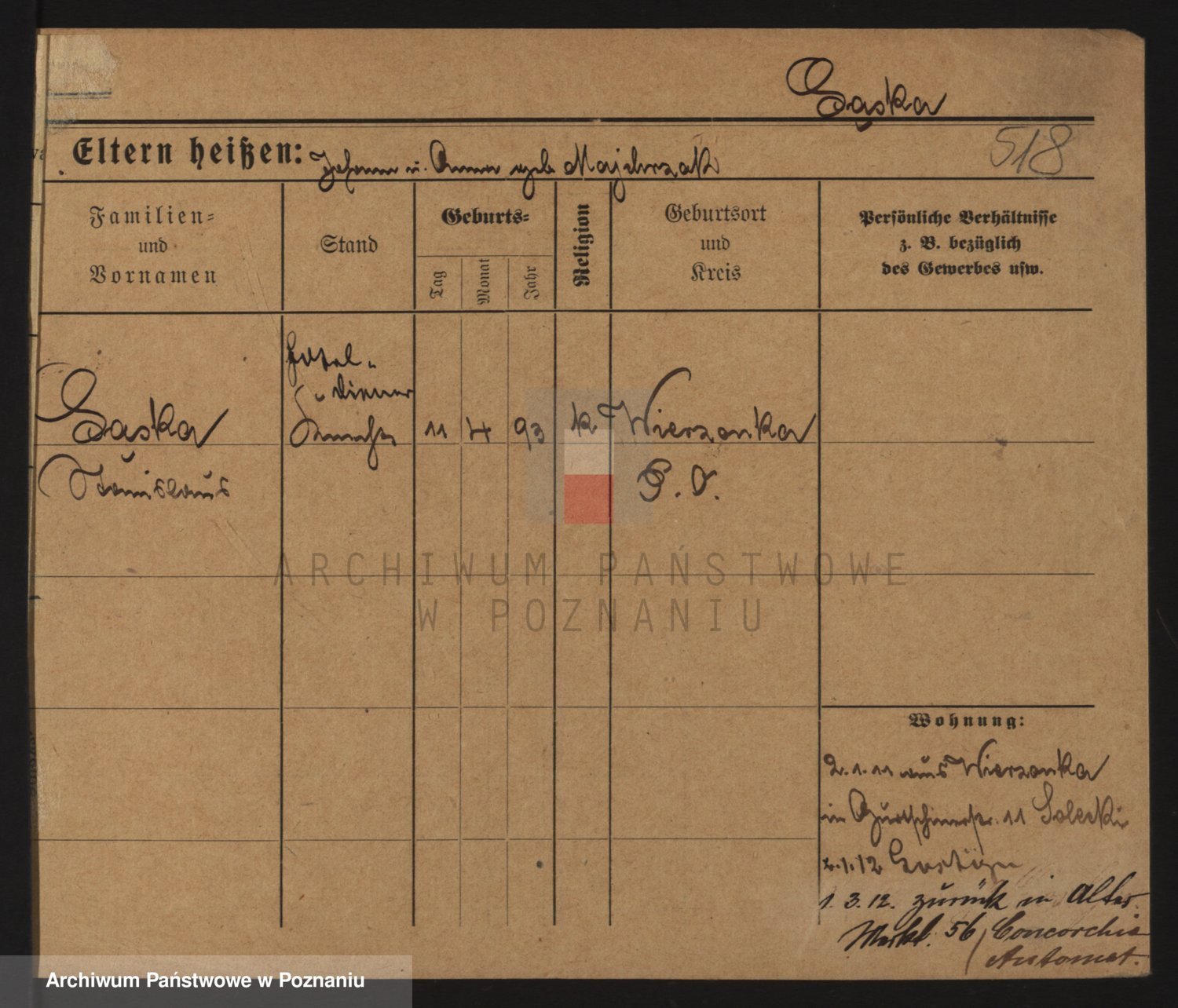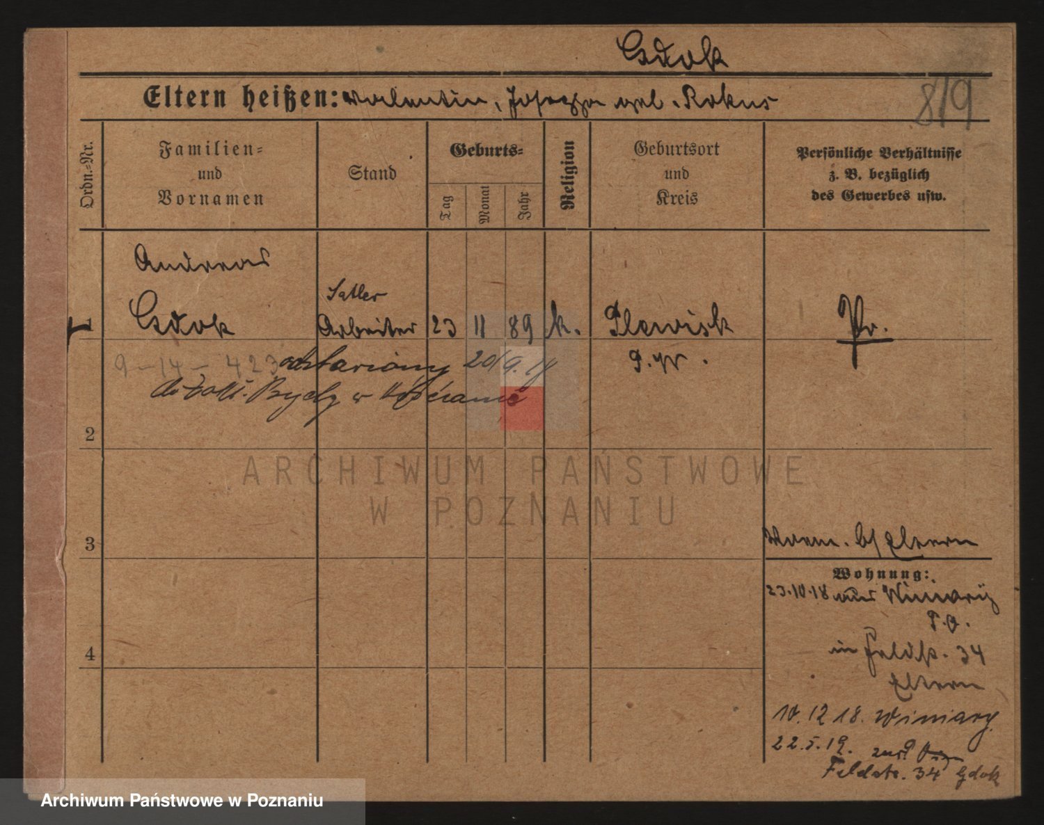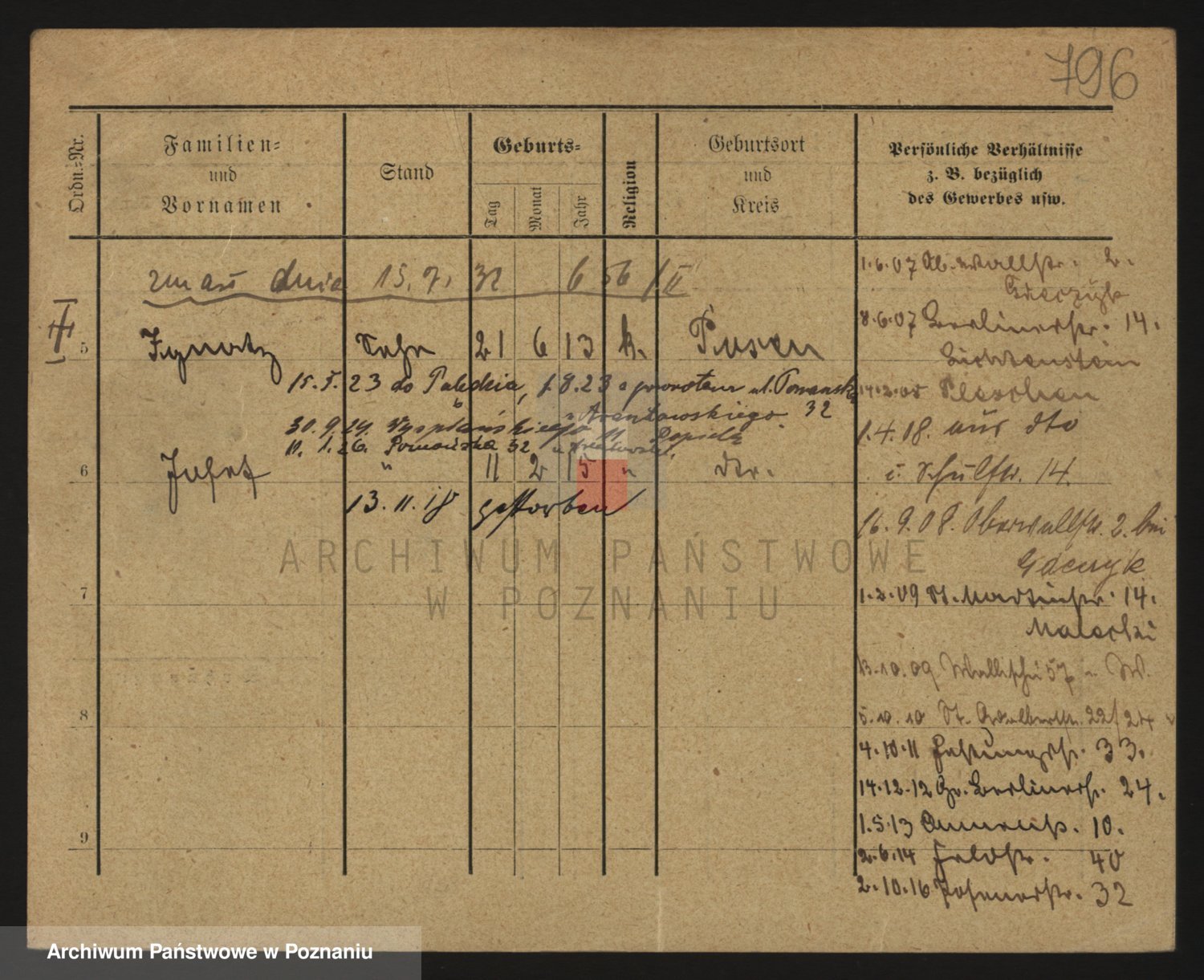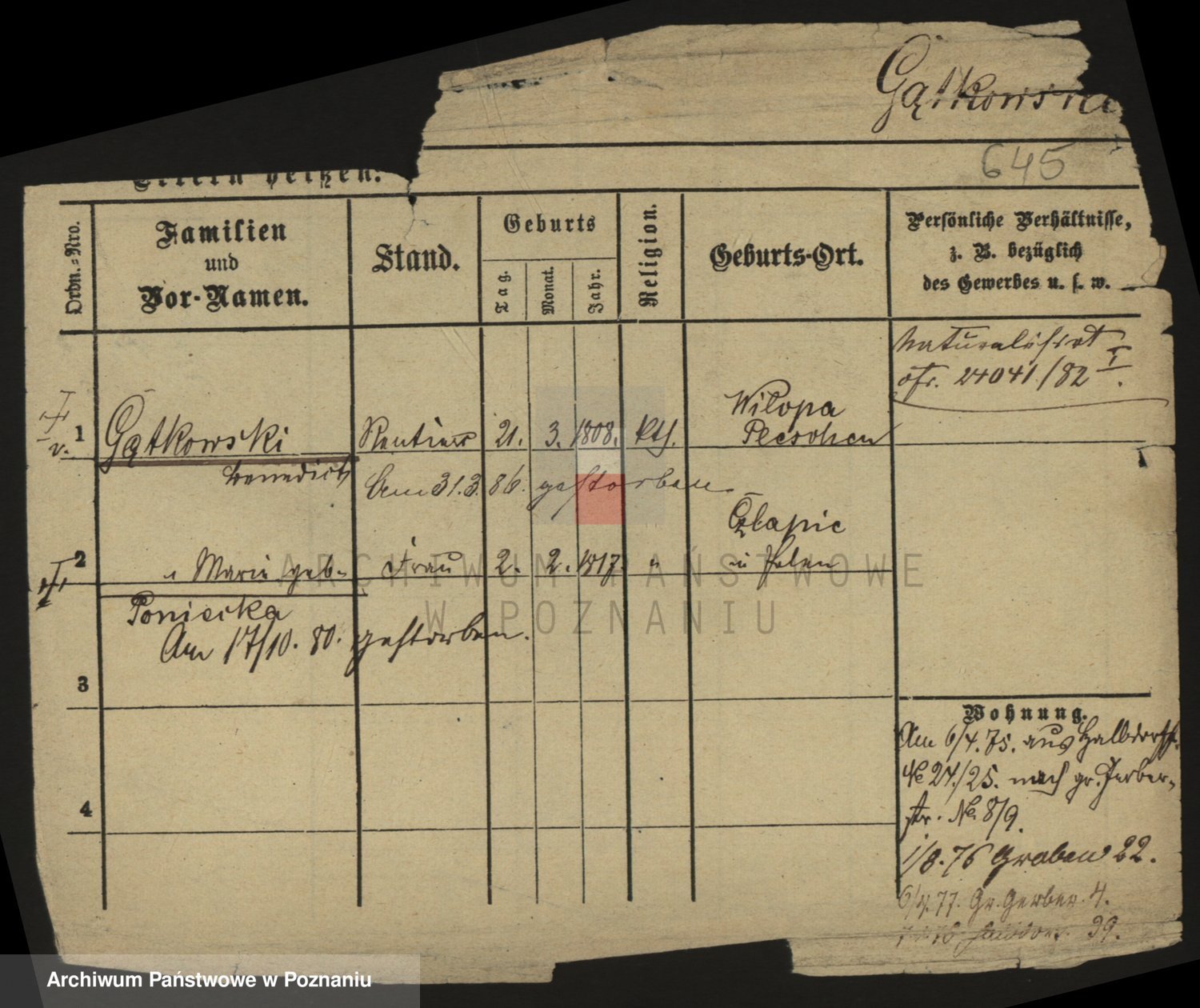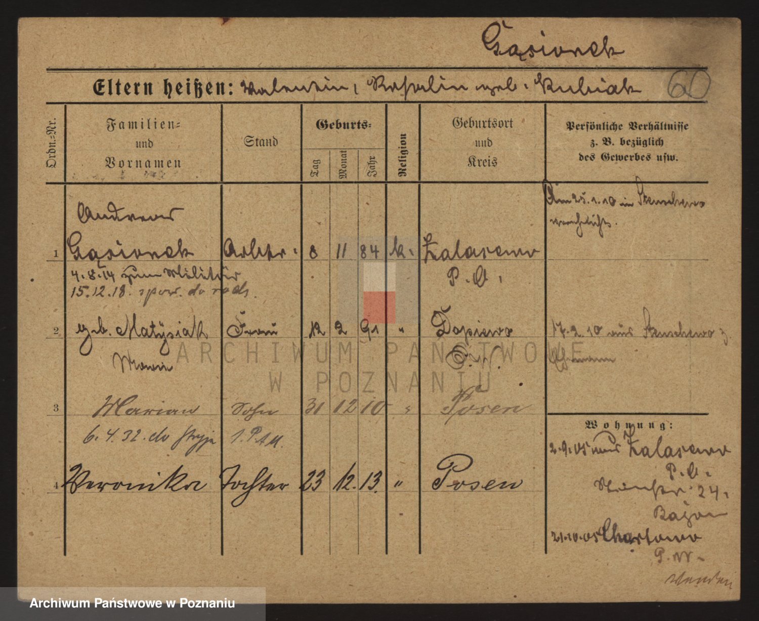 Podgląd karty osobowej dostępny jest po kliknięciu na nazwisko lub ikonkę karty. Można dokonywać powiększenia (ikony na górze) lub przechodzić między kolejnymi skanami (strzałki po bokach).