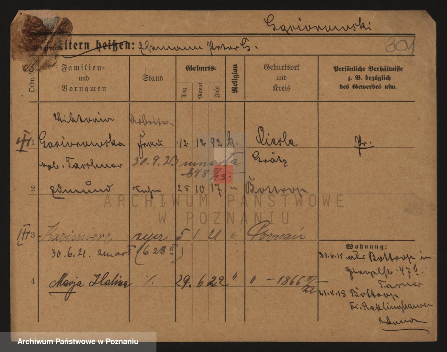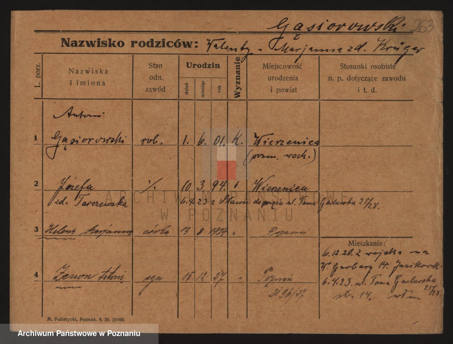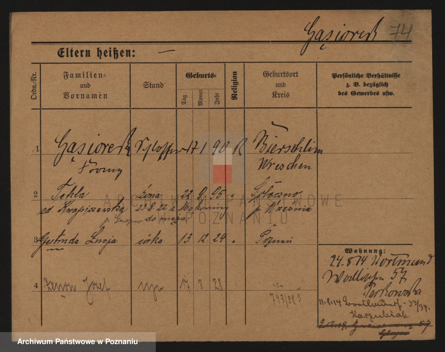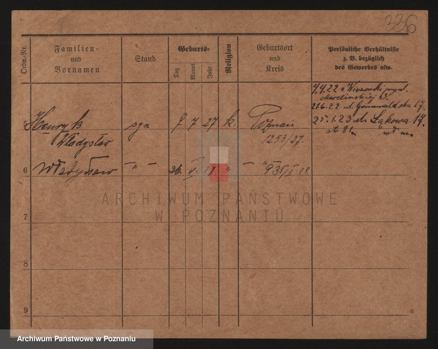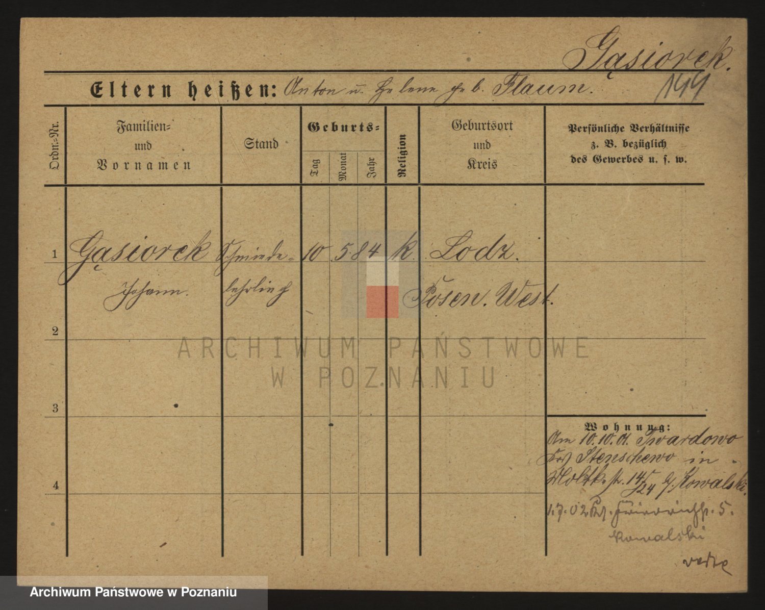 Podgląd karty osobowej dostępny jest po kliknięciu na nazwisko lub ikonkę karty. Można dokonywać powiększenia (ikony na górze) lub przechodzić między kolejnymi skanami (strzałki po bokach).
