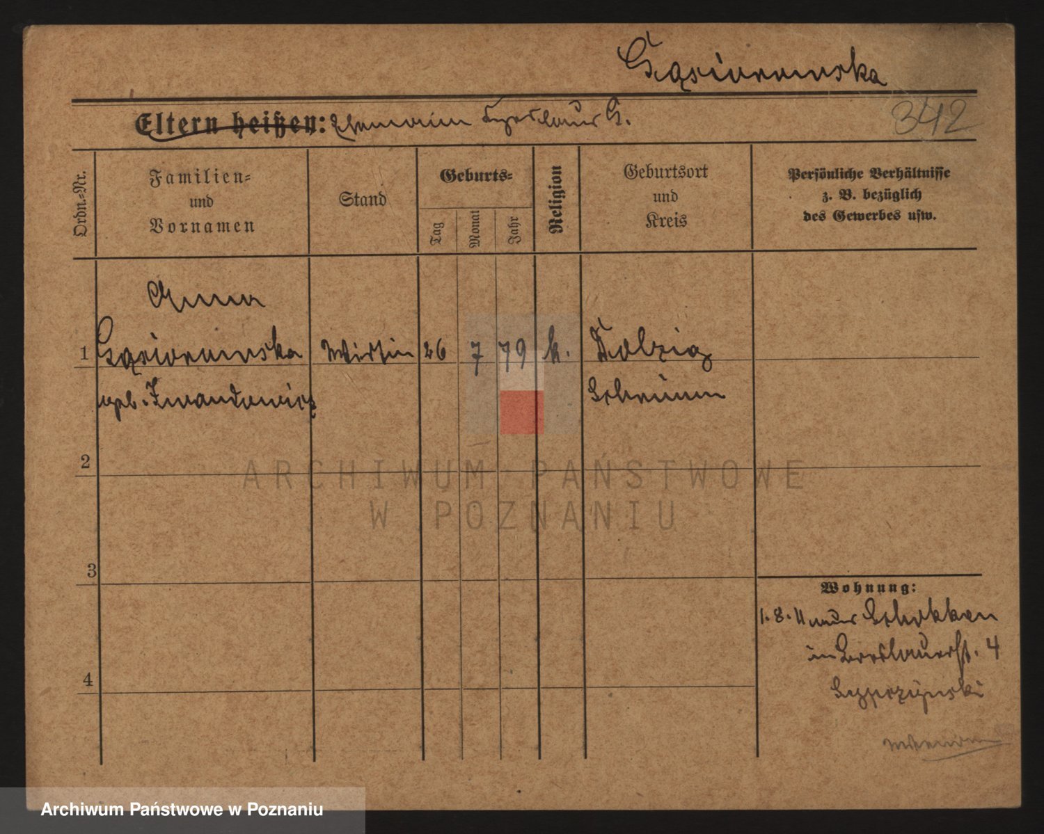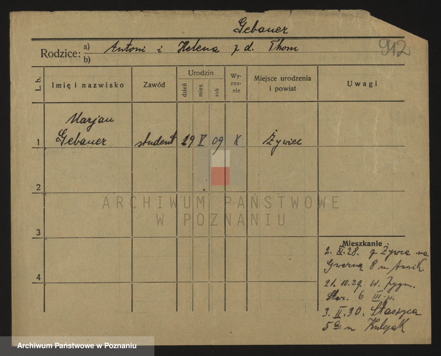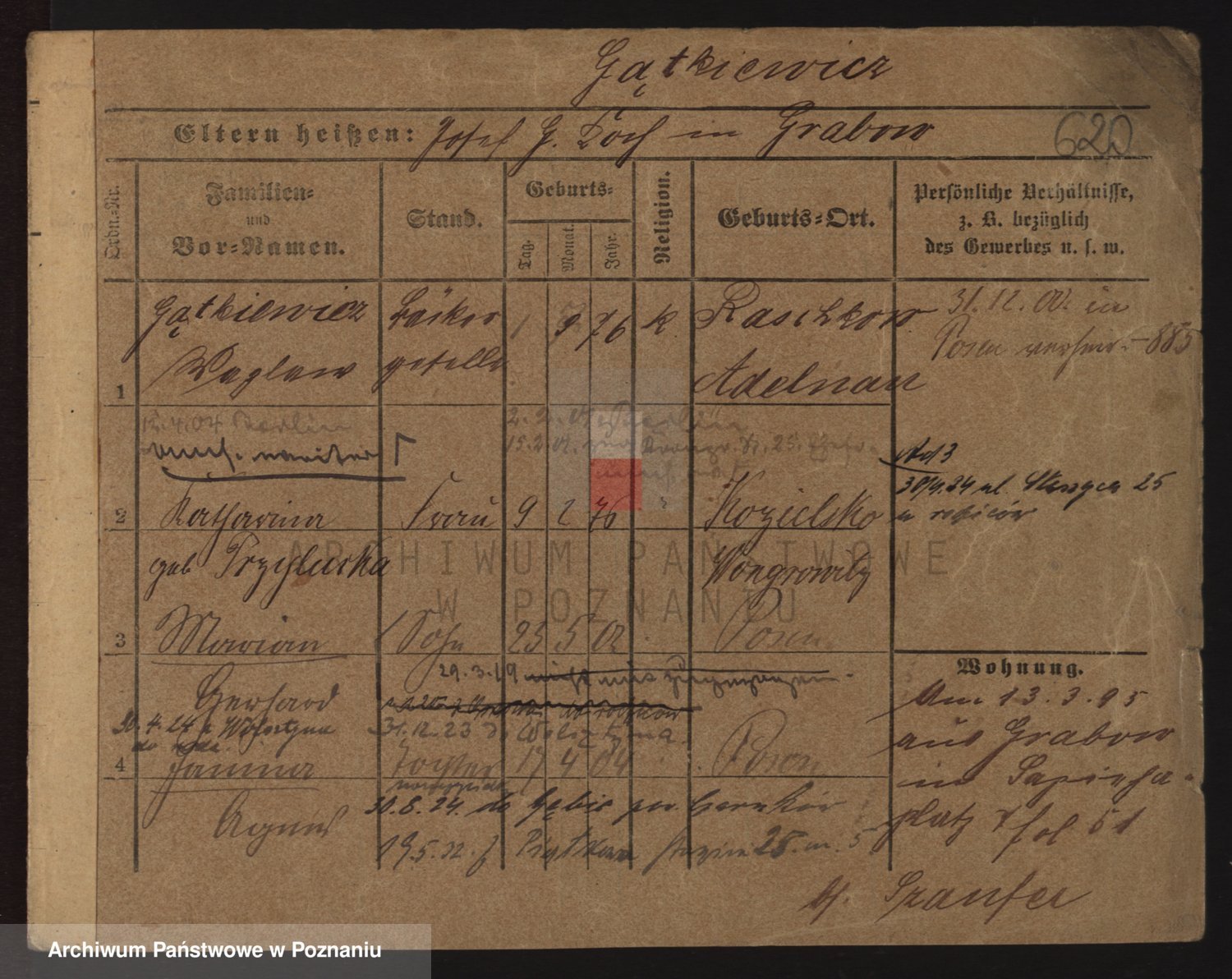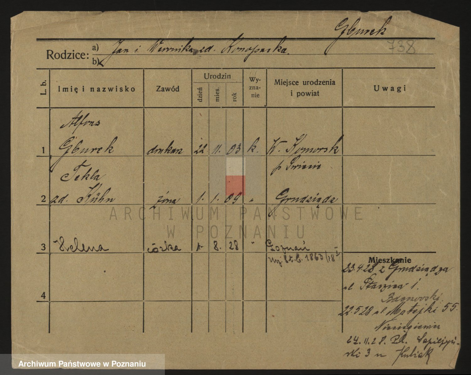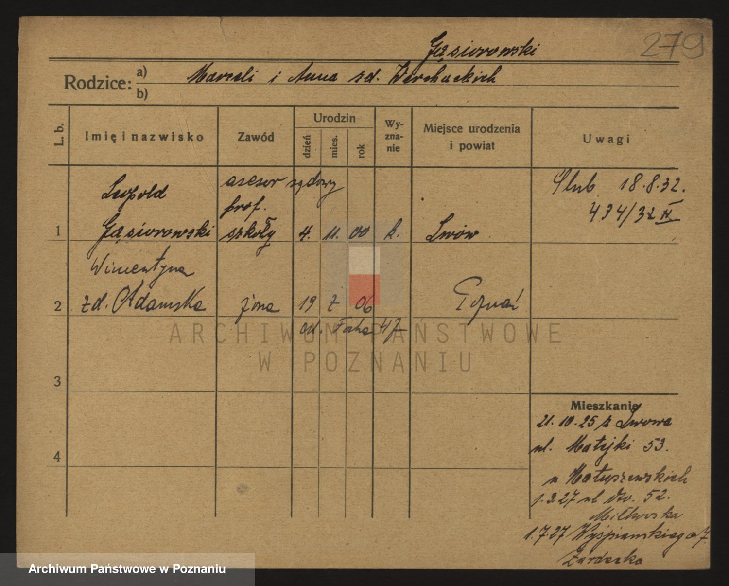 Podgląd karty osobowej dostępny jest po kliknięciu na nazwisko lub ikonkę karty. Można dokonywać powiększenia (ikony na górze) lub przechodzić między kolejnymi skanami (strzałki po bokach).