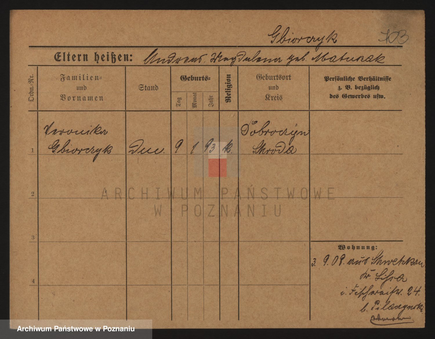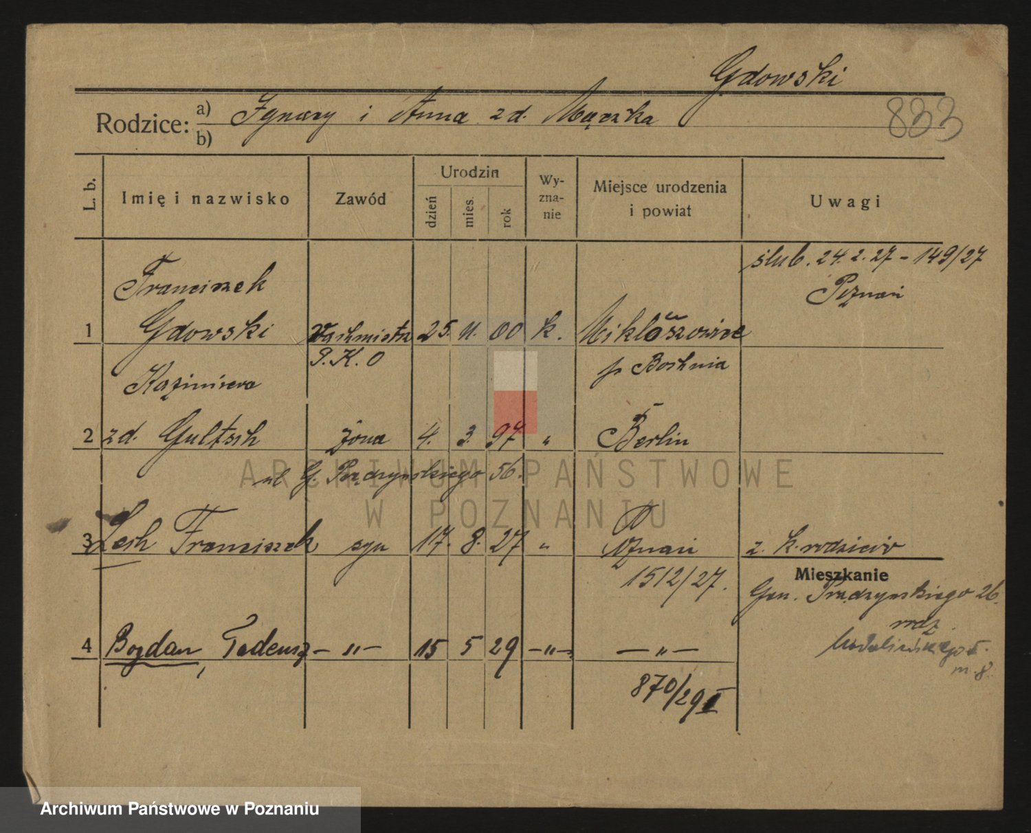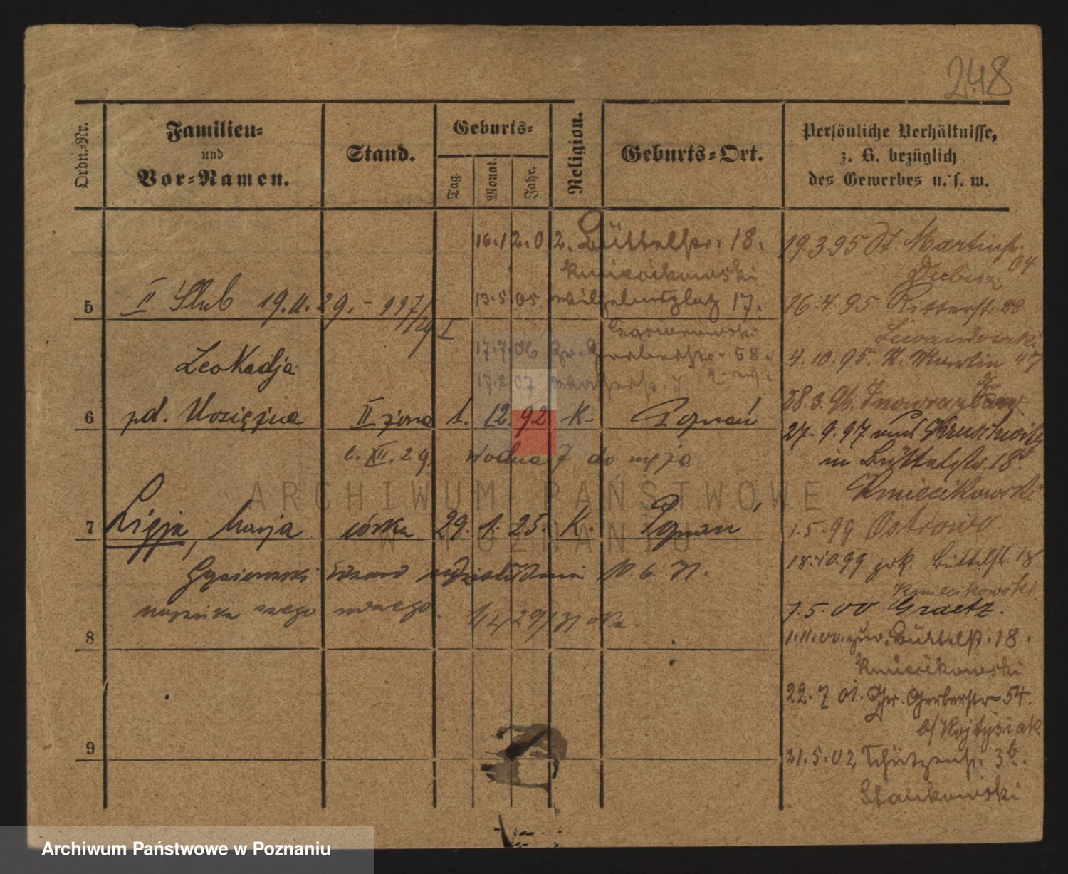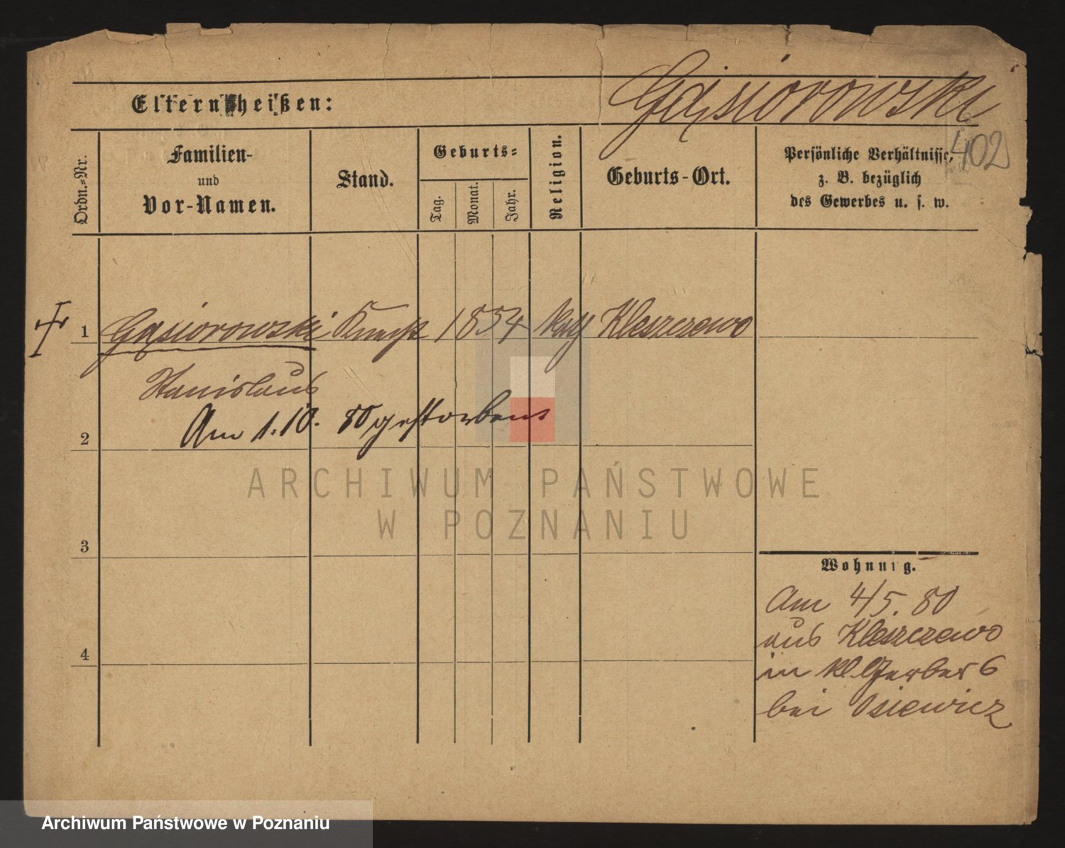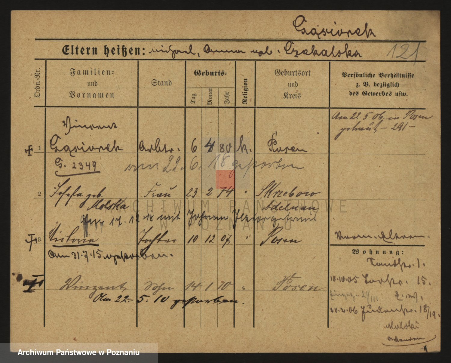 Podgląd karty osobowej dostępny jest po kliknięciu na nazwisko lub ikonkę karty. Można dokonywać powiększenia (ikony na górze) lub przechodzić między kolejnymi skanami (strzałki po bokach).