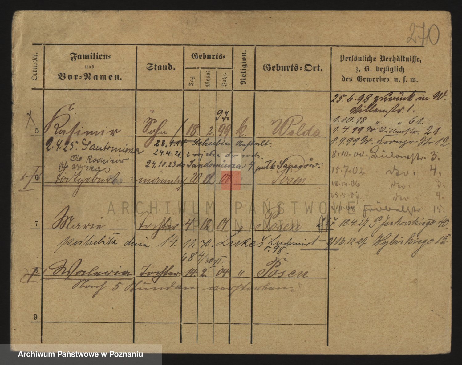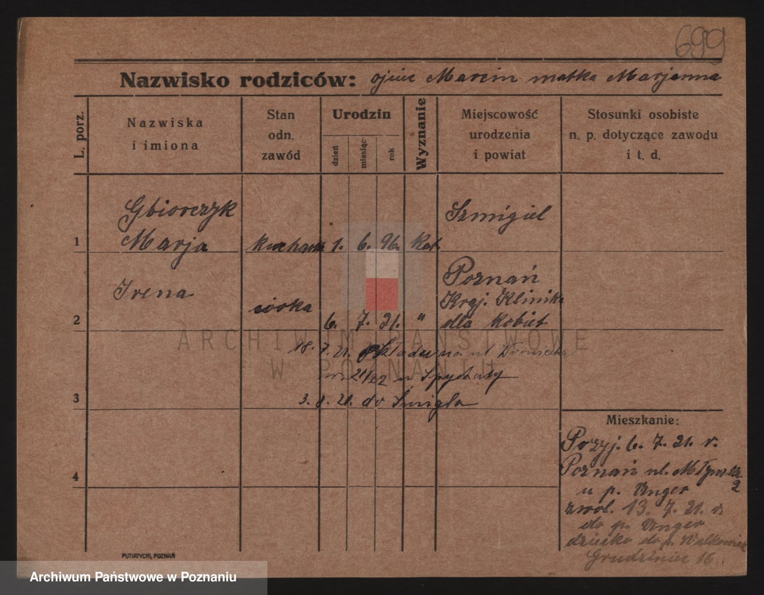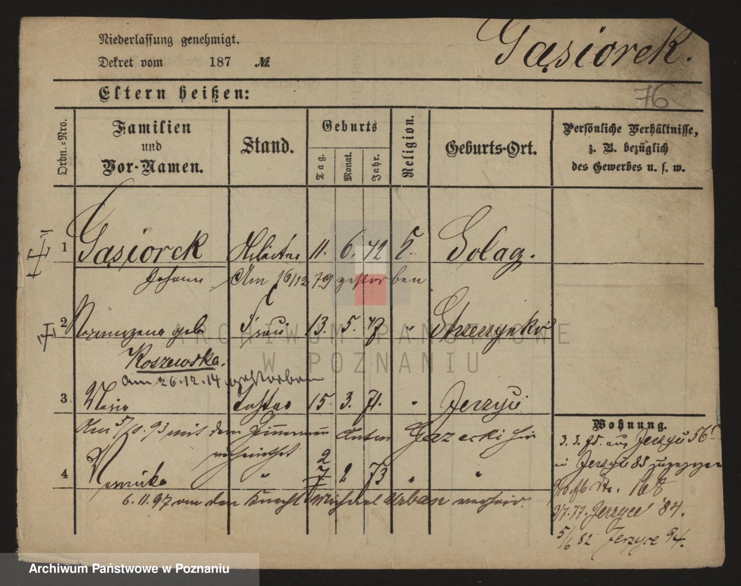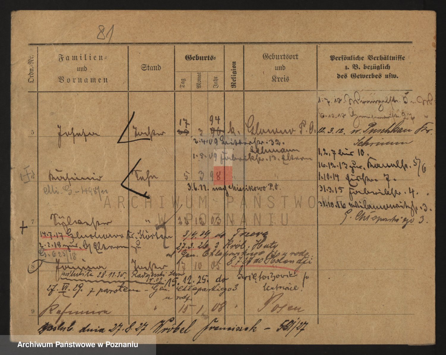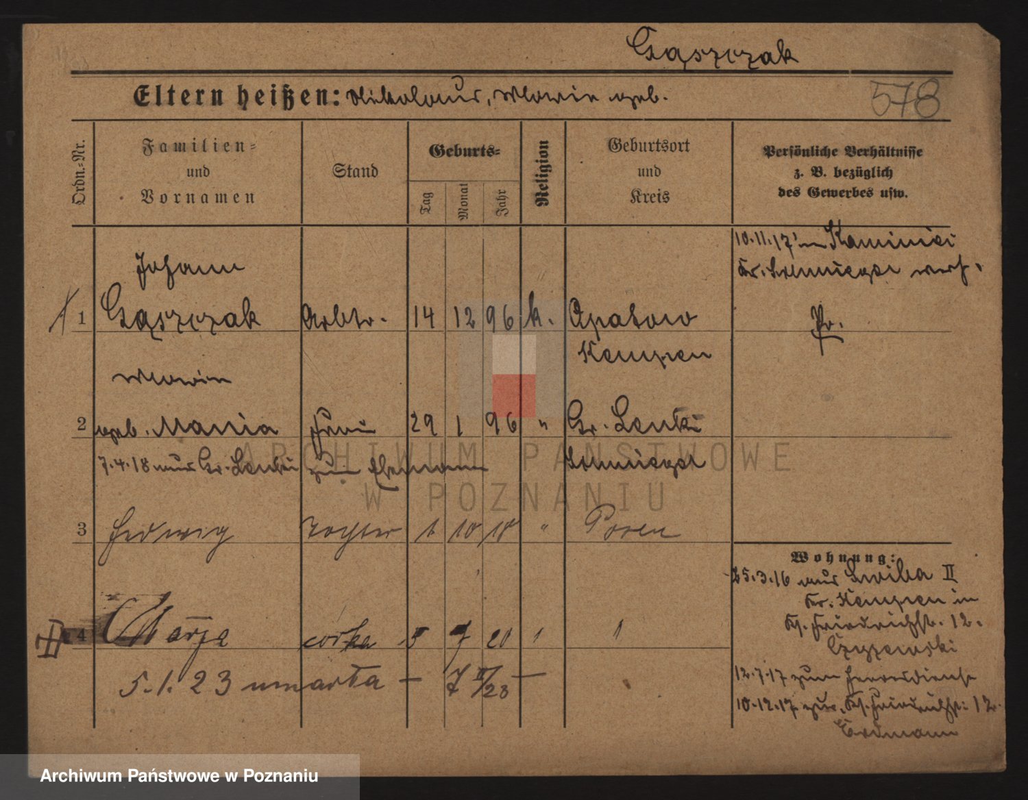Podgląd karty osobowej dostępny jest po kliknięciu na nazwisko lub ikonkę karty. Można dokonywać powiększenia (ikony na górze) lub przechodzić między kolejnymi skanami (strzałki po bokach).