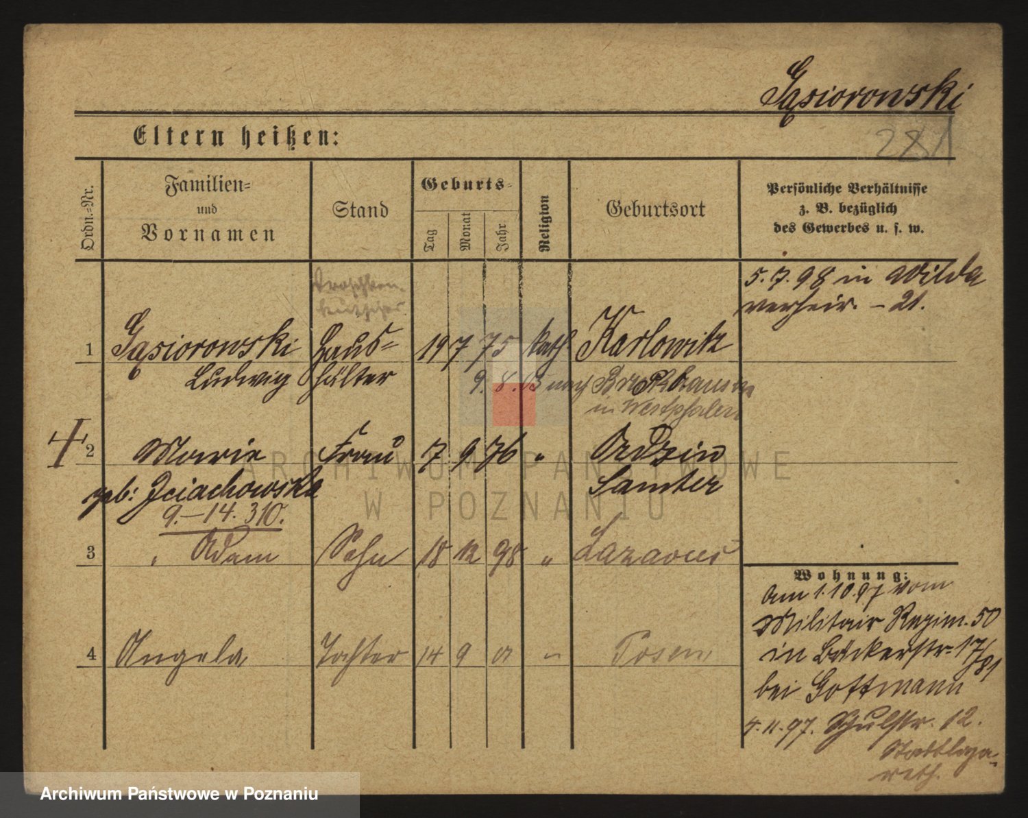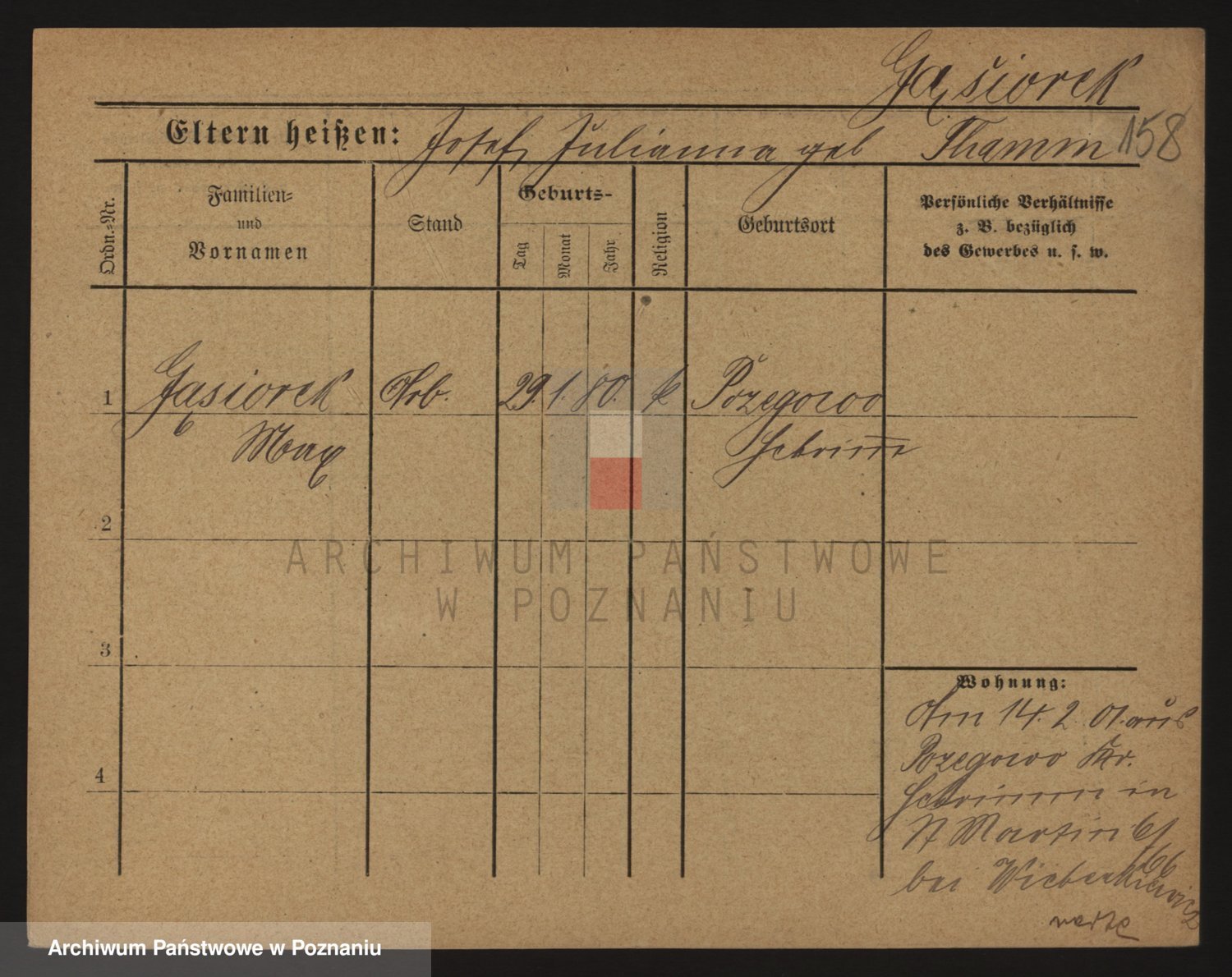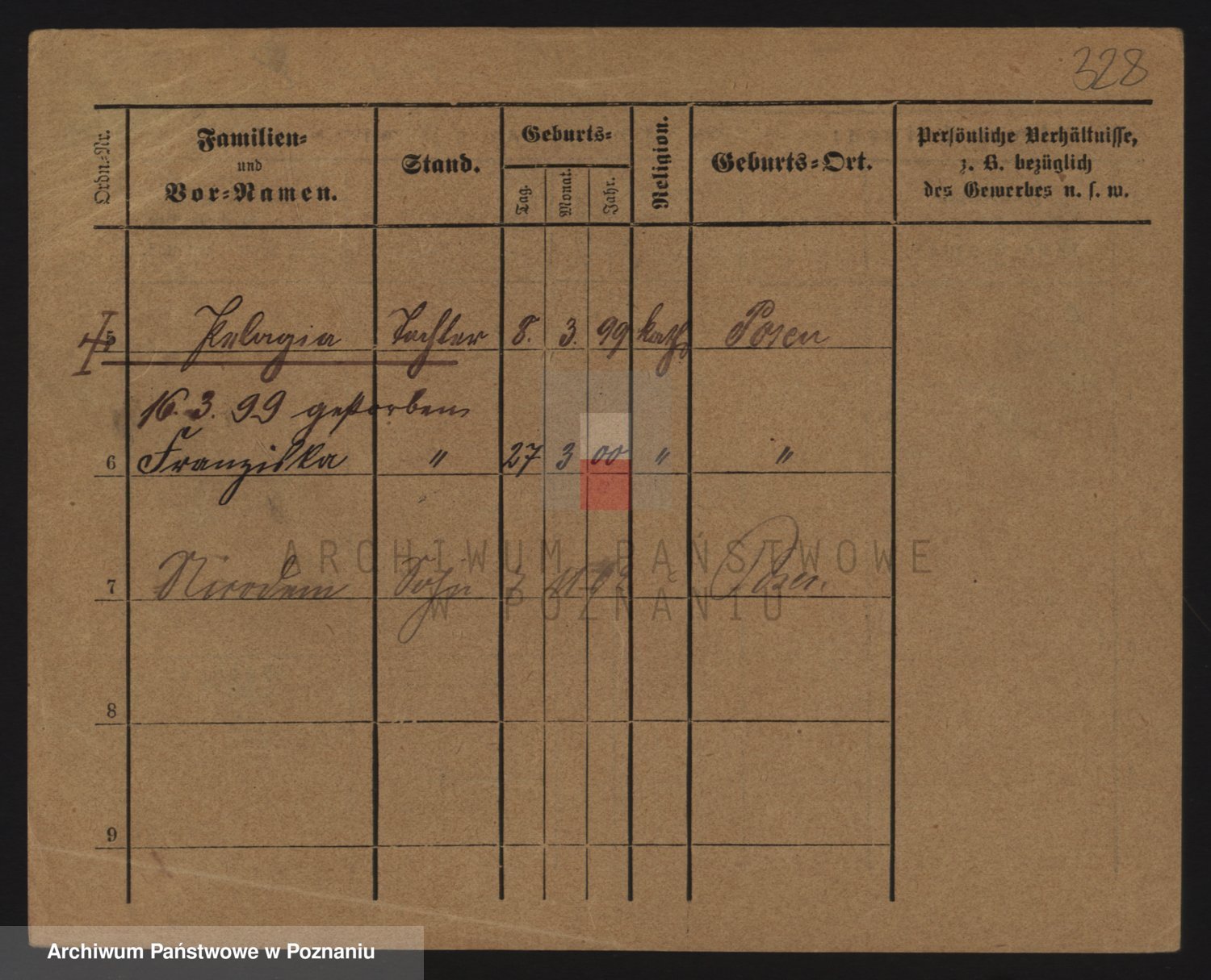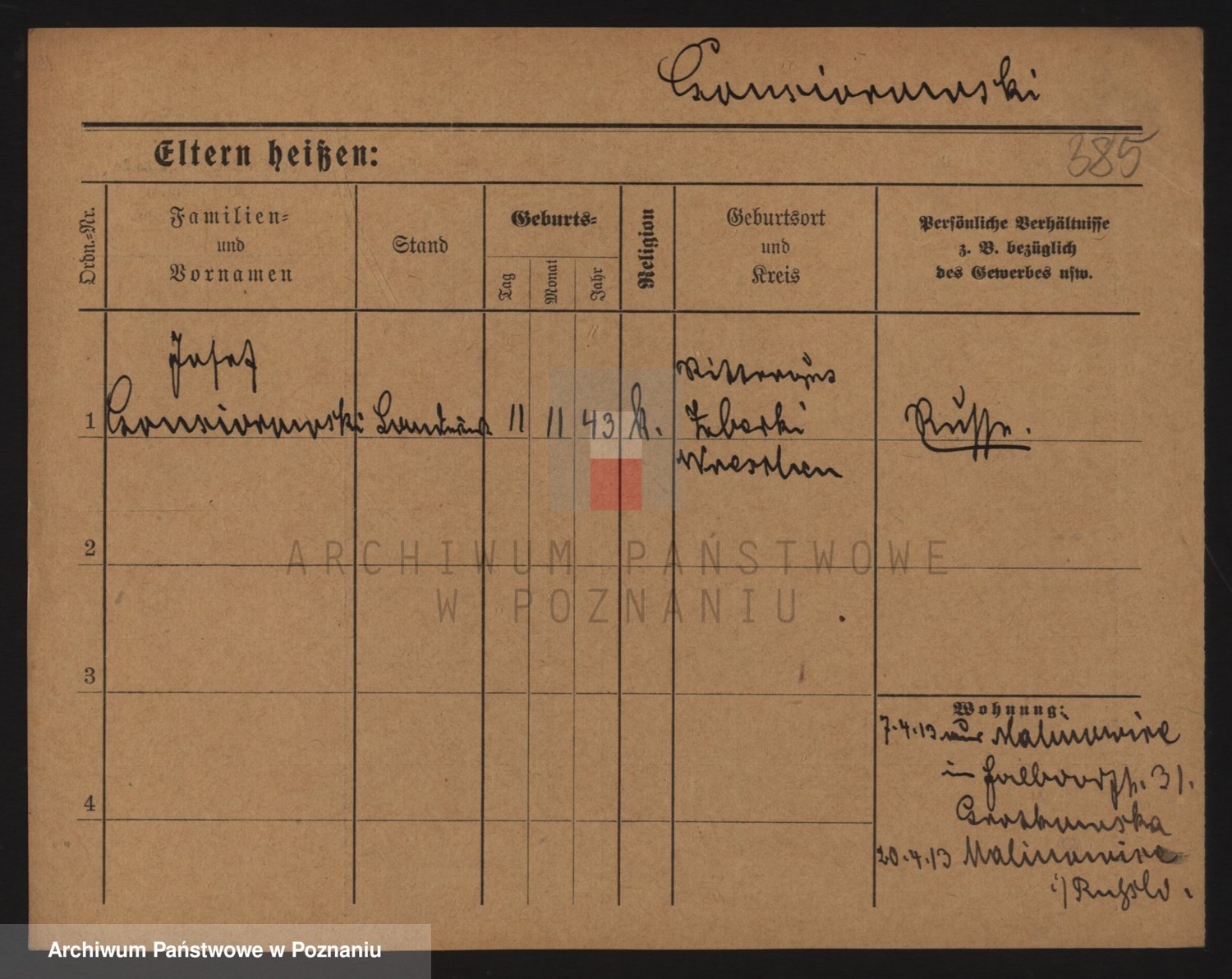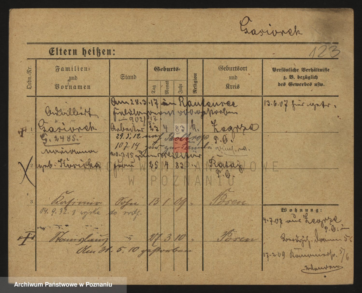 Podgląd karty osobowej dostępny jest po kliknięciu na nazwisko lub ikonkę karty. Można dokonywać powiększenia (ikony na górze) lub przechodzić między kolejnymi skanami (strzałki po bokach).