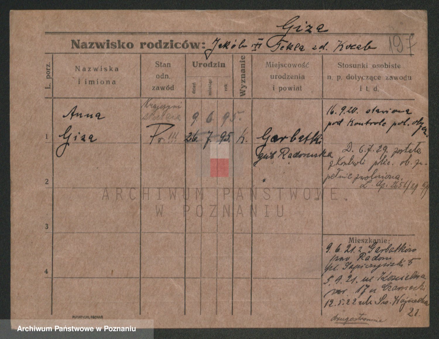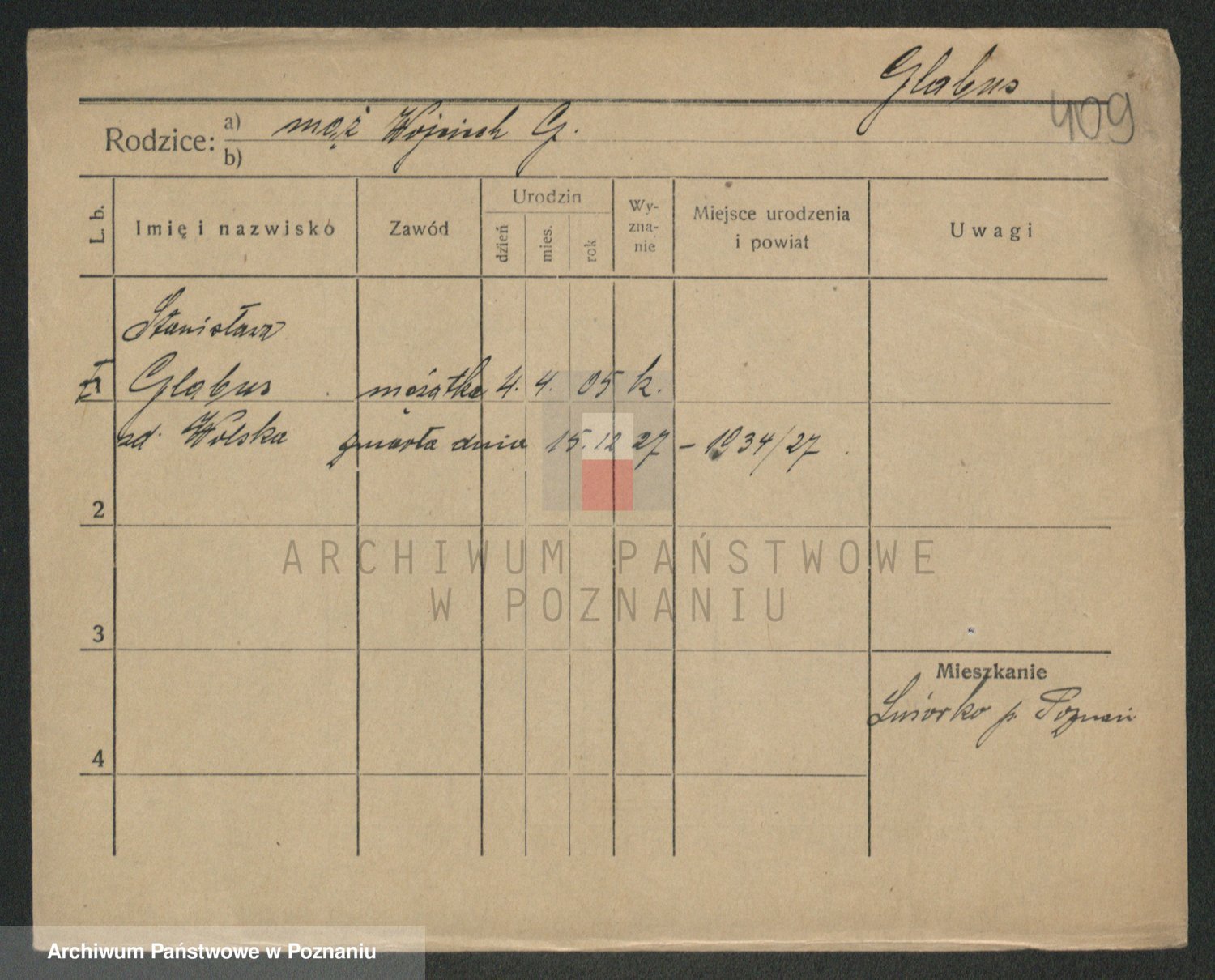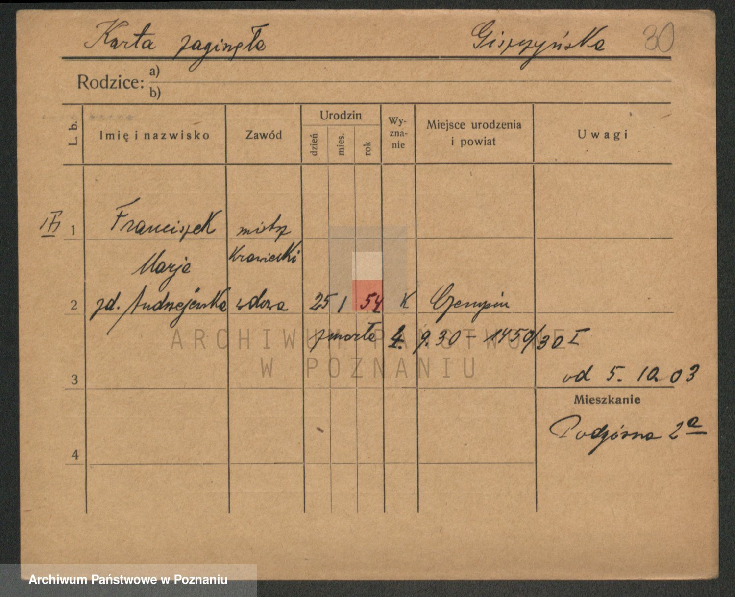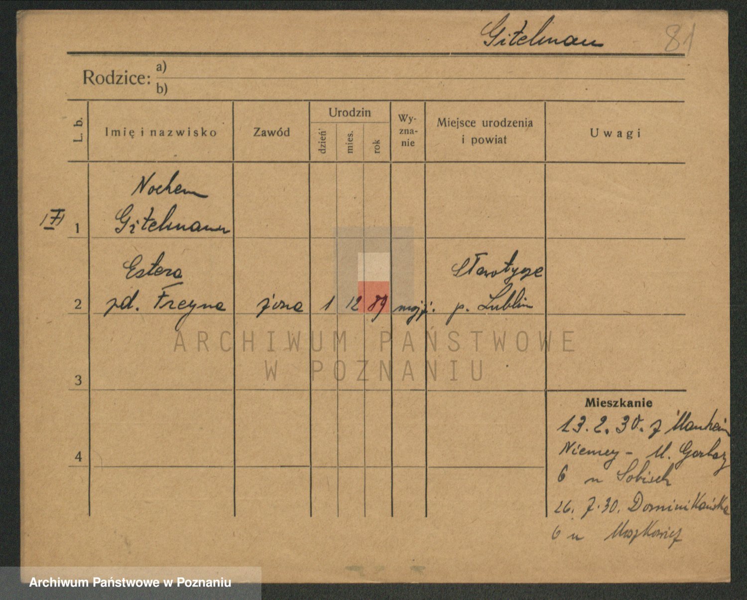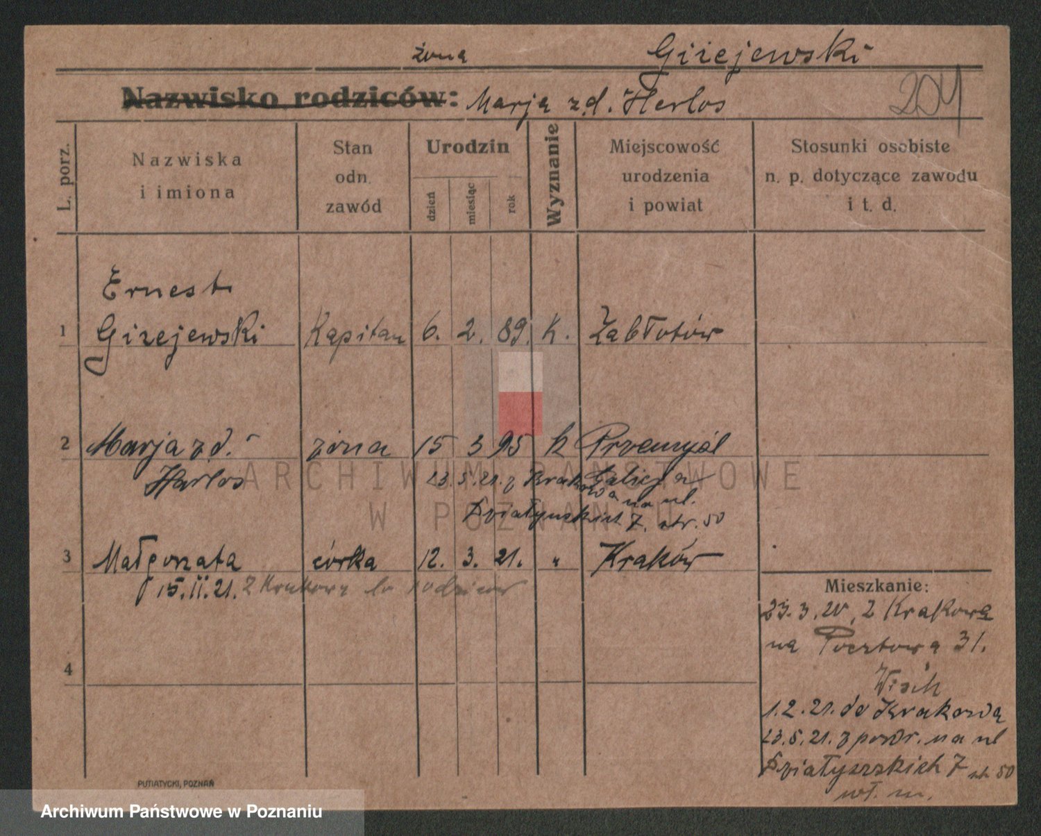 Podgląd karty osobowej dostępny jest po kliknięciu na nazwisko lub ikonkę karty. Można dokonywać powiększenia (ikony na górze) lub przechodzić między kolejnymi skanami (strzałki po bokach).