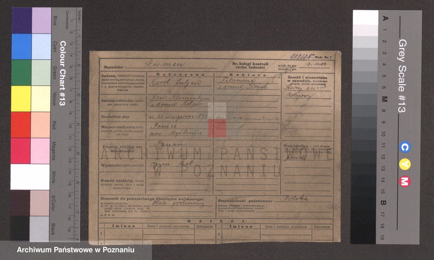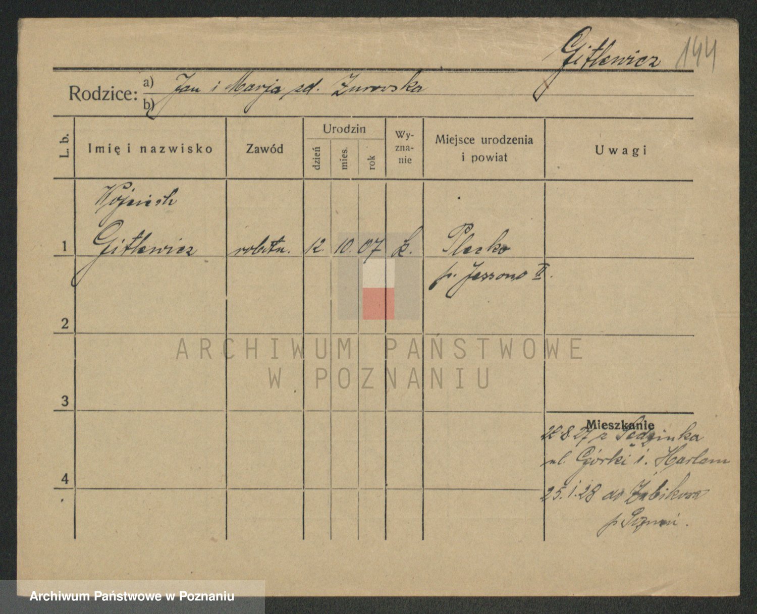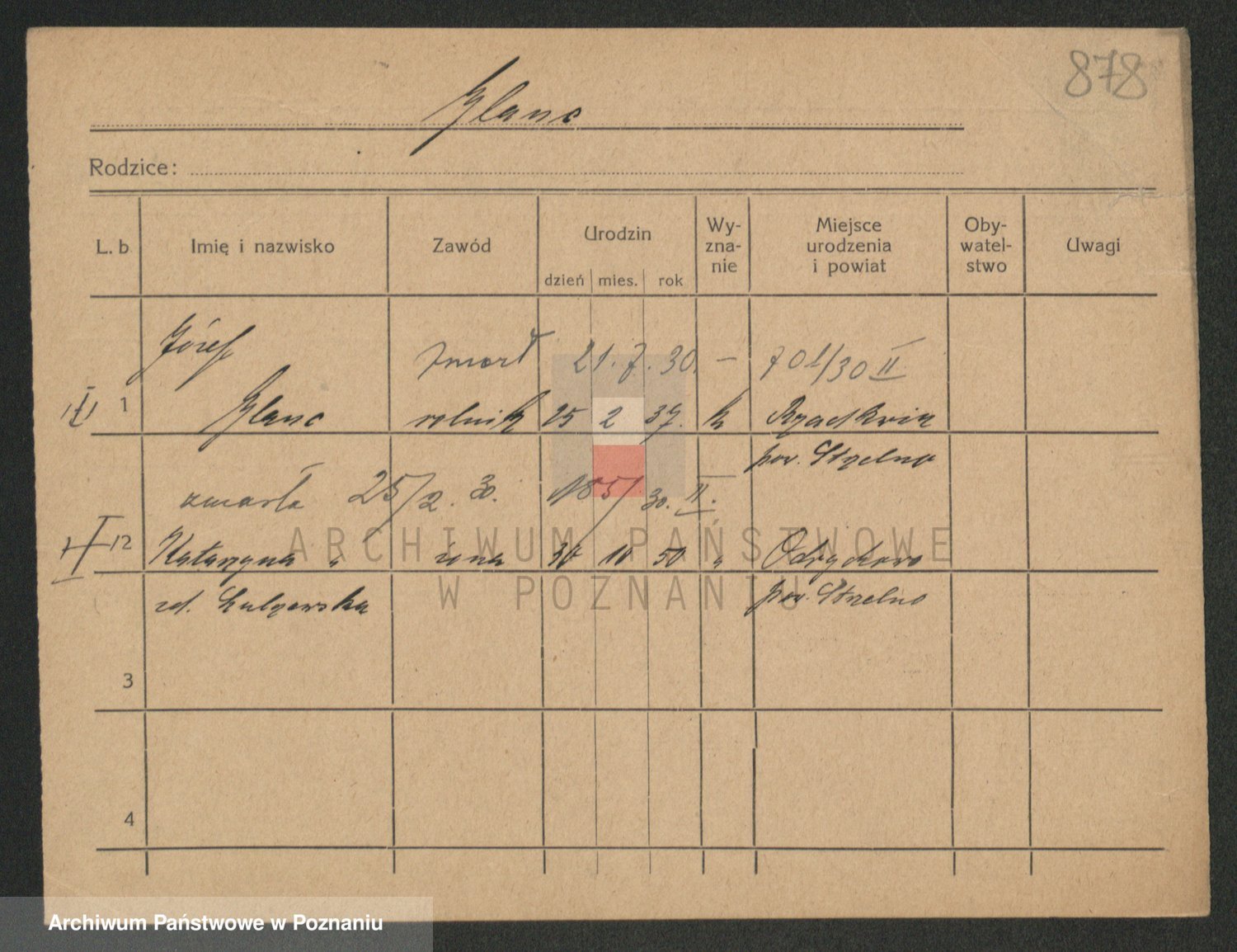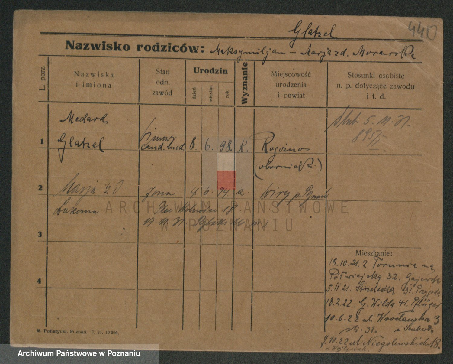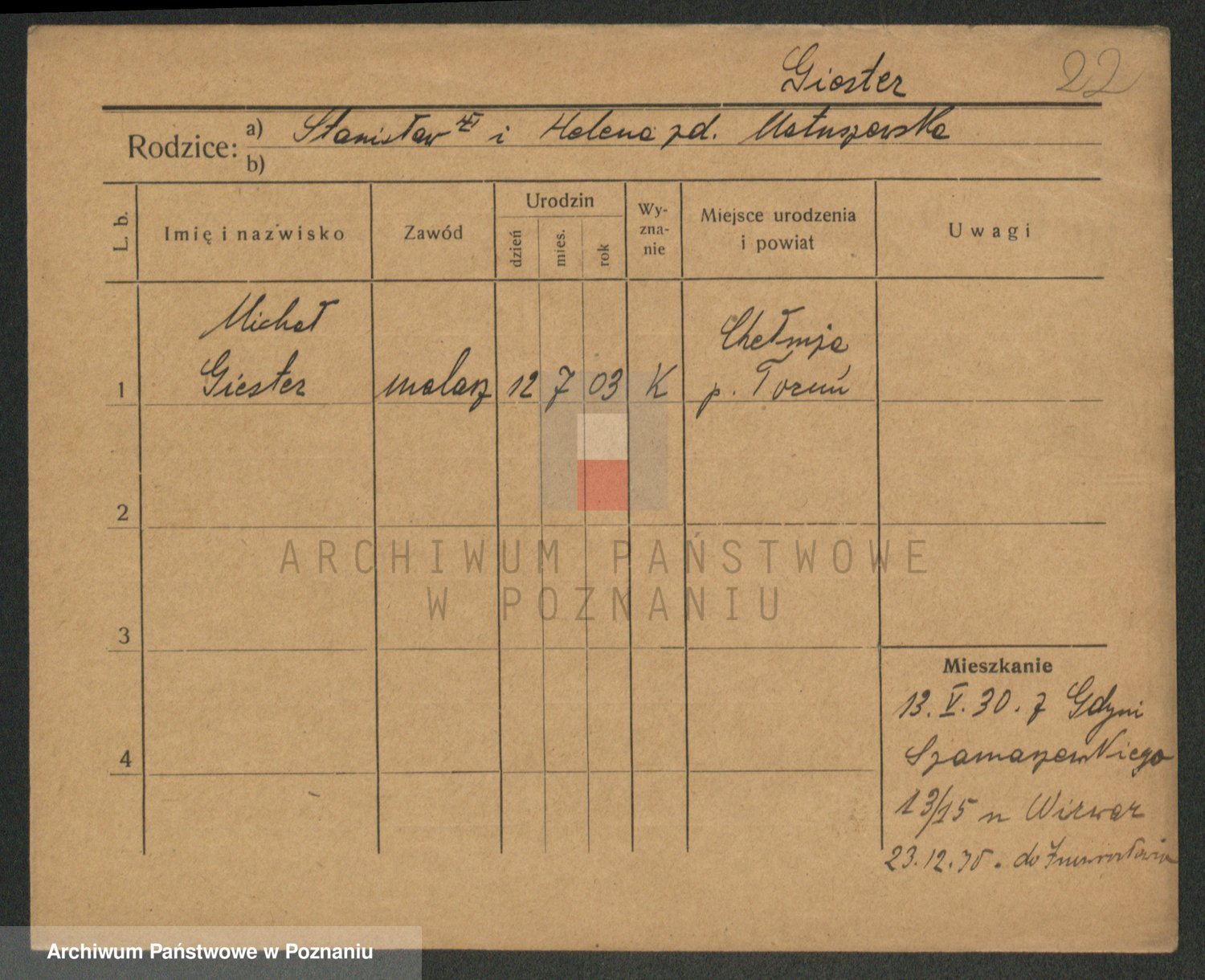 Podgląd karty osobowej dostępny jest po kliknięciu na nazwisko lub ikonkę karty. Można dokonywać powiększenia (ikony na górze) lub przechodzić między kolejnymi skanami (strzałki po bokach).