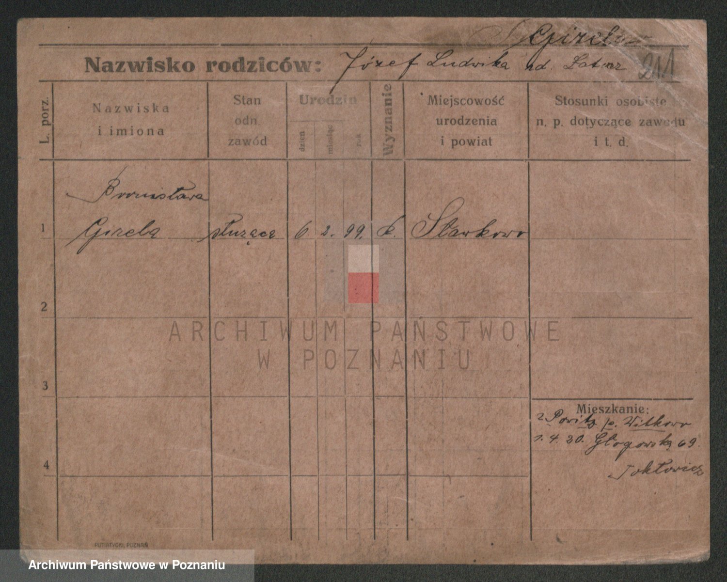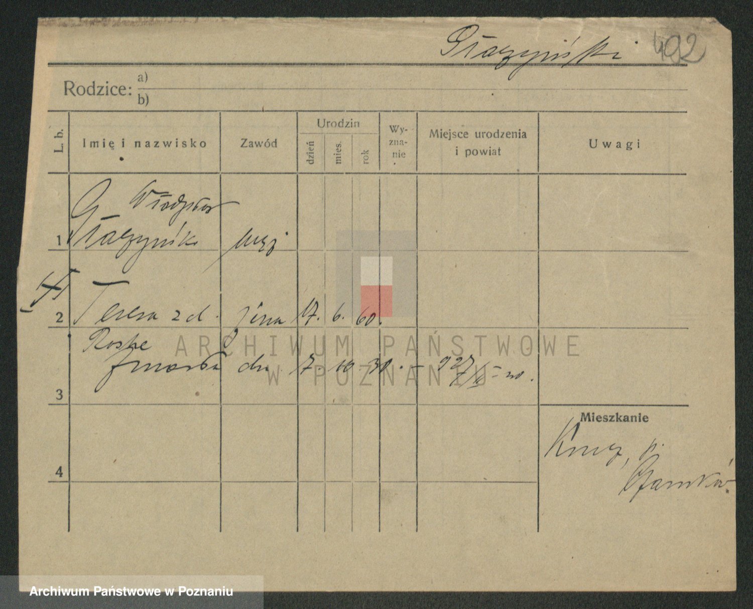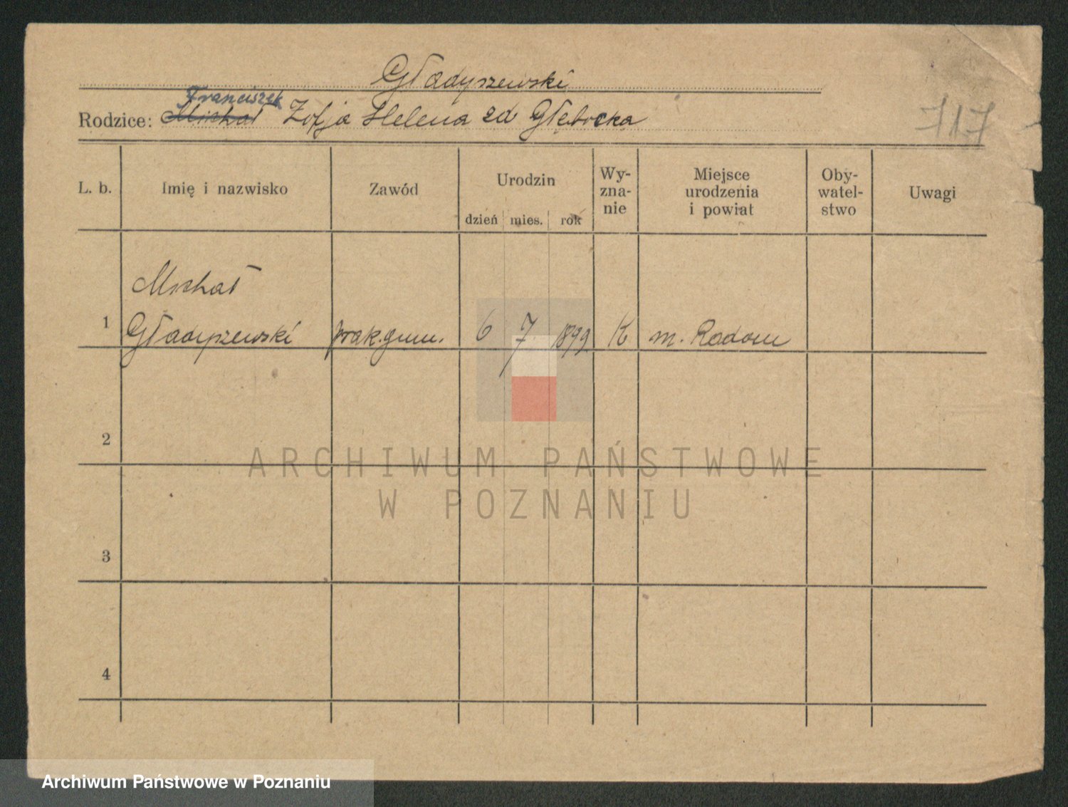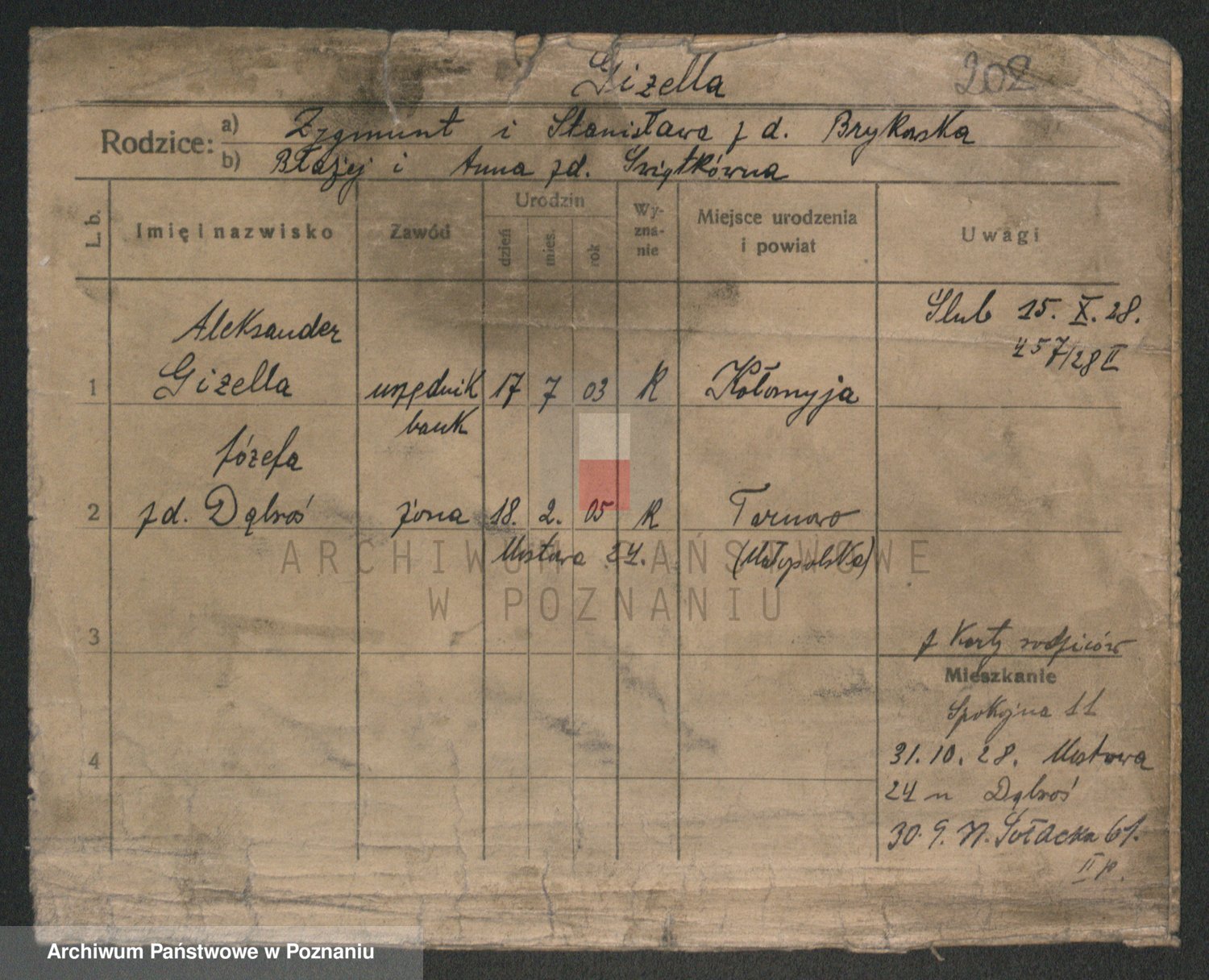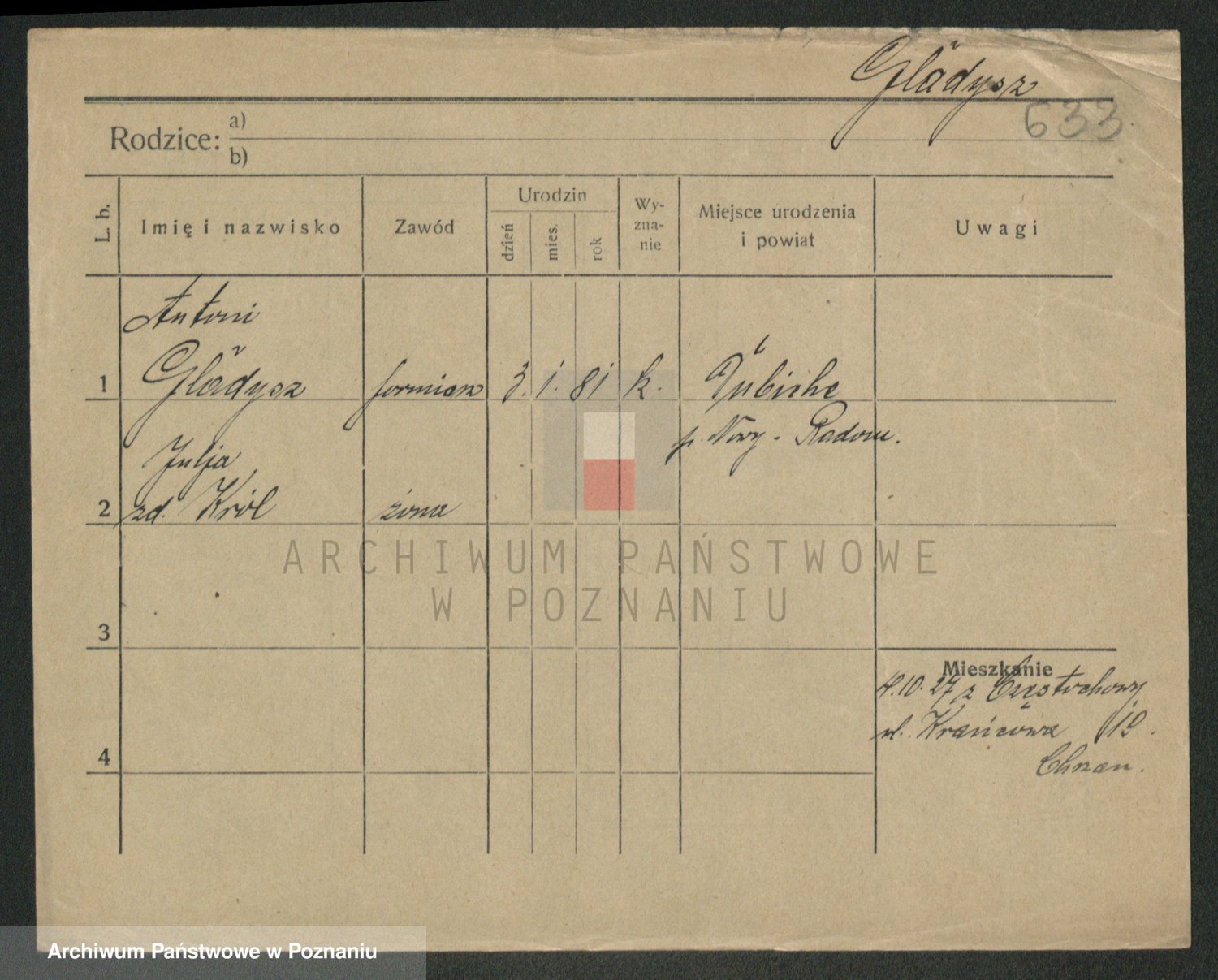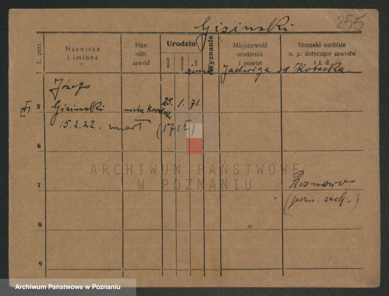 Podgląd karty osobowej dostępny jest po kliknięciu na nazwisko lub ikonkę karty. Można dokonywać powiększenia (ikony na górze) lub przechodzić między kolejnymi skanami (strzałki po bokach).