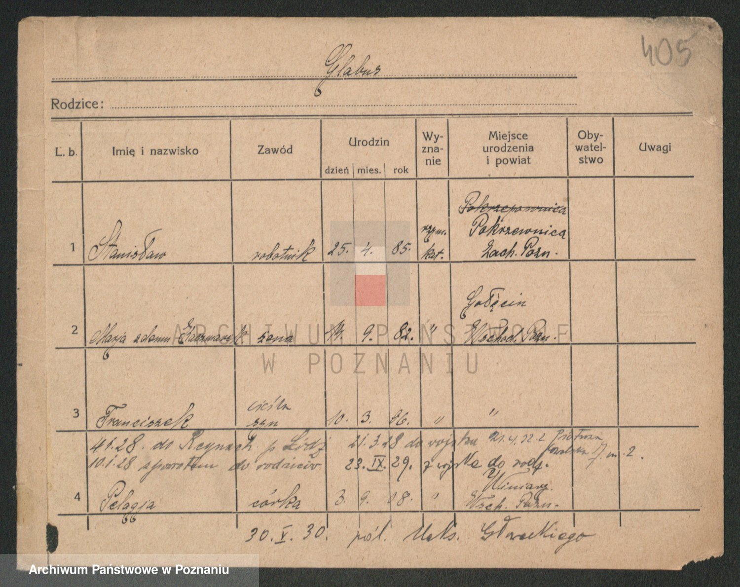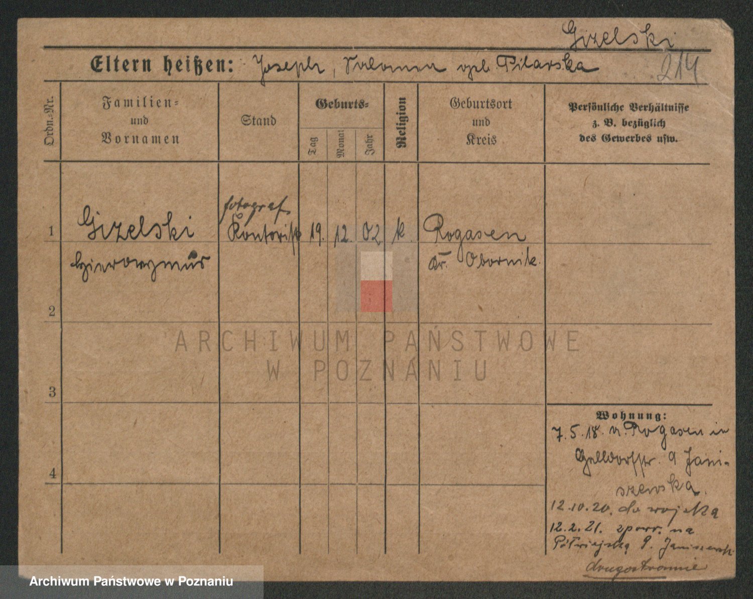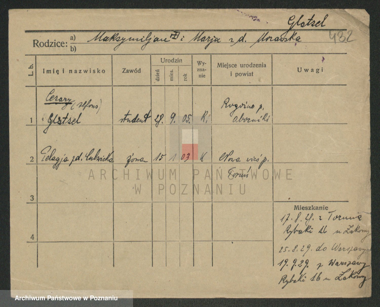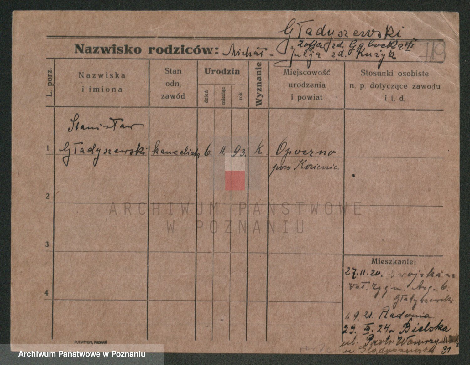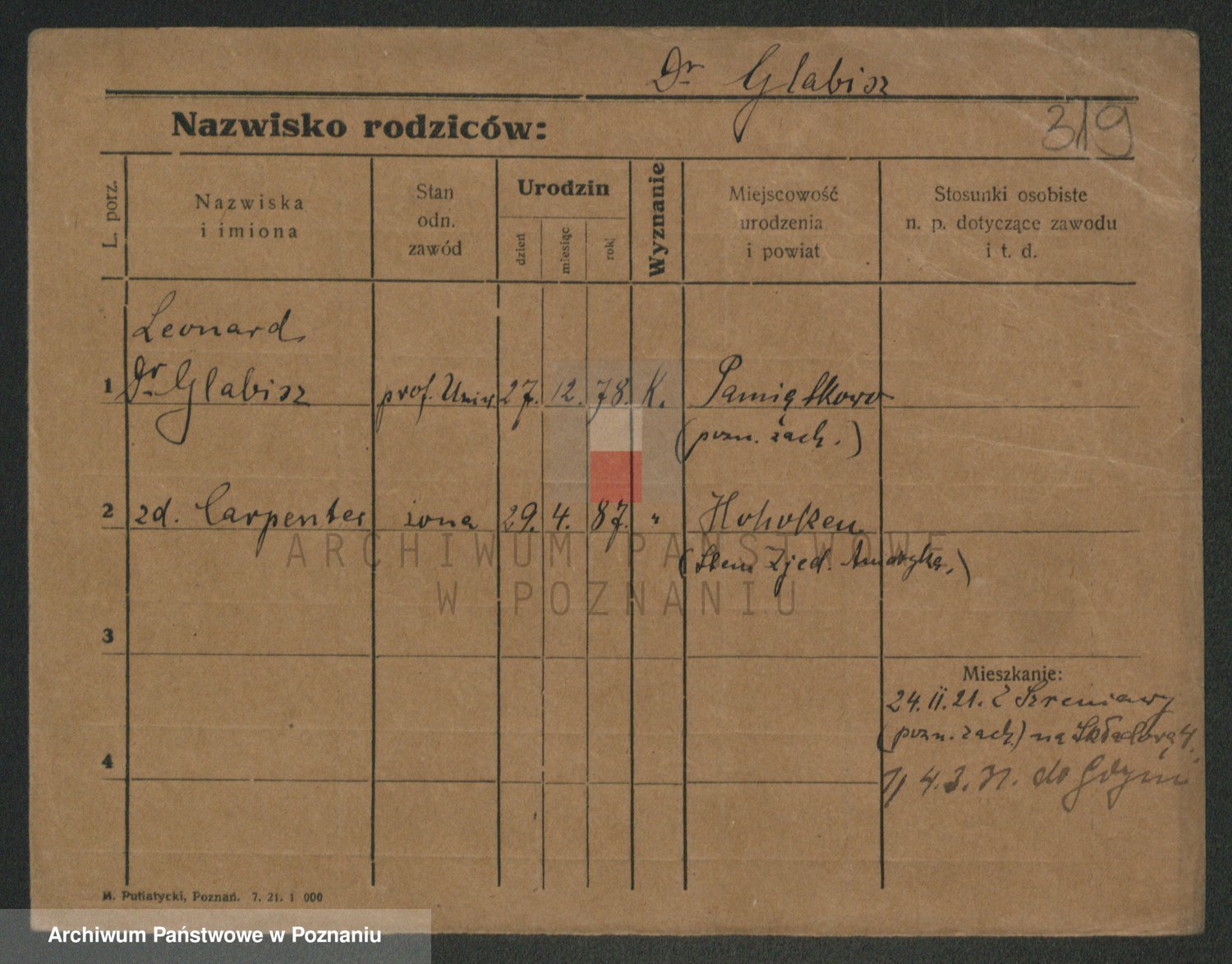 Podgląd karty osobowej dostępny jest po kliknięciu na nazwisko lub ikonkę karty. Można dokonywać powiększenia (ikony na górze) lub przechodzić między kolejnymi skanami (strzałki po bokach).
