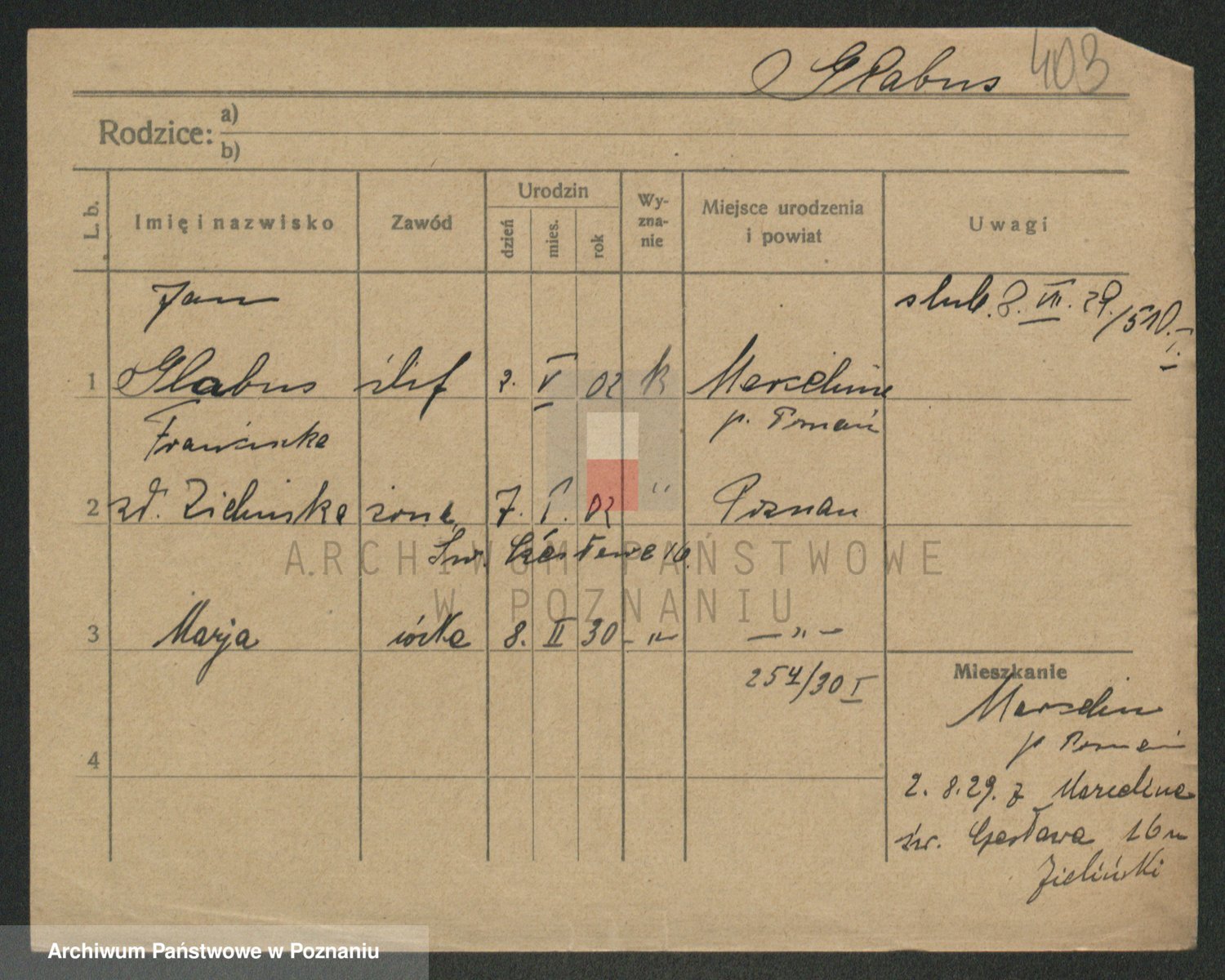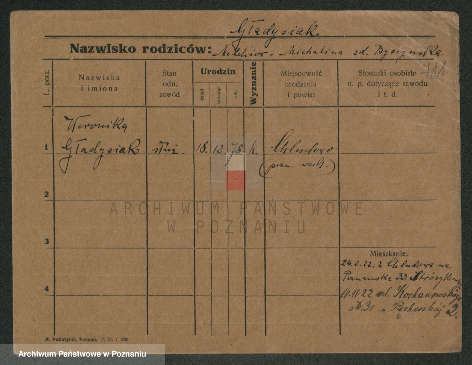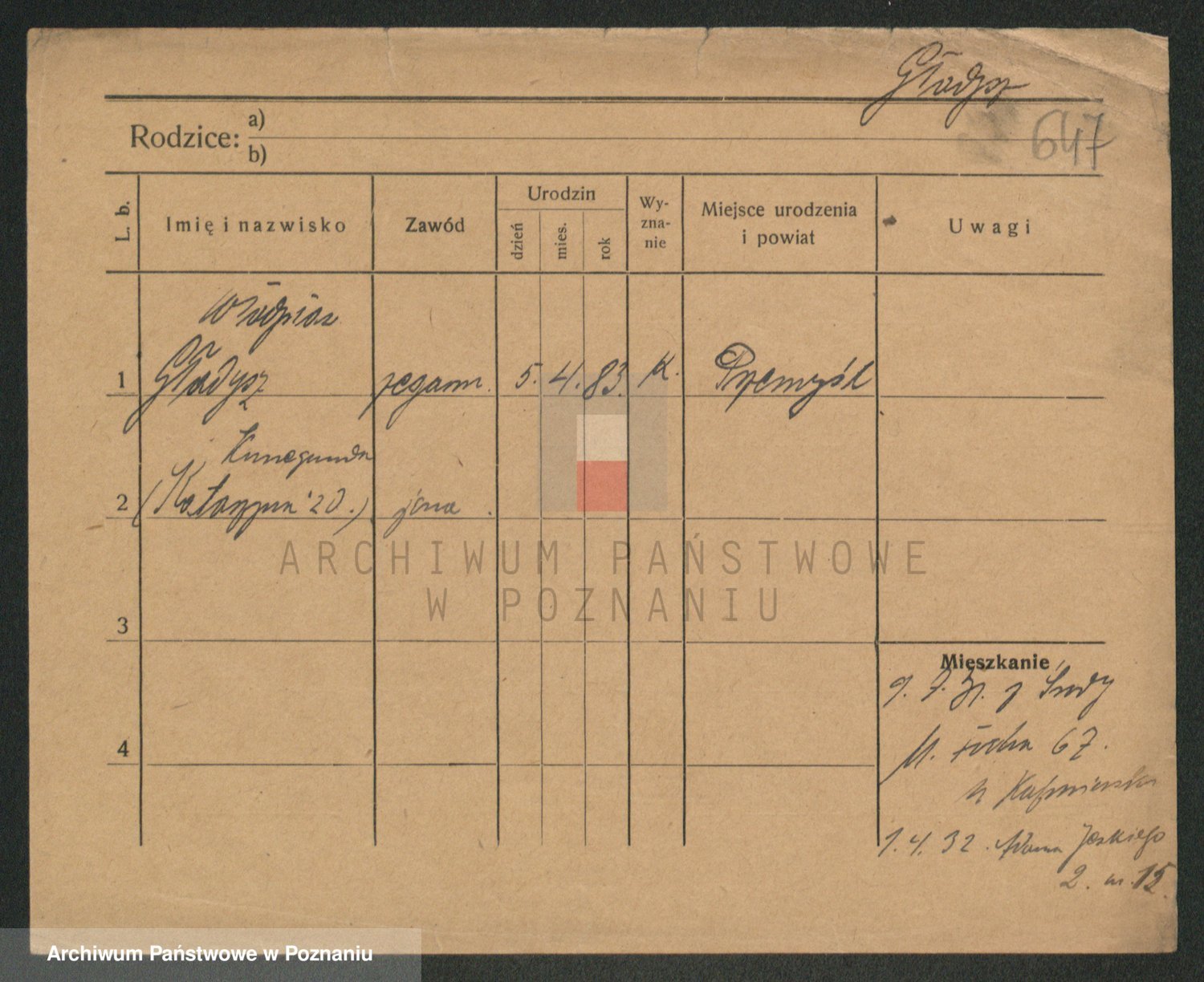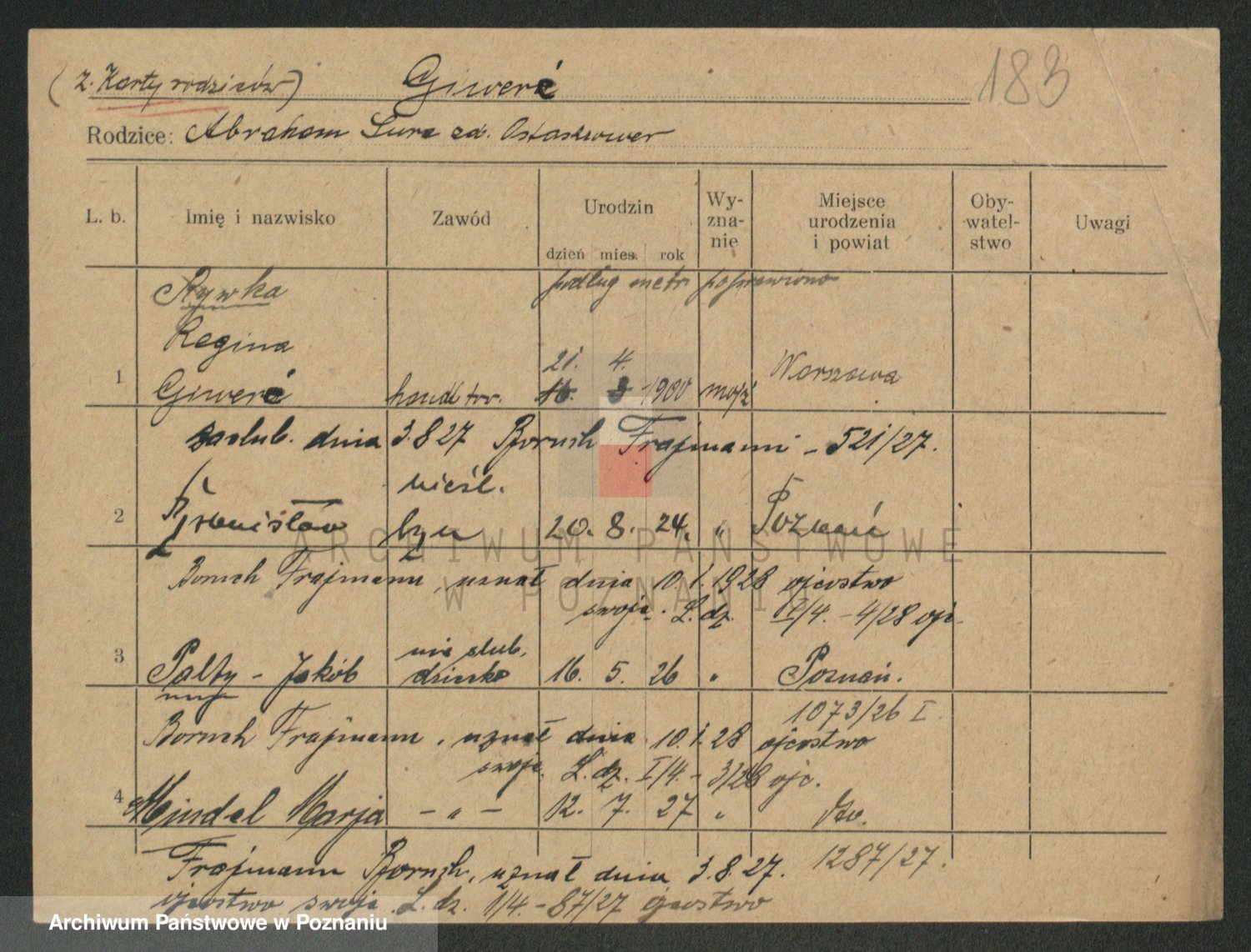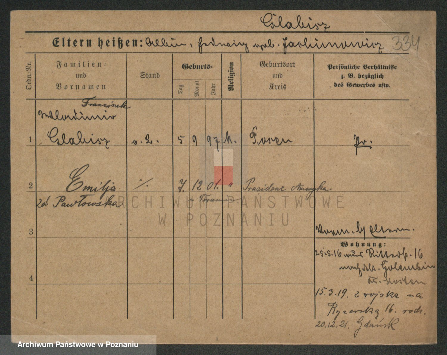 Podgląd karty osobowej dostępny jest po kliknięciu na nazwisko lub ikonkę karty. Można dokonywać powiększenia (ikony na górze) lub przechodzić między kolejnymi skanami (strzałki po bokach).