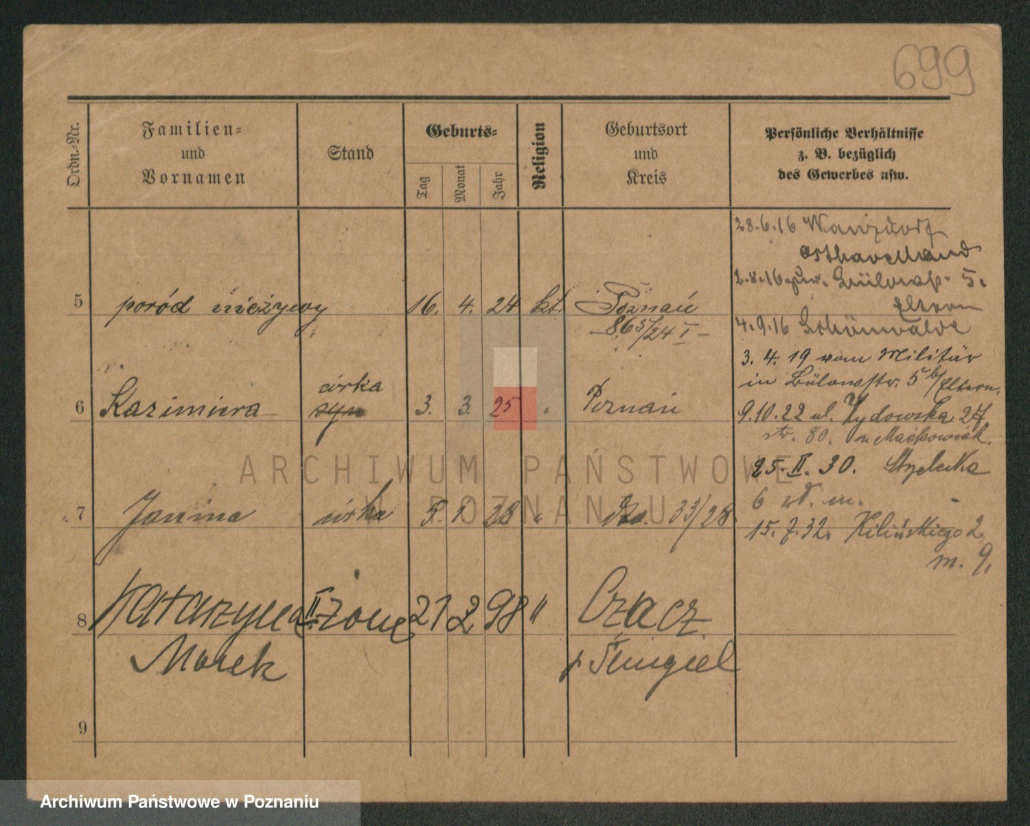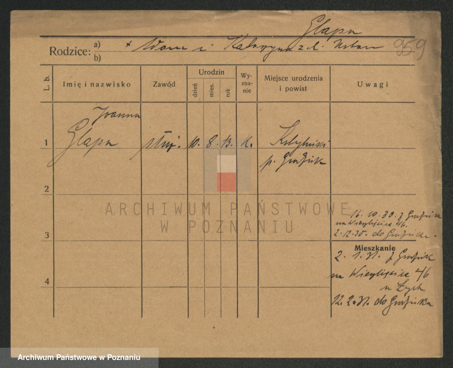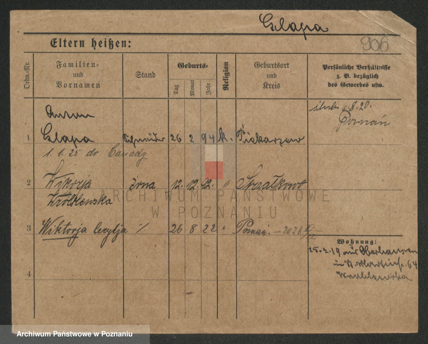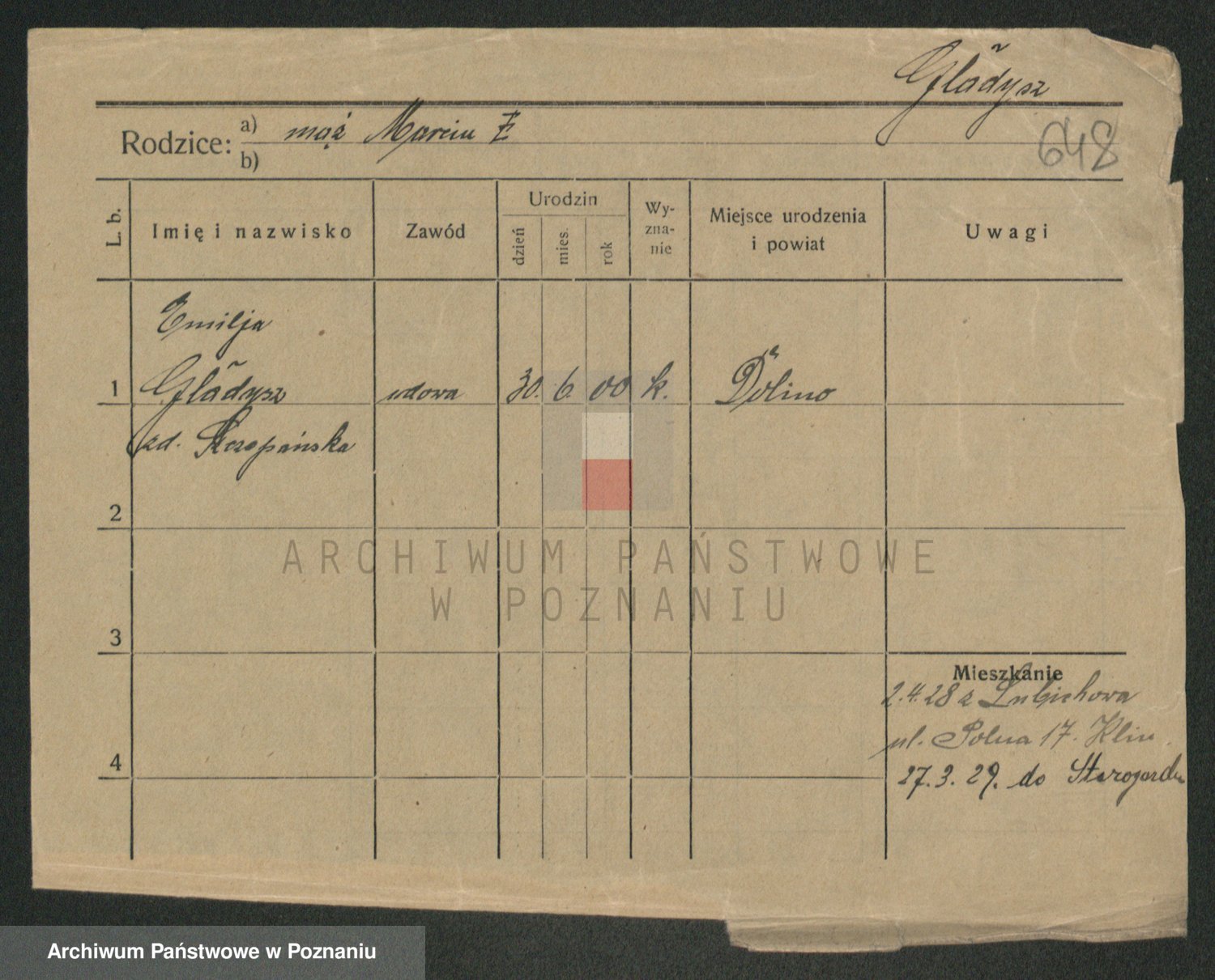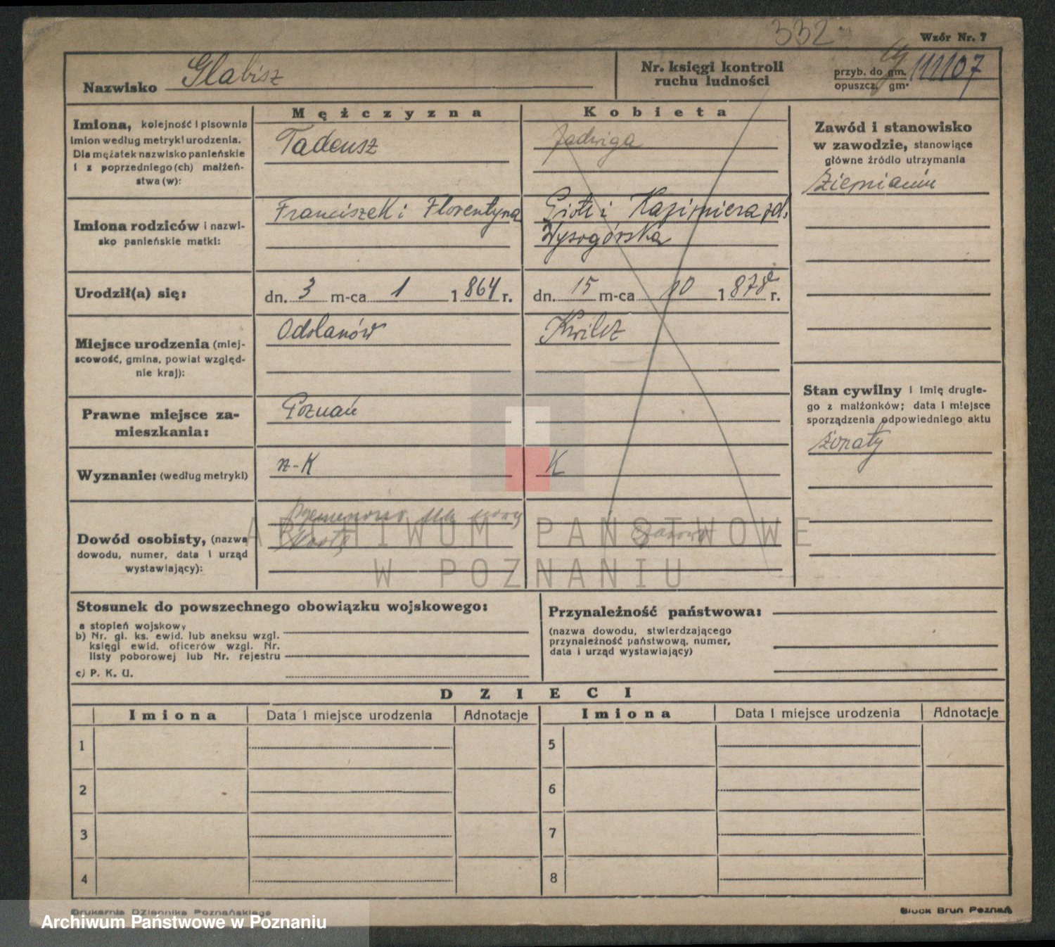Podgląd karty osobowej dostępny jest po kliknięciu na nazwisko lub ikonkę karty. Można dokonywać powiększenia (ikony na górze) lub przechodzić między kolejnymi skanami (strzałki po bokach).