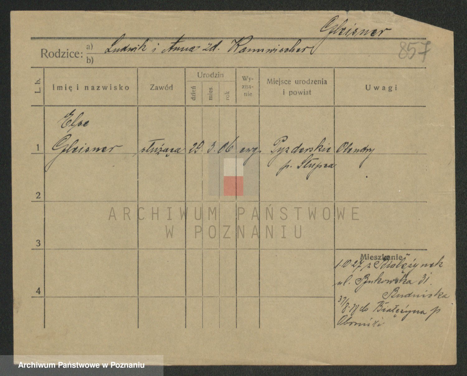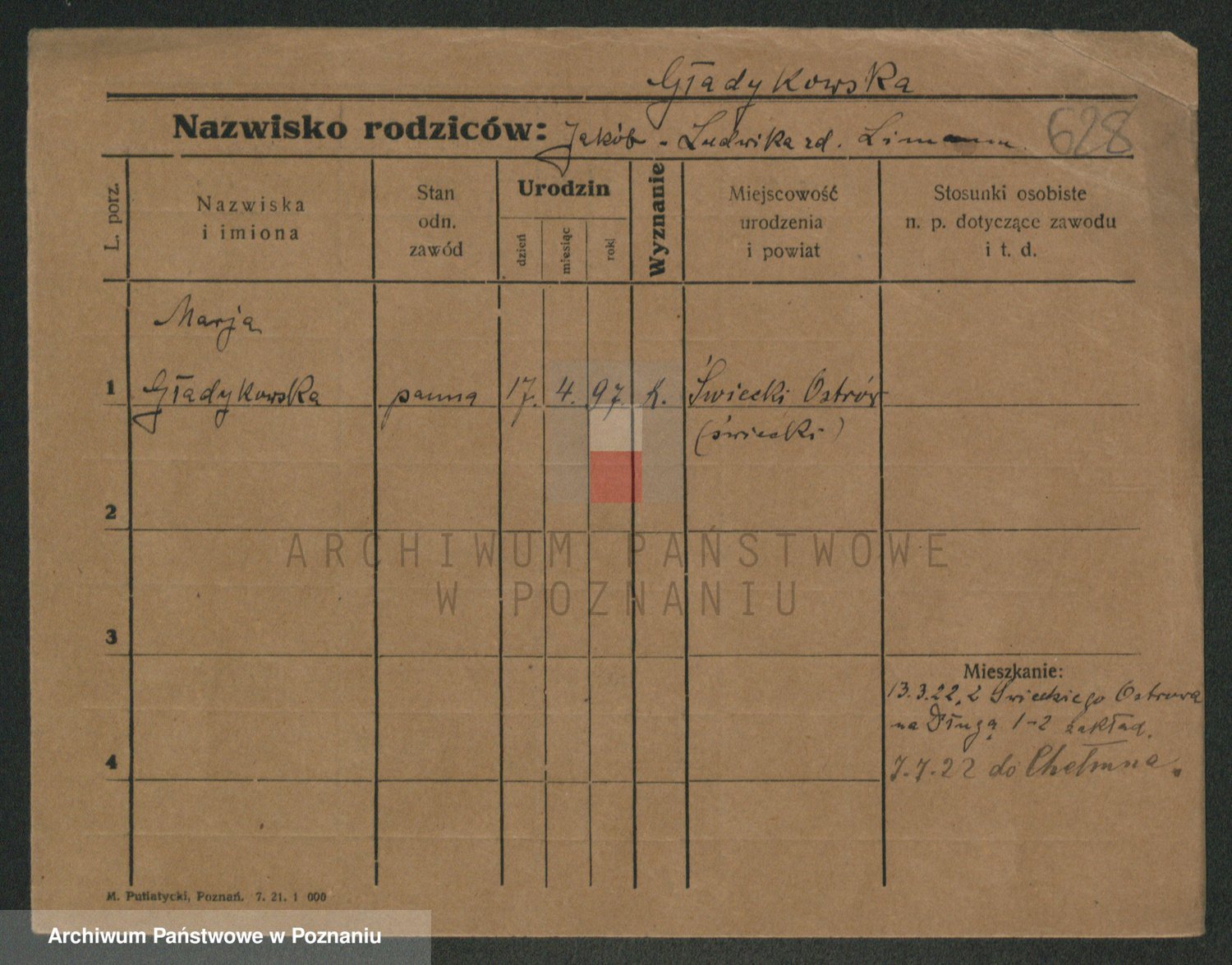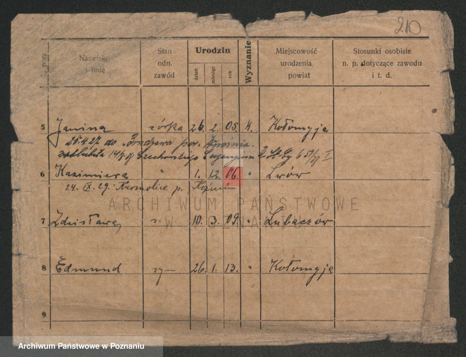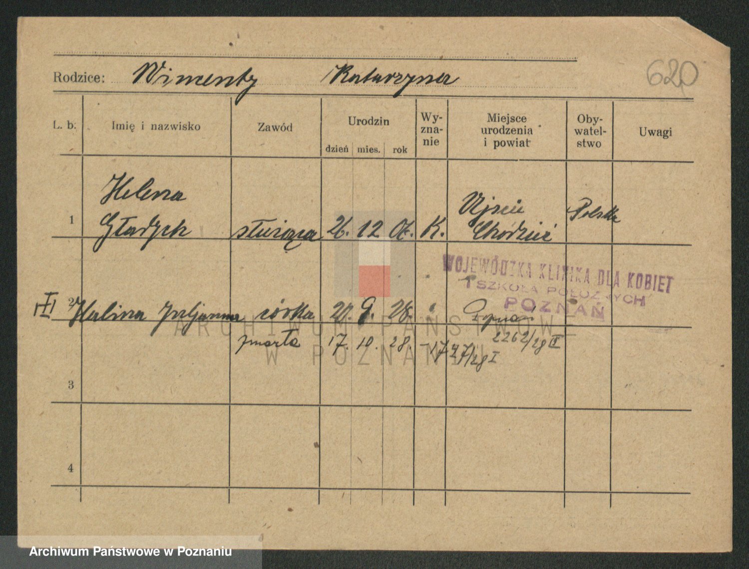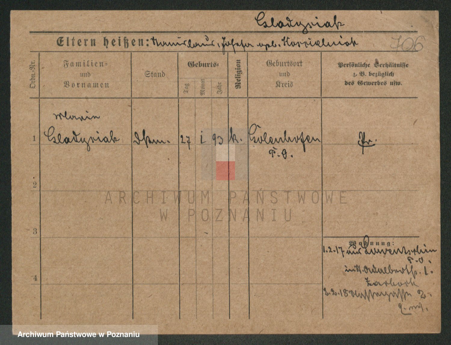 Podgląd karty osobowej dostępny jest po kliknięciu na nazwisko lub ikonkę karty. Można dokonywać powiększenia (ikony na górze) lub przechodzić między kolejnymi skanami (strzałki po bokach).