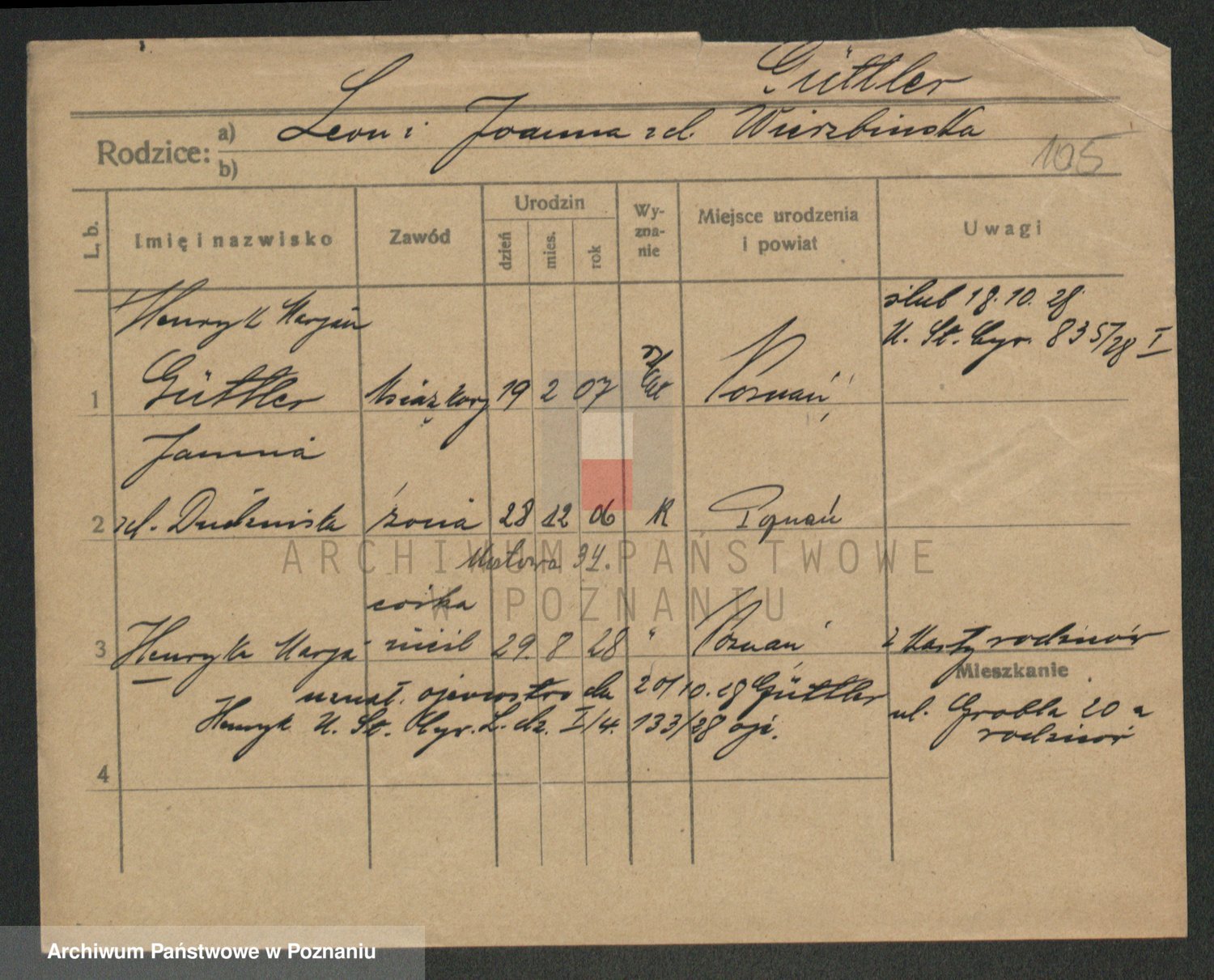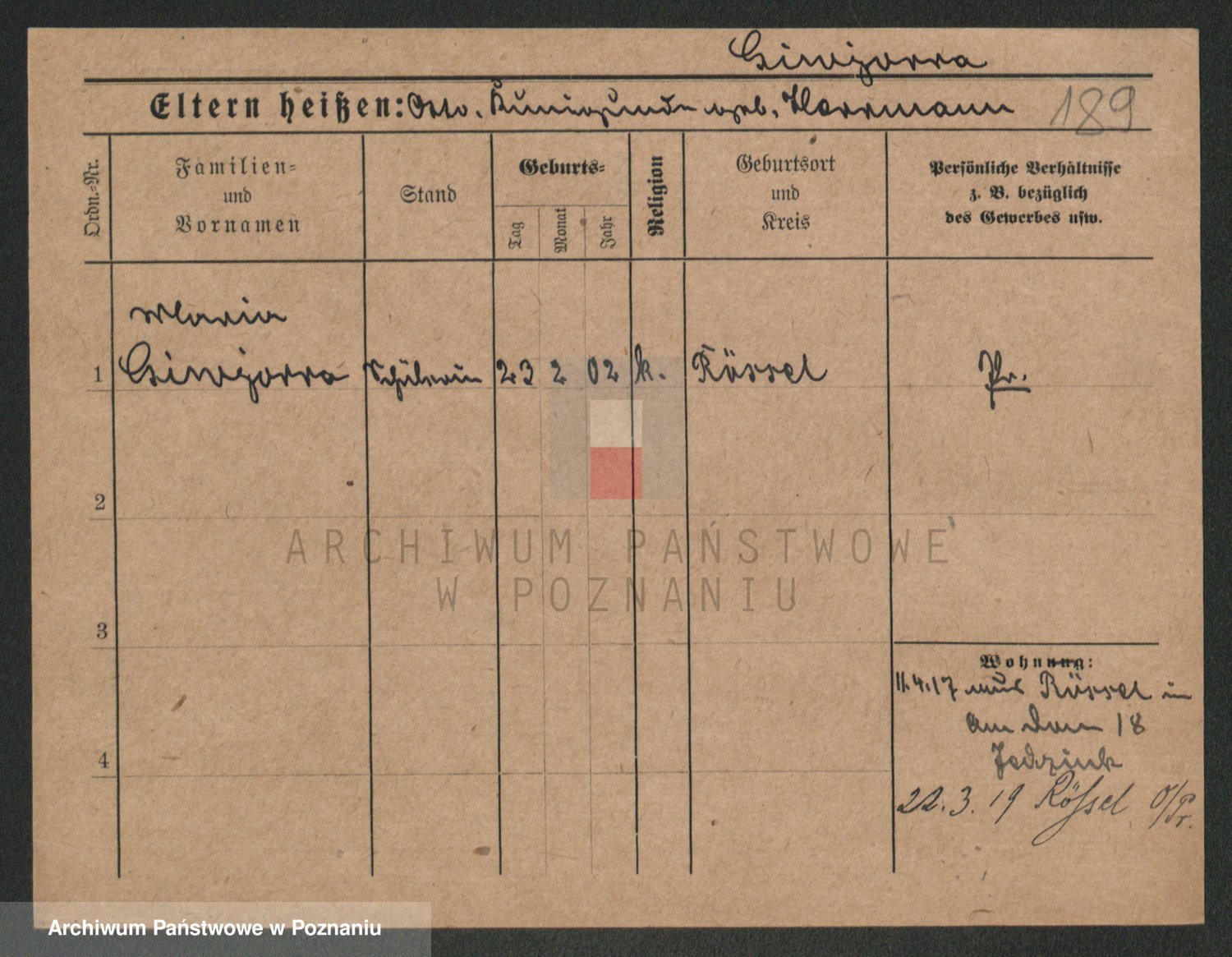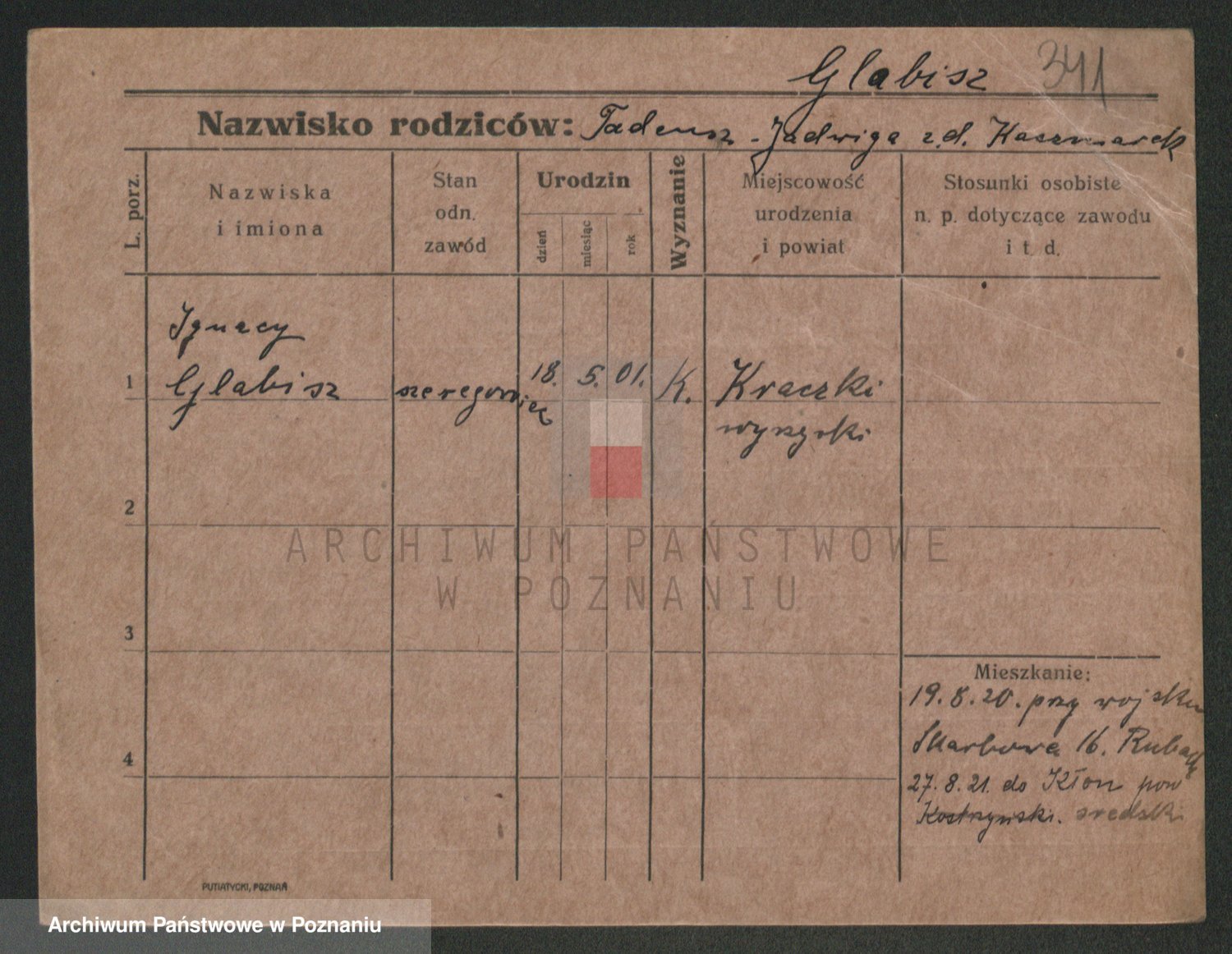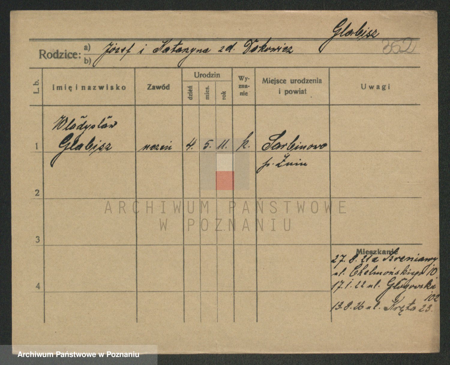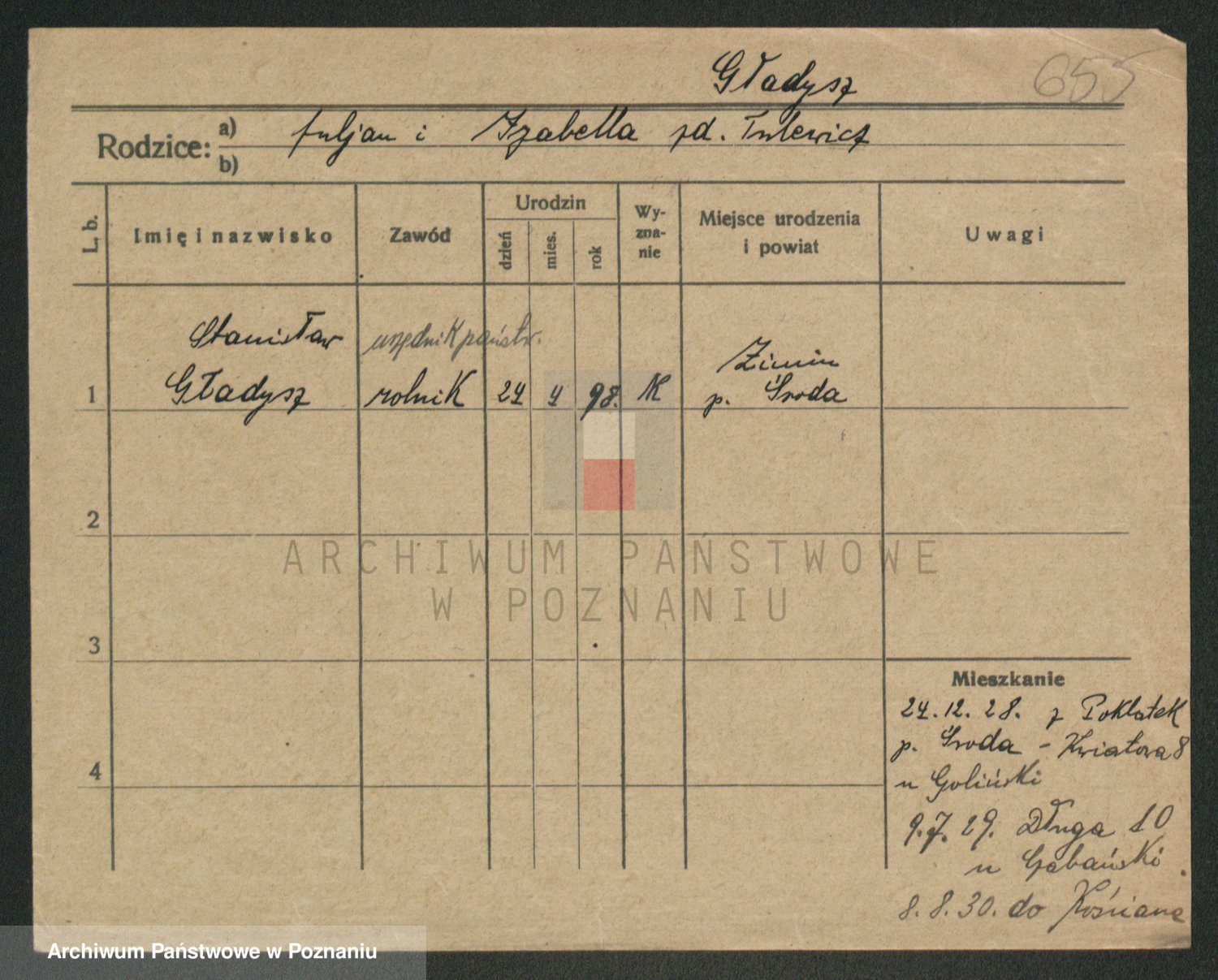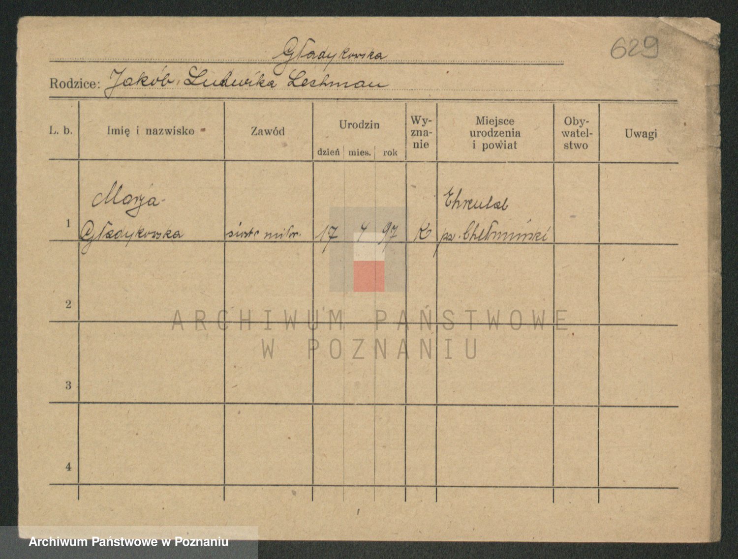Podgląd karty osobowej dostępny jest po kliknięciu na nazwisko lub ikonkę karty. Można dokonywać powiększenia (ikony na górze) lub przechodzić między kolejnymi skanami (strzałki po bokach).