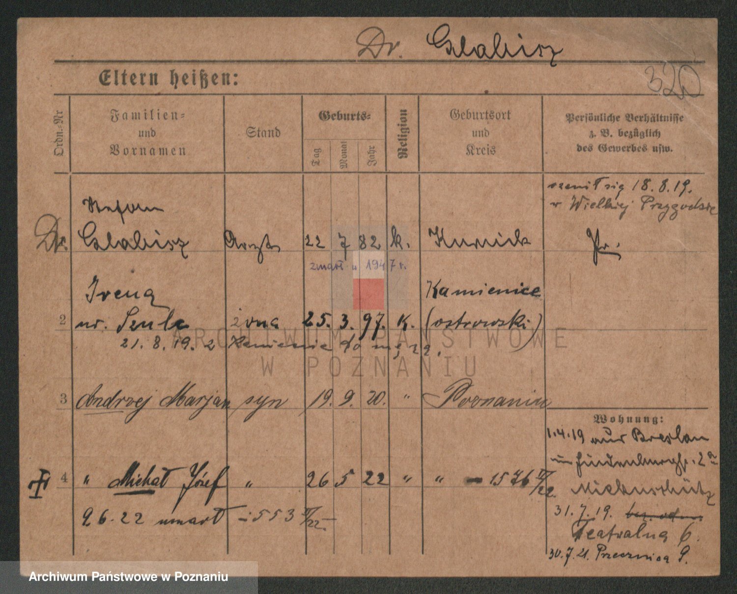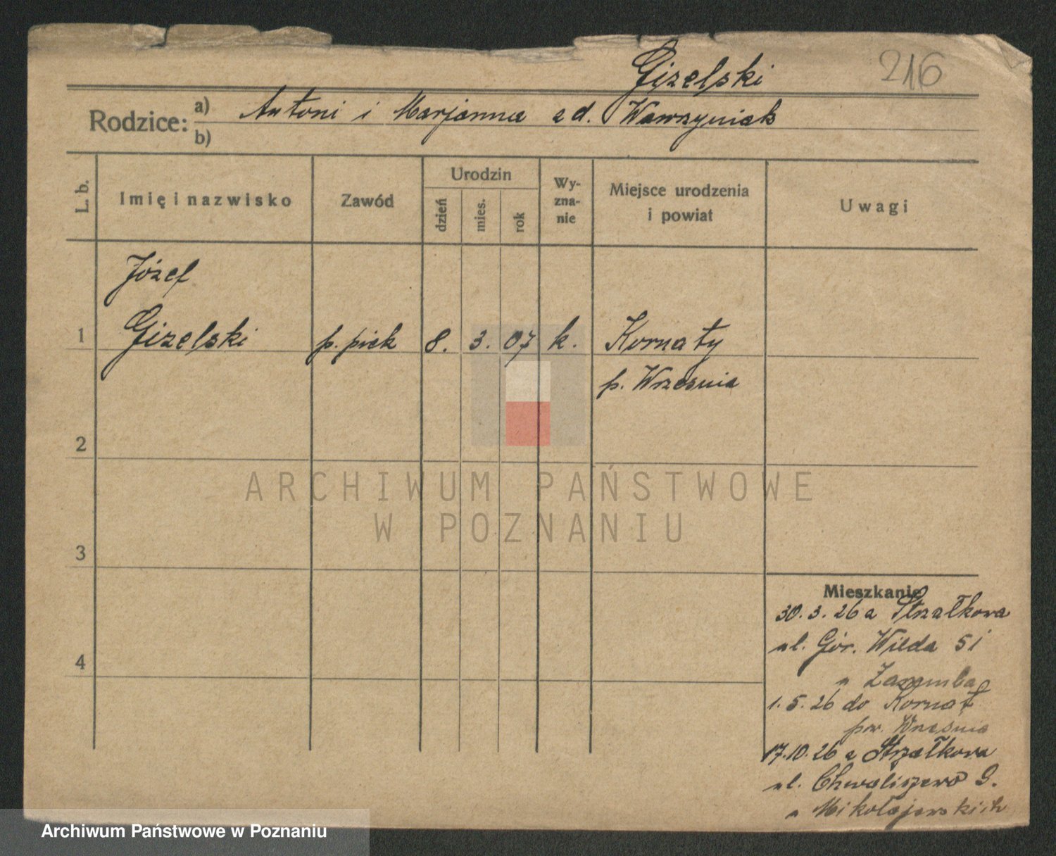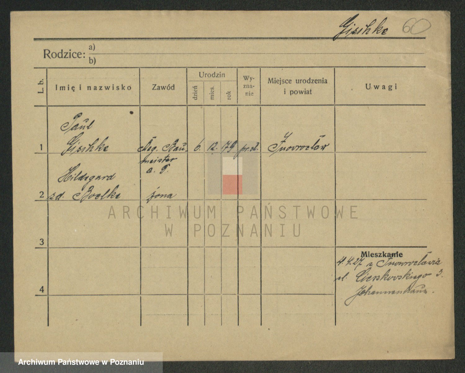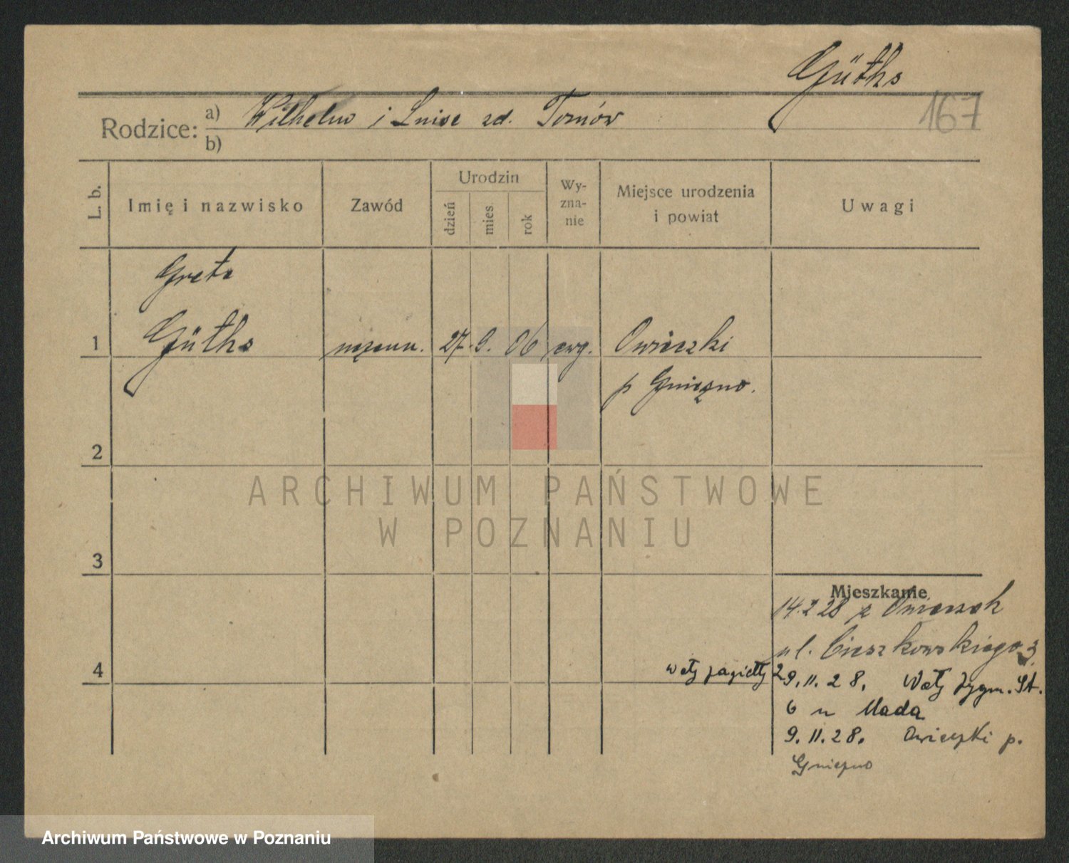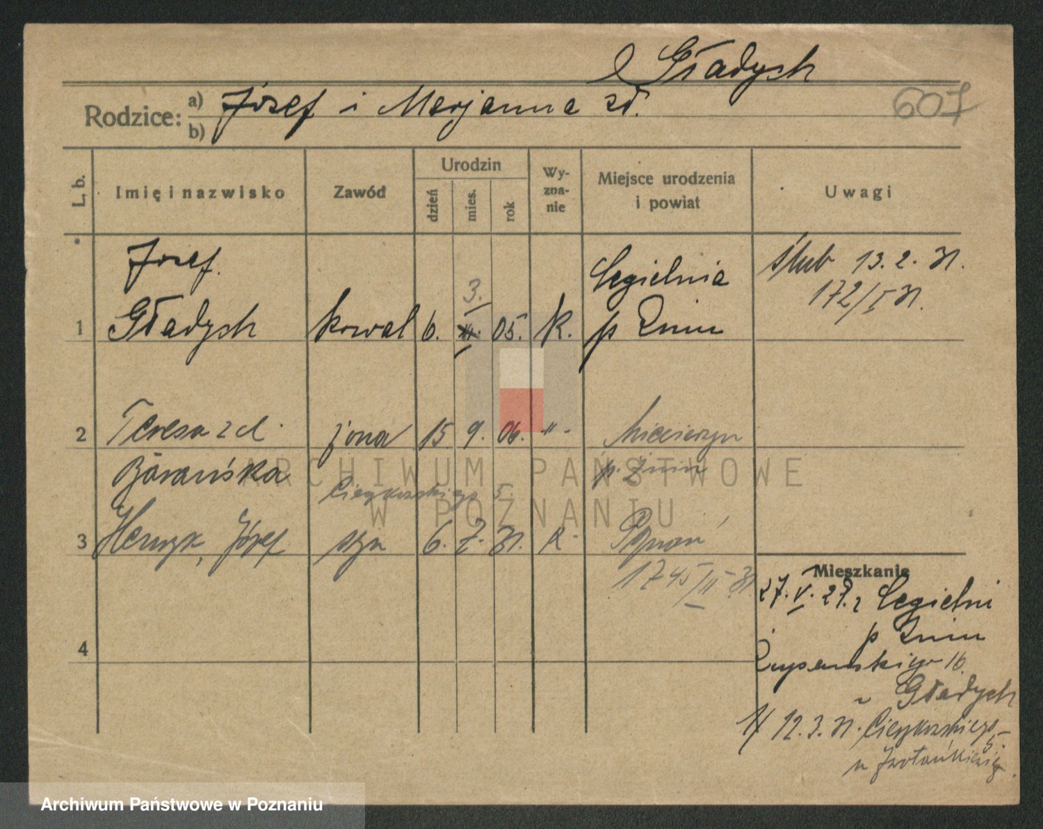 Podgląd karty osobowej dostępny jest po kliknięciu na nazwisko lub ikonkę karty. Można dokonywać powiększenia (ikony na górze) lub przechodzić między kolejnymi skanami (strzałki po bokach).