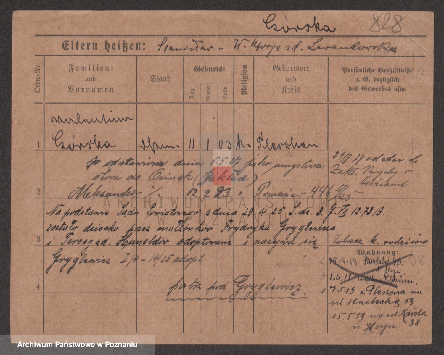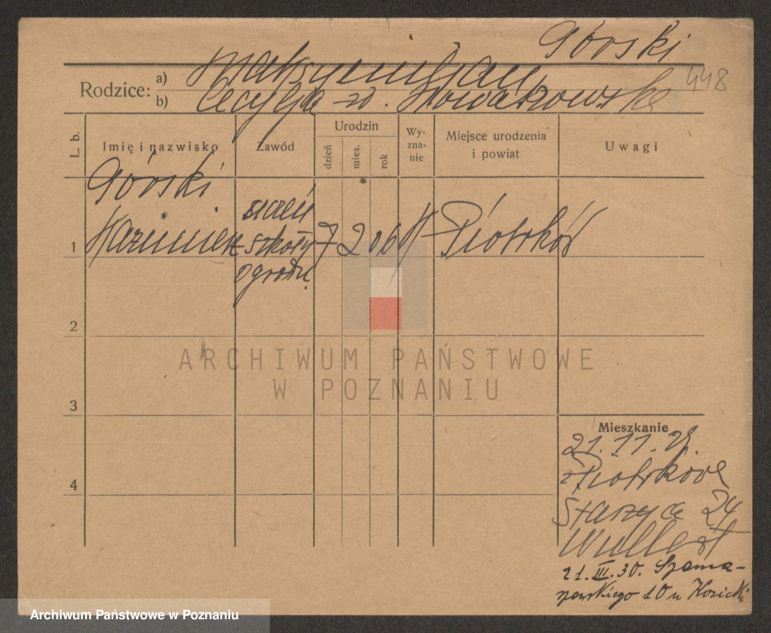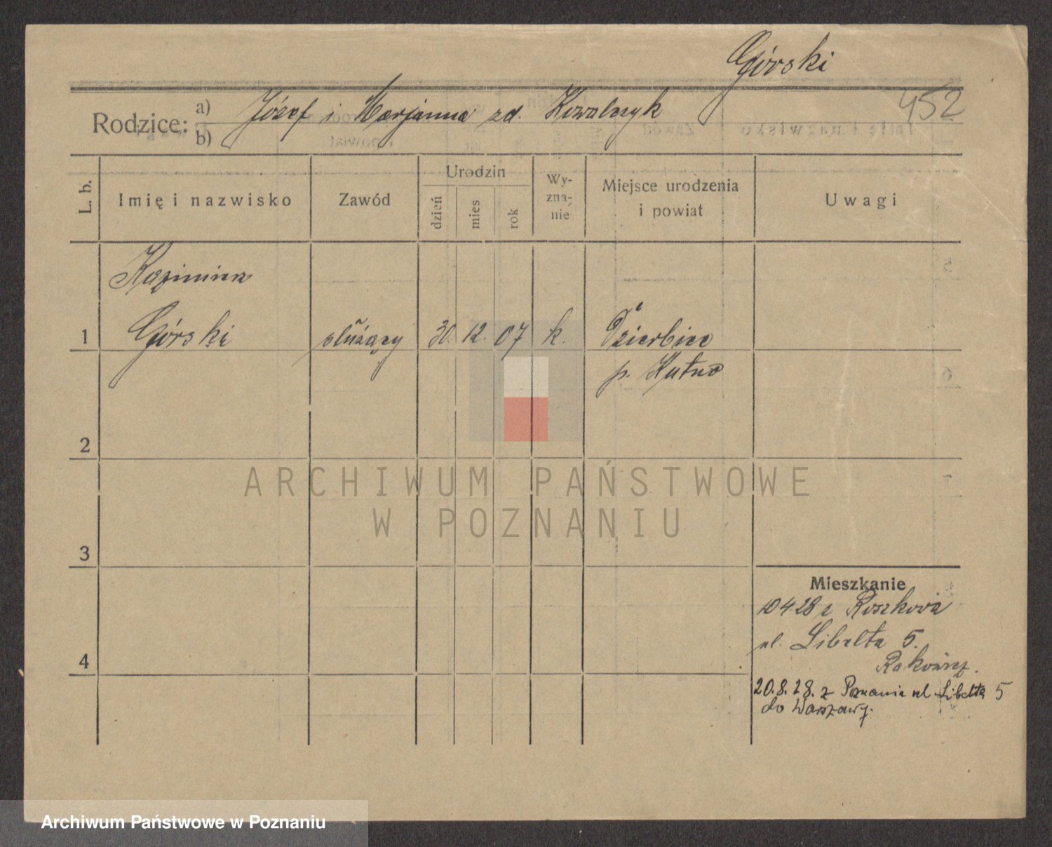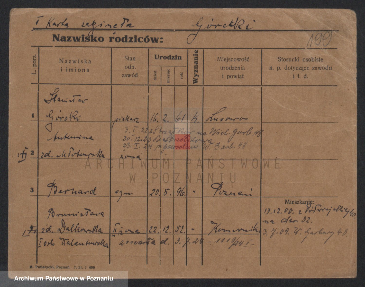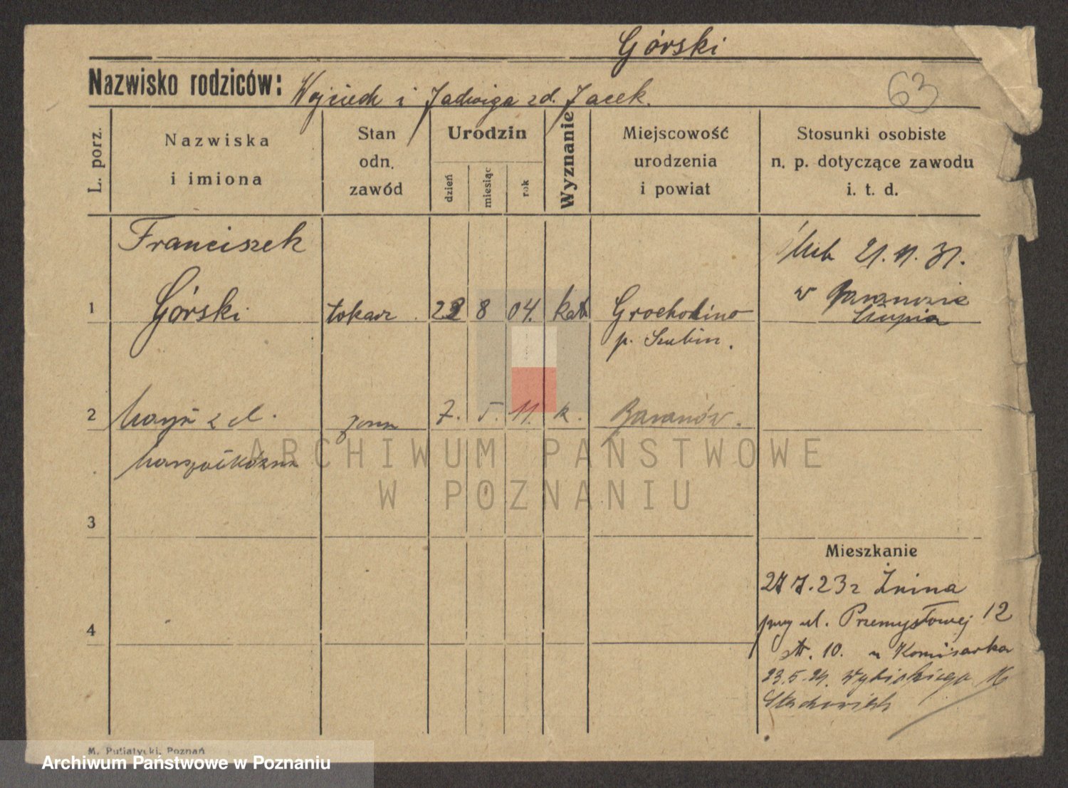 Podgląd karty osobowej dostępny jest po kliknięciu na nazwisko lub ikonkę karty. Można dokonywać powiększenia (ikony na górze) lub przechodzić między kolejnymi skanami (strzałki po bokach).