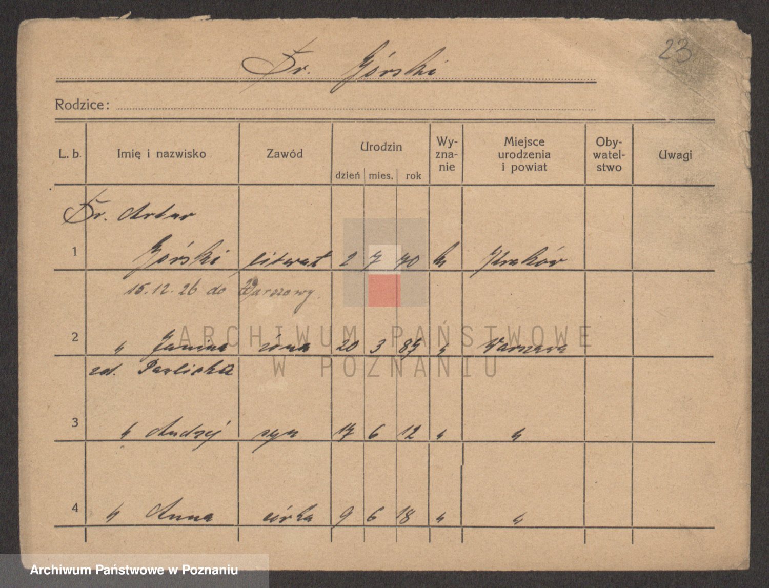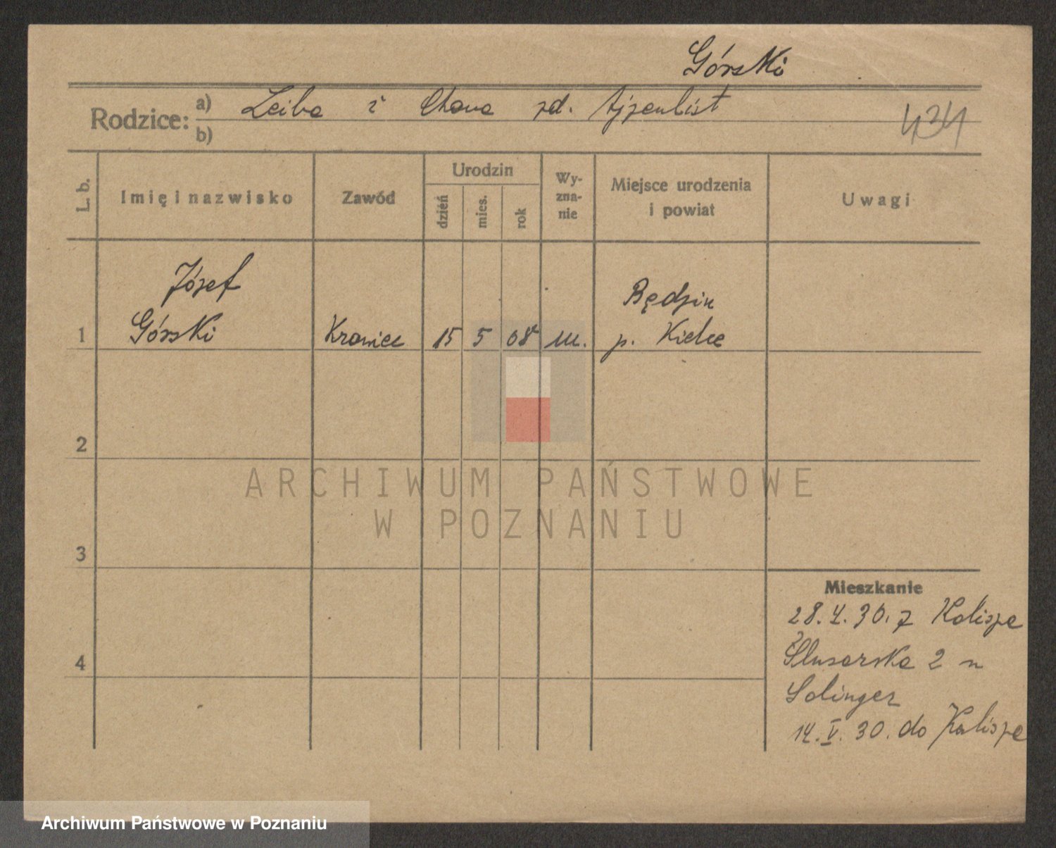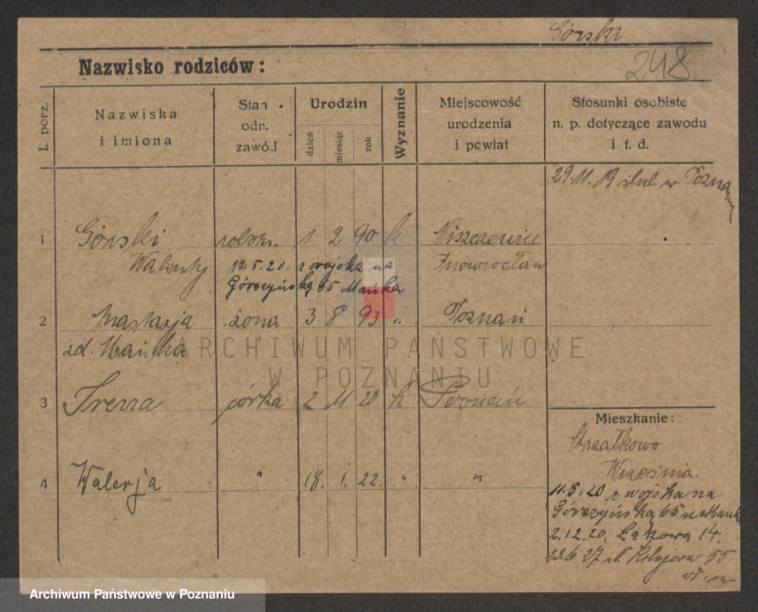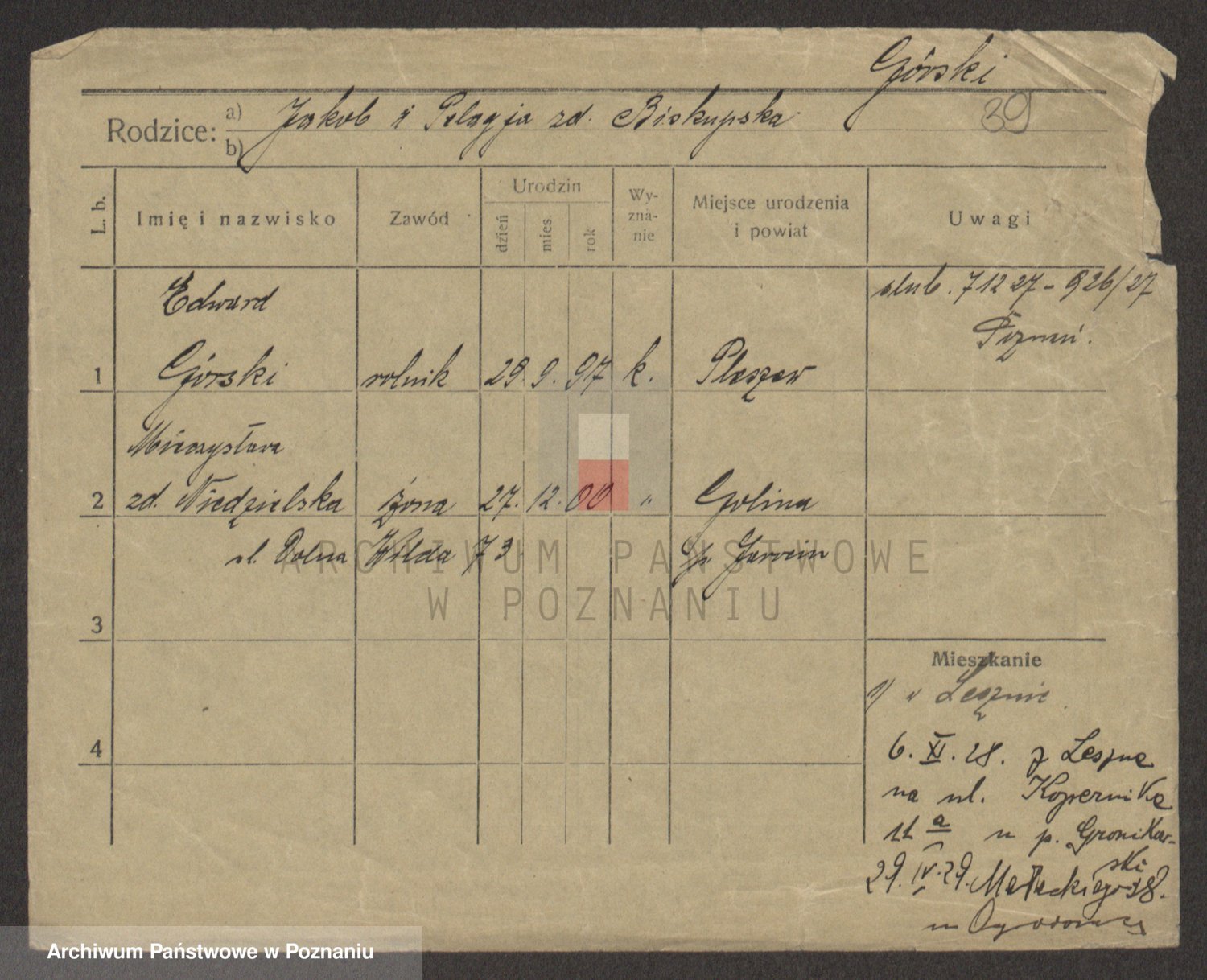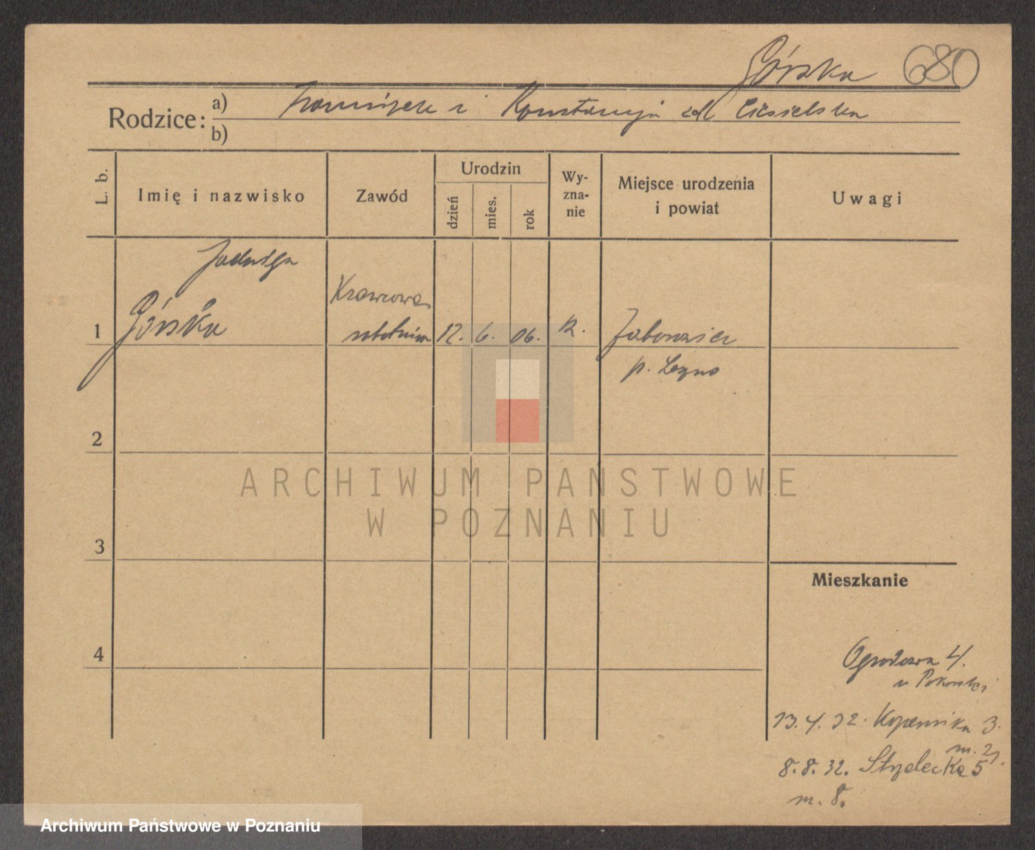 Podgląd karty osobowej dostępny jest po kliknięciu na nazwisko lub ikonkę karty. Można dokonywać powiększenia (ikony na górze) lub przechodzić między kolejnymi skanami (strzałki po bokach).