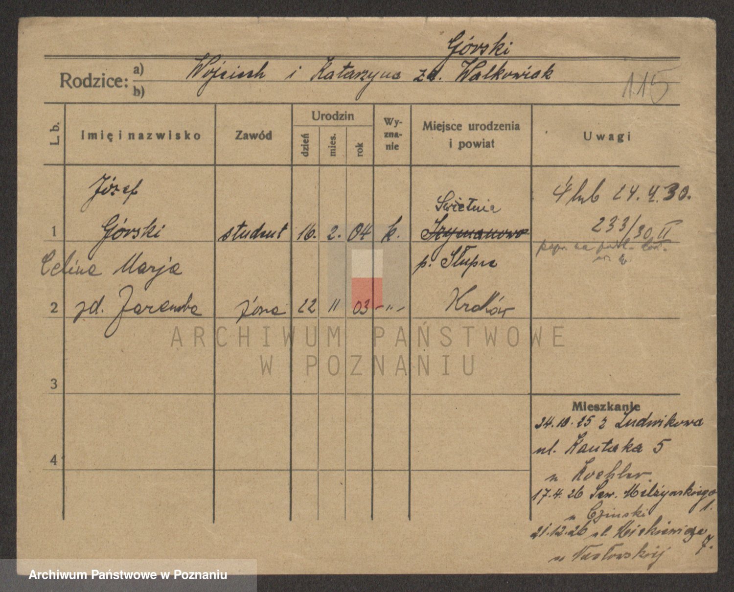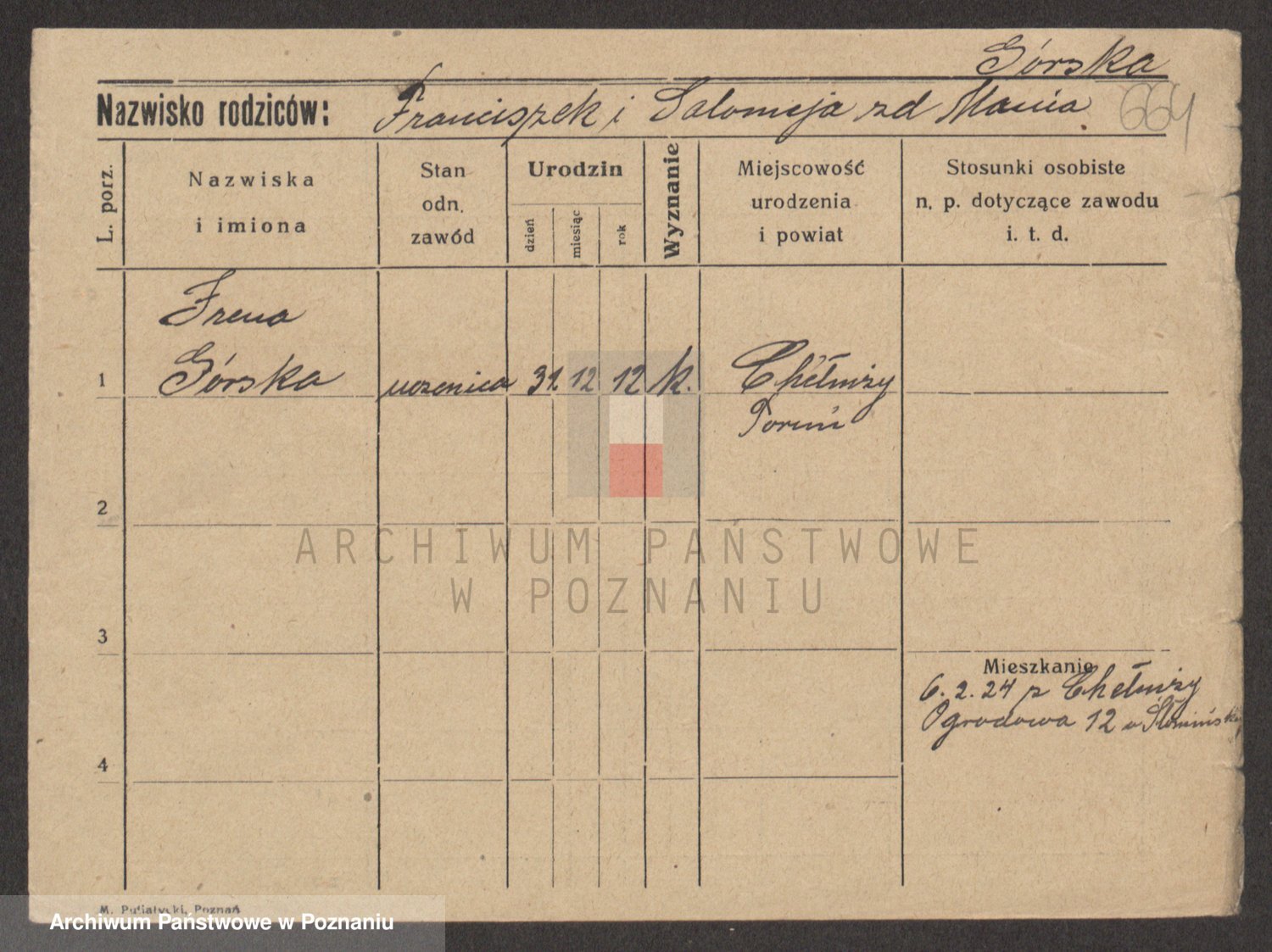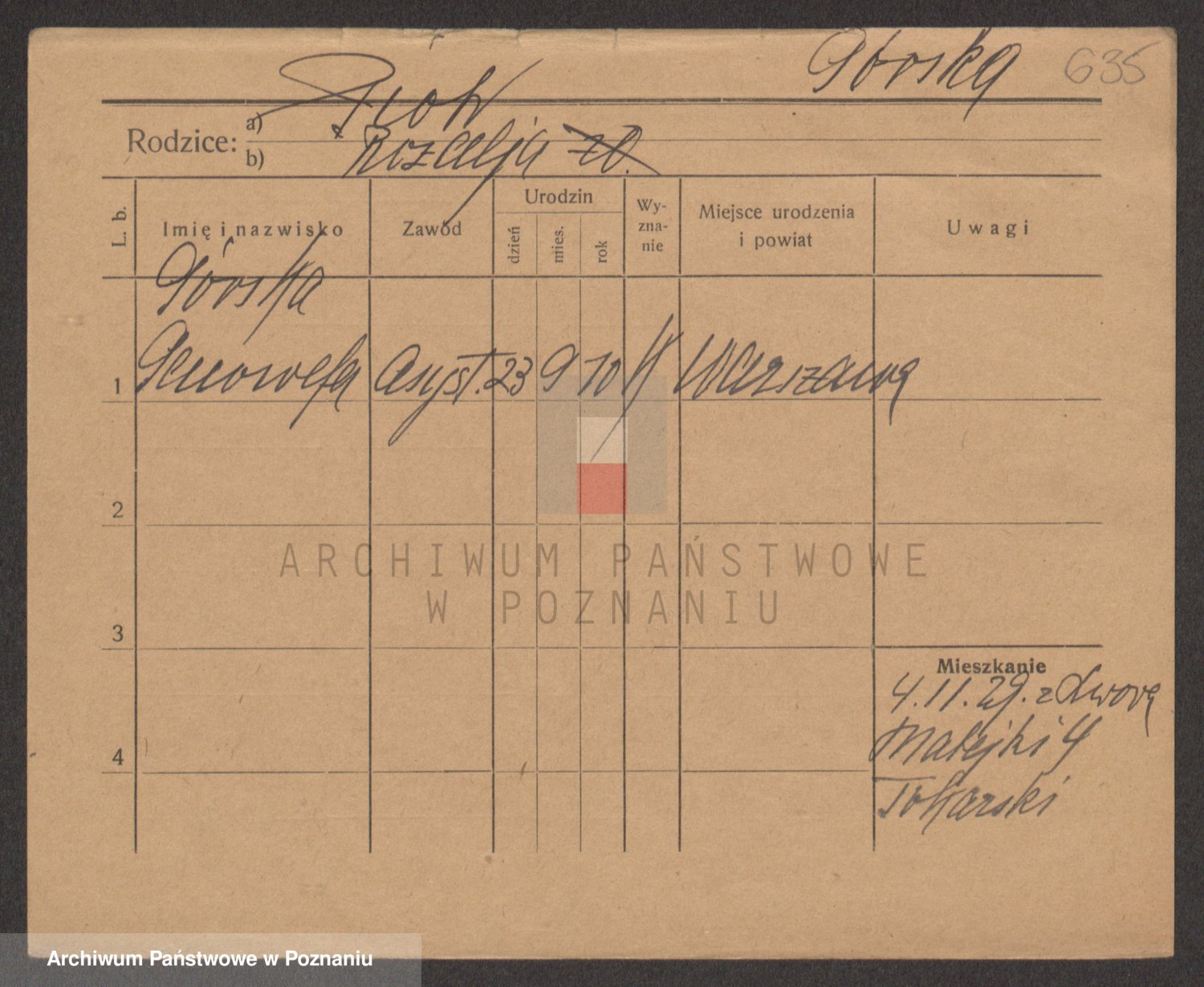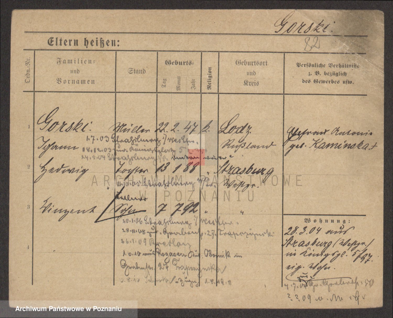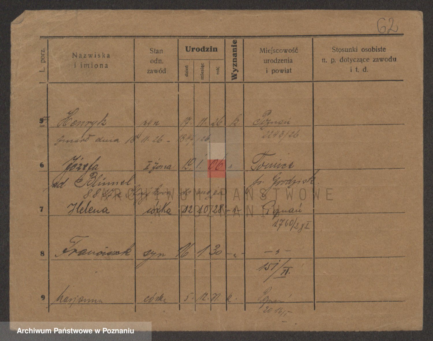 Podgląd karty osobowej dostępny jest po kliknięciu na nazwisko lub ikonkę karty. Można dokonywać powiększenia (ikony na górze) lub przechodzić między kolejnymi skanami (strzałki po bokach).