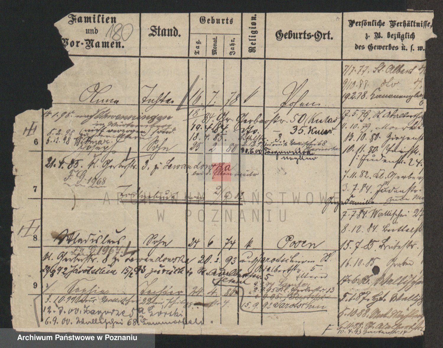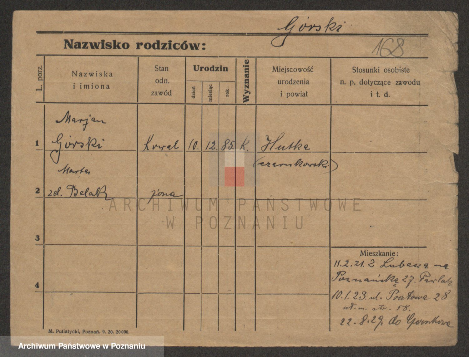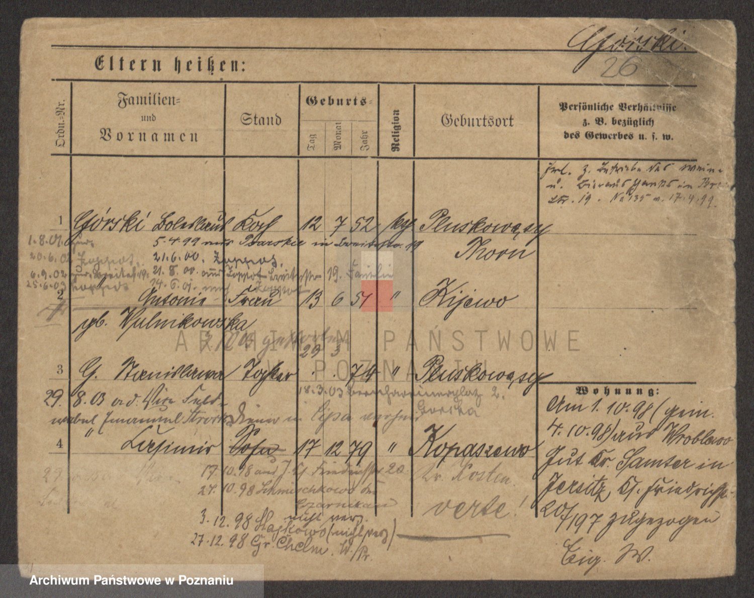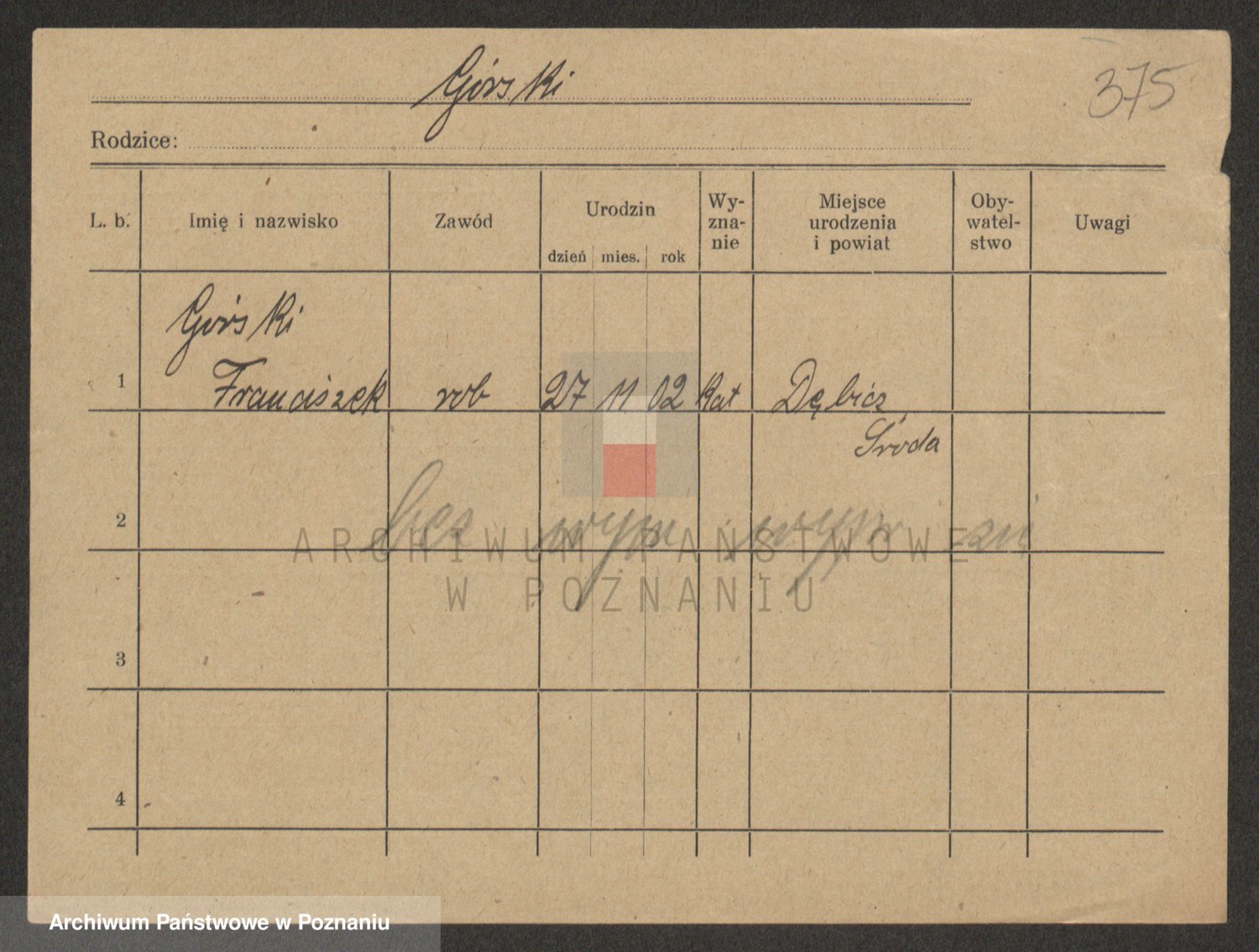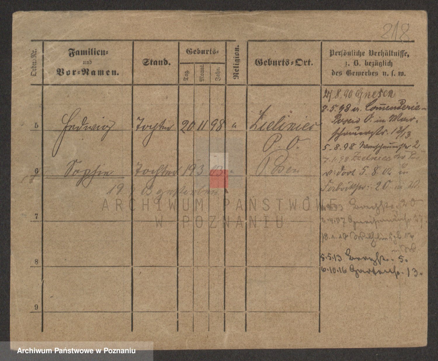 Podgląd karty osobowej dostępny jest po kliknięciu na nazwisko lub ikonkę karty. Można dokonywać powiększenia (ikony na górze) lub przechodzić między kolejnymi skanami (strzałki po bokach).