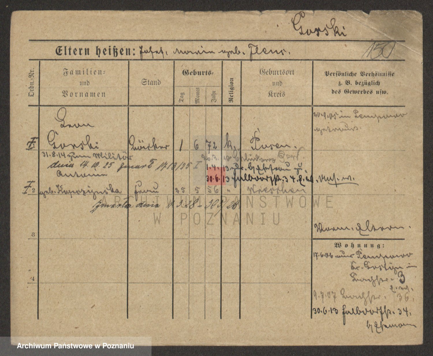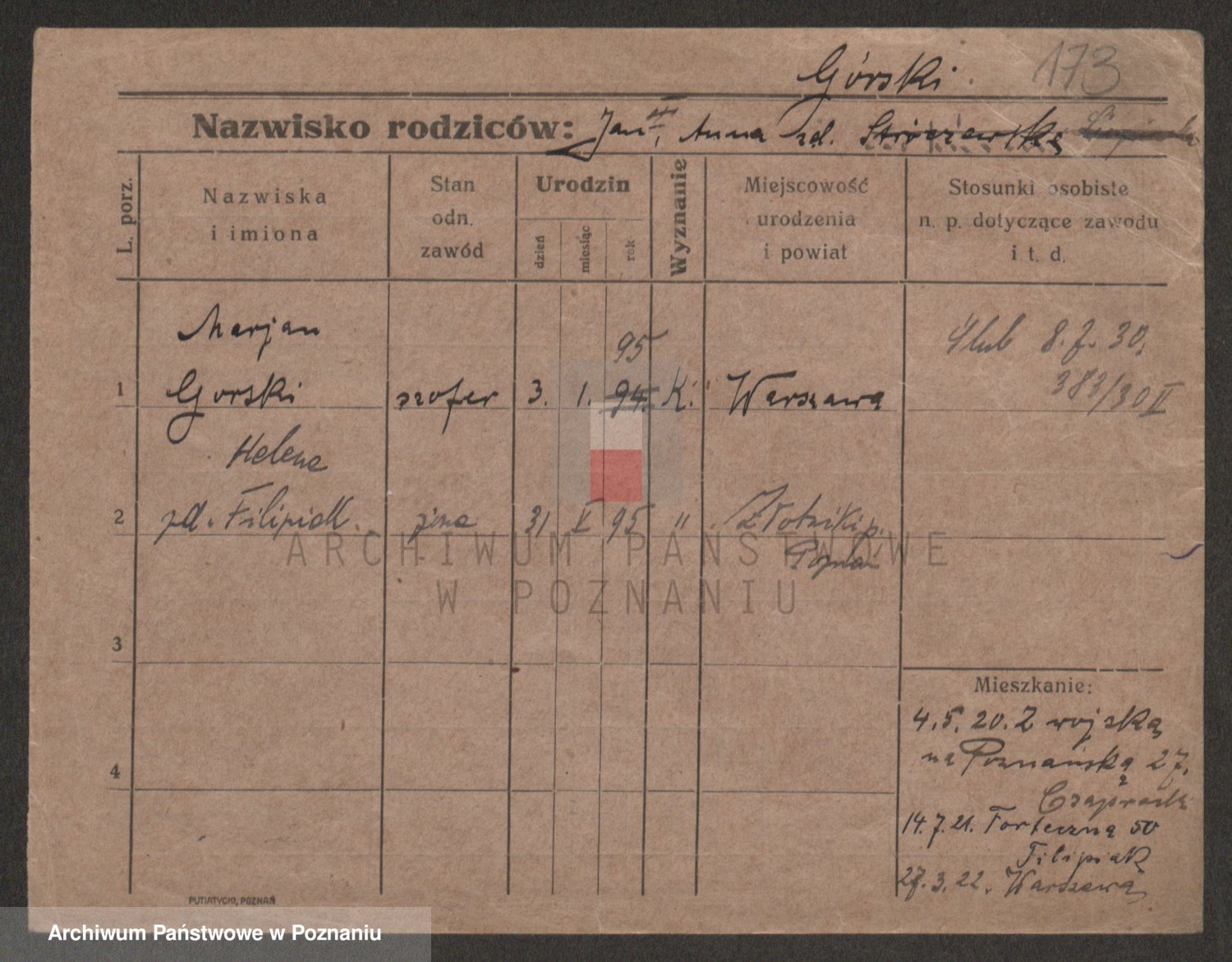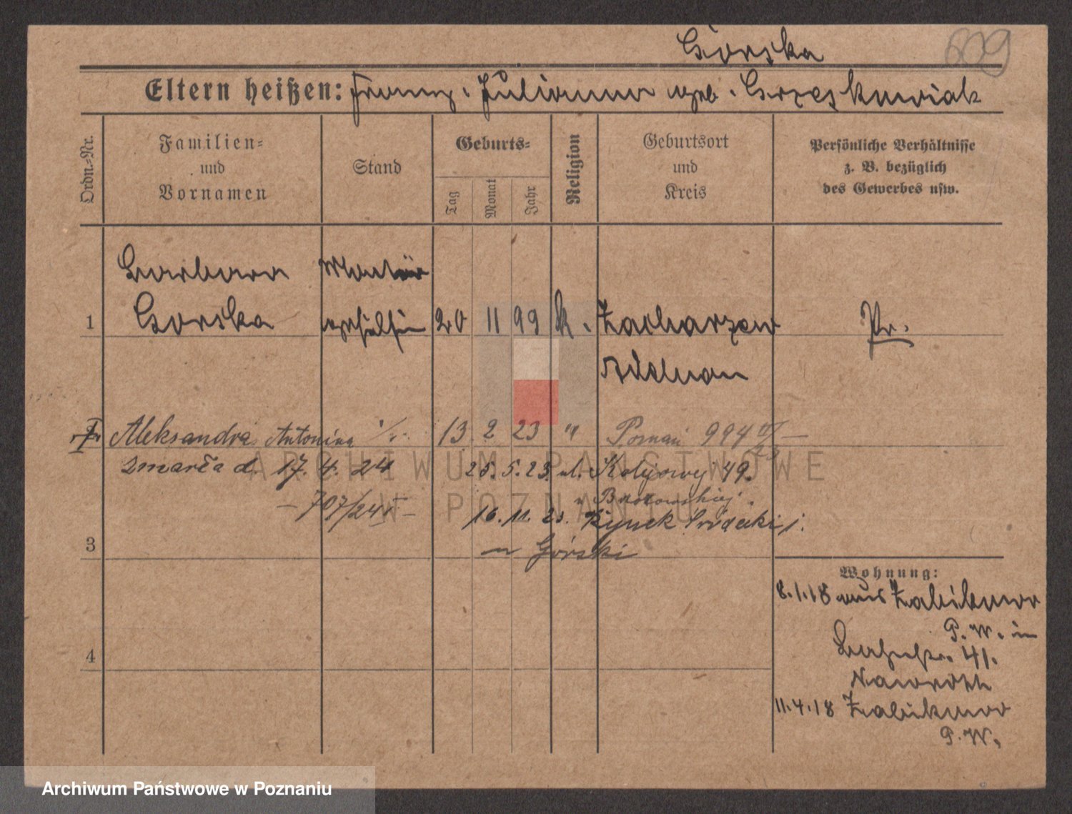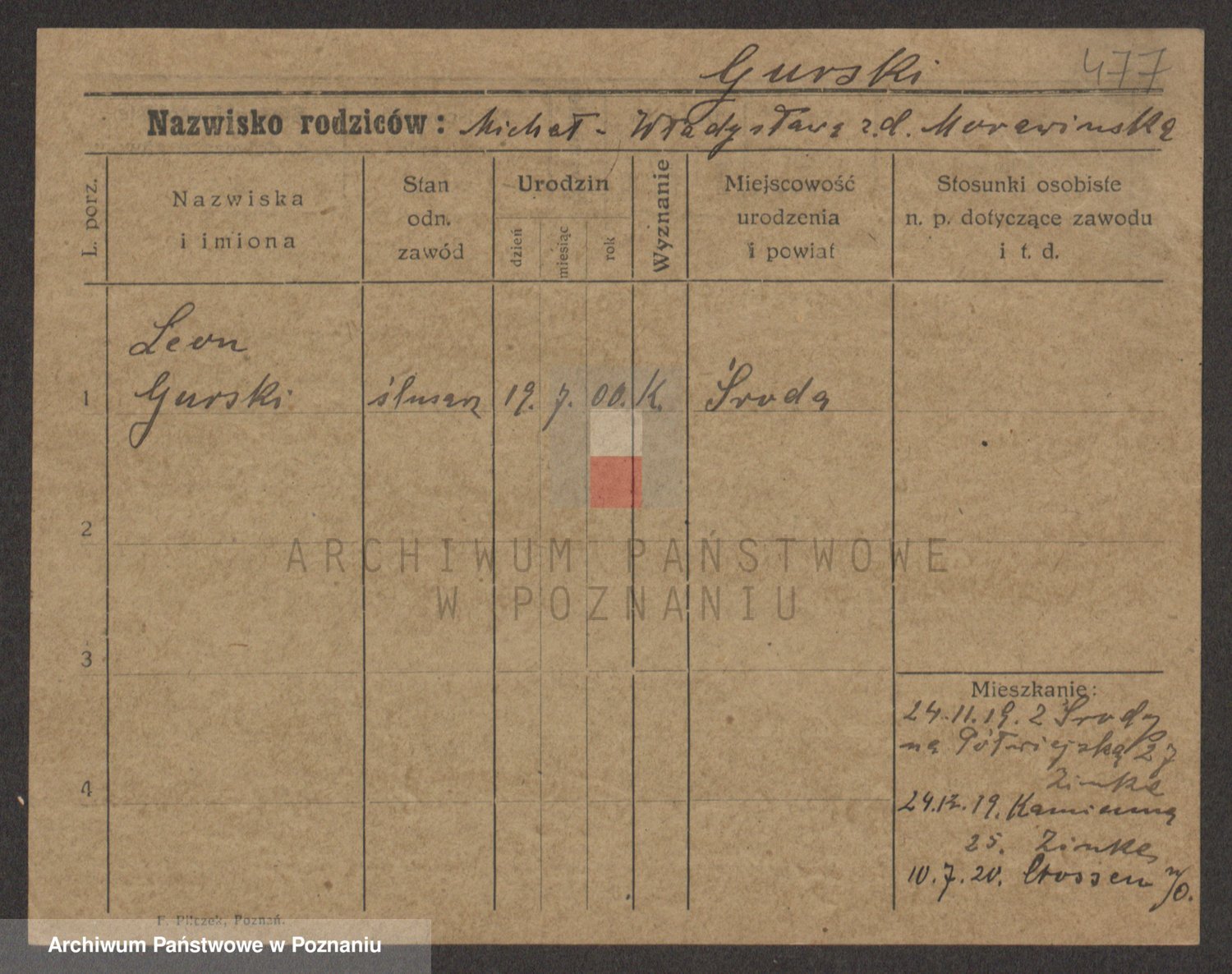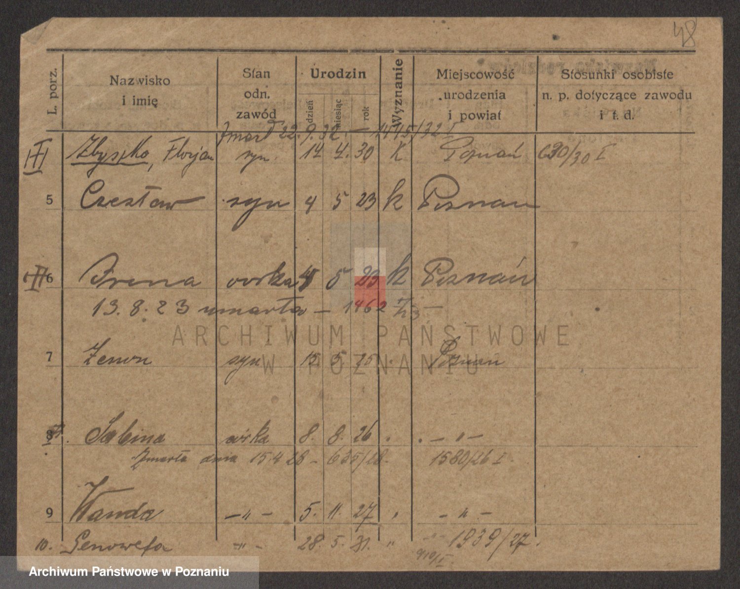 Podgląd karty osobowej dostępny jest po kliknięciu na nazwisko lub ikonkę karty. Można dokonywać powiększenia (ikony na górze) lub przechodzić między kolejnymi skanami (strzałki po bokach).