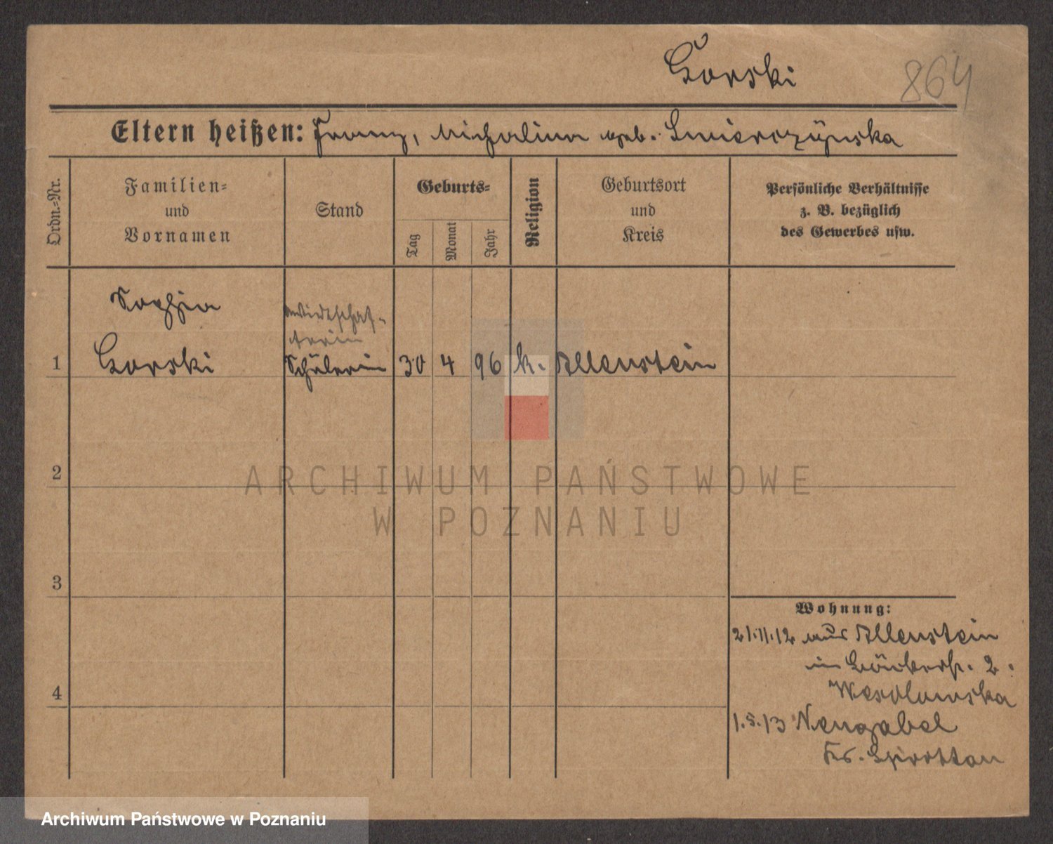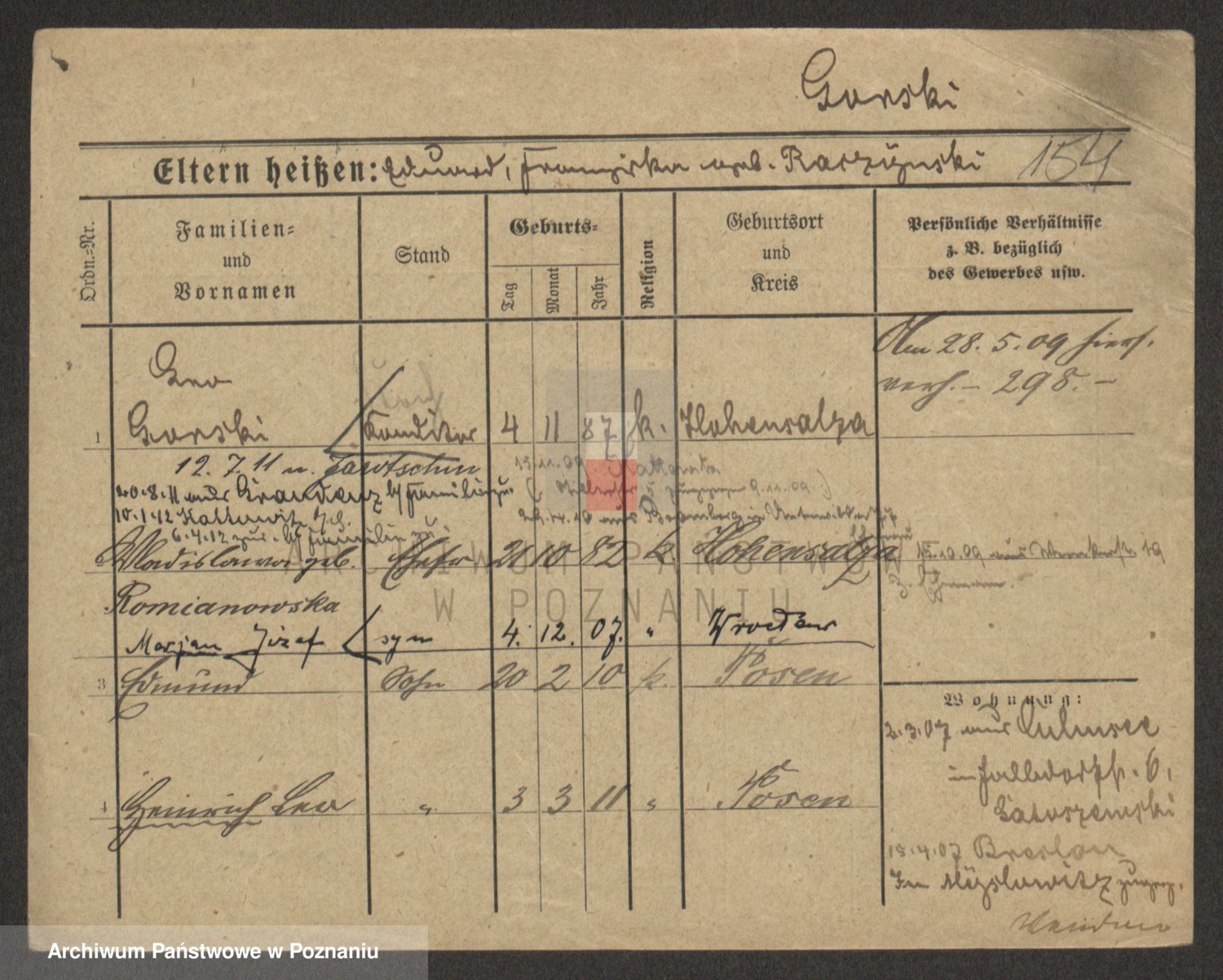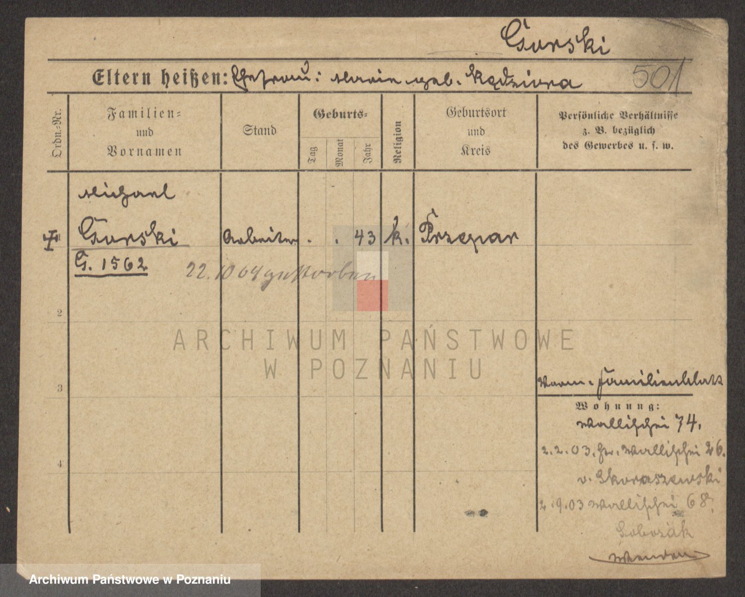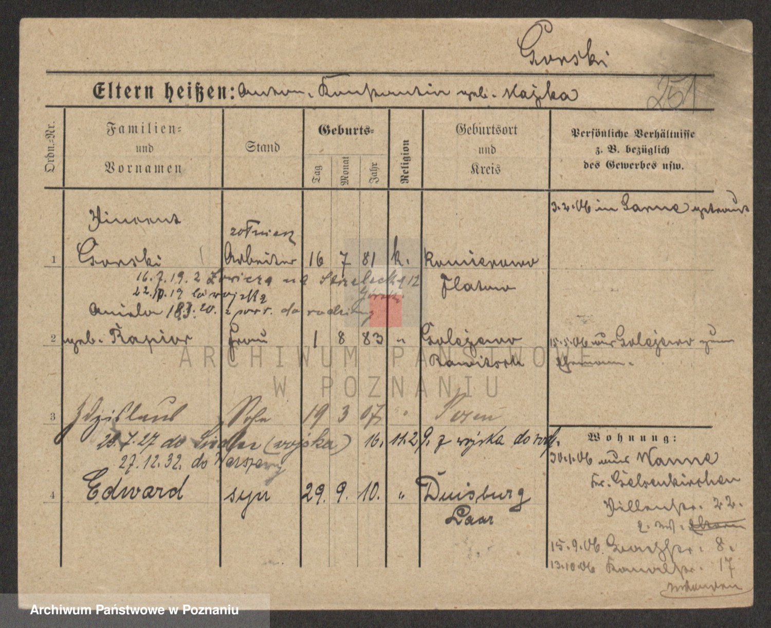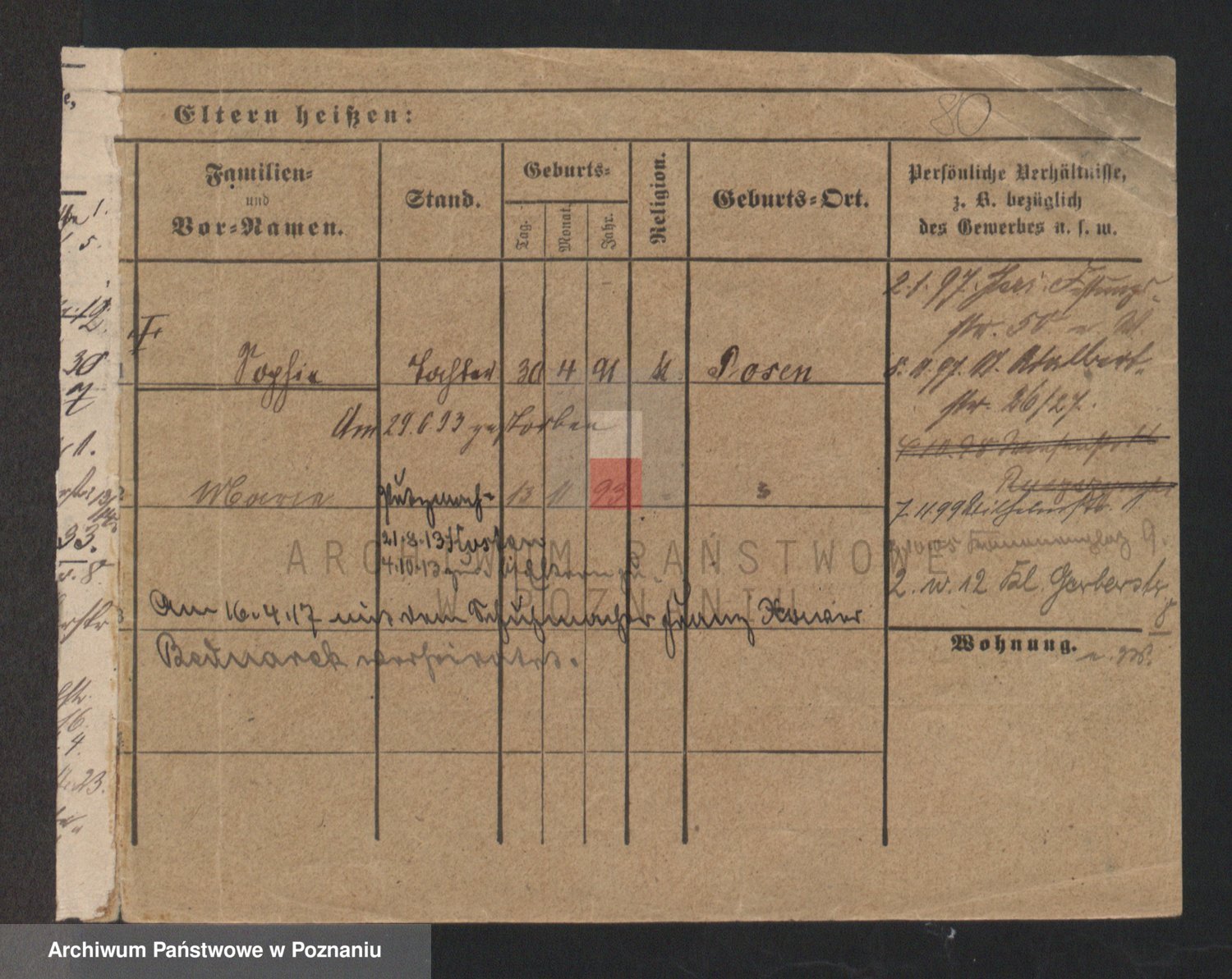 Podgląd karty osobowej dostępny jest po kliknięciu na nazwisko lub ikonkę karty. Można dokonywać powiększenia (ikony na górze) lub przechodzić między kolejnymi skanami (strzałki po bokach).