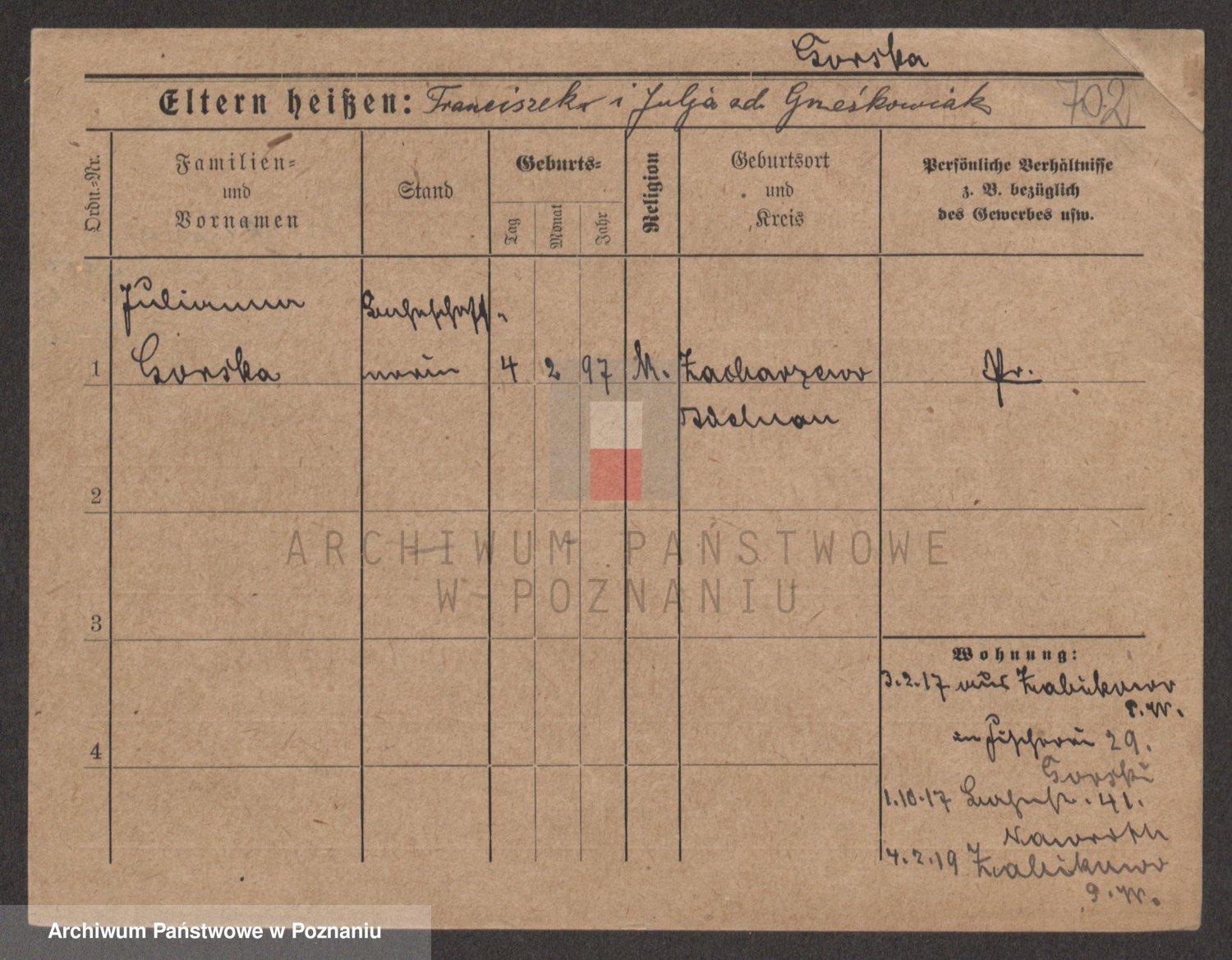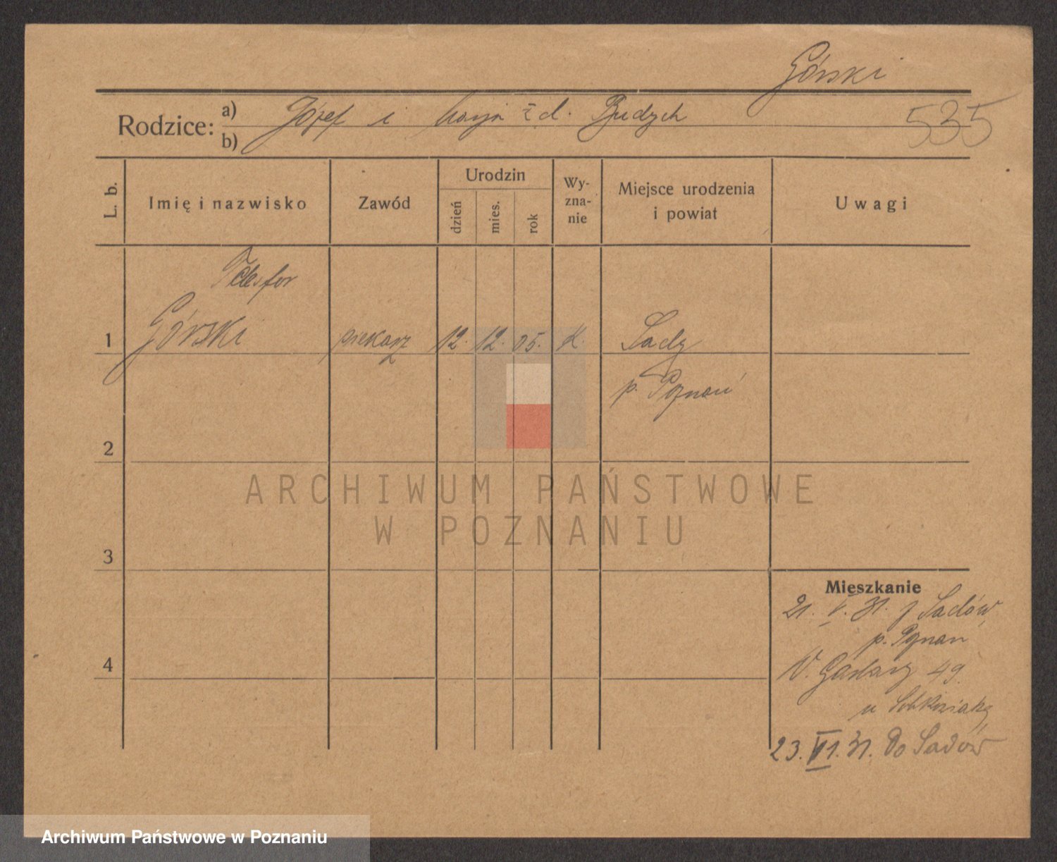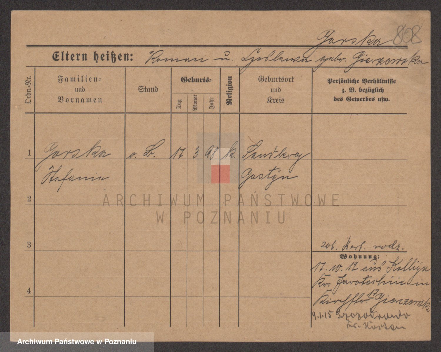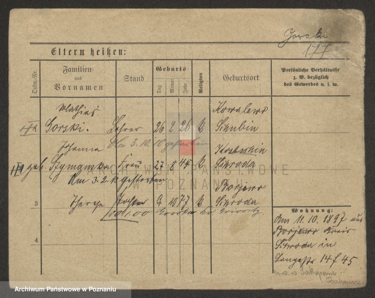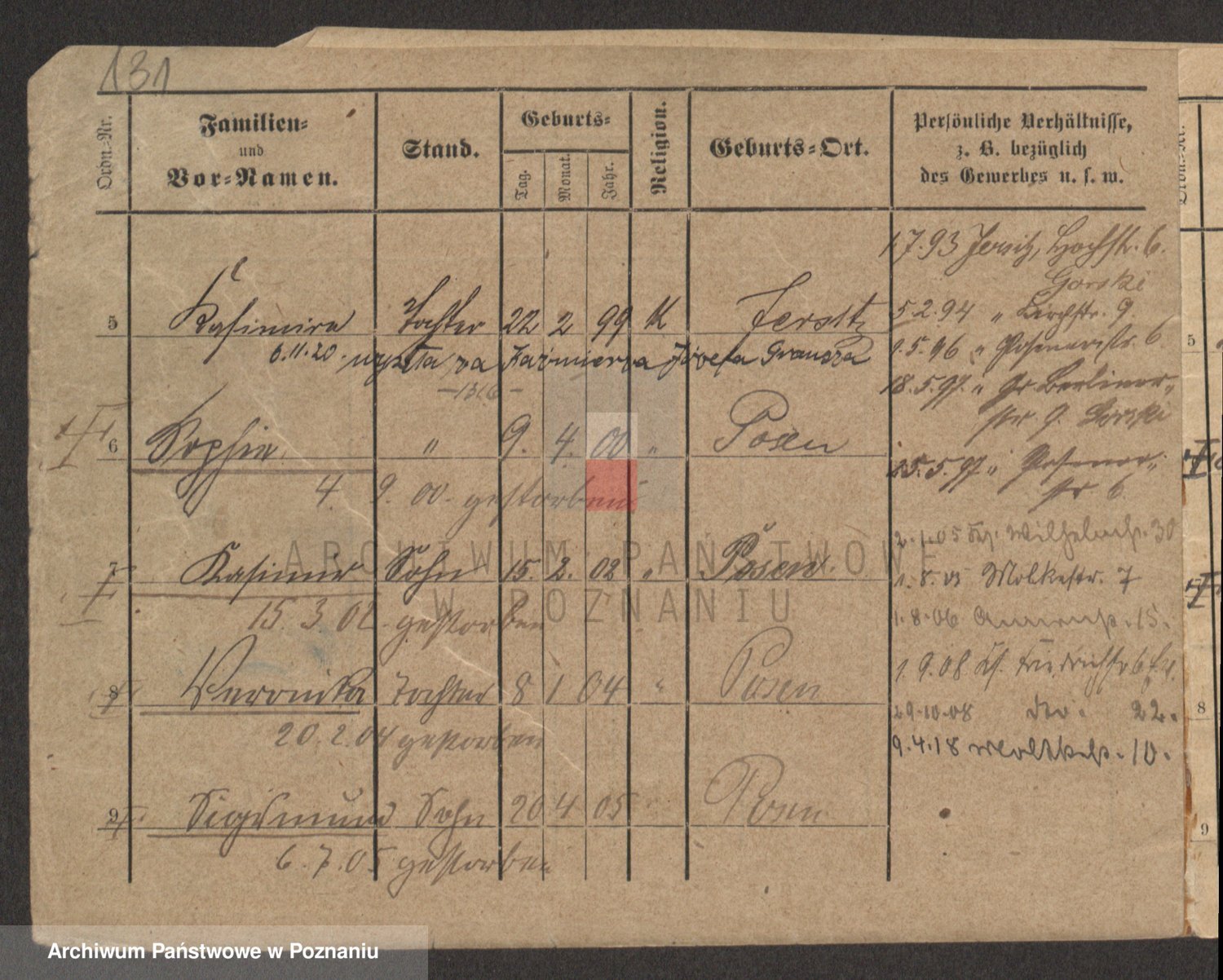 Podgląd karty osobowej dostępny jest po kliknięciu na nazwisko lub ikonkę karty. Można dokonywać powiększenia (ikony na górze) lub przechodzić między kolejnymi skanami (strzałki po bokach).
