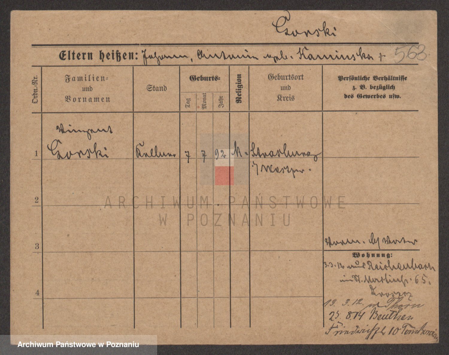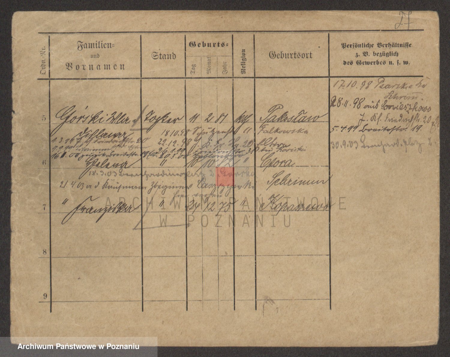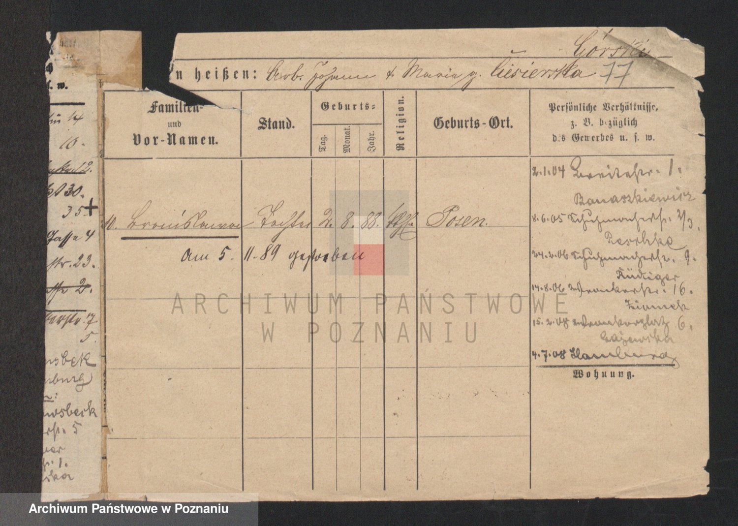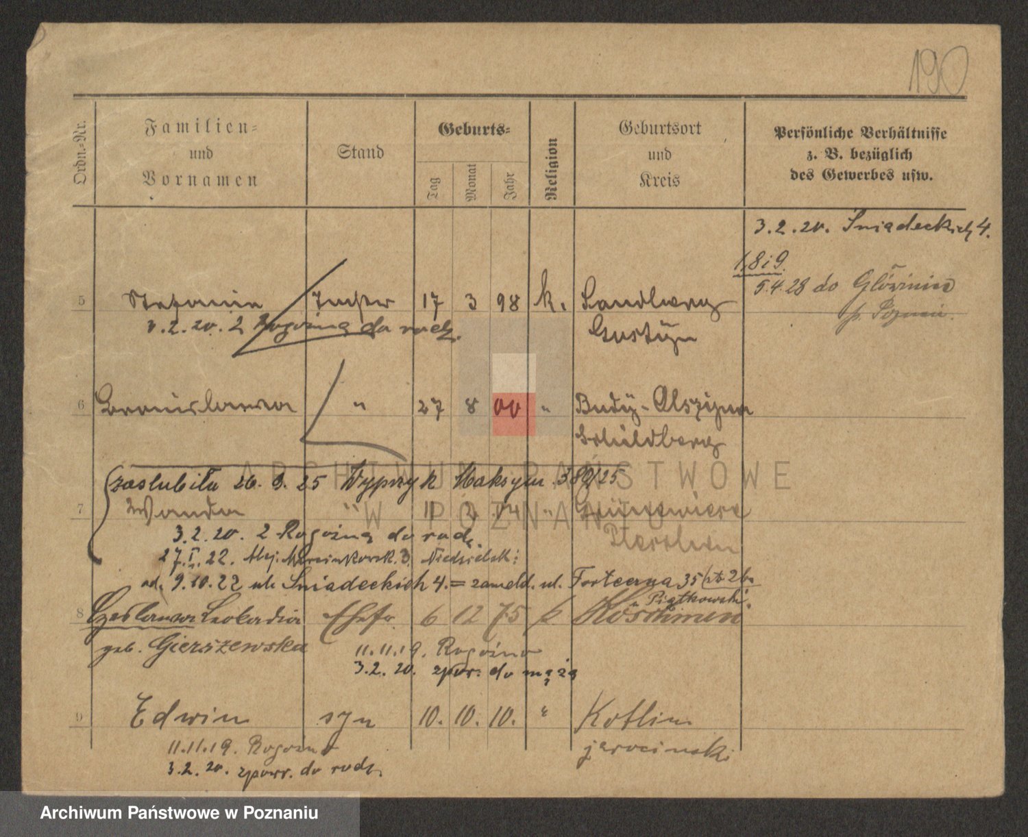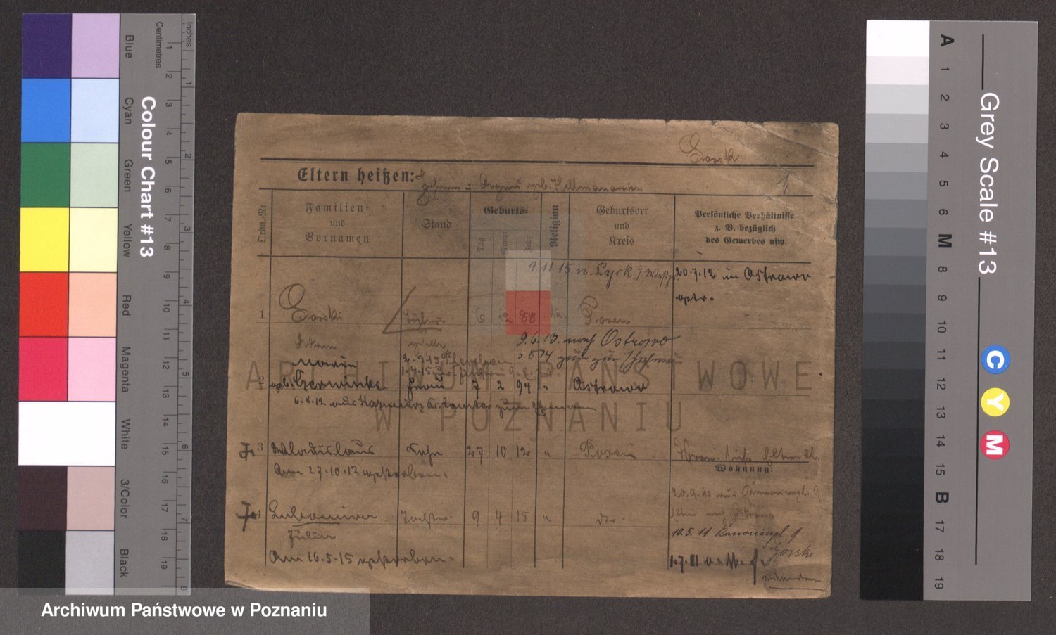 Podgląd karty osobowej dostępny jest po kliknięciu na nazwisko lub ikonkę karty. Można dokonywać powiększenia (ikony na górze) lub przechodzić między kolejnymi skanami (strzałki po bokach).