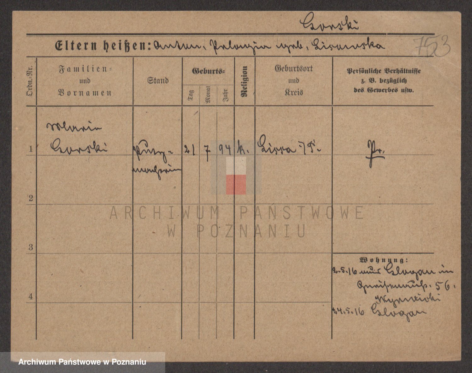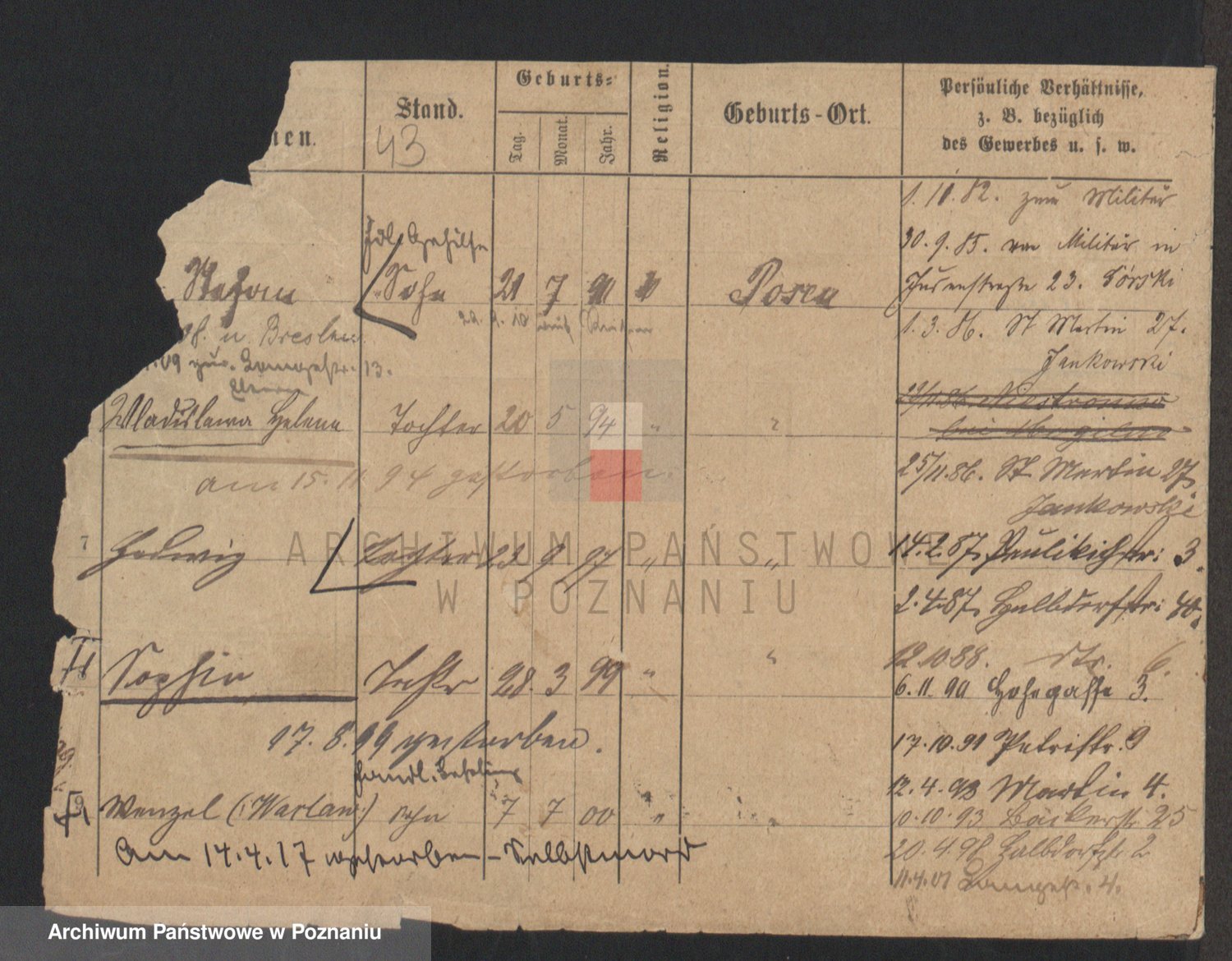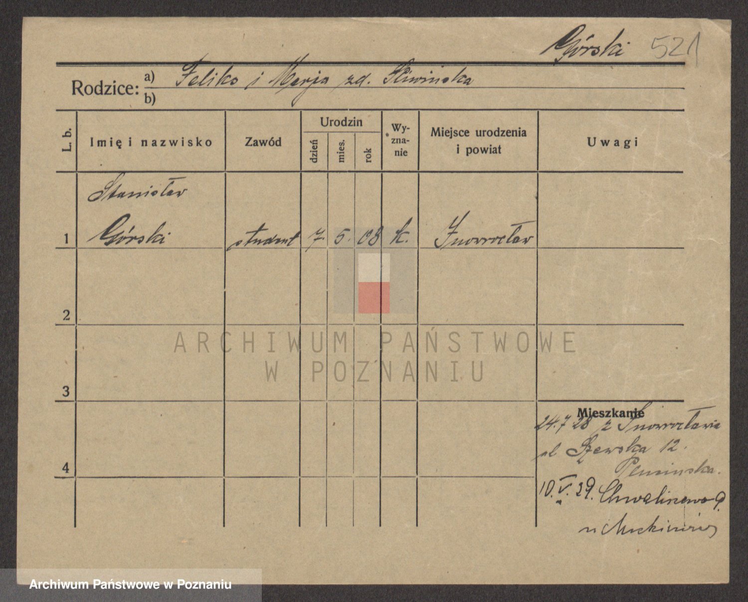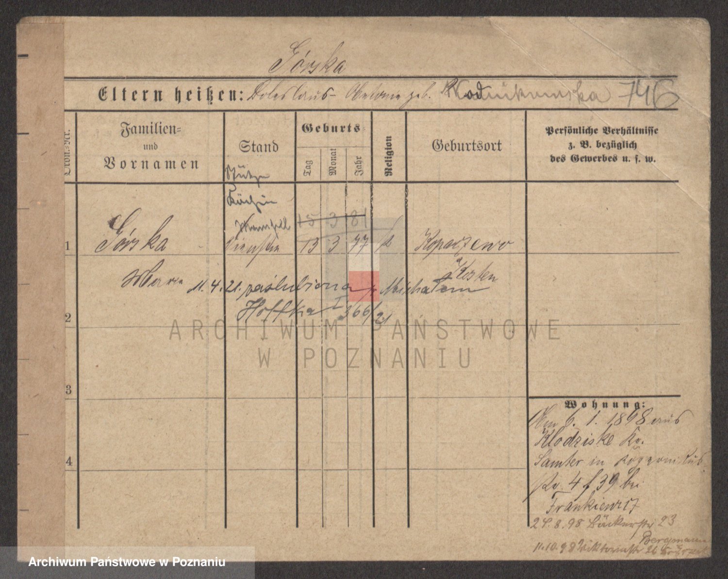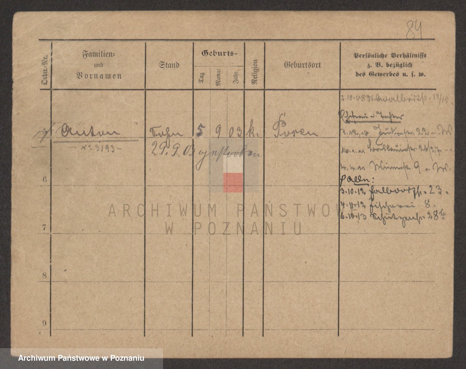 Podgląd karty osobowej dostępny jest po kliknięciu na nazwisko lub ikonkę karty. Można dokonywać powiększenia (ikony na górze) lub przechodzić między kolejnymi skanami (strzałki po bokach).