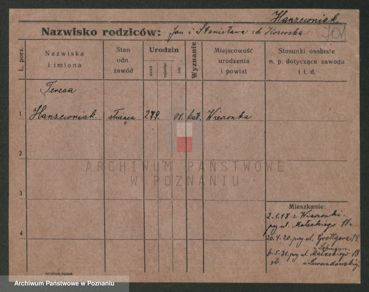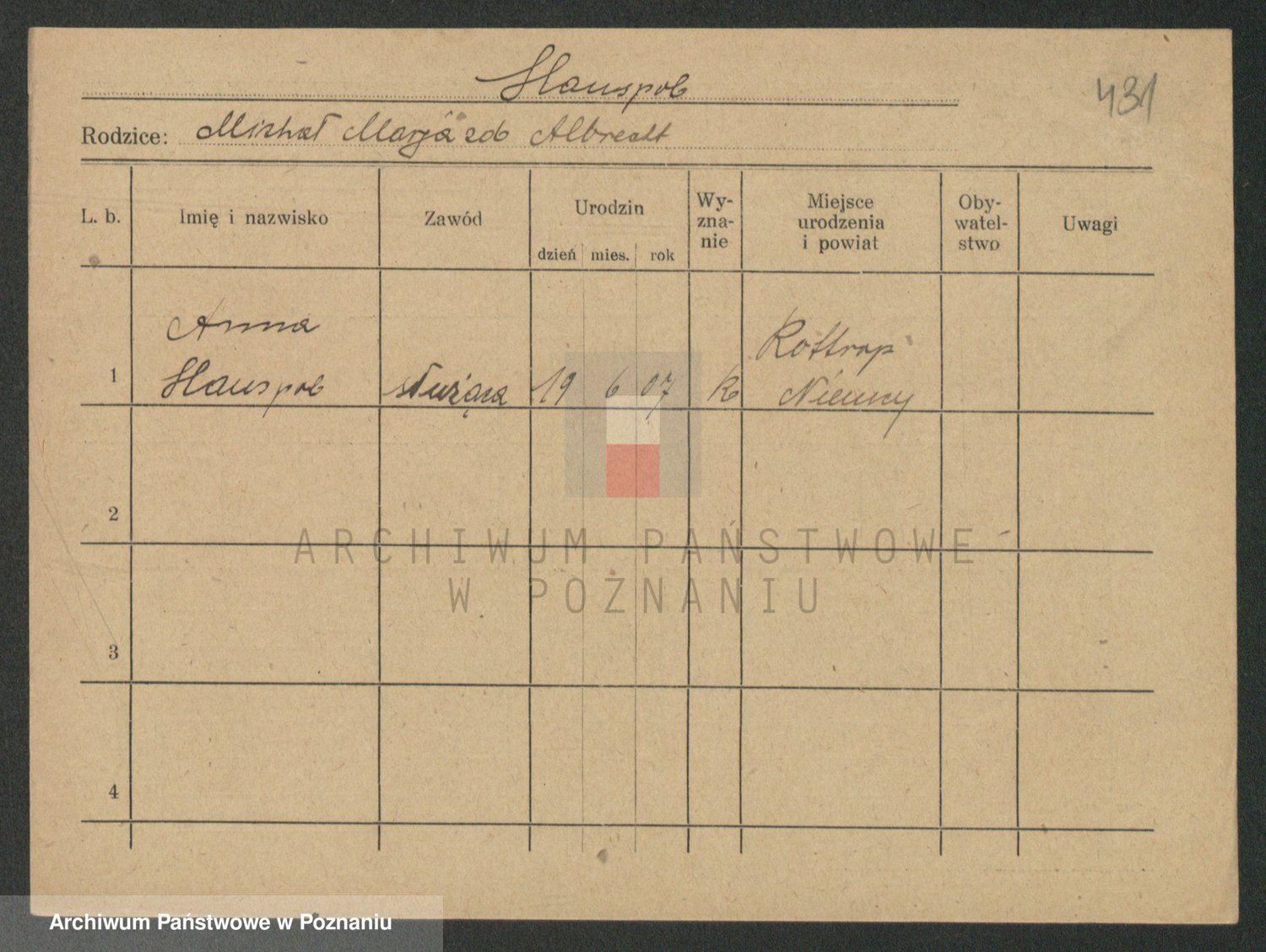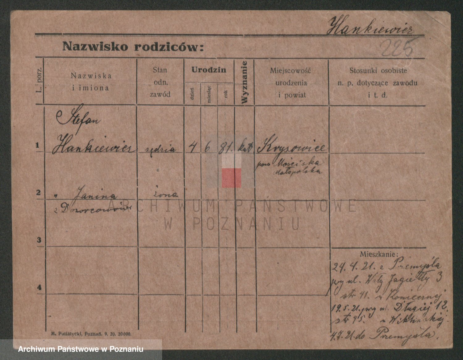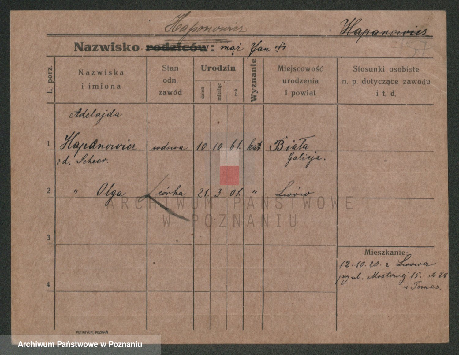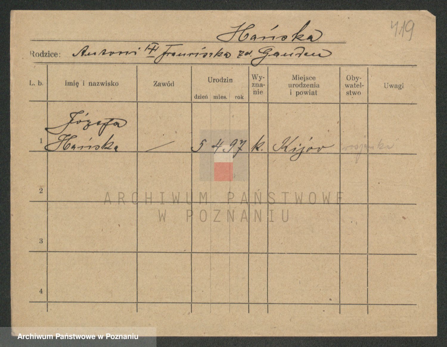 Podgląd karty osobowej dostępny jest po kliknięciu na nazwisko lub ikonkę karty. Można dokonywać powiększenia (ikony na górze) lub przechodzić między kolejnymi skanami (strzałki po bokach).