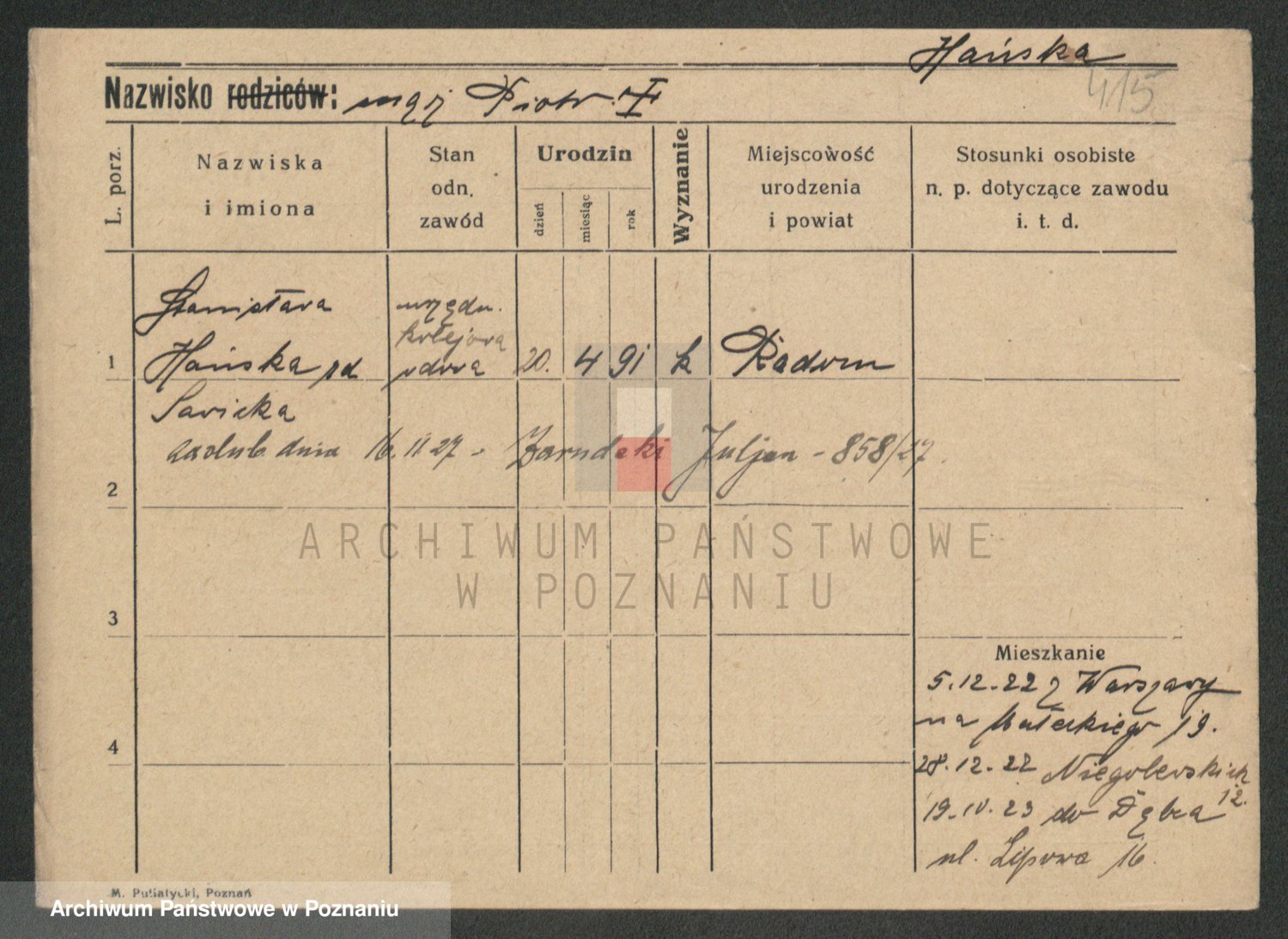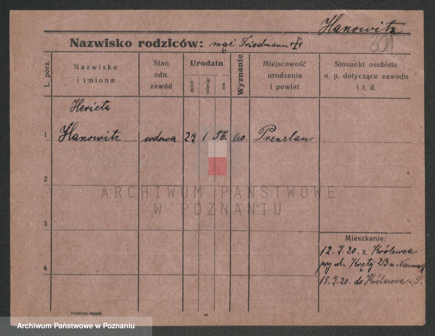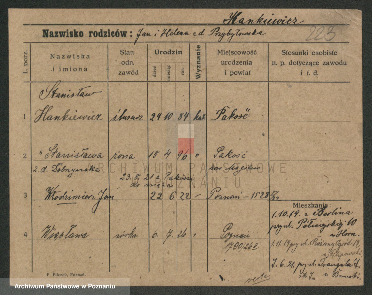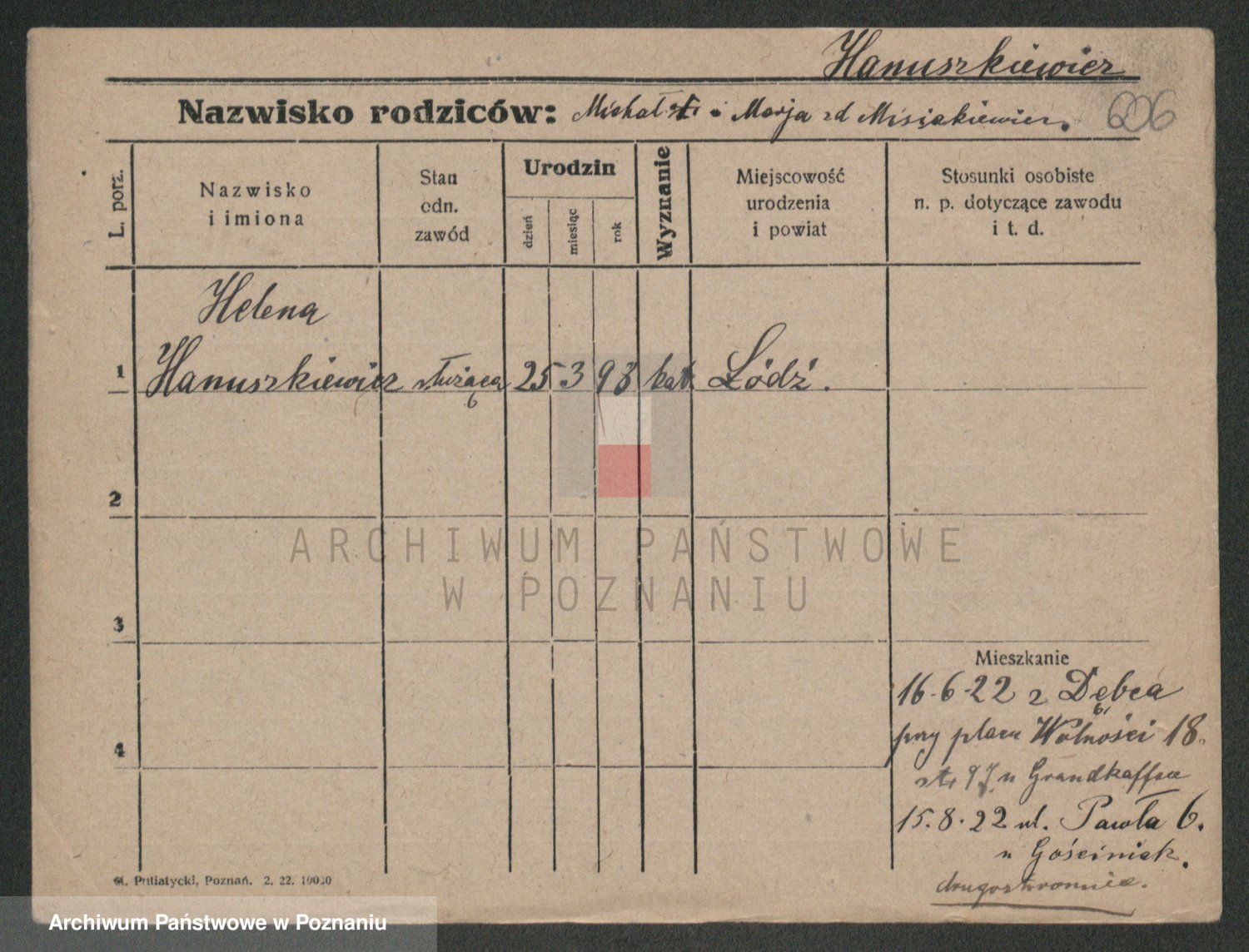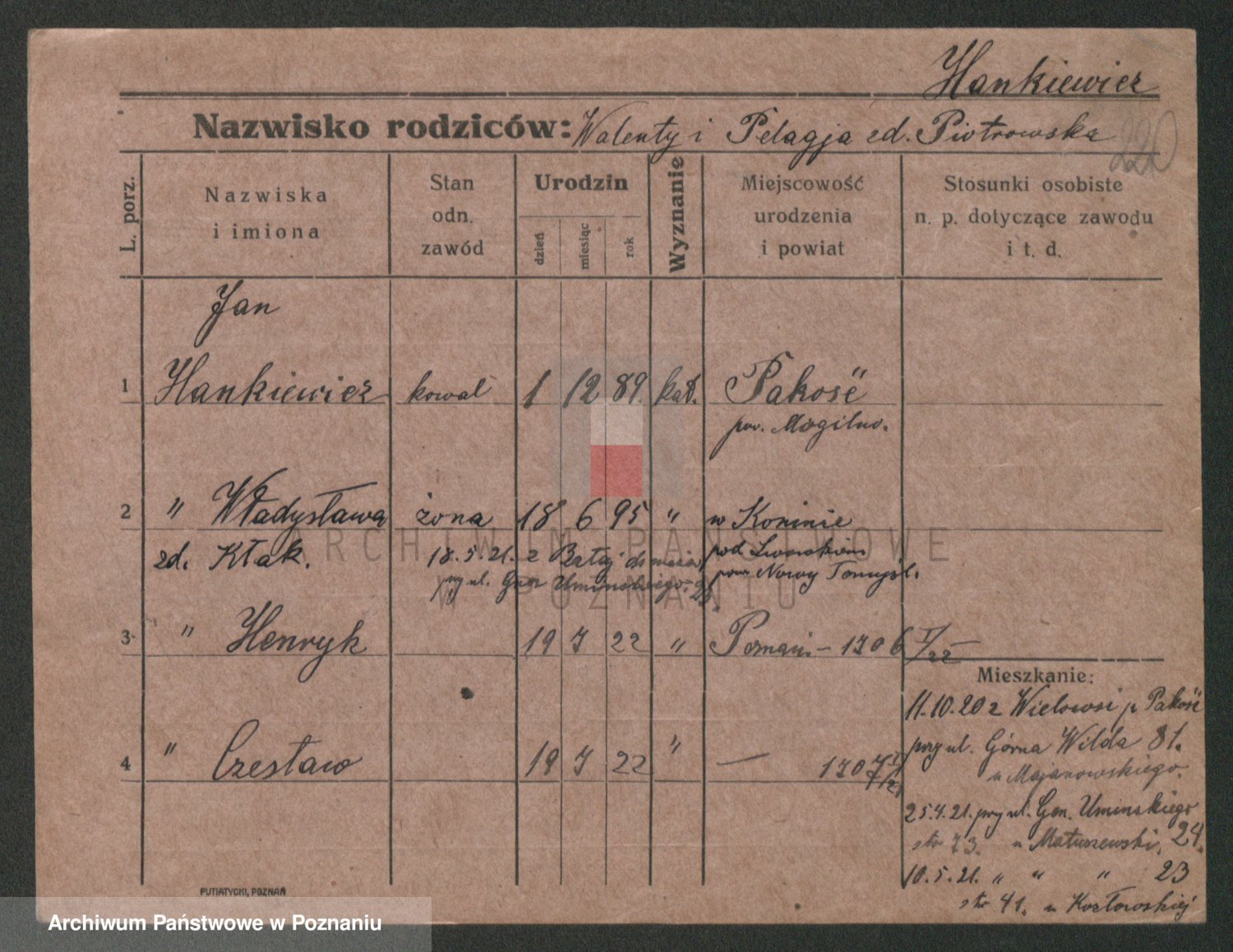 Podgląd karty osobowej dostępny jest po kliknięciu na nazwisko lub ikonkę karty. Można dokonywać powiększenia (ikony na górze) lub przechodzić między kolejnymi skanami (strzałki po bokach).